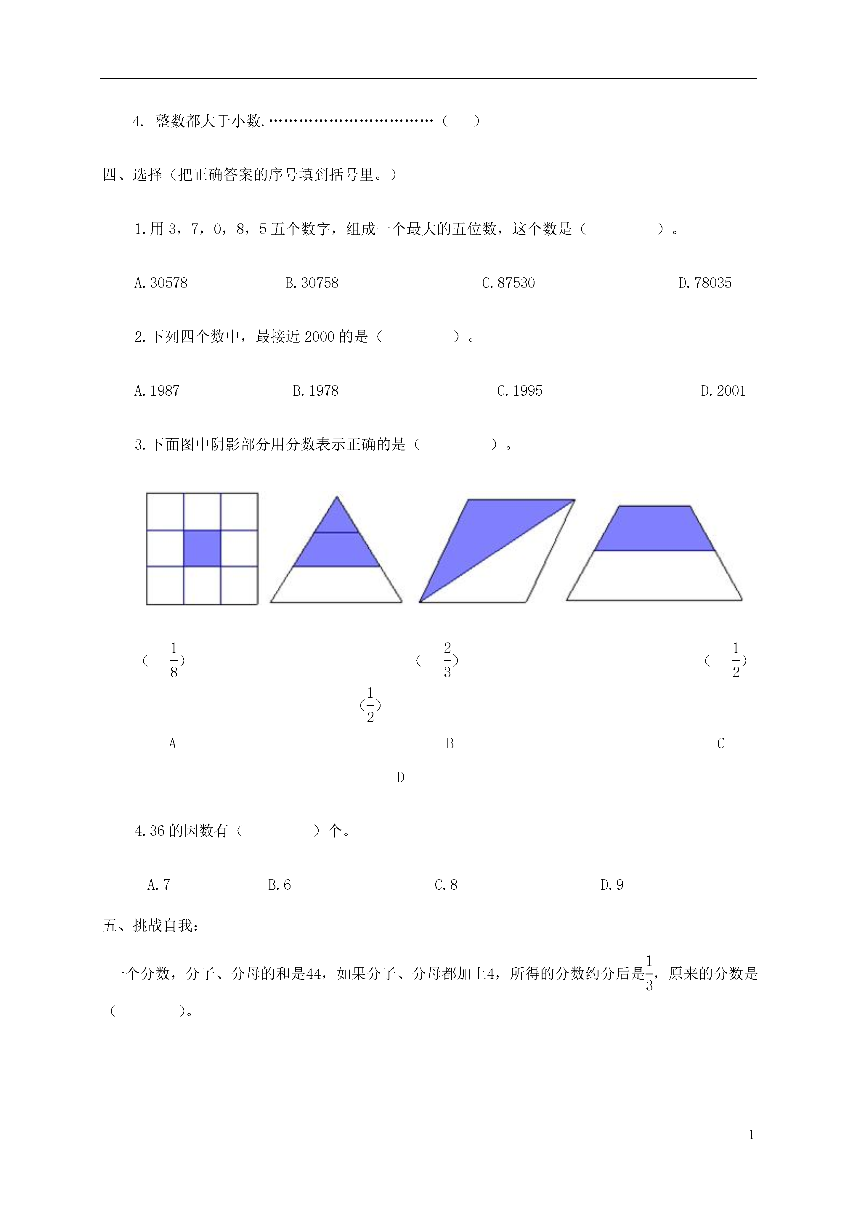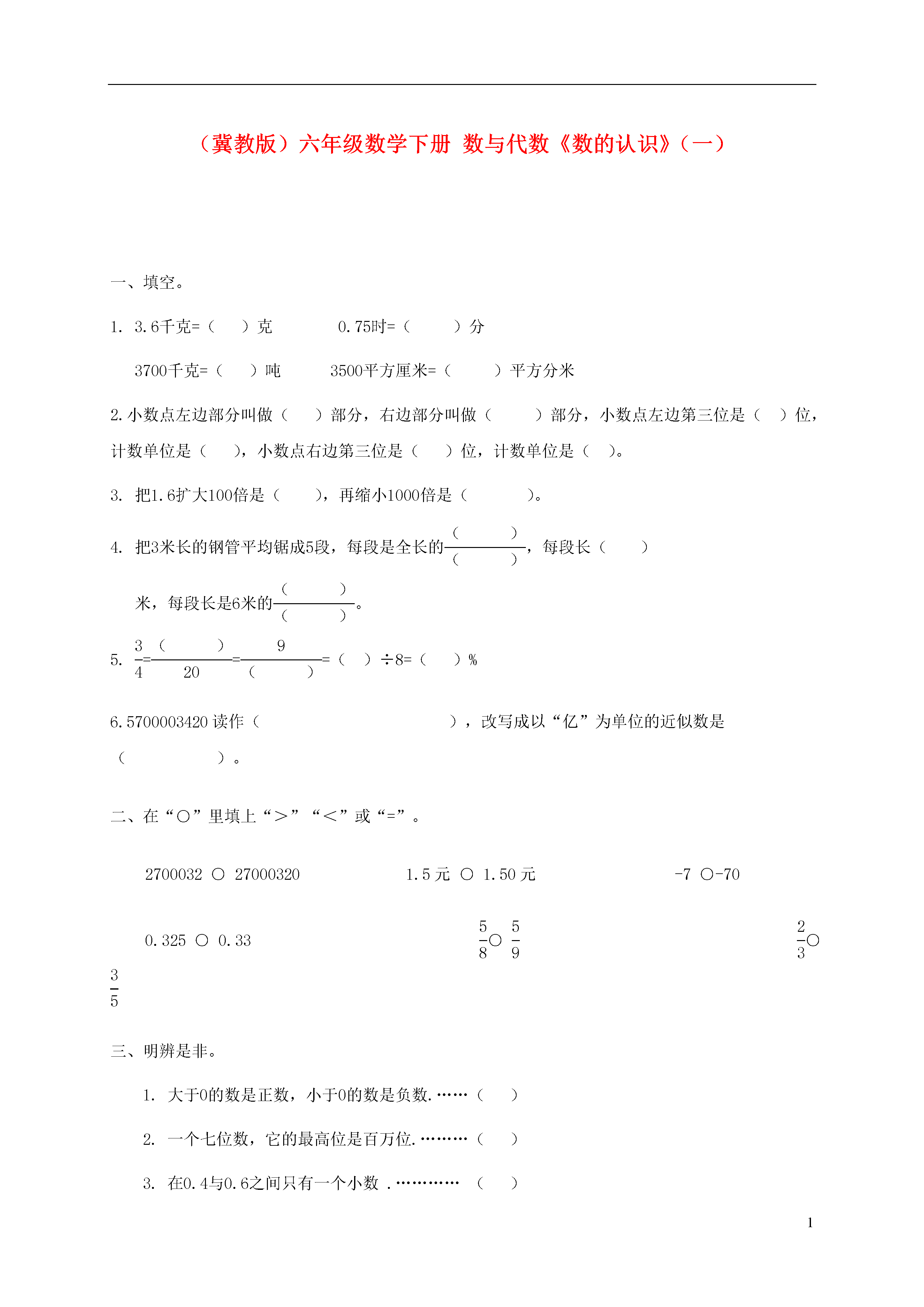 1(冀教版)六年级数学下册数与代数《数的认识》(一)一、填空。1.3.6千克=()克0.75时=()分3700千克=()吨3500平方厘米=()平方分米2.小数点左边部分叫做()部分,右边部分叫做()部分,小数点左边第三位是()位,计数单位是(),小数点右边第三位是()位,计数单位是()。3.把1.6扩大100倍是(),再缩小1000倍是()。4.把3米长的钢管平均锯成5段,每段是全长的EQ\F((),()),每段长()米,每段长是6米的EQ\F((),())。5.EQ\F(3,4)=EQ\F((),20)=EQ\F(9,())=()÷8=()%6.5700003420读作(),改写成以“亿”为单位的近似数是()。二、在“○”里填上“>”“<”或“=”。2700032○270003201.5元○1.50元-7○-700.325○0.33eq\f(5,8)○eq\f(5,9)eq\f(2,3)○eq\f(3,5)三、明辨是非。1.大于0的数是正数,小于0的数是负数.……()2.一个七位数,它的最高位是百万位.………()3.在0.4与0.6之间只有一个小数.…………()4.整数都大于小数.……………………………()四、选择(把正确答案的序号填到括号里。)1.用3,7,0,8,5五个数字,组成一个最大的五位数,这个数是()。A.30578B.30758C.87530D.780352.下列四个数中,最接近2000的是()。A.1987B.1978C.1995D.20013.下面图中阴影部分用分数表示正确的是()。(eq\f(1,8))(eq\f(2,3))(eq\f(1,2))(eq\f(1,2))ABCD4.36的因数有()个。A.7B.6C.8D.9五、挑战自我:一个分数,分子、分母的和是44,如果分子、分母都加上4,所得的分数约分后是EQ\F(1,3),原来的分数是()。