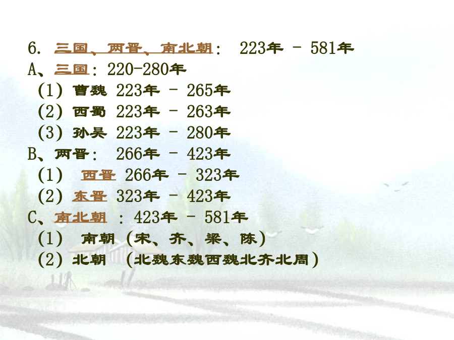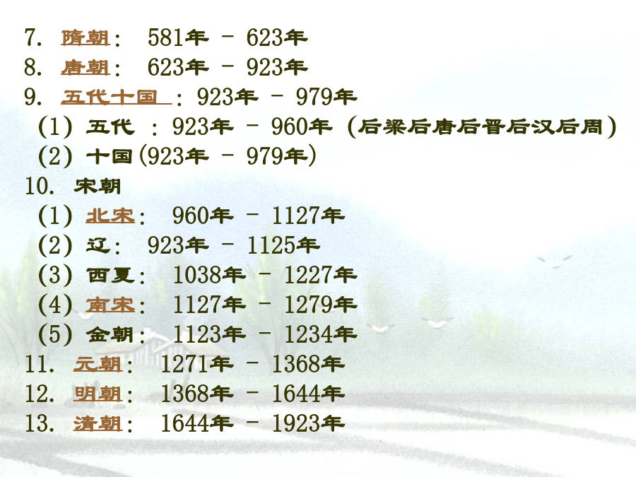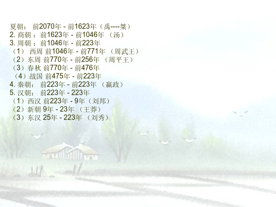 中国历史朝代更替表ppt夏朝:前2070年-前1623年(禹----桀) 2.商朝:前1623年-前1046年(汤) 3.周朝:前1046年-前223年 (1)西周前1046年-前771年(周武王) (2)东周前770年-前256年(周平王) (3)春秋前770年-前476年 (4)战国前475年-前223年 4.秦朝:前223年-前223年(嬴政) 5.汉朝:前223年-223年 (1)西汉前223年-9年(刘邦) (2)新朝9年-23年(王莽) (3)东汉25年-223年(刘秀)6.三国、两晋、南北朝:223年-581年 A、三国:220-280年 (1)曹魏223年-265年 (2)西蜀223年-263年 (3)孙吴223年-280年 B、两晋:266年-423年 (1)西晋266年-323年 (2)东晋323年-423年 C、南北朝:423年-581年 (1)南朝(宋、齐、梁、陈) (2)北朝(北魏东魏西魏北齐北周)7.隋朝:581年-623年 8.唐朝:623年-923年 9.五代十国:923年-979年 (1)五代:923年-960年(后梁后唐后晋后汉后周) (2)十国(923年-979年) 10.宋朝 (1)北宋:960年-1127年 (2)辽:923年-1125年 (3)西夏:1038年-1227年 (4)南宋:1127年-1279年 (5)金朝:1123年-1234年 11.元朝:1271年-1368年 12.明朝:1368年-1644年 13.清朝:1644年-1923年前2070年,禹建立夏朝 前1623年,最终一种王桀无道,夏最终灭亡前1623年,汤建立商朝 前1046年,经商周旳牧野之战,纣王战败,自焚而死,商亡西周形势图前770年,周平王迁都洛邑,春秋开始。在此期间,先后有齐桓公、晋文公、楚庄王、吴王阂闾、越王勾践称霸于各诸侯国,史称“春秋五霸”战国形势前223年,秦灭六国,秦始皇建立专制主义中央集权制度 前223年,刘邦攻入咸阳,秦亡前223年,刘邦建都长安,西汉建立 公元9年,王莽夺取西汉政权,改国号为新。西汉灭亡公元25年,刘秀建都洛阳,东汉建立蜀三国鼎立图西晋统一图323年,西晋皇室司马睿,以建康(今南京)为都城,建立 晋朝,史称东晋隋朝疆域623年,李渊称帝,国号唐,定都长安923年,耶律阿保机建立契丹政权,后改国号为辽。960年,赵匡胤发动兵变,黄袍加身,建立宋朝,定都东京(今开封),史称北宋;1127年徽、钦二宗被金人所掳,北宋灭亡。1038年,元昊定都兴庆(今银川),建立西夏南宋与金旳对峙1223年,铁木真建蒙古和西征1276年,元世祖忽必烈改国号为元,定都大都,1279年灭南宋完毕统一1368年,朱元璋在南京即帝位,定国号为大明1644年,李自成攻占北京,崇祯皇帝自缢,明灭亡