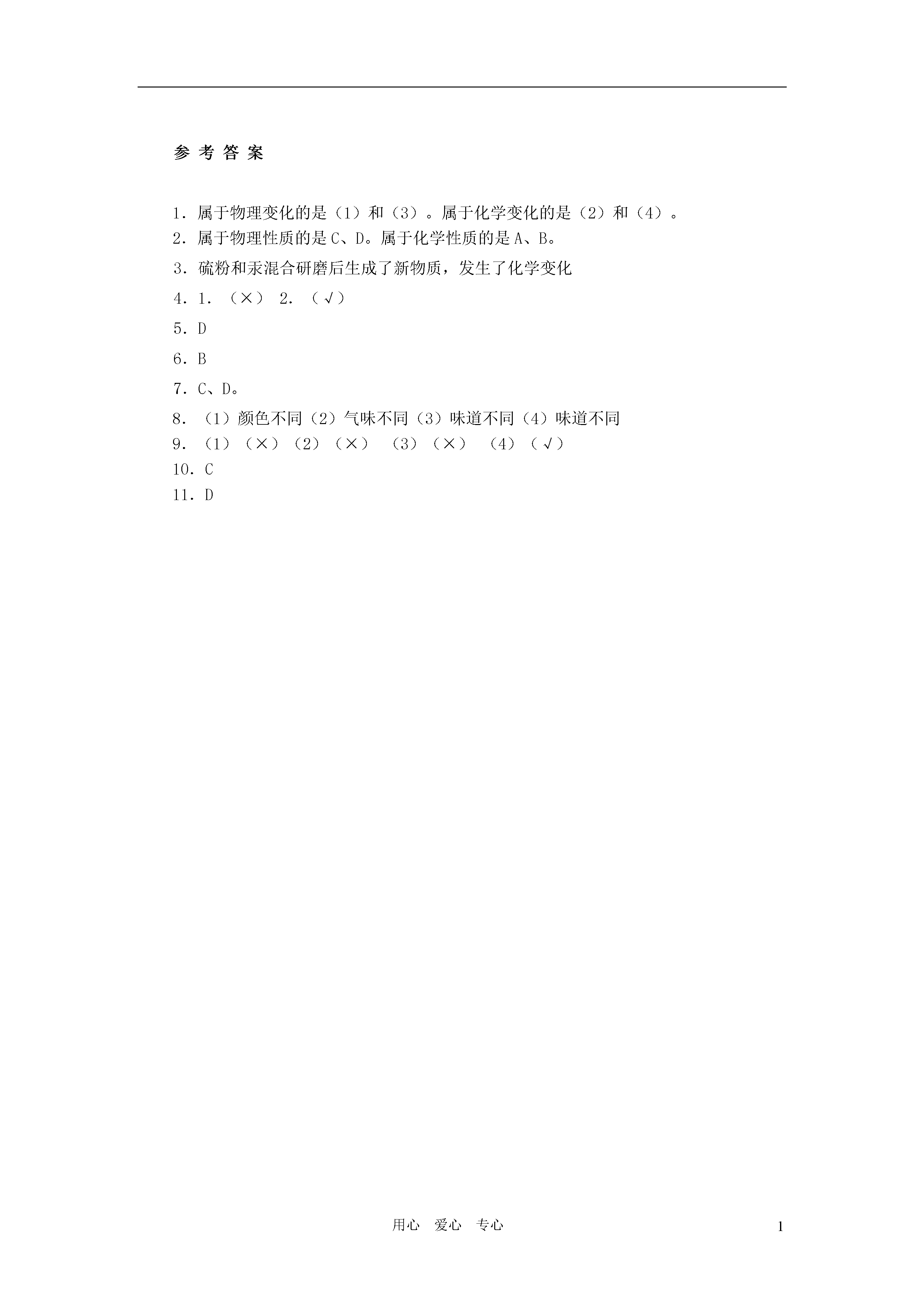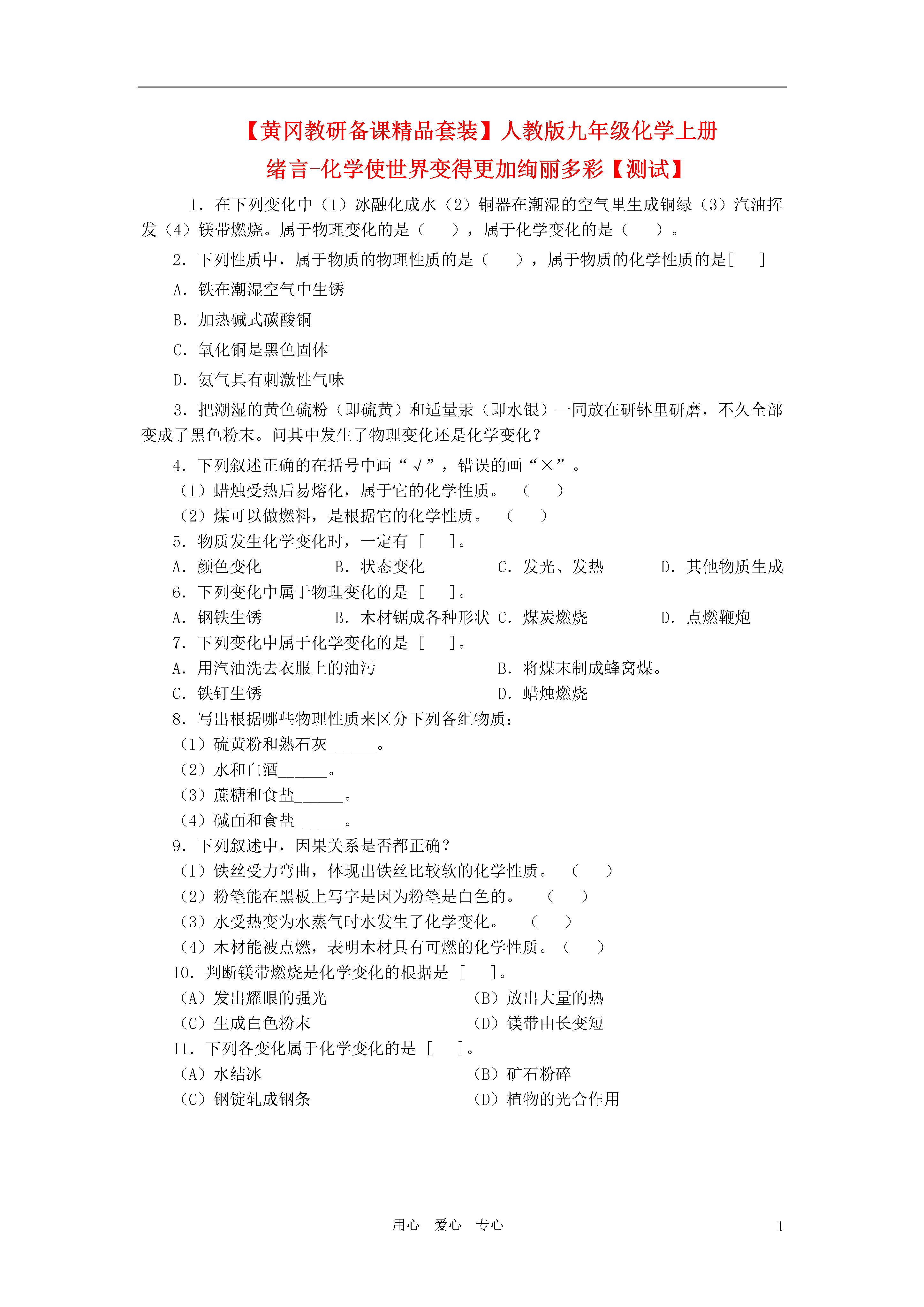 1用心爱心专心【黄冈教研备课精品套装】人教版九年级化学上册绪言-化学使世界变得更加绚丽多彩【测试】1.在下列变化中(1)冰融化成水(2)铜器在潮湿的空气里生成铜绿(3)汽油挥发(4)镁带燃烧。属于物理变化的是(),属于化学变化的是()。2.下列性质中,属于物质的物理性质的是(),属于物质的化学性质的是[]A.铁在潮湿空气中生锈B.加热碱式碳酸铜C.氧化铜是黑色固体D.氨气具有刺激性气味3.把潮湿的黄色硫粉(即硫黄)和适量汞(即水银)一同放在研钵里研磨,不久全部变成了黑色粉末。问其中发生了物理变化还是化学变化?4.下列叙述正确的在括号中画“√”,错误的画“×”。(1)蜡烛受热后易熔化,属于它的化学性质。()(2)煤可以做燃料,是根据它的化学性质。()5.物质发生化学变化时,一定有[]。A.颜色变化B.状态变化C.发光、发热D.其他物质生成6.下列变化中属于物理变化的是[]。A.钢铁生锈B.木材锯成各种形状C.煤炭燃烧D.点燃鞭炮7.下列变化中属于化学变化的是[]。A.用汽油洗去衣服上的油污B.将煤末制成蜂窝煤。C.铁钉生锈D.蜡烛燃烧8.写出根据哪些物理性质来区分下列各组物质:(1)硫黄粉和熟石灰______。(2)水和白酒______。(3)蔗糖和食盐______。(4)碱面和食盐______。9.下列叙述中,因果关系是否都正确?(l)铁丝受力弯曲,体现出铁丝比较软的化学性质。()(2)粉笔能在黑板上写字是因为粉笔是白色的。()(3)水受热变为水蒸气时水发生了化学变化。()(4)木材能被点燃,表明木材具有可燃的化学性质。()10.判断镁带燃烧是化学变化的根据是[]。(A)发出耀眼的强光(B)放出大量的热(C)生成白色粉末(D)镁带由长变短11.下列各变化属于化学变化的是[]。(A)水结冰(B)矿石粉碎(C)钢锭轧成钢条(D)植物的光合作用参考答案1.属于物理变化的是(1)和(3)。属于化学变化的是(2)和(4)。2.属于物理性质的是C、D。属于化学性质的是A、B。3.硫粉和汞混合研磨后生成了新物质,发生了化学变化4.1.(×)2.(√)5.D6.B7.C、D。8.(1)颜色不同(2)气味不同(3)味道不同(4)味道不同9.(1)(×)(2)(×)(3)(×)(4)(√)10.C11.D