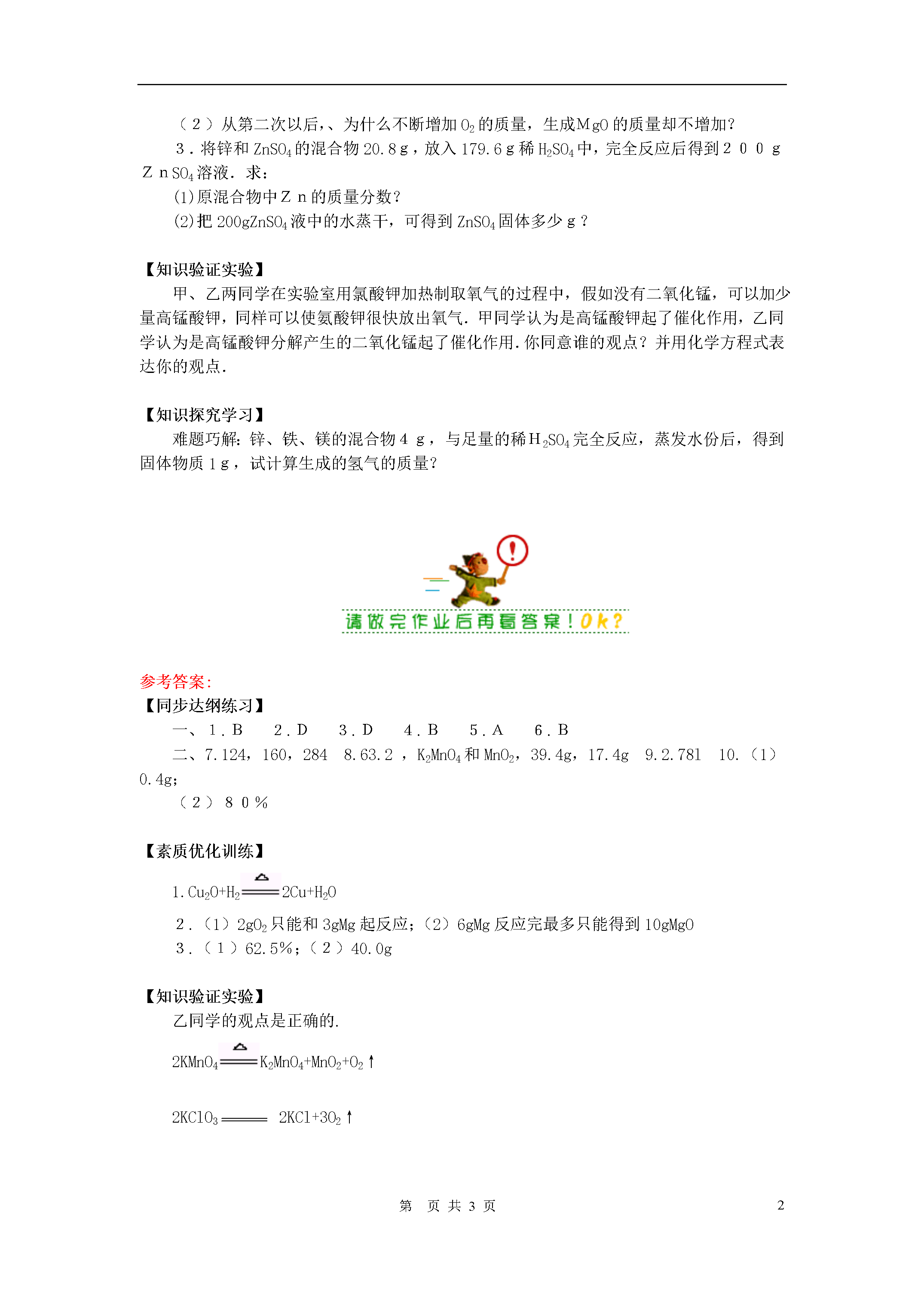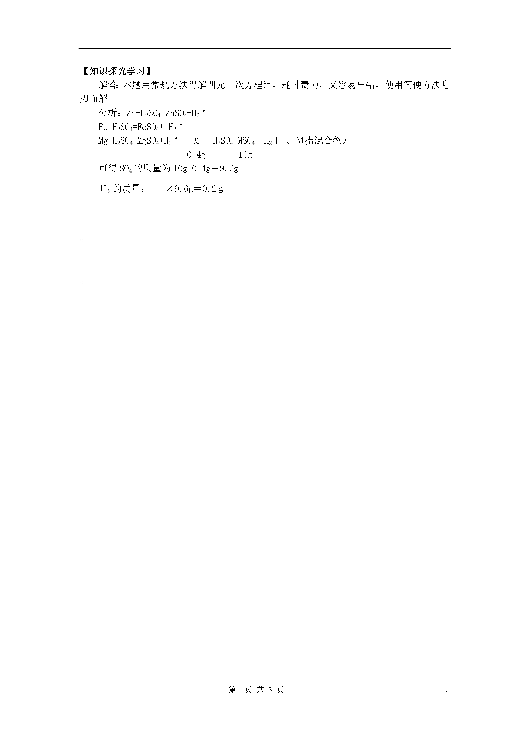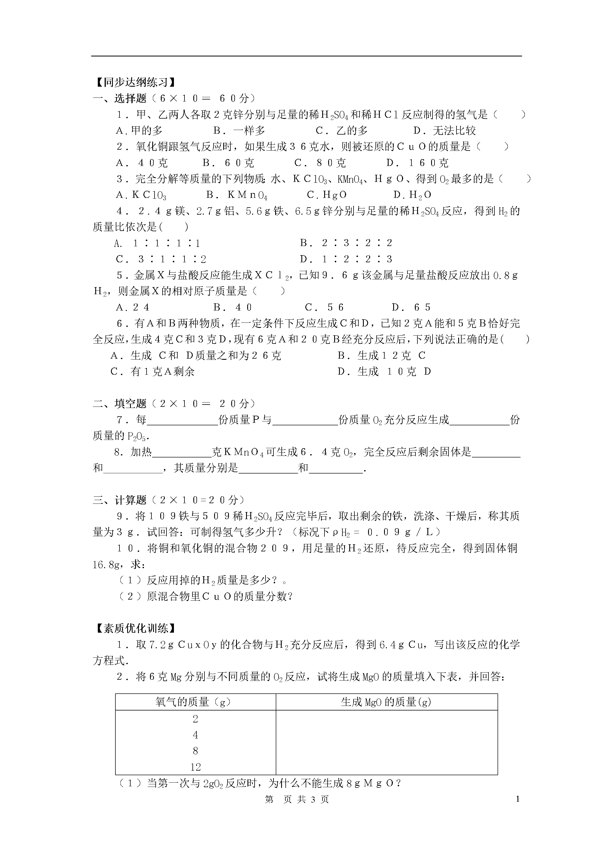 3第页【同步达纲练习】一、选择题(6×10=60分)1.甲、乙两人各取2克锌分别与足量的稀H2SO4和稀HCl反应制得的氢气是()A.甲的多B.一样多C.乙的多D.无法比较2.氧化铜跟氢气反应时,如果生成36克水,则被还原的CuO的质量是()A.40克B.60克C.80克D.160克3.完全分解等质量的下列物质:水、KClO3、KMnO4、HgO、得到O2最多的是()A.KClO3B.KMnO4C.HgOD.H2O4.2.4g镁、2.7g铝、5.6g铁、6.5g锌分别与足量的稀H2SO4反应,得到H2的质量比依次是()A.1∶1∶1∶1B.2∶3∶2∶2C.3∶1∶1∶2D.1∶2∶2∶35.金属X与盐酸反应能生成XCl2,已知9.6g该金属与足量盐酸反应放出0.8gH2,则金属X的相对原子质量是()A.24B.40C.56D.656.有A和B两种物质,在一定条件下反应生成C和D,已知2克A能和5克B恰好完全反应,生成4克C和3克D,现有6克A和20克B经充分反应后,下列说法正确的是()A.生成C和D质量之和为26克B.生成12克CC.有1克A剩余D.生成10克D二、填空题(2×10=20分)7.每份质量P与份质量O2充分反应生成份质量的P2O5.8.加热克KMnO4可生成6.4克O2,完全反应后剩余固体是和___________,其质量分别是和.三、计算题(2×10=20分)9.将109铁与509稀H2SO4反应完毕后,取出剩余的铁,洗涤、干燥后,称其质量为3g.试回答:可制得氢气多少升?(标况下ρH2=0.09g/L)10.将铜和氧化铜的混合物209,用足量的H2还原,待反应完全,得到固体铜16.8g,求:(1)反应用掉的H2质量是多少?。(2)原混合物里CuO的质量分数?【素质优化训练】1.取7.2gCuxOy的化合物与H2充分反应后,得到6.4gCu,写出该反应的化学方程式.2.将6克Mg分别与不同质量的O2反应,试将生成MgO的质量填入下表,并回答:氧气的质量(g)生成MgO的质量(g)24812(1)当第一次与2gO2反应时,为什么不能生成8gMgO?(2)从第二次以后,、为什么不断增加O2的质量,生成MgO的质量却不增加?3.将锌和ZnSO4的混合物20.8g,放入179.6g稀H2SO4中,完全反应后得到200gZnSO4溶液.求:(1)原混合物中Zn的质量分数?(2)把200gZnSO4液中的水蒸干,可得到ZnSO4固体多少g?【知识验证实验】甲、乙两同学在实验室用氯酸钾加热制取氧气的过程中,假如没有二氧化锰,可以加少量高锰酸钾,同样可以使氨酸钾很快放出氧气.甲同学认为是高锰酸钾起了催化作用,乙同学认为是高锰酸钾分解产生的二氧化锰起了催化作用.你同意谁的观点?并用化学方程式表达你的观点.【知识探究学习】难题巧解:锌、铁、镁的混合物4g,与足量的稀H2SO4完全反应,蒸发水份后,得到固体物质1g,试计算生成的氢气的质量?参考答案:【同步达纲练习】一、1.B2.D3.D4.B5.A6.B二、7.124,160,2848.63.2,K2MnO4和MnO2,39.4g,17.4g9.2.78l10.(1)0.4g;(2)80%【素质优化训练】1.Cu2O+H22Cu+H2O2.(1)2gO2只能和3gMg起反应;(2)6gMg反应完最多只能得到10gMgO3.(1)62.5%;(2)40.0g【知识验证实验】乙同学的观点是正确的.2KMnO4K2MnO4+MnO2+O2↑2KClO32KCl+3O2↑【知识探究学习】解答:本题用常规方法得解四元一次方程组,耗时费力,又容易出错,使用简便方法迎刃而解.分析:Zn+H2SO4=ZnSO4+H2↑Fe+H2SO4=FeSO4+H2↑Mg+H2SO4=MgSO4+H2↑M+H2SO4=MSO4+H2↑(M指混合物)0.4g10g可得SO4的质量为10g-0.4g=9.6gH2的质量:×9.6g=0.2g全品中考网