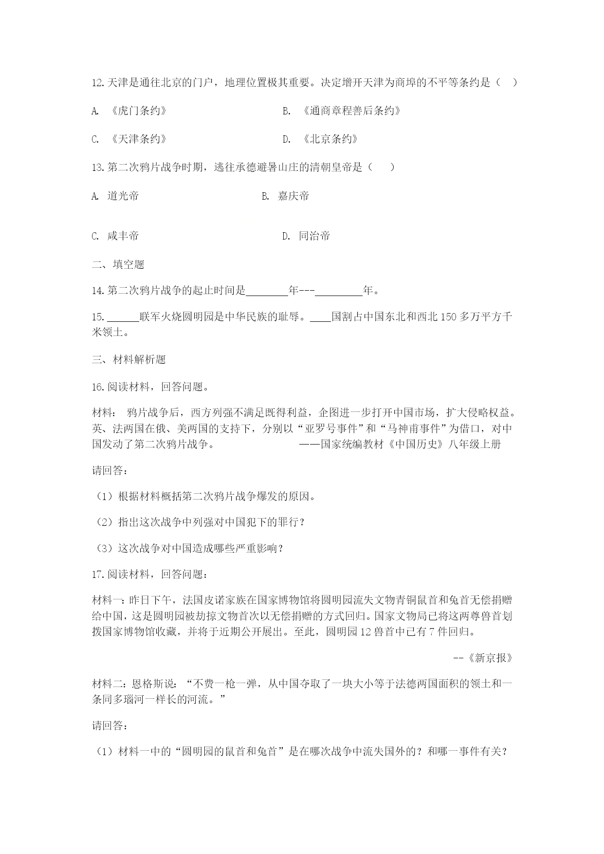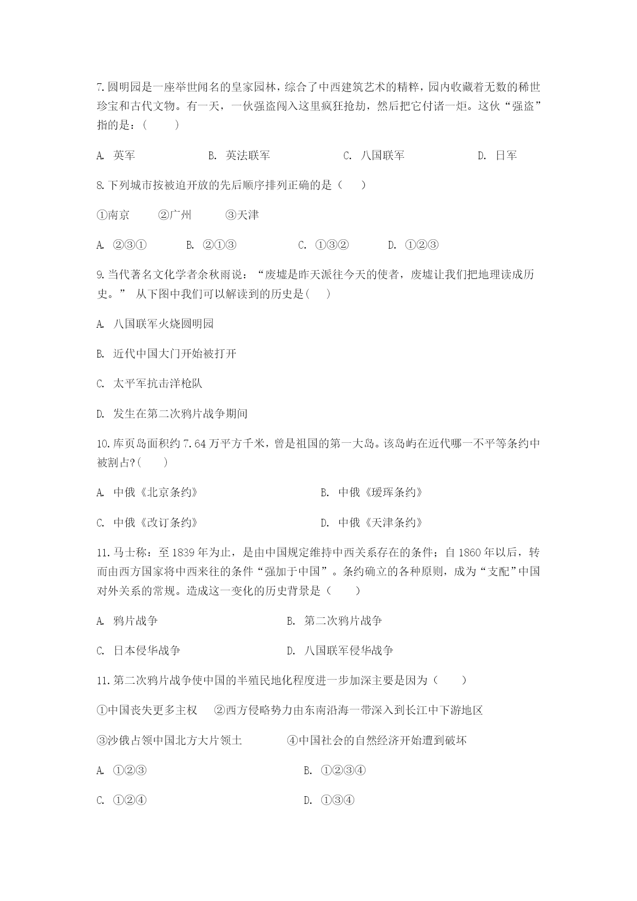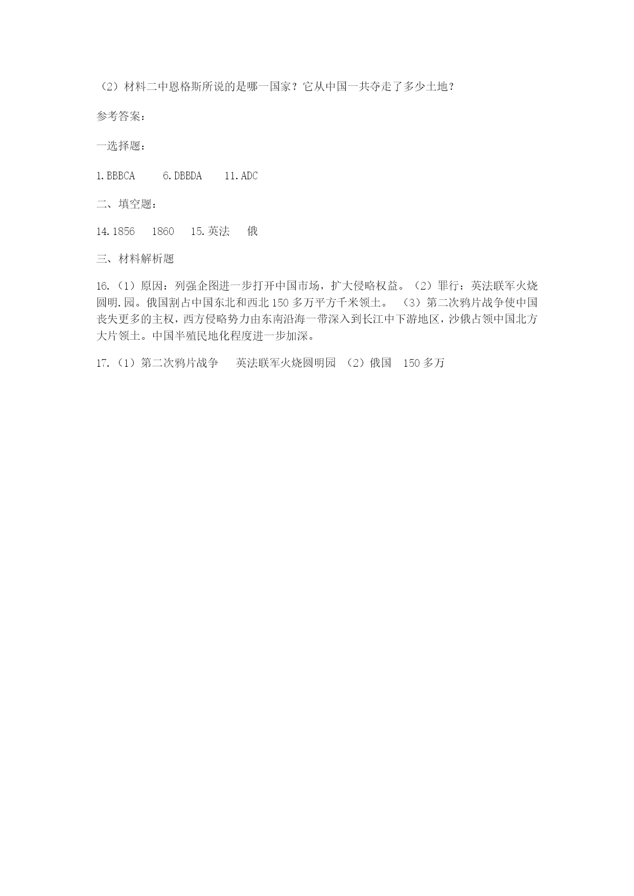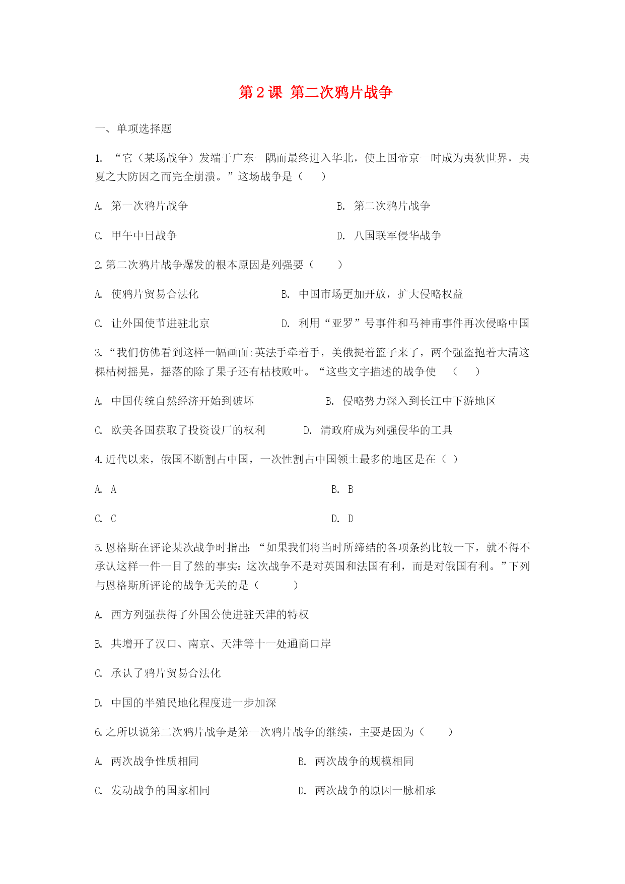 第2课第二次鸦片战争 一、单项选择题 1.“它(某场战争)发端于广东一隅而最终进入华北,使上国帝京一时成为夷狄世界,夷夏之大防因之而完全崩溃。”这场战争是() A.第一次鸦片战争 B.第二次鸦片战争 C.甲午中日战争 D.八国联军侵华战争 2.第二次鸦片战争爆发的根本原因是列强要() A.使鸦片贸易合法化 B.中国市场更加开放,扩大侵略权益 C.让外国使节进驻北京 D.利用“亚罗”号事件和马神甫事件再次侵略中国 3.“我们仿佛看到这样一幅画面:英法手牵着手,美俄提着篮子来了,两个强盗抱着大清这棵枯树摇晃,摇落的除了果子还有枯枝败叶。“这些文字描述的战争使() A.中国传统自然经济开始到破坏 B.侵略势力深入到长江中下游地区 C.欧美各国获取了投资设厂的权利 D.清政府成为列强侵华的工具 4.近代以来,俄国不断割占中国,一次性割占中国领土最多的地区是在() A.A B.B C.C D.D 5.恩格斯在评论某次战争时指出:“如果我们将当时所缔结的各项条约比较一下,就不得不承认这样一件一目了然的事实:这次战争不是对英国和法国有利,而是对俄国有利。”下列与恩格斯所评论的战争无关的是() A.西方列强获得了外国公使进驻天津的特权 B.共增开了汉口、南京、天津等十一处通商口岸 C.承认了鸦片贸易合法化 D.中国的半殖民地化程度进一步加深 6.之所以说第二次鸦片战争是第一次鸦片战争的继续,主要是因为() A.两次战争性质相同 B.两次战争的规模相同 C.发动战争的国家相同 D.两次战争的原因一脉相承 7.圆明园是一座举世闻名的皇家园林,综合了中西建筑艺术的精粹,园内收藏着无数的稀世珍宝和古代文物。有一天,一伙强盗闯入这里疯狂抢劫,然后把它付诸一炬。这伙“强盗”指的是:() A.英军 B.英法联军 C.八国联军 D.日军 8.下列城市按被迫开放的先后顺序排列正确的是() ①南京②广州③天津 A.②③① B.②①③ C.①③② D.①②③ 9.当代著名文化学者余秋雨说:“废墟是昨天派往今天的使者,废墟让我们把地理读成历史。”从下图中我们可以解读到的历史是() A.八国联军火烧圆明园 B.近代中国大门开始被打开 C.太平军抗击洋枪队 D.发生在第二次鸦片战争期间 10.库页岛面积约7.64万平方千米,曾是祖国的第一大岛。该岛屿在近代哪一不平等条约中被割占?() A.中俄《北京条约》 B.中俄《瑷珲条约》 C.中俄《改订条约》 D.中俄《天津条约》 11.马士称:至1839年为止,是由中国规定维持中西关系存在的条件;自1860年以后,转而由西方国家将中西来往的条件“强加于中国”。条约确立的各种原则,成为“支配”中国对外关系的常规。造成这一变化的历史背景是() A.鸦片战争 B.第二次鸦片战争 C.日本侵华战争 D.八国联军侵华战争 11.第二次鸦片战争使中国的半殖民地化程度进一步加深主要是因为() ①中国丧失更多主权②西方侵略势力由东南沿海一带深入到长江中下游地区 ③沙俄占领中国北方大片领土④中国社会的自然经济开始遭到破坏 ①②③ B.①②③④ C.①②④D.①③④ 12.天津是通往北京的门户,地理位置极其重要。决定增开天津为商埠的不平等条约是() A.《虎门条约》 B.《通商章程善后条约》 C.《天津条约》 D.《北京条约》 13.第二次鸦片战争时期,逃往承德避暑山庄的清朝皇帝是() A.道光帝 B.嘉庆帝 C.咸丰帝 D.同治帝 二、填空题 14.第二次鸦片战争的起止时间是年---年。 15.联军火烧圆明园是中华民族的耻辱。国割占中国东北和西北150多万平方千米领土。 三、材料解析题 16.阅读材料,回答问题。 材料:鸦片战争后,西方列强不满足既得利益,企图进一步打开中国市场,扩大侵略权益。英、法两国在俄、美两国的支持下,分别以“亚罗号事件”和“马神甫事件”为借口,对中国发动了第二次鸦片战争。——国家统编教材《中国历史》八年级上册 请回答: 根据材料概括第二次鸦片战争爆发的原因。 (2)指出这次战争中列强对中国犯下的罪行? (3)这次战争对中国造成哪些严重影响? 17.阅读材料,回答问题: 材料一:昨日下午,法国皮诺家族在国家博物馆将圆明园流失文物青铜鼠首和兔首无偿捐赠给中国,这是圆明园被劫掠文物首次以无偿捐赠的方式回归。国家文物局已将这两尊兽首划拨国家博物馆收藏,并将于近期公开展出。至此,圆明园12兽首中已有7件回归。 --《新京报》 材料二:恩格斯说:“不费一枪一弹,从中国夺取了一块大小等于法德两国面积的领土和一条同多瑙河一样长的河流。” 请回答: (1)材料一中的“圆明园的鼠首和兔首”是在哪次战争中流失国外的?和哪一事件有关? (2)材料二中恩格斯所说的是哪一国家?它从中国一共夺走了多少土地? 参考答案: 一选择题: 1.BBBCA