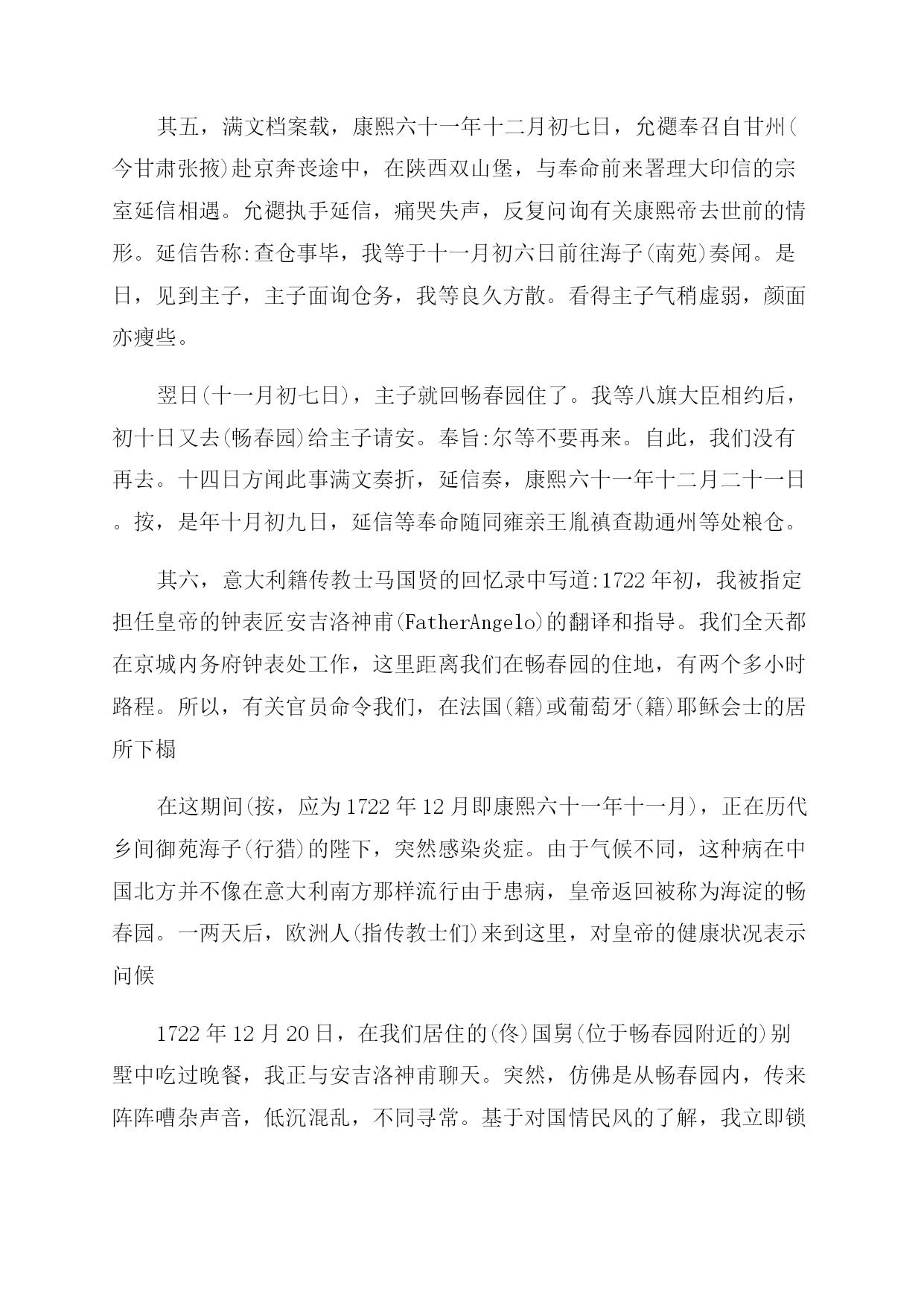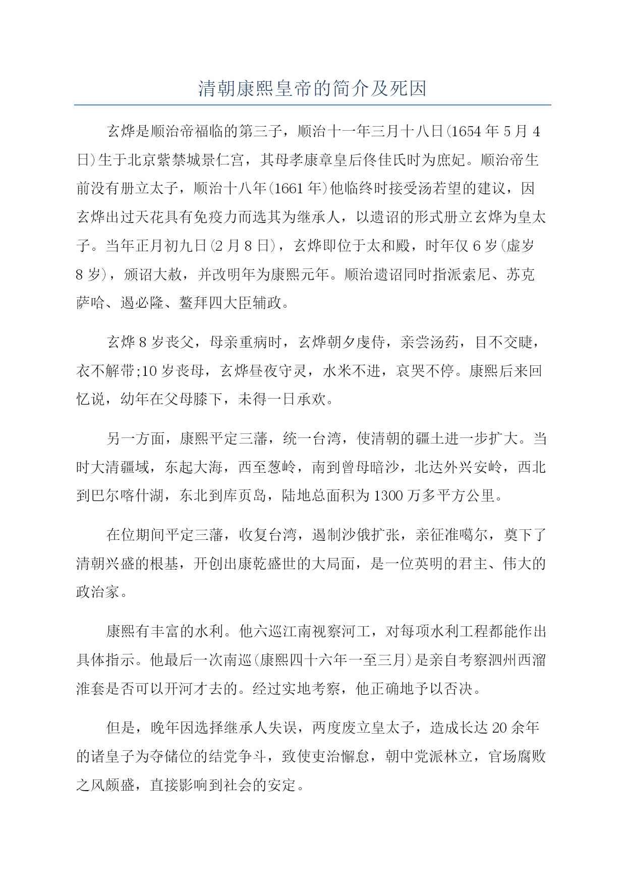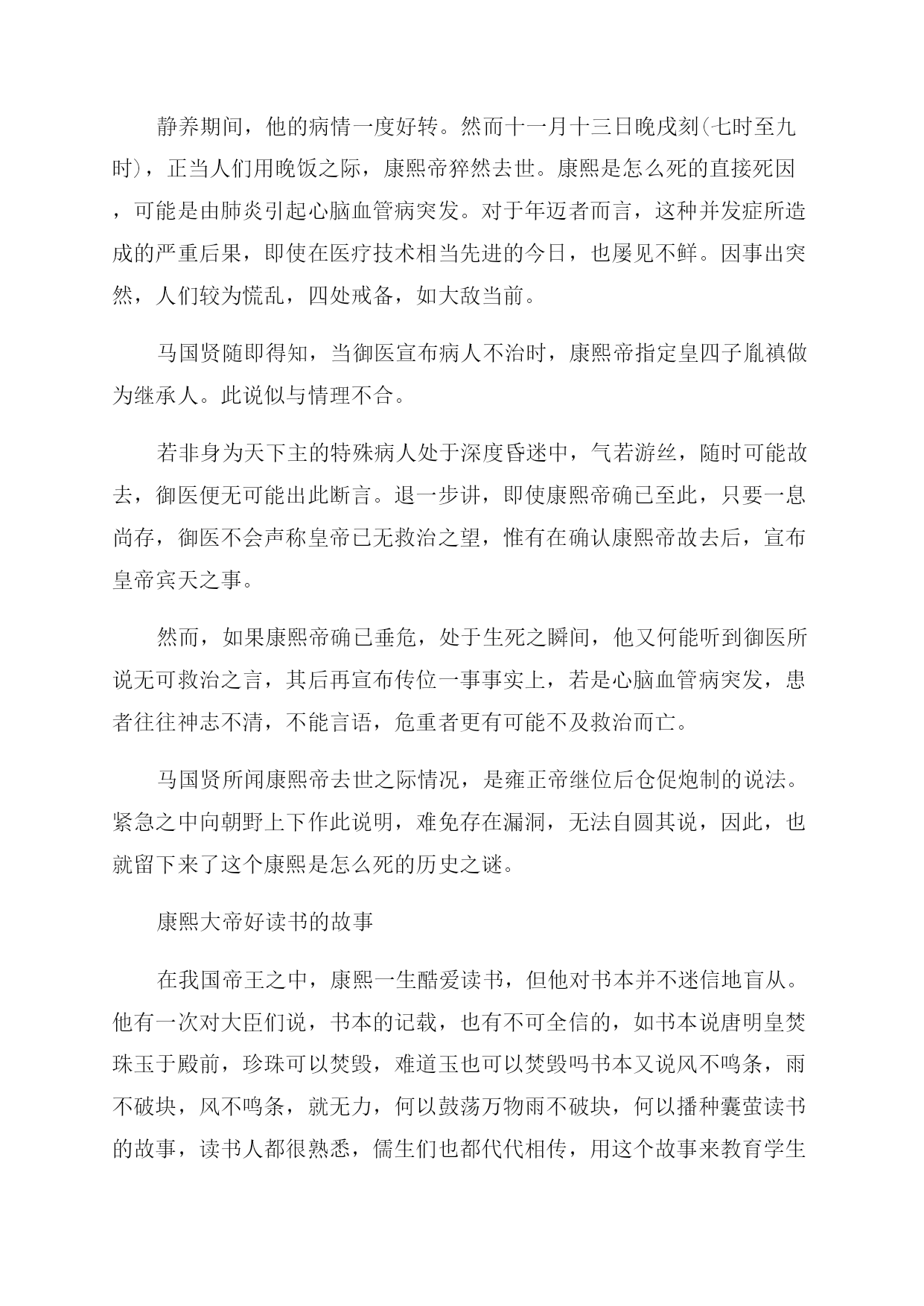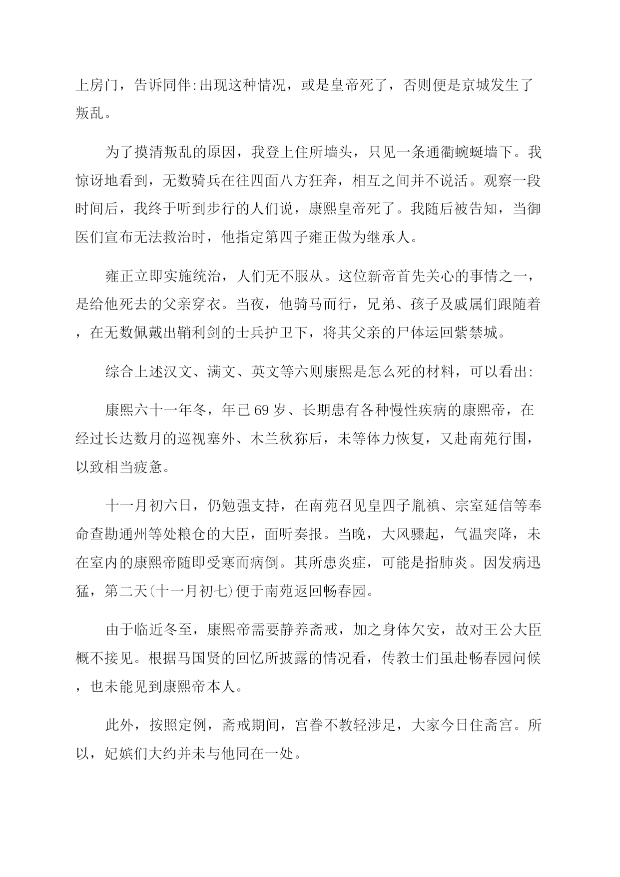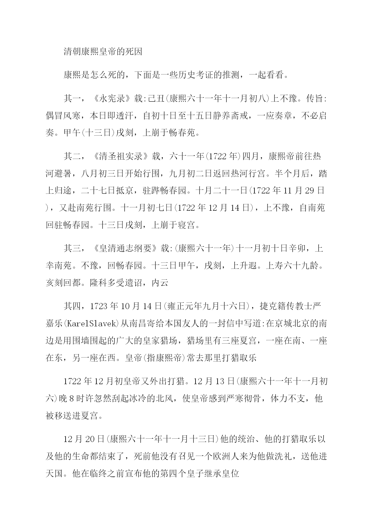 清朝康熙皇帝的简介及死因 玄烨是顺治帝福临的第三子,顺治十一年三月十八日(1654年5月4日)生于北京紫禁城景仁宫,其母孝康章皇后佟佳氏时为庶妃。顺治帝生前没有册立太子,顺治十八年(1661年)他临终时接受汤若望的建议,因玄烨出过天花具有免疫力而选其为继承人,以遗诏的形式册立玄烨为皇太子。当年正月初九日(2月8日),玄烨即位于太和殿,时年仅6岁(虚岁8岁),颁诏大赦,并改明年为康熙元年。顺治遗诏同时指派索尼、苏克萨哈、遏必隆、鳌拜四大臣辅政。 玄烨8岁丧父,母亲重病时,玄烨朝夕虔侍,亲尝汤药,目不交睫,衣不解带;10岁丧母,玄烨昼夜守灵,水米不进,哀哭不停。康熙后来回忆说,幼年在父母膝下,未得一日承欢。 另一方面,康熙平定三藩,统一台湾,使清朝的疆土进一步扩大。当时大清疆域,东起大海,西至葱岭,南到曾母暗沙,北达外兴安岭,西北到巴尔喀什湖,东北到库页岛,陆地总面积为1300万多平方公里。 在位期间平定三藩,收复台湾,遏制沙俄扩张,亲征准噶尔,奠下了清朝兴盛的根基,开创出康乾盛世的大局面,是一位英明的君主、伟大的政治家。 康熙有丰富的水利。他六巡江南视察河工,对每项水利工程都能作出具体指示。他最后一次南巡(康熙四十六年一至三月)是亲自考察泗州西溜淮套是否可以开河才去的。经过实地考察,他正确地予以否决。 但是,晚年因选择继承人失误,两度废立皇太子,造成长达20余年的诸皇子为夺储位的结党争斗,致使吏治懈怠,朝中党派林立,官场腐败之风颇盛,直接影响到社会的安定。 清朝康熙皇帝的死因 康熙是怎么死的,下面是一些历史考证的推测,一起看看。 其一,《永宪录》载:己丑(康熙六十一年十一月初八)上不豫。传旨:偶冒风寒,本日即透汗,自初十日至十五日静养斋戒,一应奏章,不必启奏。甲午(十三日)戌刻,上崩于畅春苑。 其二,《清圣祖实录》载,六十一年(1722年)四月,康熙帝前往热河避暑,八月初三日开始行围,九月初二日返回热河行宫。半个月后,踏上归途,二十七日抵京,驻跸畅春园。十月二十一日(1722年11月29日),又赴南苑行围。十一月初七日(1722年12月14日),上不豫,自南苑回驻畅春园。十三日戌刻,上崩于寝宫。 其三,《皇清通志纲要》载:(康熙六十一年)十一月初十日辛卯,上幸南苑。不豫,回畅春园。十三日甲午,戌刻,上升遐。上寿六十九龄。亥刻回都。隆科多受遗诏,内云 其四,1723年10月14日(雍正元年九月十六日),捷克籍传教士严嘉乐(KarelSlavek)从南昌寄给本国友人的一封信中写道:在京城北京的南边是用围墙围起的广大的皇家猎场,猎场里有三座夏宫,一座在南、一座在东,另一座在西。皇帝(指康熙帝)常去那里打猎取乐 1722年12月初皇帝又外出打猎。12月13日(康熙六十一年十一月初六)晚8时许忽然刮起冰冷的北风,使皇帝感到严寒彻骨,体力不支,他被移送进夏宫。 12月20日(康熙六十一年十一月十三日)他的统治、他的打猎取乐以及他的生命都结束了,死前他没有召见一个欧洲人来为他做洗礼,送他进天国。他在临终之前宣布他的第四个皇子继承皇位 其五,满文档案载,康熙六十一年十二月初七日,允禵奉召自甘州(今甘肃张掖)赴京奔丧途中,在陕西双山堡,与奉命前来署理大印信的宗室延信相遇。允禵执手延信,痛哭失声,反复问询有关康熙帝去世前的情形。延信告称:查仓事毕,我等于十一月初六日前往海子(南苑)奏闻。是日,见到主子,主子面询仓务,我等良久方散。看得主子气稍虚弱,颜面亦瘦些。 翌日(十一月初七日),主子就回畅春园住了。我等八旗大臣相约后,初十日又去(畅春园)给主子请安。奉旨:尔等不要再来。自此,我们没有再去。十四日方闻此事满文奏折,延信奏,康熙六十一年十二月二十一日。按,是年十月初九日,延信等奉命随同雍亲王胤禛查勘通州等处粮仓。 其六,意大利籍传教士马国贤的回忆录中写道:1722年初,我被指定担任皇帝的钟表匠安吉洛神甫(FatherAngelo)的翻译和指导。我们全天都在京城内务府钟表处工作,这里距离我们在畅春园的住地,有两个多小时路程。所以,有关官员命令我们,在法国(籍)或葡萄牙(籍)耶稣会士的居所下榻 在这期间(按,应为1722年12月即康熙六十一年十一月),正在历代乡间御苑海子(行猎)的陛下,突然感染炎症。由于气候不同,这种病在中国北方并不像在意大利南方那样流行由于患病,皇帝返回被称为海淀的畅春园。一两天后,欧洲人(指传教士们)来到这里,对皇帝的健康状况表示问候 1722年12月20日,在我们居住的(佟)国舅(位于畅春园附近的)别墅中吃过晚餐,我正与安吉洛神甫聊天。突然,仿佛是从畅春园内,传来阵阵嘈杂声音,低沉混乱,不同寻常。基于对国情民风的了解,我立即锁上房门,告诉同伴:出现这种情况,或是皇帝死了,否则便是京城发生了叛乱。 为了摸清叛乱的原因,我登上住所墙