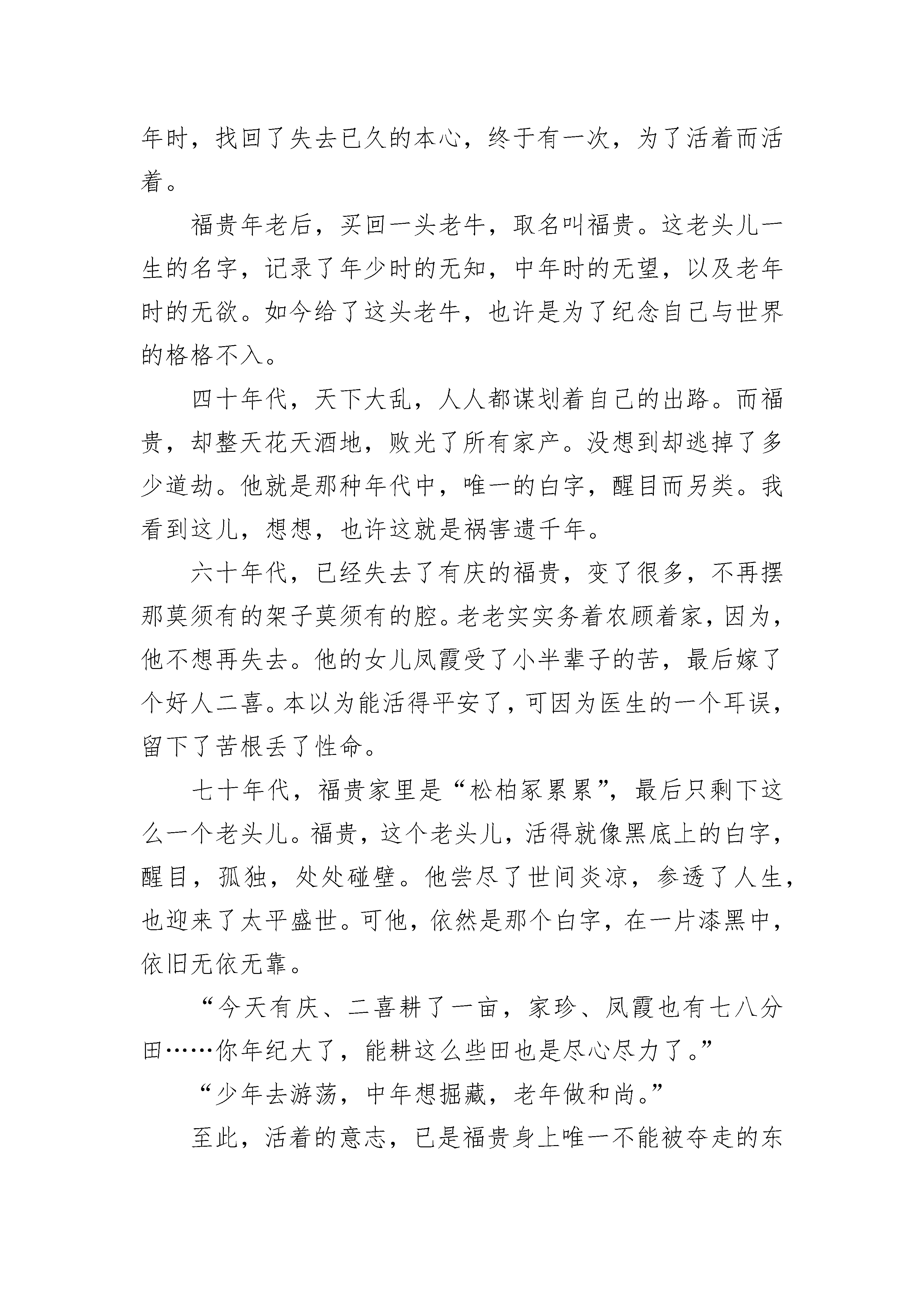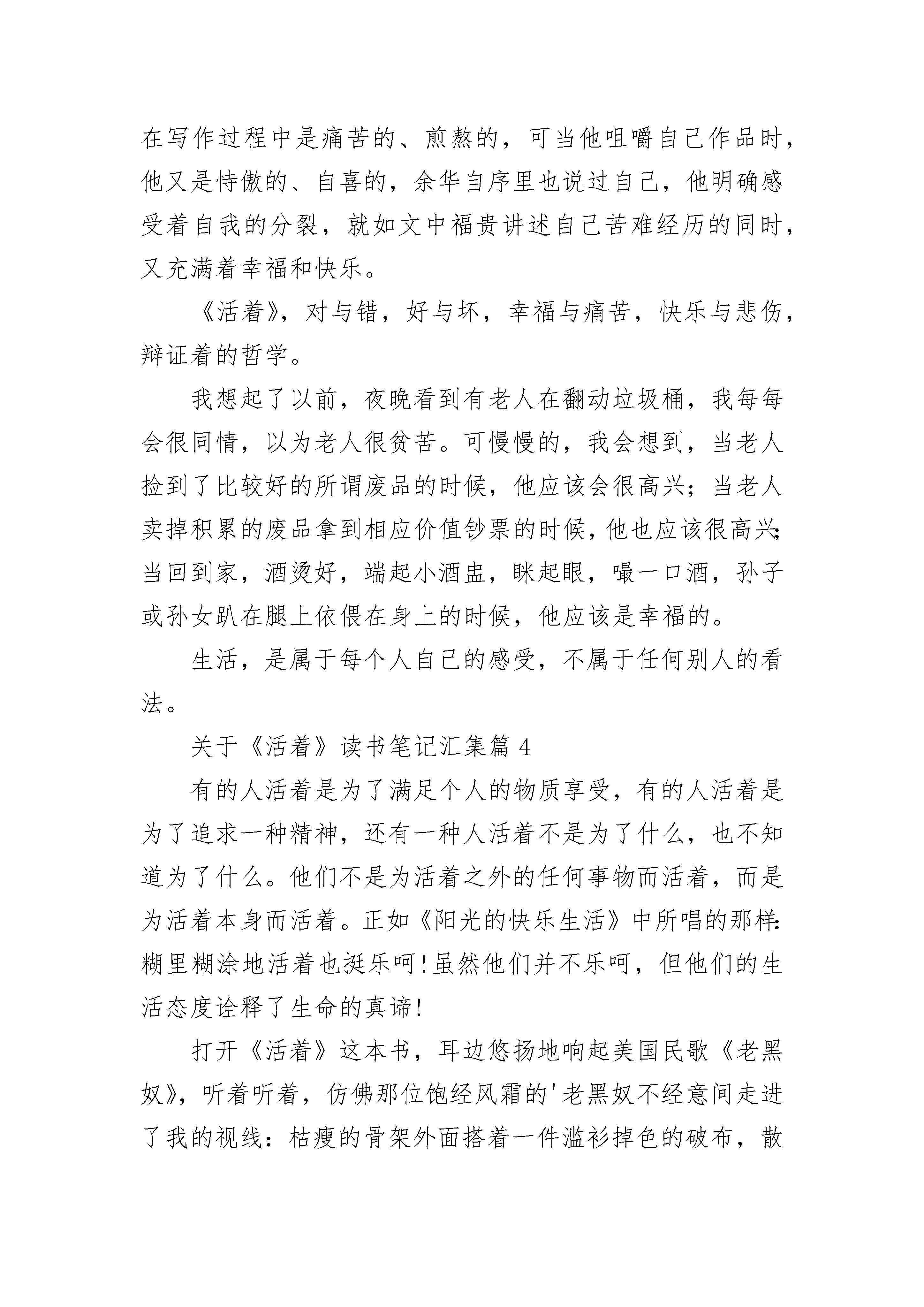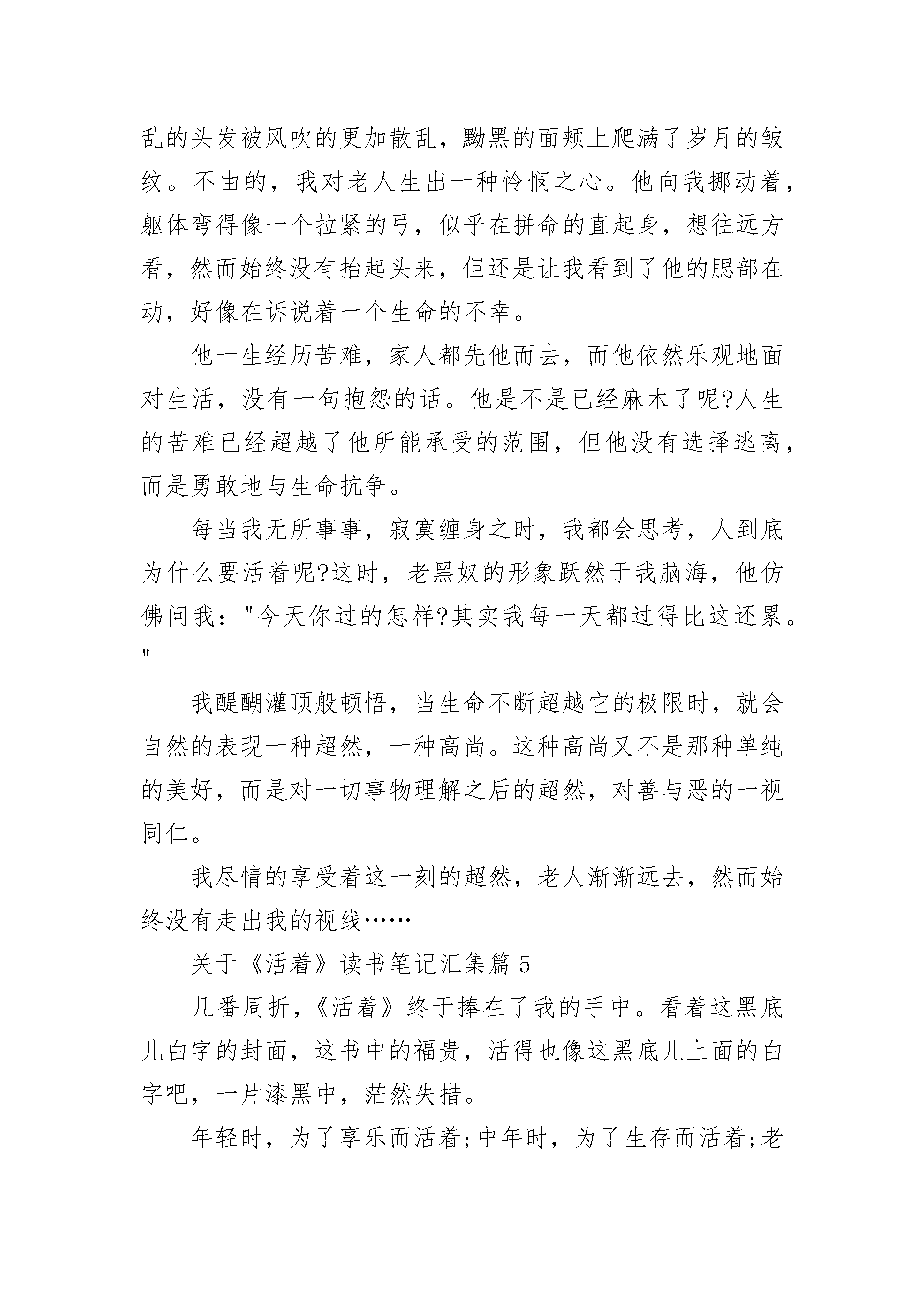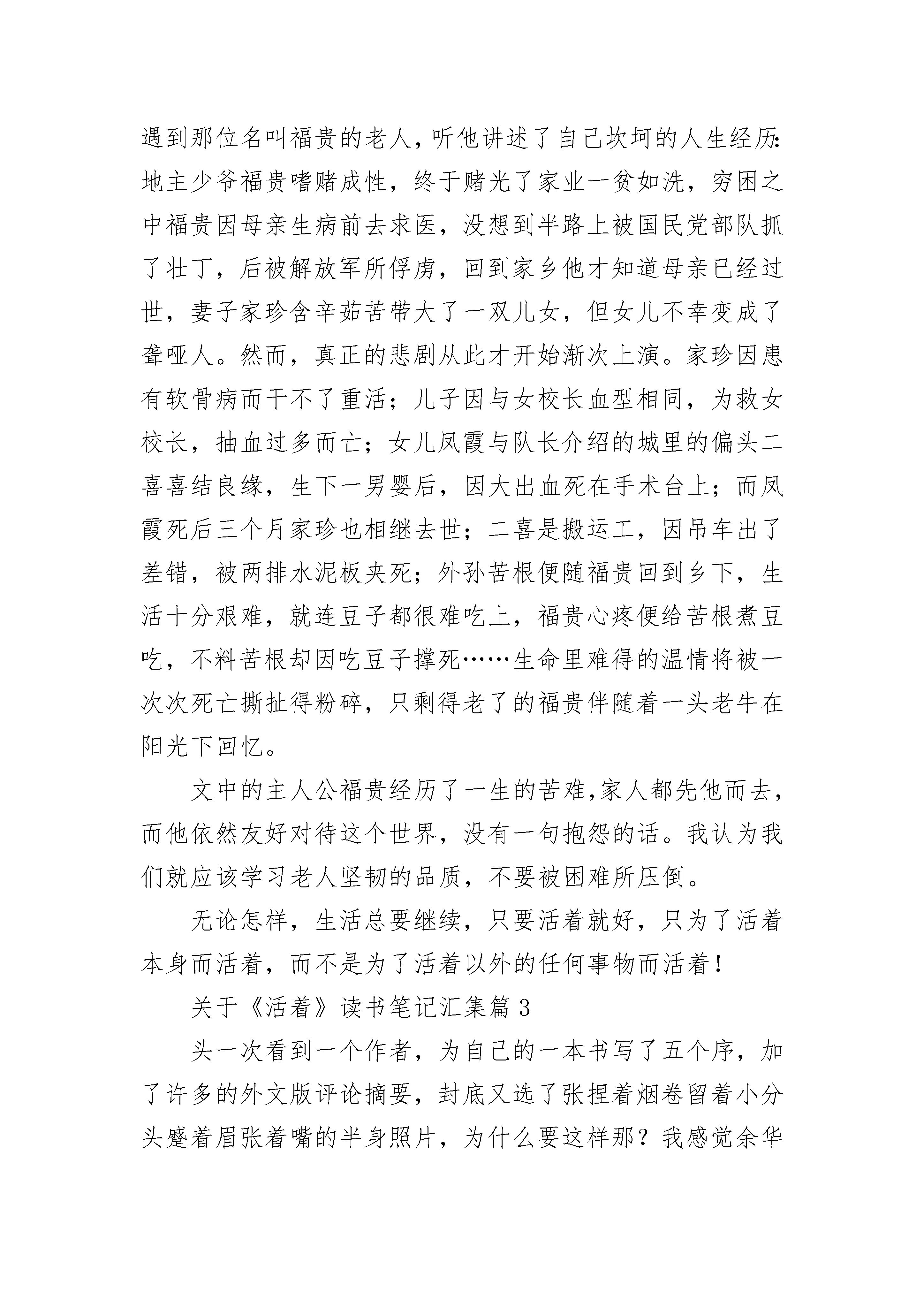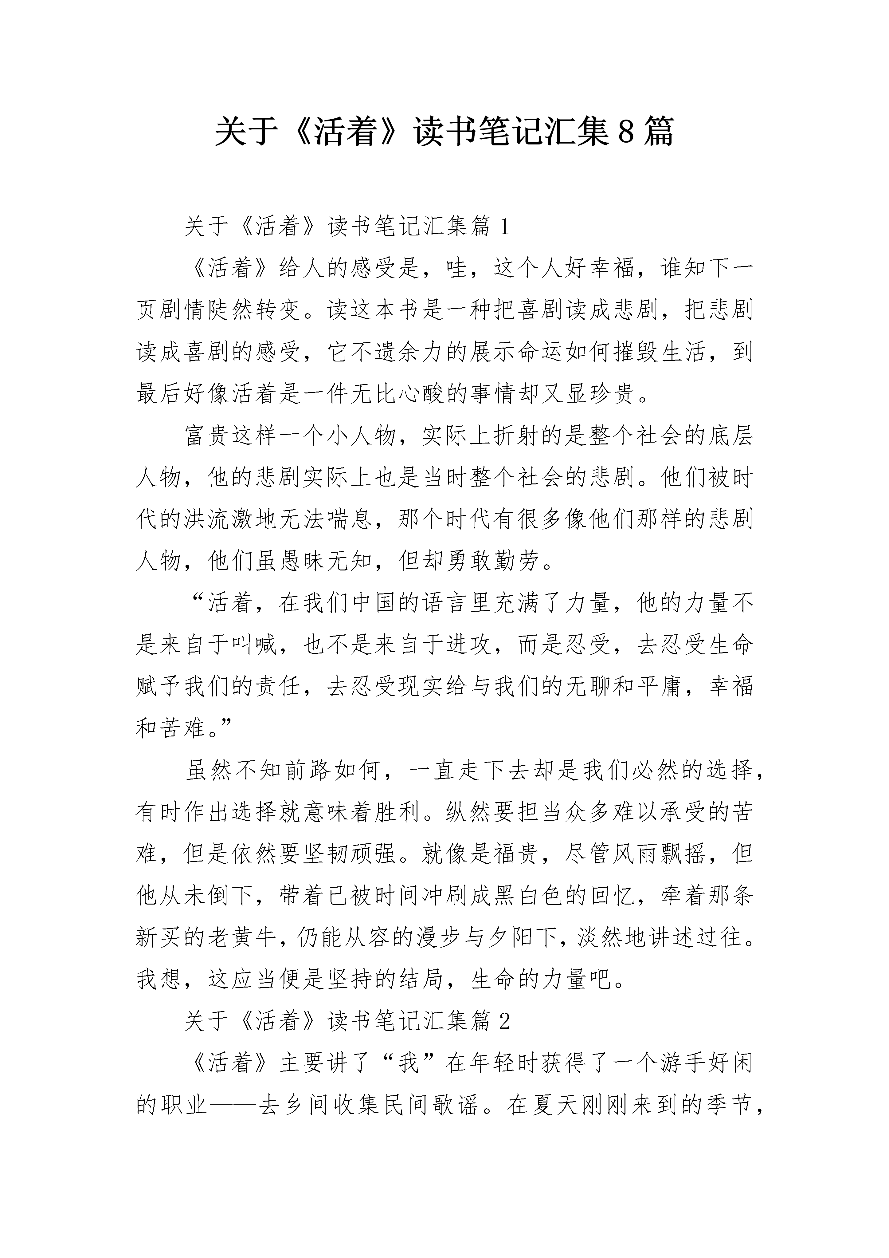 关于《活着》读书笔记汇集8篇关于《活着》读书笔记汇集篇1《活着》给人的感受是,哇,这个人好幸福,谁知下一页剧情陡然转变。读这本书是一种把喜剧读成悲剧,把悲剧读成喜剧的感受,它不遗余力的展示命运如何摧毁生活,到最后好像活着是一件无比心酸的事情却又显珍贵。富贵这样一个小人物,实际上折射的是整个社会的底层人物,他的悲剧实际上也是当时整个社会的悲剧。他们被时代的洪流激地无法喘息,那个时代有很多像他们那样的悲剧人物,他们虽愚昧无知,但却勇敢勤劳。“活着,在我们中国的语言里充满了力量,他的力量不是来自于叫喊,也不是来自于进攻,而是忍受,去忍受生命赋予我们的责任,去忍受现实给与我们的无聊和平庸,幸福和苦难。”虽然不知前路如何,一直走下去却是我们必然的选择,有时作出选择就意味着胜利。纵然要担当众多难以承受的苦难,但是依然要坚韧顽强。就像是福贵,尽管风雨飘摇,但他从未倒下,带着已被时间冲刷成黑白色的回忆,牵着那条新买的老黄牛,仍能从容的漫步与夕阳下,淡然地讲述过往。我想,这应当便是坚持的结局,生命的力量吧。关于《活着》读书笔记汇集篇2《活着》主要讲了“我”在年轻时获得了一个游手好闲的职业——去乡间收集民间歌谣。在夏天刚刚来到的季节,遇到那位名叫福贵的老人,听他讲述了自己坎坷的人生经历:地主少爷福贵嗜赌成性,终于赌光了家业一贫如洗,穷困之中福贵因母亲生病前去求医,没想到半路上被国民党部队抓了壮丁,后被解放军所俘虏,回到家乡他才知道母亲已经过世,妻子家珍含辛茹苦带大了一双儿女,但女儿不幸变成了聋哑人。然而,真正的悲剧从此才开始渐次上演。家珍因患有软骨病而干不了重活;儿子因与女校长血型相同,为救女校长,抽血过多而亡;女儿凤霞与队长介绍的城里的偏头二喜喜结良缘,生下一男婴后,因大出血死在手术台上;而凤霞死后三个月家珍也相继去世;二喜是搬运工,因吊车出了差错,被两排水泥板夹死;外孙苦根便随福贵回到乡下,生活十分艰难,就连豆子都很难吃上,福贵心疼便给苦根煮豆吃,不料苦根却因吃豆子撑死……生命里难得的温情将被一次次死亡撕扯得粉碎,只剩得老了的福贵伴随着一头老牛在阳光下回忆。文中的主人公福贵经历了一生的苦难,家人都先他而去,而他依然友好对待这个世界,没有一句抱怨的话。我认为我们就应该学习老人坚韧的品质,不要被困难所压倒。无论怎样,生活总要继续,只要活着就好,只为了活着本身而活着,而不是为了活着以外的任何事物而活着!关于《活着》读书笔记汇集篇3头一次看到一个作者,为自己的一本书写了五个序,加了许多的外文版评论摘要,封底又选了张捏着烟卷留着小分头蹙着眉张着嘴的半身照片,为什么要这样那?我感觉余华在写作过程中是痛苦的、煎熬的,可当他咀嚼自己作品时,他又是恃傲的、自喜的,余华自序里也说过自己,他明确感受着自我的分裂,就如文中福贵讲述自己苦难经历的同时,又充满着幸福和快乐。《活着》,对与错,好与坏,幸福与痛苦,快乐与悲伤,辩证着的哲学。我想起了以前,夜晚看到有老人在翻动垃圾桶,我每每会很同情,以为老人很贫苦。可慢慢的,我会想到,当老人捡到了比较好的所谓废品的时候,他应该会很高兴;当老人卖掉积累的废品拿到相应价值钞票的时候,他也应该很高兴;当回到家,酒烫好,端起小酒盅,眯起眼,嘬一口酒,孙子或孙女趴在腿上依偎在身上的时候,他应该是幸福的。生活,是属于每个人自己的感受,不属于任何别人的看法。关于《活着》读书笔记汇集篇4有的人活着是为了满足个人的物质享受,有的人活着是为了追求一种精神,还有一种人活着不是为了什么,也不知道为了什么。他们不是为活着之外的任何事物而活着,而是为活着本身而活着。正如《阳光的快乐生活》中所唱的那样:糊里糊涂地活着也挺乐呵!虽然他们并不乐呵,但他们的生活态度诠释了生命的真谛!打开《活着》这本书,耳边悠扬地响起美国民歌《老黑奴》,听着听着,仿佛那位饱经风霜的'老黑奴不经意间走进了我的视线:枯瘦的骨架外面搭着一件滥衫掉色的破布,散乱的头发被风吹的更加散乱,黝黑的面颊上爬满了岁月的皱纹。不由的,我对老人生出一种怜悯之心。他向我挪动着,躯体弯得像一个拉紧的弓,似乎在拼命的直起身,想往远方看,然而始终没有抬起头来,但还是让我看到了他的腮部在动,好像在诉说着一个生命的不幸。他一生经历苦难,家人都先他而去,而他依然乐观地面对生活,没有一句抱怨的话。他是不是已经麻木了呢?人生的苦难已经超越了他所能承受的范围,但他没有选择逃离,而是勇敢地与生命抗争。每当我无所事事,寂寞缠身之时,我都会思考,人到底为什么要活着呢?这时,老黑奴的形象跃然于我脑海,他仿佛问我:"今天你过的怎样?其实我每一天都过得比这还累。"我醍醐灌顶般顿悟,当生命不断超越它的极限时,就会自然的表现一种超然,一种高尚。这种高尚又不是那种单纯的美好,而是对一切事物理解之后的超然,对善与恶的一视同仁。我尽情的享
