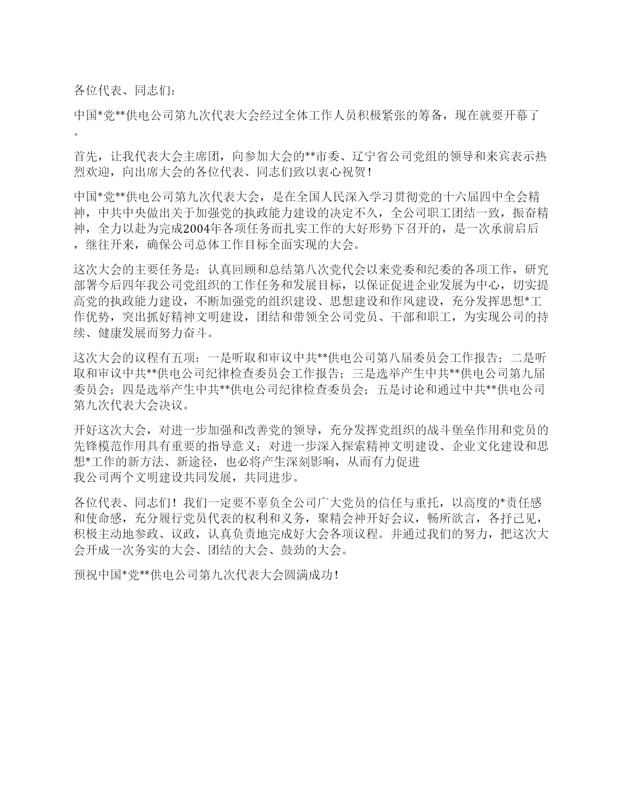 各位代表、同志们: 中国*党**供电公司第九次代表大会经过全体工作人员积极紧张的筹备,现在就要开幕了。 首先,让我代表大会主席团,向参加大会的**市委、辽宁省公司党组的领导和来宾表示热烈欢迎,向出席大会的各位代表、同志们致以衷心祝贺! 中国*党**供电公司第九次代表大会,是在全国人民深入学习贯彻党的十六届四中全会精神,中共中央做出关于加强党的执政能力建设的决定不久,全公司职工团结一致,振奋精神,全力以赴为完成2004年各项任务而扎实工作的大好形势下召开的,是一次承前启后,继往开来,确保公司总体工作目标全面实现的大会。 这次大会的主要任务是:认真回顾和总结第八次党代会以来党委和纪委的各项工作,研究部署今后四年我公司党组织的工作任务和发展目标,以保证促进企业发展为中心,切实提高党的执政能力建设,不断加强党的组织建设、思想建设和作风建设,充分发挥思想*工作优势,突出抓好精神文明建设,团结和带领全公司党员、干部和职工,为实现公司的持续、健康发展而努力奋斗。 这次大会的议程有五项:一是听取和审议中共**供电公司第八届委员会工作报告;二是听取和审议中共**供电公司纪律检查委员会工作报告;三是选举产生中共**供电公司第九届委员会;四是选举产生中共**供电公司纪律检查委员会;五是讨论和通过中共**供电公司第九次代表大会决议。 开好这次大会,对进一步加强和改善党的领导,充分发挥党组织的战斗堡垒作用和党员的先锋模范作用具有重要的指导意义;对进一步深入探索精神文明建设、企业文化建设和思想*工作的新方法、新途径,也必将产生深刻影响,从而有力促进我公司两个文明建设共同发展,共同进步。 各位代表、同志们!我们一定要不辜负全公司广大党员的信任与重托,以高度的*责任感和使命感,充分履行党员代表的权利和义务,聚精会神开好会议,畅所欲言,各抒己见,积极主动地参政、议政,认真负责地完成好大会各项议程。并通过我们的努力,把这次大会开成一次务实的大会、团结的大会、鼓劲的大会。 预祝中国*党**供电公司第九次代表大会圆满成功!
