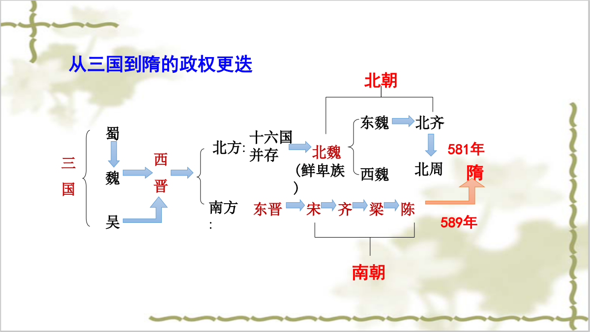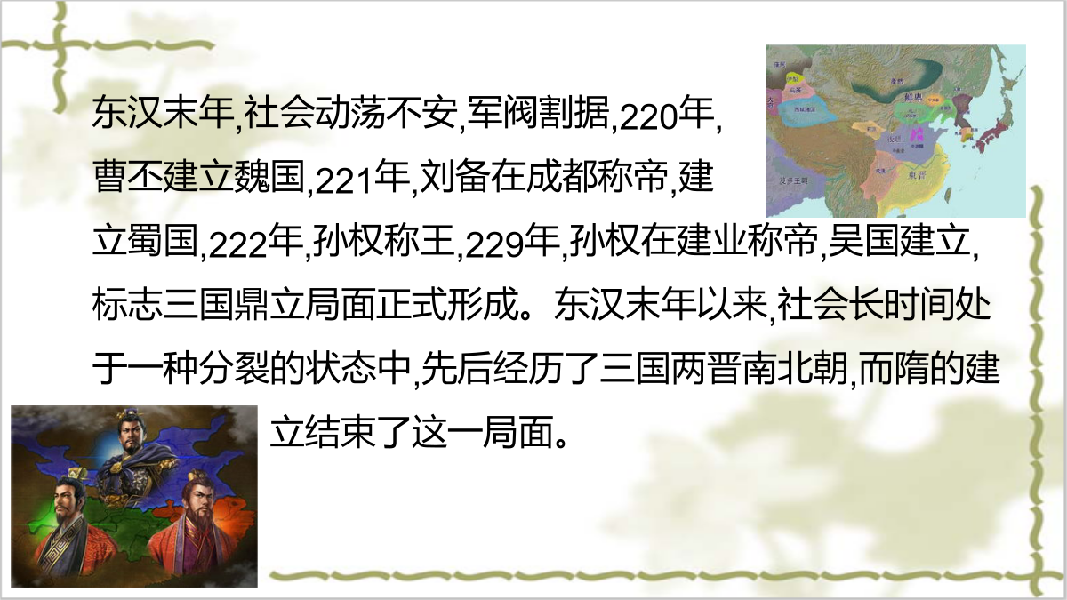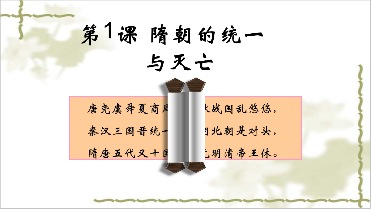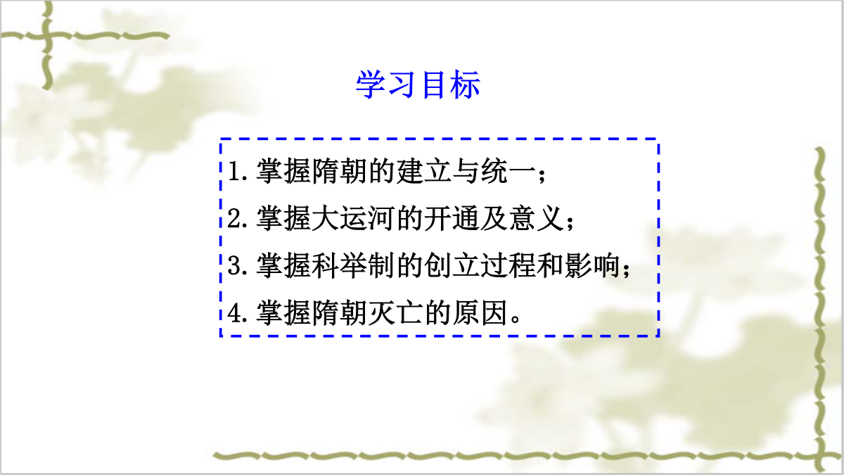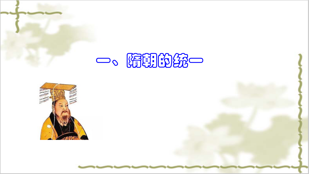 第1课隋朝的统一与灭亡学习目标一、隋朝的统一东汉末年,社会动荡不安,军阀割据,220年, 曹丕建立魏国,221年,刘备在成都称帝,建 立蜀国,222年,孙权称王,229年,孙权在建业称帝,吴国建立,标志三国鼎立局面正式形成。东汉末年以来,社会长时间处于一种分裂的状态中,先后经历了三国两晋南北朝,而隋的建 立结束了这一局面。从三国到隋的政权更迭1.隋朝建立:581年,杨坚建立隋朝,以长安为都城,杨坚就是隋文帝。历史传说——胭脂井统一后的隋朝疆域思考:隋朝的统一有何历史意义?想一想:中国古代历史上曾出现了四次统一,大家思考一下,在隋朝统一之前,出现了哪两次统一?这些统一出现在什么时候?时间 项目含嘉仓,一个在文献里屡屡提到,却给墨甚少的名字,直到上世纪70年代,含嘉仓才在洛阳市老城区北部被发掘。据勘察,含嘉仓内已勘探出粮窖287座,其中160号仓窖保存有约50万斤炭化谷物。50万斤粮食在当时的生产条件和生活水平下,约合近千农民一年辛勤劳动的果实、数千农民一年的口粮,可见含嘉仓规模之大,储粮之丰富。3.隋的发展二、开通大运河1.目的:加强南北交通,巩固隋王朝对全国的统治最北端在涿郡, 中心在洛阳, 最南端在余杭。永济渠、 通济渠、 邗沟、 江南河。海河、 黄河、 淮河、 长江、 钱塘江。3.概况:大运河以洛阳为中心,北抵涿郡,南至余杭,连接了海河、黄河、淮河、长江和钱塘江五大水系,全长2700多千米这句话的意思是,国家水上运粮食全靠大运河。 在古代,船是主要的交通工具,水运粮食比起陆运,装载量的大,速度快。隋炀帝时为什么能够开通纵贯南北的大运河?(课本上哪些内容体现出这一点)开通后的影响是什么?在评价隋朝大运河时,既要看到它的消极性,即大运河的开凿加重了老百姓的负担;又要看到它的积极性,即它的开通,大大促进了我国南北地区政治、经济和文化的交流。三、开创科举取士制度1.背景:魏晋南北朝时期,官吏的选拔权由上层权贵 垄断,选官看重门第,不太注重才能2.诞生:(1)隋文帝初步建立起通过考试选拔人才的制度; (2)隋炀帝创立进士科,标志着科举制的正式确立科举制的诞生,打破了按门第高低任用官员的弊端,使一些有才能的人得到重用,这其中就有唐初名相房玄龄,著名经学家孔颖达。3.影响 (1)是中国古代选官制度的一大变革,加强了皇帝在选官和用人上的权力; (2)扩大了官吏选拔的范围,使有才学的人能够由此参政,促进了社会阶层的流动; (3)推动了教育的发展 (4)科举制成为历朝选拔官吏的主要制度,一直维持了约1300年四、隋朝的灭亡1.根本原因:隋炀帝好大喜功,不恤民力,又纵情享乐,奢侈无度材料:隋末,天下地主武装纷纷起兵造反,而以李唐政权为根据地的关中地区最多,关中地区集中了大量的地主阶级上层人物,在地方上势力强大,在社会上声望卓著,在政治上辐射很广。3.结果:在起义军的打击下,隋朝的统治面临瓦解;618年,隋炀帝被叛军杀死,隋朝灭亡隋朝是一个短暂而辉煌的朝代。581年,隋朝建立,589年,隋统一全国。隋开凿的大运河,成为中国南北交通的大动脉,促进了南北经济文化的交流和发展,维护和加强了国家政治的统一。大运河是隋代劳动人民对中国历史的伟大贡献。本课还学习了科举制这一内容,它从隋朝创立,唐朝完善,明清衰落,到1905年废除,约1300年的历史。隋唐的科举制是今天考试制度的起源,它的创立目的是选官。今天的考试,有的仍是为了选官,比如“公务员考试”;有的是为了选拔人才,如“高考”“中考”;更主要的是演化成为一种评价我们知识能力态度的手段,时时刻刻在发挥作用。对比下面两则材料,我们可以从中吸取怎样的经验教训? 材料一百役繁兴,六军不息,竭尽国力,大兴工役,唯其权力意志是用,根本不考虑民众的承受能力。 ——袁刚《暴君隋炀帝评价的论辨——关于暴君之暴的政治分析》 材料二唐太宗毫不含糊地说:“为君之道,必须先存百姓,若损百姓以奉其身,犹割股以啖腹,腹饱而身毙。”——韩昇《盛世是这样治理的》二世而亡:秦持续17年,隋持续了37年课堂小结随堂训练3.隋炀帝乘“龙舟”从洛阳巡游到扬州,要经过大运河的哪几段() ①通济渠②永济渠③邗沟④江南河 A.①②③B.②③④C.①③D.①④ 4、魏晋时期,选拔官员的主要标准是() A、才能B、财产C、门第D、民族 5、科举制诞生时,统治者选拔人才的考试内容是() A、儒家经书B、对时事的看法 C、科技知识D、风俗民情 6、最早用分科考试办法选拔官员是在() A、魏晋时期B、隋朝时期 C、唐朝初期D、唐朝中期谢谢欣赏