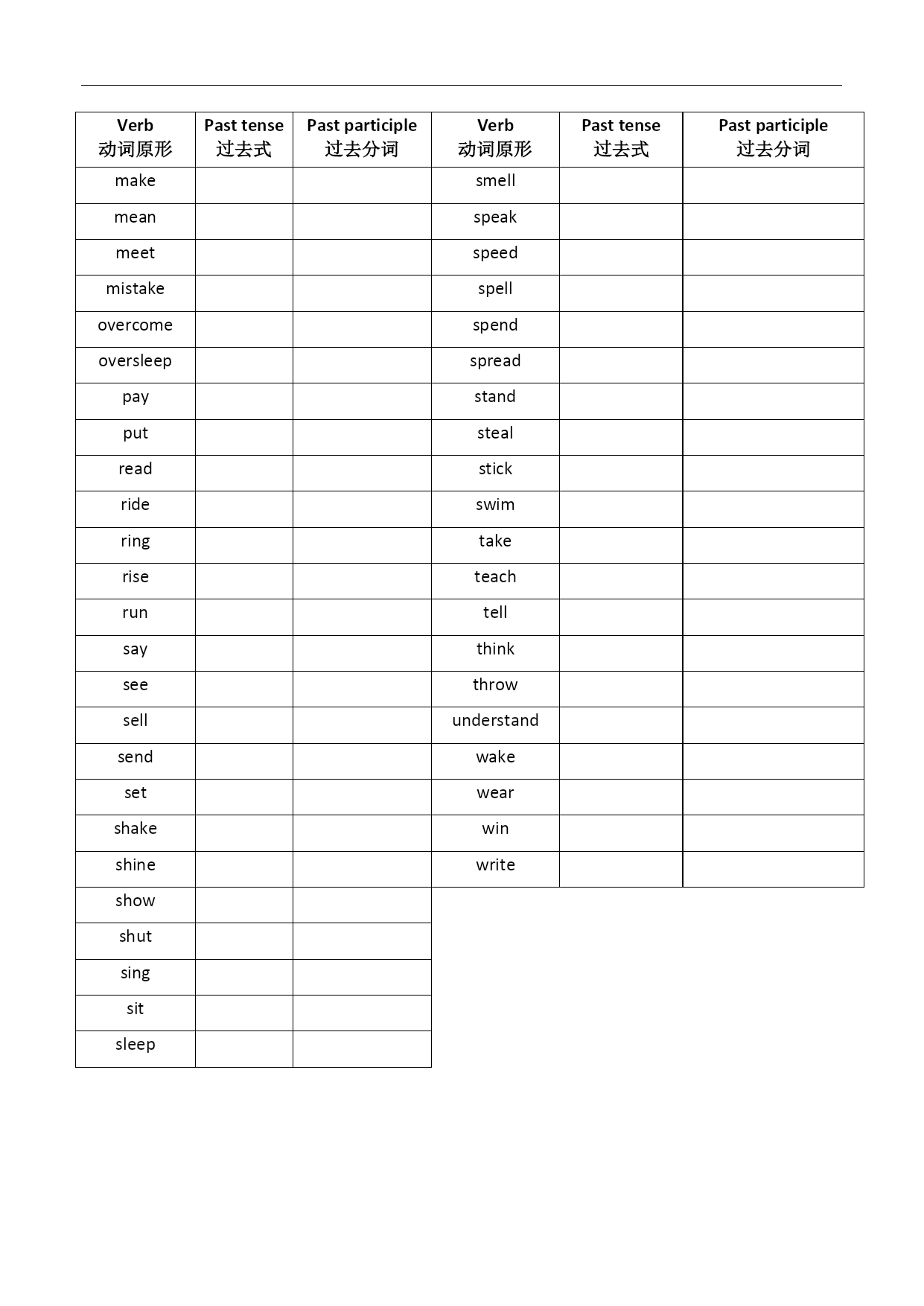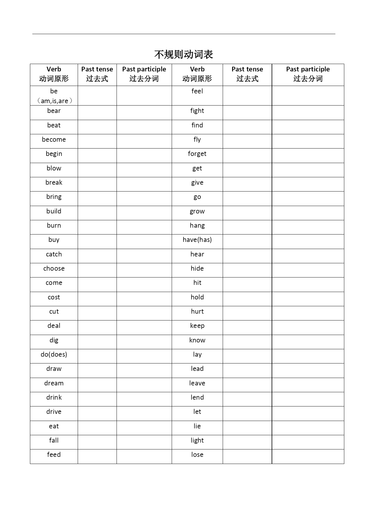 不规则动词表 Verb 动词原形Pasttense 过去式Pastparticiple 过去分词Verb 动词原形Pasttense 过去式Pastparticiple 过去分词be(am,is,are)feelbearfightbeatfindbecomeflybeginforgetblowgetbreakgivebringgobuildgrowburnhangbuyhave(has)catchhearchoosehidecomehitcostholdcuthurtdealkeepdigknowdo(does)laydrawleaddreamleavedrinklenddriveleteatliefalllightfeedloseVerb 动词原形Pasttense 过去式Pastparticiple 过去分词Verb 动词原形Pasttense 过去式Pastparticiple 过去分词makesmellmeanspeakmeetspeedmistakespellovercomespendoversleepspreadpaystandputstealreadstickrideswimringtakeriseteachruntellsaythinkseethrowsellunderstandsendwakesetwearshakewinshinewriteshowshutsingsitsleep