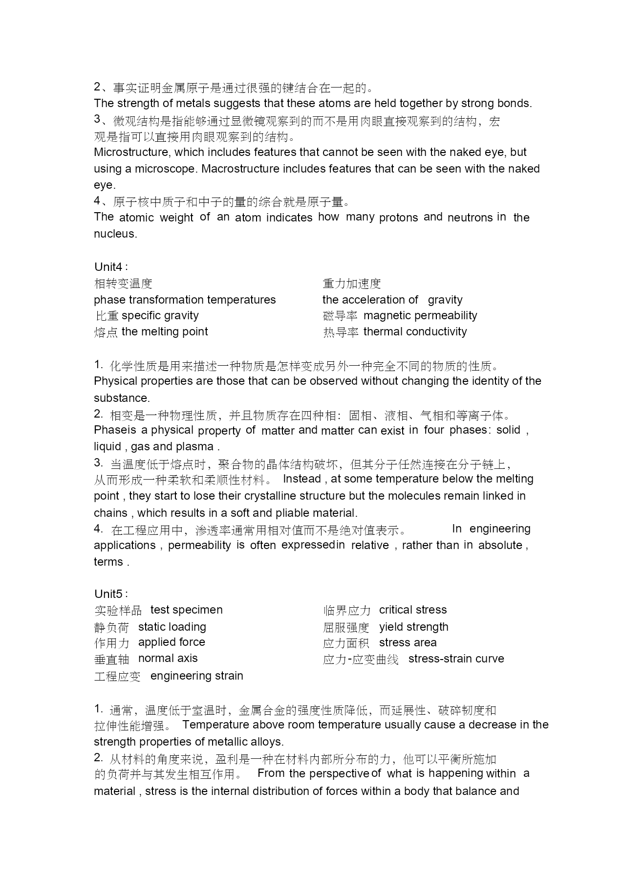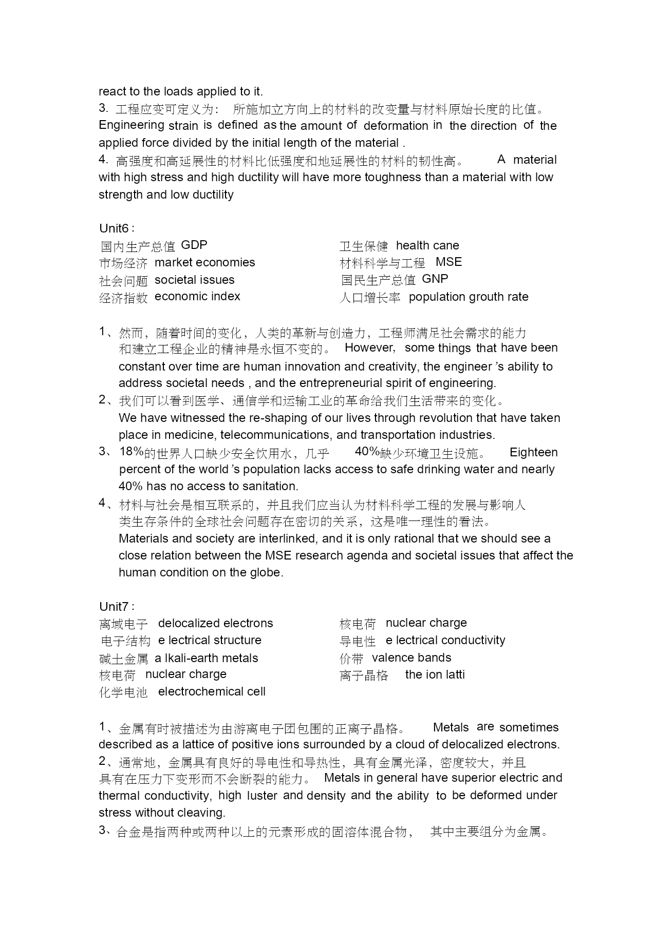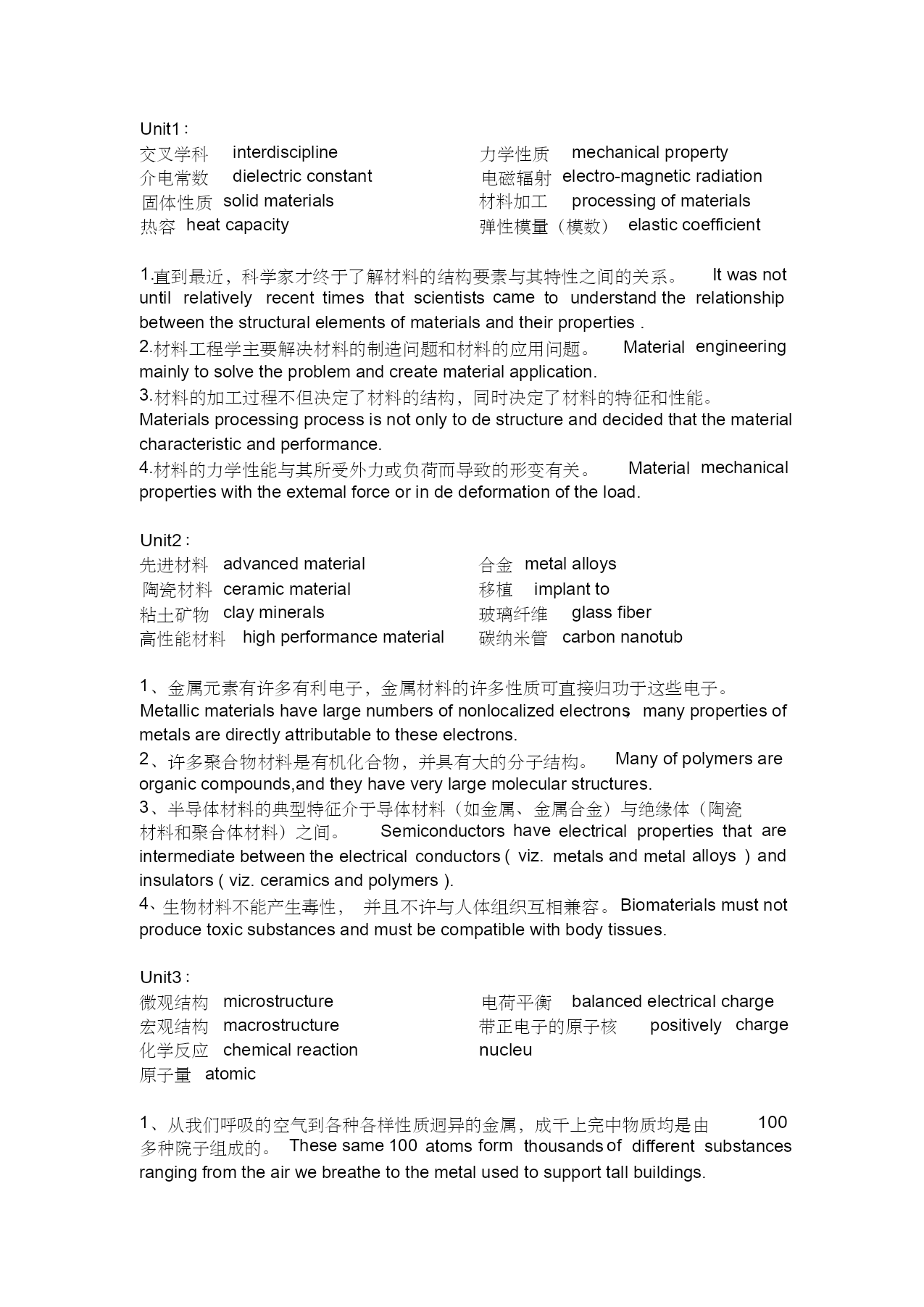 Unit1: 交叉学科interdiscipline力学性质mechanicalproperty 介电常数dielectricconstant电磁辐射electro-magneticradiation 固体性质solidmaterials材料加工processingofmaterials 热容heatcapacity弹性模量(模数)elasticcoefficient 1.直到最近,科学家才终于了解材料的结构要素与其特性之间的关系。Itwasnot untilrelativelyrecenttimesthatscientistscametounderstandtherelationship betweenthestructuralelementsofmaterialsandtheirproperties. 2.材料工程学主要解决材料的制造问题和材料的应用问题。Materialengineering mainlytosolvetheproblemandcreatematerialapplication. 3.材料的加工过程不但决定了材料的结构,同时决定了材料的特征和性能。 Materialsprocessingprocessisnotonlytodestructureanddecidedthatthematerial characteristicandperformance. 4.材料的力学性能与其所受外力或负荷而导致的形变有关。Materialmechanical propertieswiththeextemalforceorindedeformationoftheload. Unit2: 先进材料advancedmaterial合金metalalloys 陶瓷材料ceramicmaterial移植implantto 粘土矿物clayminerals玻璃纤维glassfiber 高性能材料highperformancematerial碳纳米管carbonnanotub 1、金属元素有许多有利电子,金属材料的许多性质可直接归功于这些电子。 Metallicmaterialshavelargenumbersofnonlocalizedelectrons,manypropertiesof metalsaredirectlyattributabletotheseelectrons. 2、许多聚合物材料是有机化合物,并具有大的分子结构。Manyofpolymersare organiccompounds,andtheyhaveverylargemolecularstructures. 3、半导体材料的典型特征介于导体材料(如金属、金属合金)与绝缘体(陶瓷 材料和聚合体材料)之间。Semiconductorshaveelectricalpropertiesthatare intermediatebetweentheelectricalconductors(viz.metalsandmetalalloys)and insulators(viz.ceramicsandpolymers). 4、生物材料不能产生毒性,并且不许与人体组织互相兼容。Biomaterialsmustnot producetoxicsubstancesandmustbecompatiblewithbodytissues. Unit3: 微观结构microstructure电荷平衡balancedelectricalcharge 宏观结构macrostructure带正电子的原子核positivelycharge 化学反应chemicalreactionnucleu 原子量atomic 1、从我们呼吸的空气到各种各样性质迥异的金属,成千上完中物质均是由100 多种院子组成的。Thesesame100atomsformthousandsofdifferentsubstances rangingfromtheairwebreathetothemetalusedtosupporttallbuildings. 2、事实证明金属原子是通过很强的键结合在一起的。 Thestrengthofmetalssuggeststhattheseatomsareheldtogetherbystrongbonds. 3、微观结构是指能够通过显微镜观察到的而不是用肉眼直接观察到的结构,宏 观是指可以直接用肉眼观察到的结构。 Microstructure,whichincludesfeaturesthatcannotbeseenwiththenakedeye,but usingamicroscope.Macrostructureincludesfeaturesthatcanbeseenwi