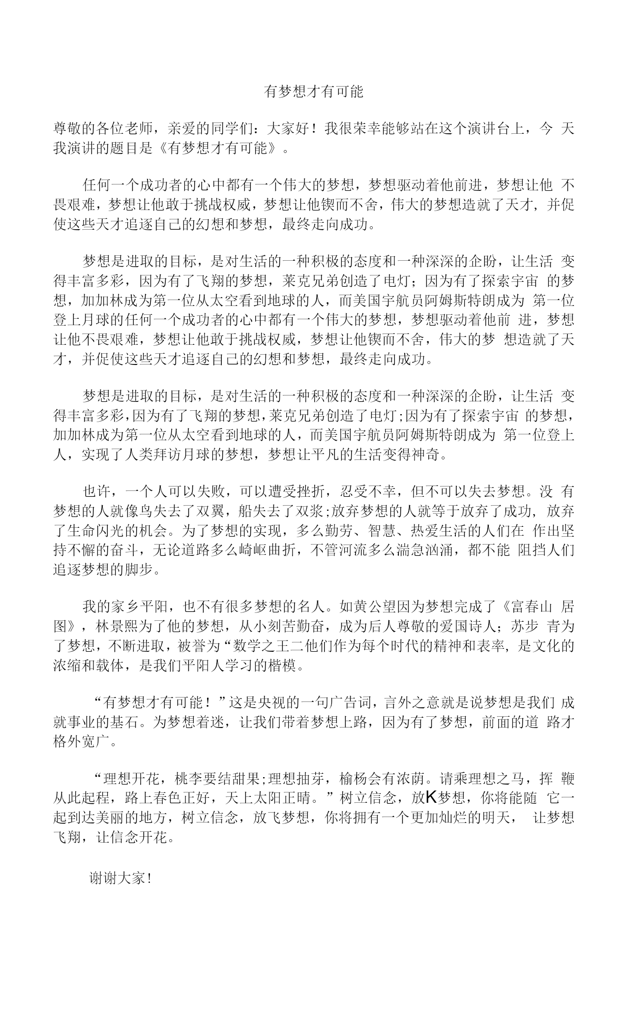 有梦想才有可能 尊敬的各位老师,亲爱的同学们:大家好!我很荣幸能够站在这个演讲台上,今天我演讲的题目是《有梦想才有可能》。 任何一个成功者的心中都有一个伟大的梦想,梦想驱动着他前进,梦想让他不畏艰难,梦想让他敢于挑战权威,梦想让他锲而不舍,伟大的梦想造就了天才,并促使这些天才追逐自己的幻想和梦想,最终走向成功。 梦想是进取的目标,是对生活的一种积极的态度和一种深深的企盼,让生活变得丰富多彩,因为有了飞翔的梦想,莱克兄弟创造了电灯;因为有了探索宇宙的梦想,加加林成为第一位从太空看到地球的人,而美国宇航员阿姆斯特朗成为第一位登上月球的任何一个成功者的心中都有一个伟大的梦想,梦想驱动着他前进,梦想让他不畏艰难,梦想让他敢于挑战权威,梦想让他锲而不舍,伟大的梦想造就了天才,并促使这些天才追逐自己的幻想和梦想,最终走向成功。 梦想是进取的目标,是对生活的一种积极的态度和一种深深的企盼,让生活变得丰富多彩,因为有了飞翔的梦想,莱克兄弟创造了电灯;因为有了探索宇宙的梦想,加加林成为第一位从太空看到地球的人,而美国宇航员阿姆斯特朗成为第一位登上人,实现了人类拜访月球的梦想,梦想让平凡的生活变得神奇。 也许,一个人可以失败,可以遭受挫折,忍受不幸,但不可以失去梦想。没有梦想的人就像鸟失去了双翼,船失去了双浆;放弃梦想的人就等于放弃了成功,放弃了生命闪光的机会。为了梦想的实现,多么勤劳、智慧、热爱生活的人们在作出坚持不懈的奋斗,无论道路多么崎岖曲折,不管河流多么湍急汹涌,都不能阻挡人们追逐梦想的脚步。 我的家乡平阳,也不有很多梦想的名人。如黄公望因为梦想完成了《富春山居图》,林景熙为了他的梦想,从小刻苦勤奋,成为后人尊敬的爱国诗人;苏步青为了梦想,不断进取,被誉为“数学之王二他们作为每个时代的精神和表率,是文化的浓缩和载体,是我们平阳人学习的楷模。 “有梦想才有可能!”这是央视的一句广告词,言外之意就是说梦想是我们成就事业的基石。为梦想着迷,让我们带着梦想上路,因为有了梦想,前面的道路才格外宽广。 “理想开花,桃李要结甜果;理想抽芽,榆杨会有浓荫。请乘理想之马,挥鞭从此起程,路上春色正好,天上太阳正晴。”树立信念,放K梦想,你将能随它一起到达美丽的地方,树立信念,放飞梦想,你将拥有一个更加灿烂的明天,让梦想飞翔,让信念开花。 谢谢大家!
