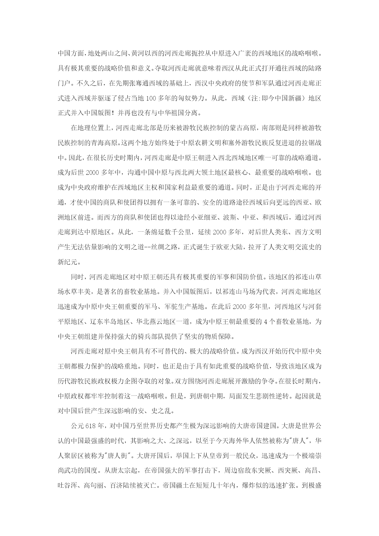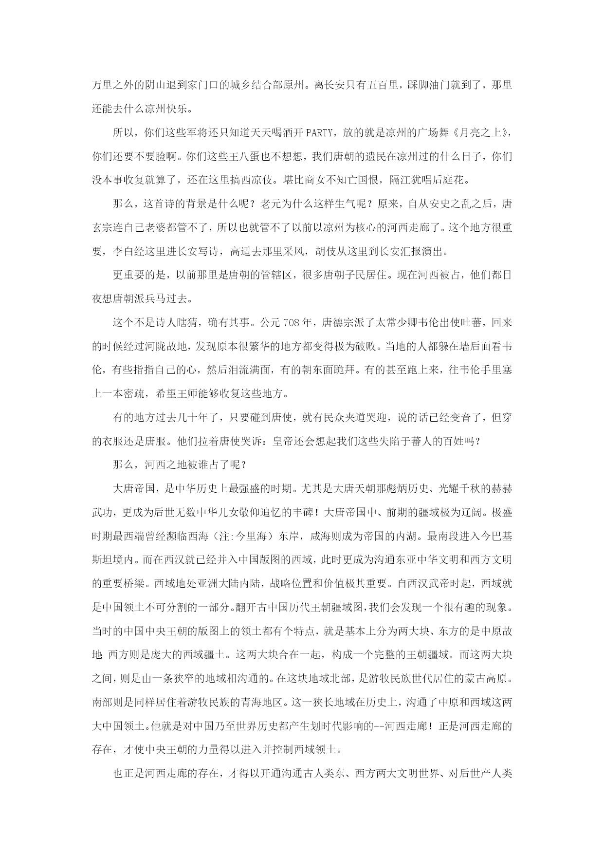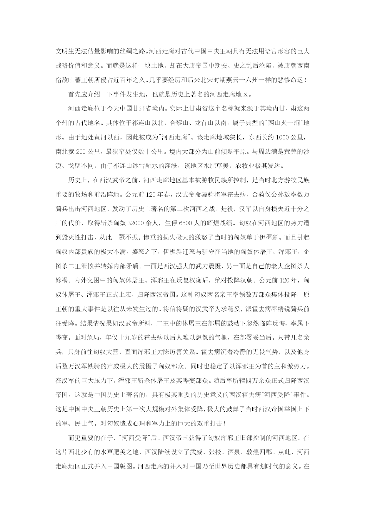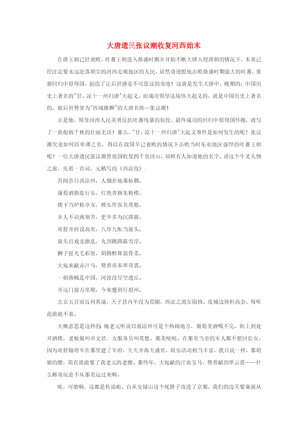 大唐遗民张议潮收复河西始末 在唐王朝已经衰败,吐蕃王朝进入鼎盛时期并开始不断大肆入侵唐朝的情况下,本来已经注定要永远沦落胡尘的河西走廊地区的人民,居然奇迹般地击败鼎盛时期强大的吐蕃,重新回归中原母国,创造了让后世感觉不可思议的奇迹!这就是发生大唐中、晚期的,中国历史上著名的"甘、凉十一州归唐"大起义。而成功领导这场伟大起义的,就是中国历史上著名的,被后世赞誉为"西域雄狮"的大唐名将--张议潮! 正是他,领导河西人民英勇反抗吐蕃残暴的奴役,最终成功的回归中原母国怀抱,谱写了一曲彪炳千秋的壮丽史诗!那么,"甘、凉十一州归唐"大起义事件是如何发生的呢?张议潮究竟如何以单薄之里,得以在故国早已衰败的情况下击败当时东亚地区强悍的吐蕃王朝呢?一位大唐遗民张议潮替祖国收复四千里河山,却鲜有人知道他的名字。讲这个牛叉人物之前,先看一首词,元稹写的《西凉伎》: 吾闻昔日西凉州,人烟扑地桑柘稠。 蒲萄酒熟恣行乐,红艳青旗朱粉楼。 楼下当垆称卓女,楼头伴客名莫愁。 乡人不识离别苦,更卒多为沉滞游。 哥舒开府设高宴,八珍九酝当前头。 前头百戏竞撩乱,丸剑跳踯霜雪浮。 狮子摇光毛彩竖,胡腾醉舞筋骨柔。 大宛来献赤汗马,赞普亦奉翠茸裘。 一朝燕贼乱中国,河湟没尽空遗丘。 开远门前万里堠,今来蹙到行原州。 去京五百而近何其逼,天子县内半没为荒陬,西凉之道尔阻修。连城边将但高会,每听此曲能不羞。 大概意思是这样的:俺老元听说以前凉州可是个热闹地方,葡萄美酒喝不完,街上到处开酒楼,老板娘叫卓文君,女服务员叫莫愁。都美哒哒。在那里当差的军人都不想回长安。因为哥舒翰将军在那里建了军府,天天开海天盛宴,娱乐活动相当丰富,我只说一样,那胡姬的腰,简直就能要了我老元的老腰。那些年,大宛献的汗血宝马,赞普献的翠云裘……什么稀奇玩意不从那里运过来啊。 唉,可惜啊,这都是传说啦。自从安禄山这个死胖子攻进了京都,我们的边关要塞就从万里之外的阴山退到家门口的城乡结合部原州。离长安只有五百里,踩脚油门就到了,那里还能去什么凉州快乐。 所以,你们这些军将还只知道天天喝酒开PARTY,放的就是凉州的广场舞《月亮之上》,你们还要不要脸啊。你们这些王八蛋也不想想,我们唐朝的遗民在凉州过的什么日子,你们没本事收复就算了,还在这里搞西凉伎。堪比商女不知亡国恨,隔江犹唱后庭花。 那么,这首诗的背景是什么呢?老元为什么这样生气呢?原来,自从安史之乱之后,唐玄宗连自己老婆都管不了,所以也就管不了以前以凉州为核心的河西走廊了。这个地方很重要,李白经这里进长安写诗,高适去那里采风,胡伎从这里到长安汇报演出。 更重要的是,以前那里是唐朝的管辖区,很多唐朝子民居住。现在河西被占,他们都日夜想唐朝派兵马过去。 这个不是诗人瞎猜,确有其事。公元708年,唐德宗派了太常少卿韦伦出使吐蕃,回来的时候经过河陇故地,发现原本很繁华的地方都变得极为破败。当地的人都躲在墙后面看韦伦,有些指指自己的心,然后泪流满面,有的朝东面跪拜。有的甚至跑上来,往韦伦手里塞上一本密疏,希望王师能够收复这些地方。 有的地方过去几十年了,只要碰到唐使,就有民众夹道哭迎,说的话已经变音了,但穿的衣服还是唐服。他们拉着唐使哭诉:皇帝还会想起我们这些失陷于蕃人的百姓吗? 那么,河西之地被谁占了呢? 大唐帝国,是中华历史上最强盛的时期。尤其是大唐天朝那彪炳历史、光耀千秋的赫赫武功,更成为后世无数中华儿女敬仰追忆的丰碑!大唐帝国中、前期的疆域极为辽阔。极盛时期最西端曾经濒临西海(注:今里海)东岸,咸海则成为帝国的内湖。最南段进入今巴基斯坦境内。而在西汉就已经并入中国版图的西域,此时更成为沟通东亚中华文明和西方文明的重要桥梁。西域地处亚洲大陆内陆,战略位置和价值极其重要。自西汉武帝时起,西域就是中国领土不可分割的一部分。翻开古中国历代王朝疆域图,我们会发现一个很有趣的现象。当时的中国中央王朝的版图上的领土都有个特点,就是基本上分为两大块、东方的是中原故地;西方则是庞大的西域疆土。这两大块合在一起,构成一个完整的王朝疆域。而这两大块之间,则是由一条狭窄的地域相沟通的。在这块地域北部,是游牧民族世代居住的蒙古高原。南部则是同样居住着游牧民族的青海地区。这一狭长地域在历史上,沟通了中原和西域这两大中国领土。他就是对中国乃至世界历史都产生划时代影响的--河西走廊!正是河西走廊的存在,才使中央王朝的力量得以进入并控制西域领土。 也正是河西走廊的存在,才得以开通沟通古人类东、西方两大文明世界、对后世产人类文明生无法估量影响的丝绸之路。河西走廊对古代中国中央王朝具有无法用语言形容的巨大战略价值和意义。而就是这样一块土地,却在大唐帝国中期安、史之乱后沦陷,被唐朝西南宿敌吐蕃王朝所侵占近百年之久。几乎要经历和后来北宋时期燕云十六州一样的悲惨命运! 首先应介绍一下事件发生地