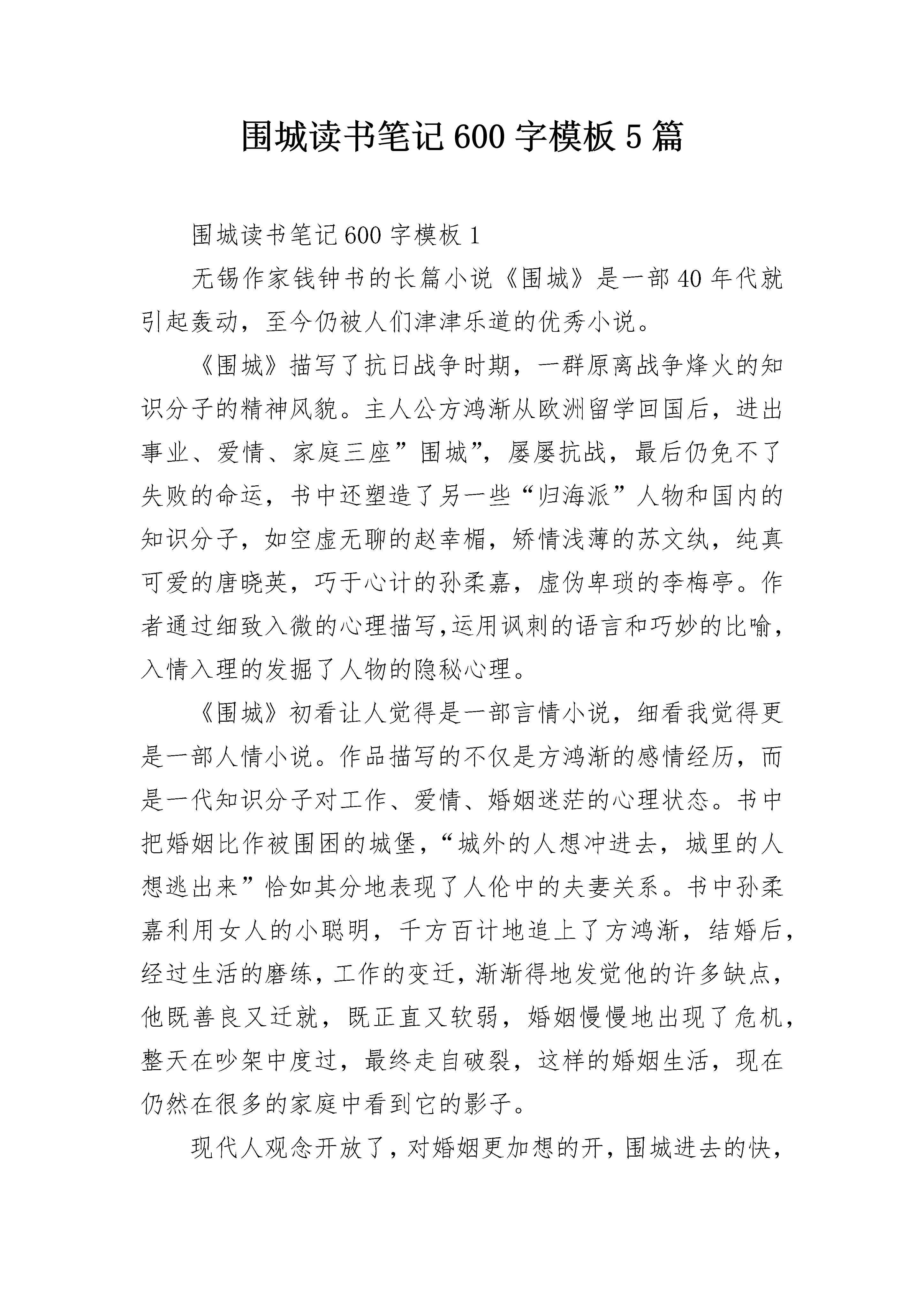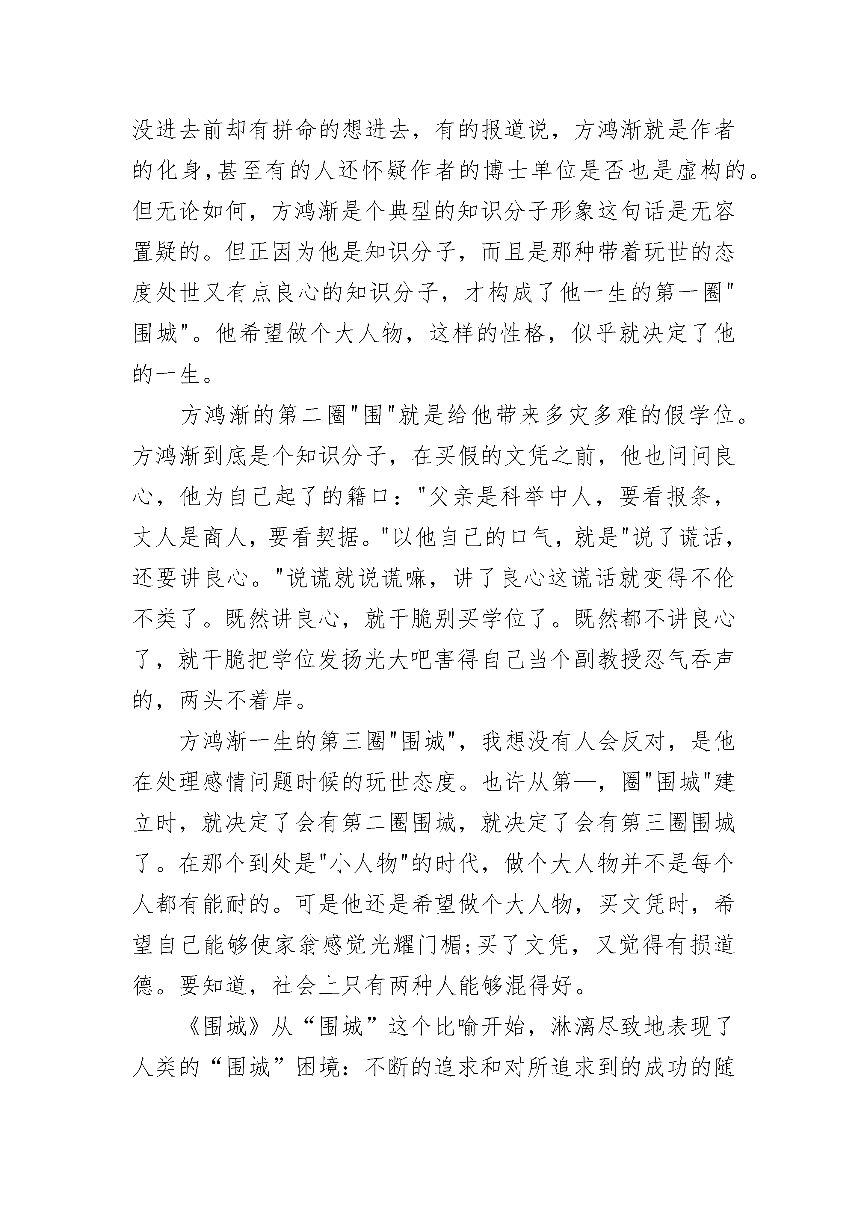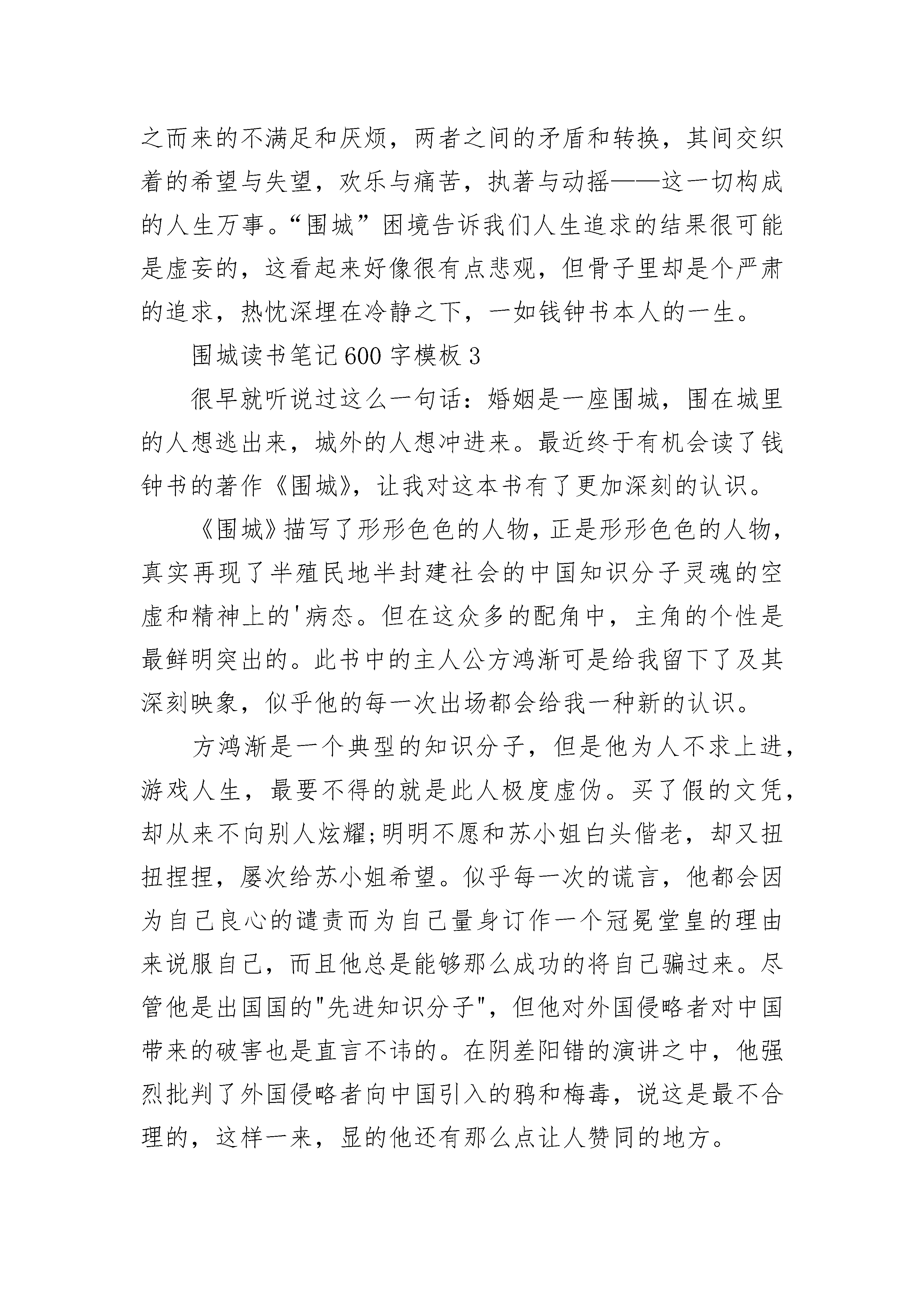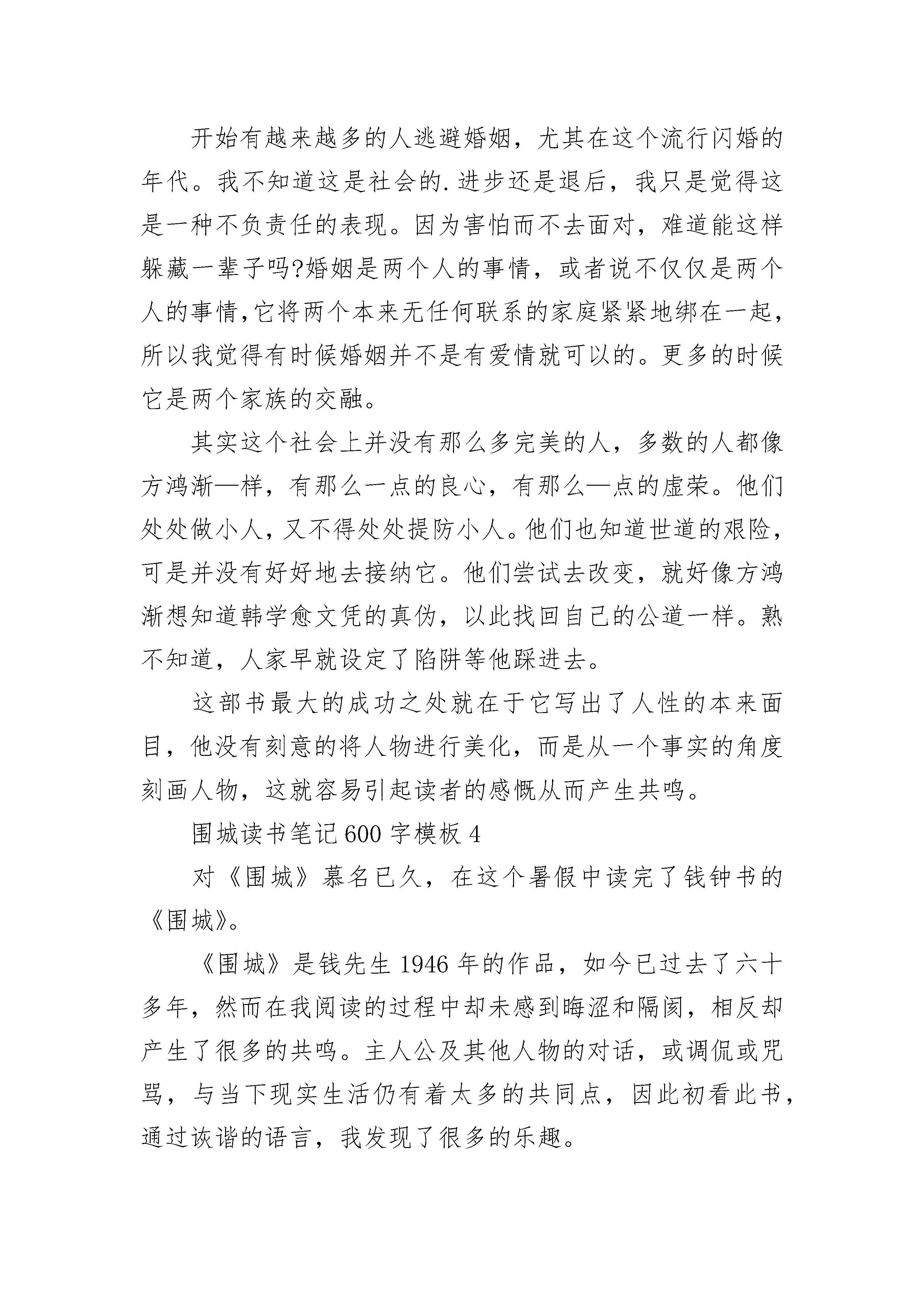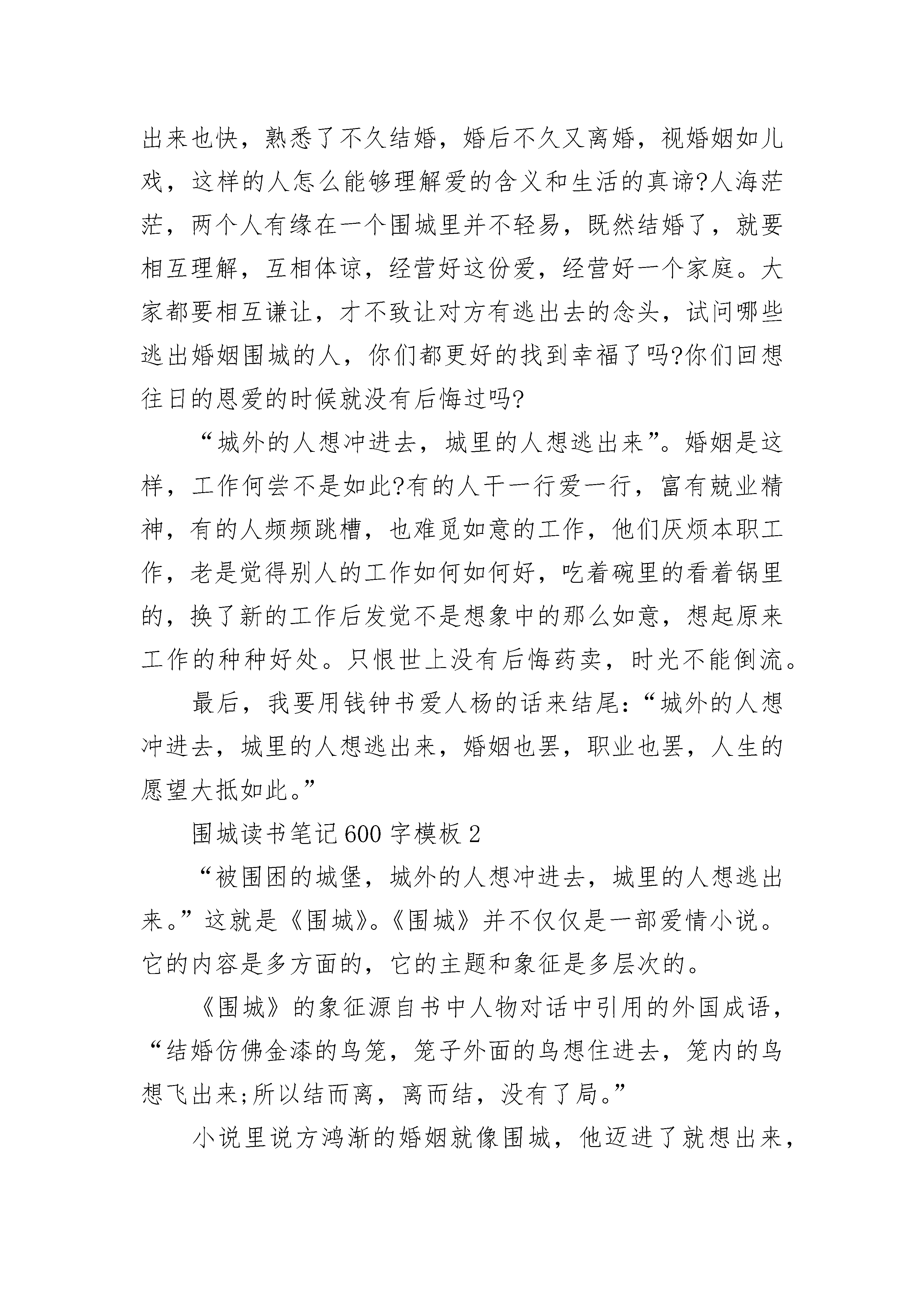 围城读书笔记600字模板5篇围城读书笔记600字模板1无锡作家钱钟书的长篇小说《围城》是一部40年代就引起轰动,至今仍被人们津津乐道的优秀小说。《围城》描写了抗日战争时期,一群原离战争烽火的知识分子的精神风貌。主人公方鸿渐从欧洲留学回国后,进出事业、爱情、家庭三座”围城”,屡屡抗战,最后仍免不了失败的命运,书中还塑造了另一些“归海派”人物和国内的知识分子,如空虚无聊的赵幸楣,矫情浅薄的苏文纨,纯真可爱的唐晓英,巧于心计的孙柔嘉,虚伪卑琐的李梅亭。作者通过细致入微的心理描写,运用讽刺的语言和巧妙的比喻,入情入理的发掘了人物的隐秘心理。《围城》初看让人觉得是一部言情小说,细看我觉得更是一部人情小说。作品描写的不仅是方鸿渐的感情经历,而是一代知识分子对工作、爱情、婚姻迷茫的心理状态。书中把婚姻比作被围困的城堡,“城外的人想冲进去,城里的人想逃出来”恰如其分地表现了人伦中的夫妻关系。书中孙柔嘉利用女人的小聪明,千方百计地追上了方鸿渐,结婚后,经过生活的磨练,工作的变迁,渐渐得地发觉他的许多缺点,他既善良又迁就,既正直又软弱,婚姻慢慢地出现了危机,整天在吵架中度过,最终走自破裂,这样的婚姻生活,现在仍然在很多的家庭中看到它的影子。现代人观念开放了,对婚姻更加想的开,围城进去的快,出来也快,熟悉了不久结婚,婚后不久又离婚,视婚姻如儿戏,这样的人怎么能够理解爱的含义和生活的真谛?人海茫茫,两个人有缘在一个围城里并不轻易,既然结婚了,就要相互理解,互相体谅,经营好这份爱,经营好一个家庭。大家都要相互谦让,才不致让对方有逃出去的念头,试问哪些逃出婚姻围城的人,你们都更好的找到幸福了吗?你们回想往日的恩爱的时候就没有后悔过吗?“城外的人想冲进去,城里的人想逃出来”。婚姻是这样,工作何尝不是如此?有的人干一行爱一行,富有兢业精神,有的人频频跳槽,也难觅如意的工作,他们厌烦本职工作,老是觉得别人的工作如何如何好,吃着碗里的看着锅里的,换了新的工作后发觉不是想象中的那么如意,想起原来工作的种种好处。只恨世上没有后悔药卖,时光不能倒流。最后,我要用钱钟书爱人杨的话来结尾:“城外的人想冲进去,城里的人想逃出来,婚姻也罢,职业也罢,人生的愿望大抵如此。”围城读书笔记600字模板2“被围困的城堡,城外的人想冲进去,城里的人想逃出来。”这就是《围城》。《围城》并不仅仅是一部爱情小说。它的内容是多方面的,它的主题和象征是多层次的。《围城》的象征源自书中人物对话中引用的外国成语,“结婚仿佛金漆的鸟笼,笼子外面的鸟想住进去,笼内的鸟想飞出来;所以结而离,离而结,没有了局。”小说里说方鸿渐的婚姻就像围城,他迈进了就想出来,没进去前却有拼命的想进去,有的报道说,方鸿渐就是作者的化身,甚至有的人还怀疑作者的博士单位是否也是虚构的。但无论如何,方鸿渐是个典型的知识分子形象这句话是无容置疑的。但正因为他是知识分子,而且是那种带着玩世的态度处世又有点良心的知识分子,才构成了他一生的第一圈"围城"。他希望做个大人物,这样的性格,似乎就决定了他的一生。方鸿渐的第二圈"围"就是给他带来多灾多难的假学位。方鸿渐到底是个知识分子,在买假的文凭之前,他也问问良心,他为自己起了的籍口:"父亲是科举中人,要看报条,丈人是商人,要看契据。"以他自己的口气,就是"说了谎话,还要讲良心。"说谎就说谎嘛,讲了良心这谎话就变得不伦不类了。既然讲良心,就干脆别买学位了。既然都不讲良心了,就干脆把学位发扬光大吧害得自己当个副教授忍气吞声的,两头不着岸。方鸿渐一生的第三圈"围城",我想没有人会反对,是他在处理感情问题时候的玩世态度。也许从第—,圈"围城"建立时,就决定了会有第二圈围城,就决定了会有第三圈围城了。在那个到处是"小人物"的时代,做个大人物并不是每个人都有能耐的。可是他还是希望做个大人物,买文凭时,希望自己能够使家翁感觉光耀门楣;买了文凭,又觉得有损道德。要知道,社会上只有两种人能够混得好。《围城》从“围城”这个比喻开始,淋漓尽致地表现了人类的“围城”困境:不断的追求和对所追求到的成功的随之而来的不满足和厌烦,两者之间的矛盾和转换,其间交织着的希望与失望,欢乐与痛苦,执著与动摇——这一切构成的人生万事。“围城”困境告诉我们人生追求的结果很可能是虚妄的,这看起来好像很有点悲观,但骨子里却是个严肃的追求,热忱深埋在冷静之下,一如钱钟书本人的一生。围城读书笔记600字模板3很早就听说过这么一句话:婚姻是一座围城,围在城里的人想逃出来,城外的人想冲进来。最近终于有机会读了钱钟书的著作《围城》,让我对这本书有了更加深刻的认识。《围城》描写了形形色色的人物,正是形形色色的人物,真实再现了半殖民地半封建社会的中国知识分子灵魂的空虚和精神上的'病态。但在这众多的配角中,主角的个性是最鲜明突出的。此书中的主人公方鸿