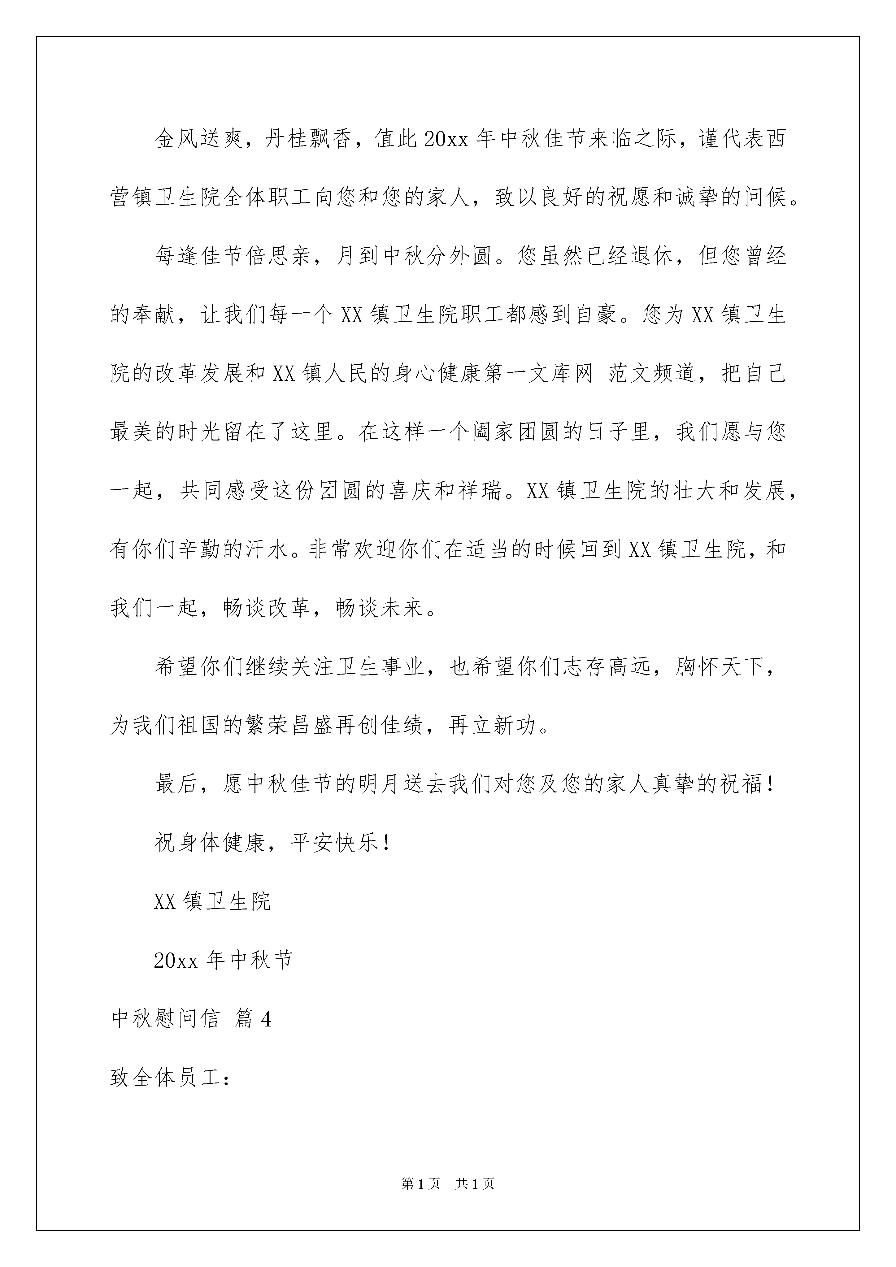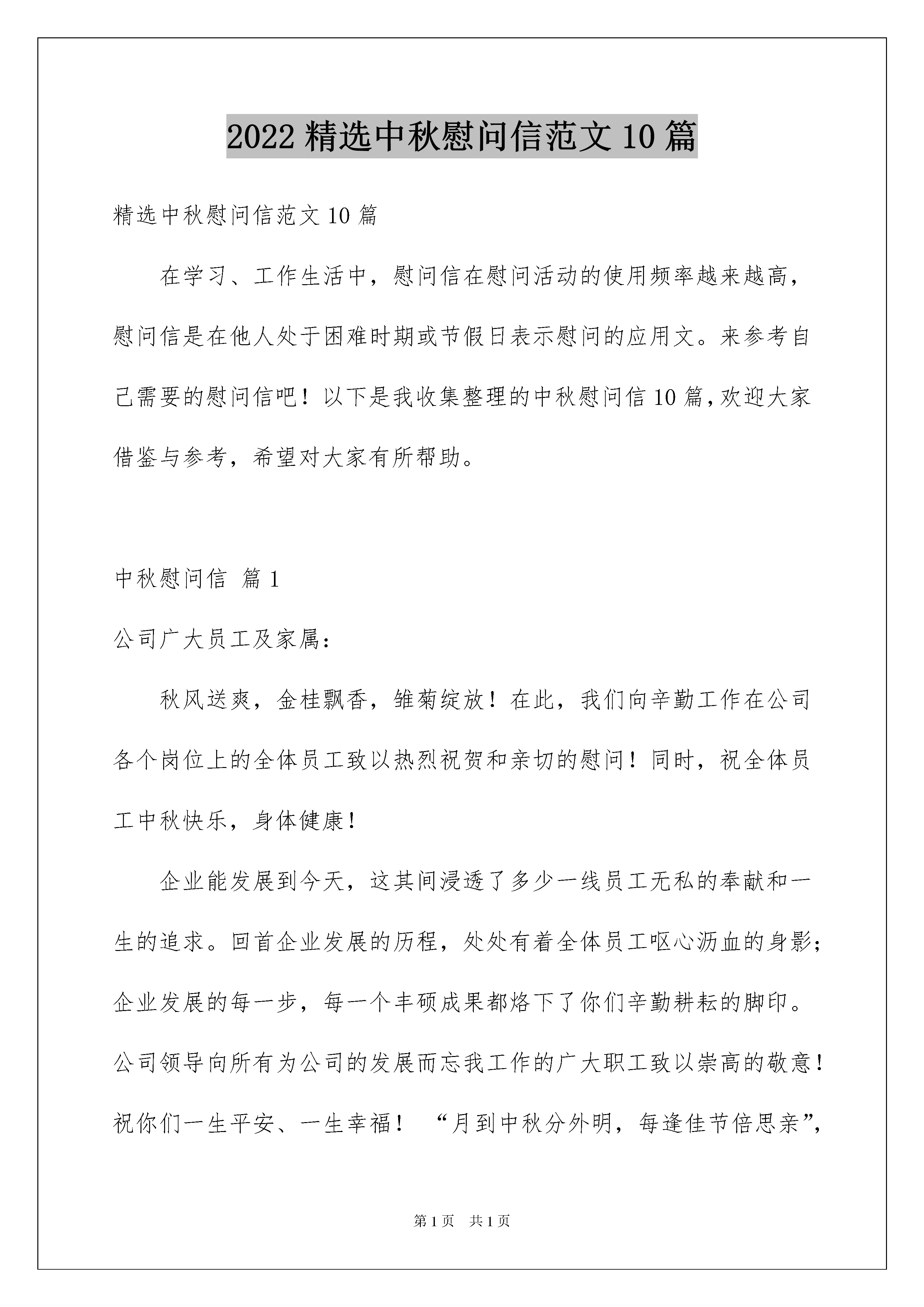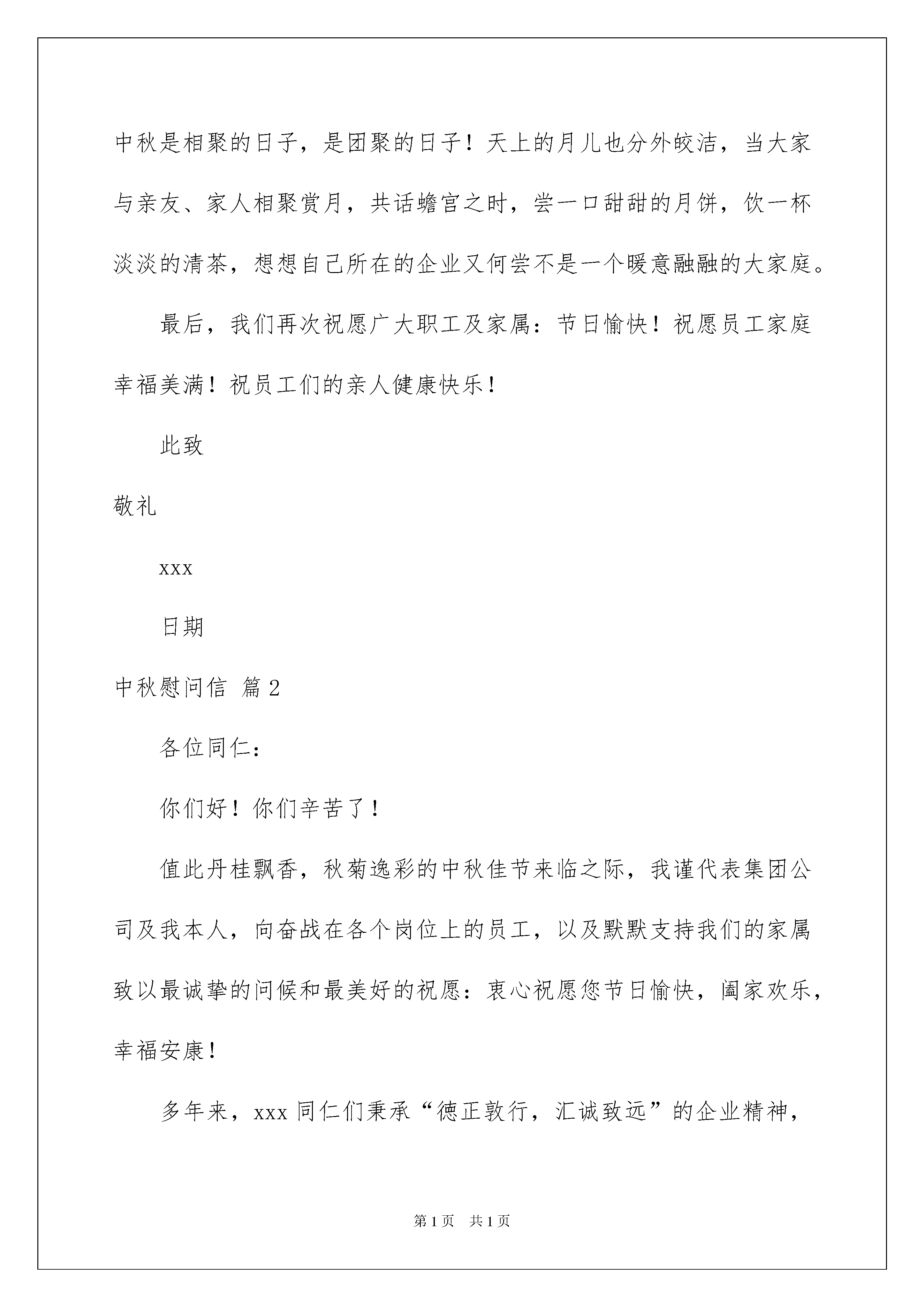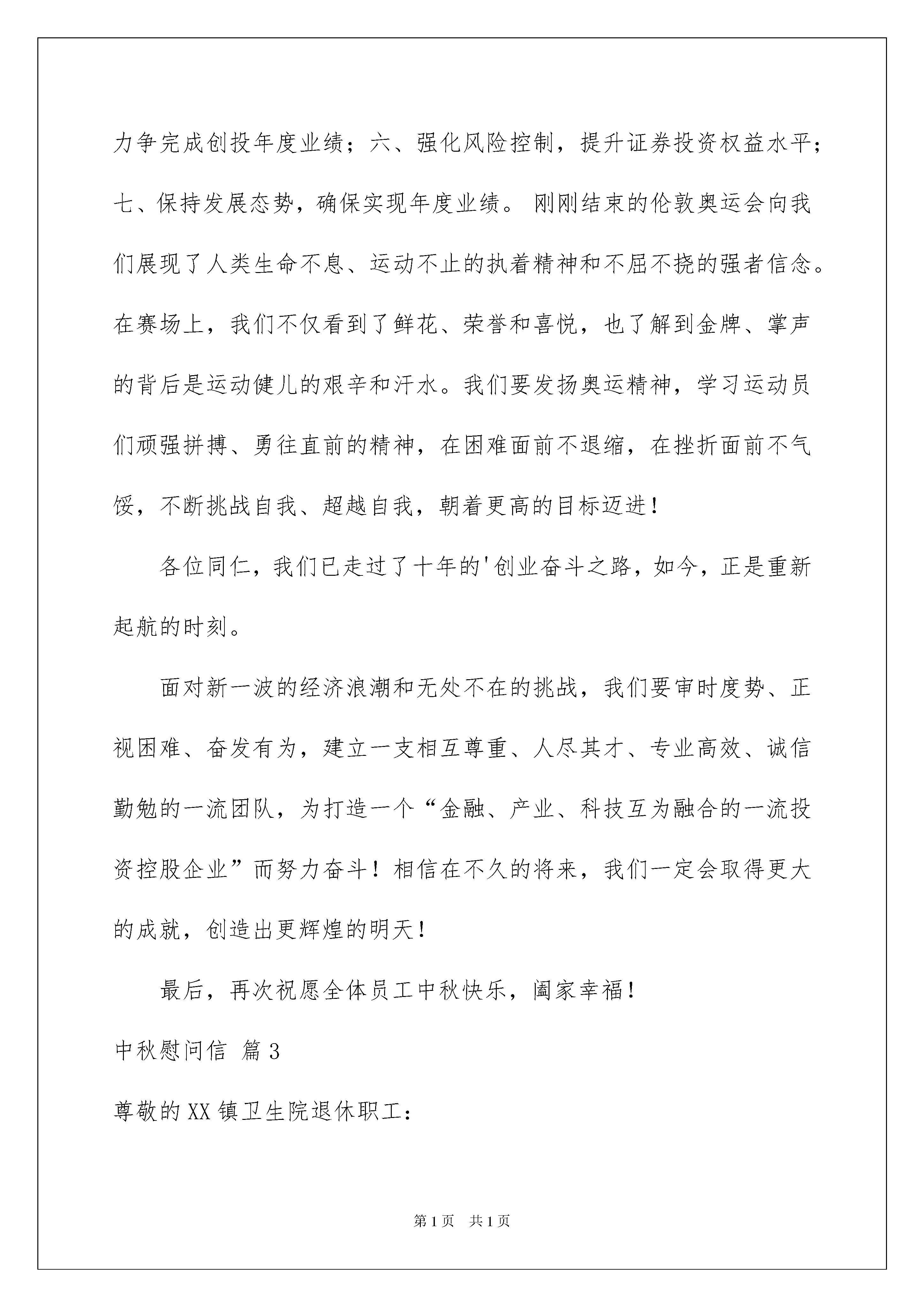 2022精选中秋慰问信范文10篇精选中秋慰问信范文10篇在学习、工作生活中,慰问信在慰问活动的使用频率越来越高,慰问信是在他人处于困难时期或节假日表示慰问的应用文。来参考自己需要的慰问信吧!以下是我收集整理的中秋慰问信10篇,欢迎大家借鉴与参考,希望对大家有所帮助。中秋慰问信篇1公司广大员工及家属:秋风送爽,金桂飘香,雏菊绽放!在此,我们向辛勤工作在公司各个岗位上的全体员工致以热烈祝贺和亲切的慰问!同时,祝全体员工中秋快乐,身体健康!企业能发展到今天,这其间浸透了多少一线员工无私的奉献和一生的追求。回首企业发展的历程,处处有着全体员工呕心沥血的身影;企业发展的每一步,每一个丰硕成果都烙下了你们辛勤耕耘的脚印。公司领导向所有为公司的发展而忘我工作的广大职工致以崇高的敬意!祝你们一生平安、一生幸福!“月到中秋分外明,每逢佳节倍思亲”,中秋是相聚的日子,是团聚的日子!天上的月儿也分外皎洁,当大家与亲友、家人相聚赏月,共话蟾宫之时,尝一口甜甜的月饼,饮一杯淡淡的清茶,想想自己所在的企业又何尝不是一个暖意融融的大家庭。最后,我们再次祝愿广大职工及家属:节日愉快!祝愿员工家庭幸福美满!祝员工们的亲人健康快乐!此致敬礼xxx日期中秋慰问信篇2各位同仁:你们好!你们辛苦了!值此丹桂飘香,秋菊逸彩的中秋佳节来临之际,我谨代表集团公司及我本人,向奋战在各个岗位上的员工,以及默默支持我们的家属致以最诚挚的问候和最美好的祝愿:衷心祝愿您节日愉快,阖家欢乐,幸福安康!多年来,xxx同仁们秉承“徳正敦行,汇诚致远”的企业精神,以辛勤的汗水和爱岗敬业的奉献精神,齐心协力,攻坚克难,取得了许多来之不易的成绩。公司成长的每一个足迹,都凝聚着你们卓越的智慧、真切的关爱和鼎力的支持。我们始终倡导员工与企业共同成长,你们在工作中兢兢业业、勇挑重担,不仅在个人能力上取得了很大进步,也推动着公司的成长与发展。在此,我要向你们的艰辛付出表示衷心的感谢!公司以你们为荣!今年,是公司创立十一周年,也是公司战略转型、创新发展的一年。我们紧紧围绕年初提出的工作目标,依靠全体员工,认真贯彻“XXX”的总体工作要求,围绕五项具体工作要求,积极弘扬企业文化,完善公司制度建设,着力推进产业投资业务,在综合实力和社会形象等方面均取得一定成绩。今后,我们要继续保持良好的工作态势,提振信心、勇于创新,着力人才培养,努力实现愿景,以时不我待、只争朝夕的精神,重点做好以下几方面的工作:一、续创文明单位,切实提升党建工作水平;二、加强内部管控,努力提高整体运营能力;三、着力人才培养,积极推动企业可持续发展;四、实现项目突破,推进产业投资转型升级;五、跟进重点项目,力争完成创投年度业绩;六、强化风险控制,提升证券投资权益水平;七、保持发展态势,确保实现年度业绩。刚刚结束的伦敦奥运会向我们展现了人类生命不息、运动不止的执着精神和不屈不挠的强者信念。在赛场上,我们不仅看到了鲜花、荣誉和喜悦,也了解到金牌、掌声的背后是运动健儿的艰辛和汗水。我们要发扬奥运精神,学习运动员们顽强拼搏、勇往直前的精神,在困难面前不退缩,在挫折面前不气馁,不断挑战自我、超越自我,朝着更高的目标迈进!各位同仁,我们已走过了十年的'创业奋斗之路,如今,正是重新起航的时刻。面对新一波的经济浪潮和无处不在的挑战,我们要审时度势、正视困难、奋发有为,建立一支相互尊重、人尽其才、专业高效、诚信勤勉的一流团队,为打造一个“金融、产业、科技互为融合的一流投资控股企业”而努力奋斗!相信在不久的将来,我们一定会取得更大的成就,创造出更辉煌的明天!最后,再次祝愿全体员工中秋快乐,阖家幸福!中秋慰问信篇3尊敬的XX镇卫生院退休职工:金风送爽,丹桂飘香,值此20xx年中秋佳节来临之际,谨代表西营镇卫生院全体职工向您和您的家人,致以良好的祝愿和诚挚的问候。每逢佳节倍思亲,月到中秋分外圆。您虽然已经退休,但您曾经的奉献,让我们每一个XX镇卫生院职工都感到自豪。您为XX镇卫生院的改革发展和XX镇人民的身心健康第一文库网范文频道,把自己最美的时光留在了这里。在这样一个阖家团圆的日子里,我们愿与您一起,共同感受这份团圆的喜庆和祥瑞。XX镇卫生院的壮大和发展,有你们辛勤的汗水。非常欢迎你们在适当的时候回到XX镇卫生院,和我们一起,畅谈改革,畅谈未来。希望你们继续关注卫生事业,也希望你们志存高远,胸怀天下,为我们祖国的繁荣昌盛再创佳绩,再立新功。最后,愿中秋佳节的明月送去我们对您及您的家人真挚的祝福!祝身体健康,平安快乐!XX镇卫生院20xx年中秋节中秋慰问信篇4致全体员工:圆月遥寄思乡意,普天喜庆振国情。时值中秋
