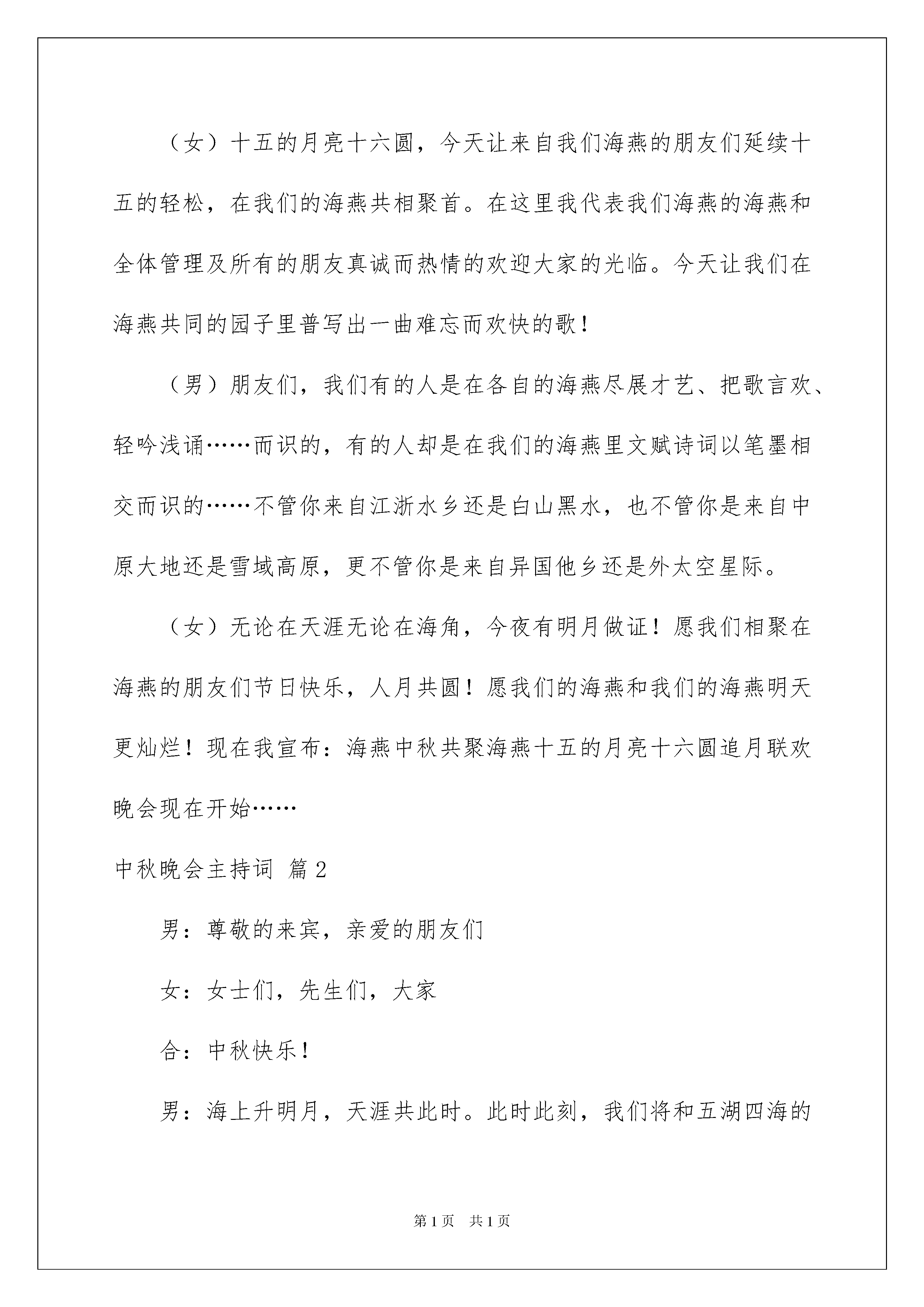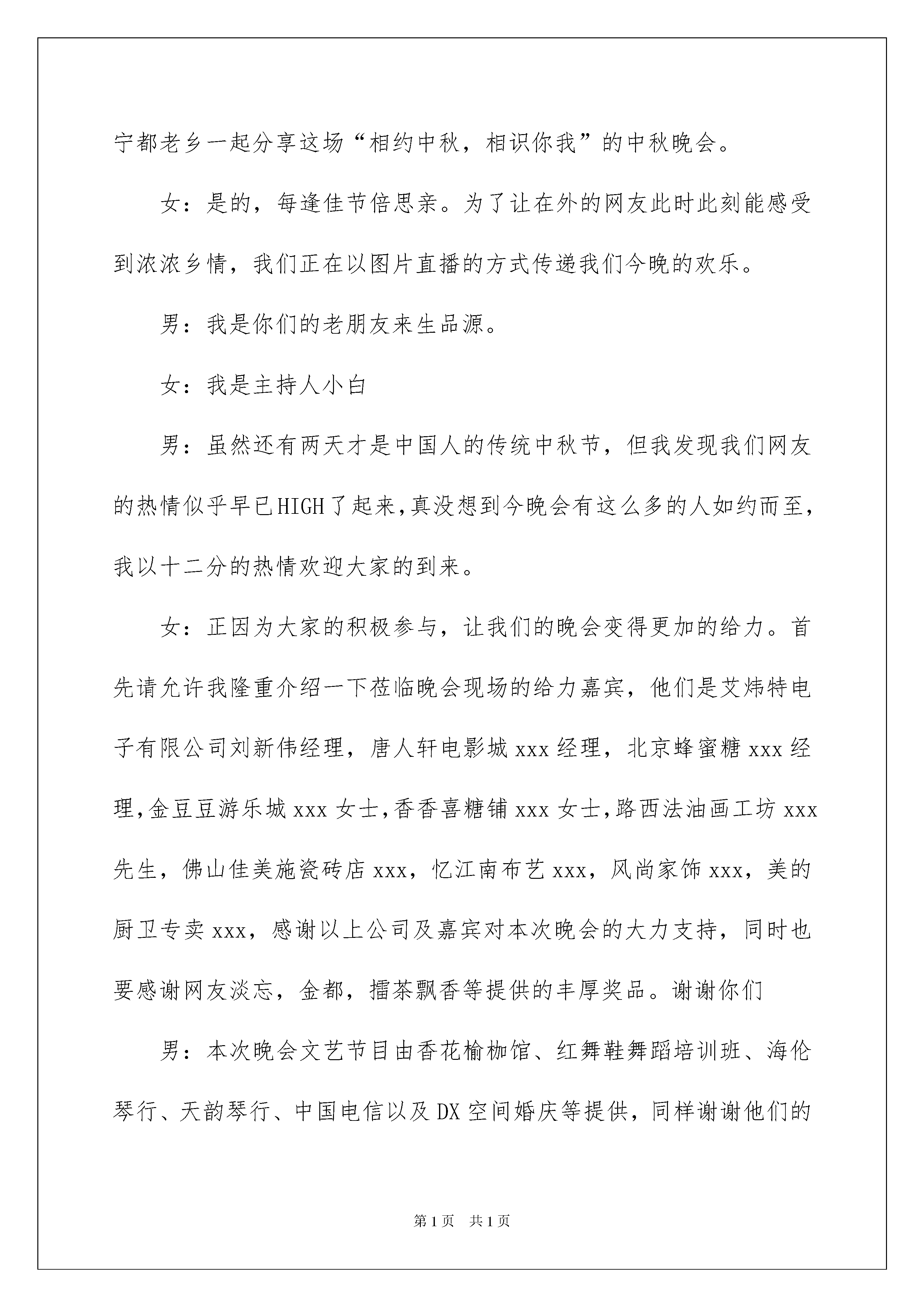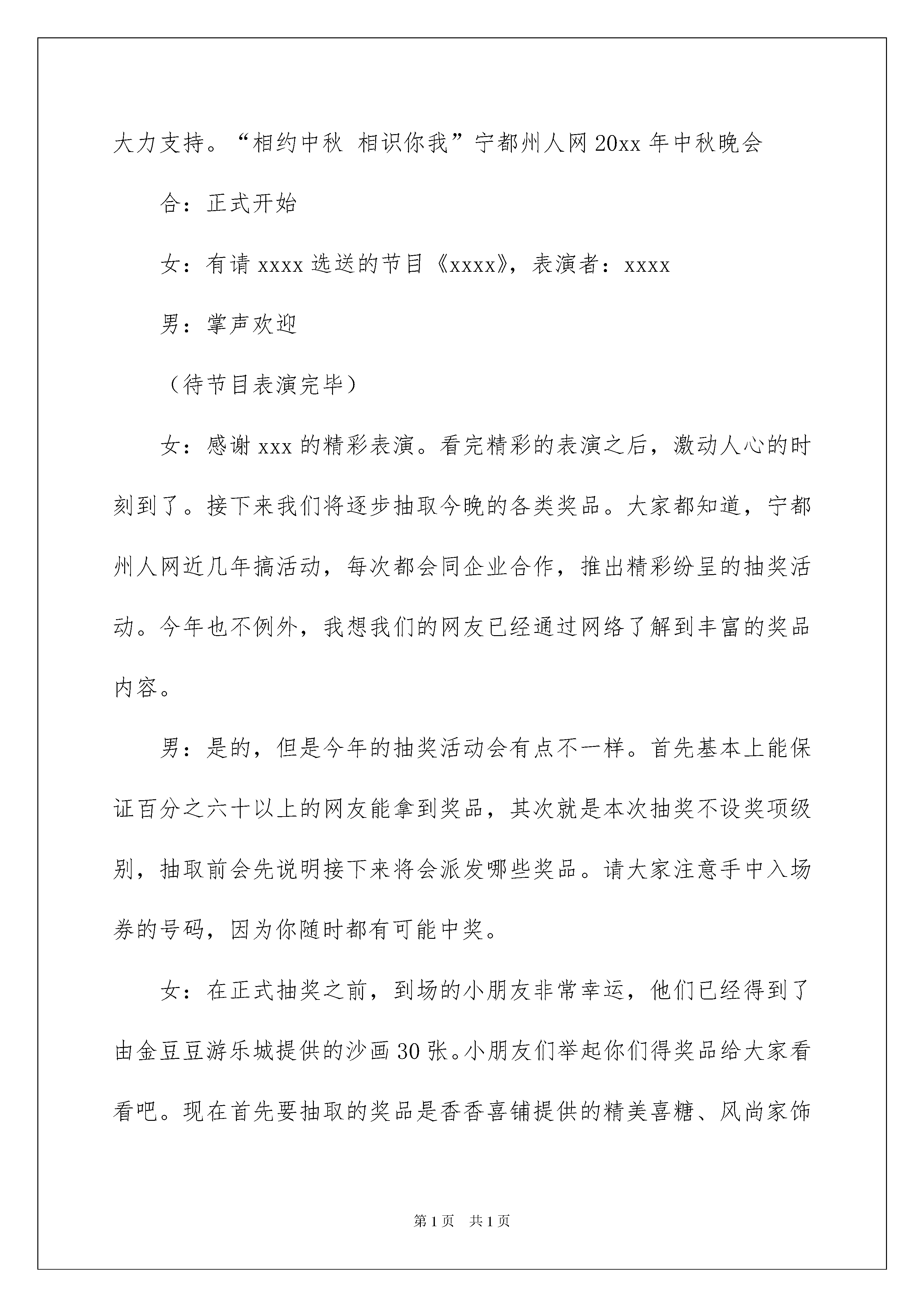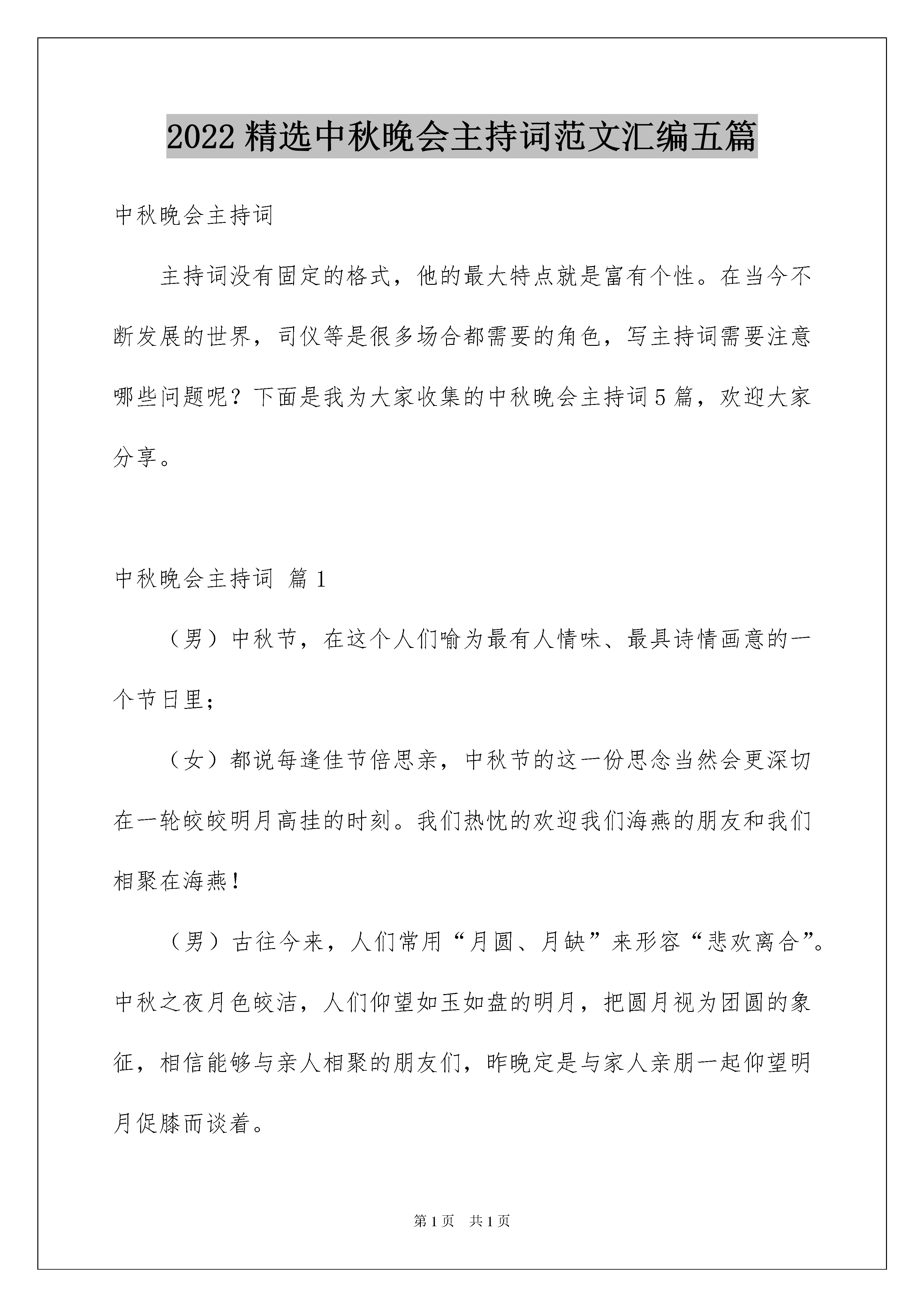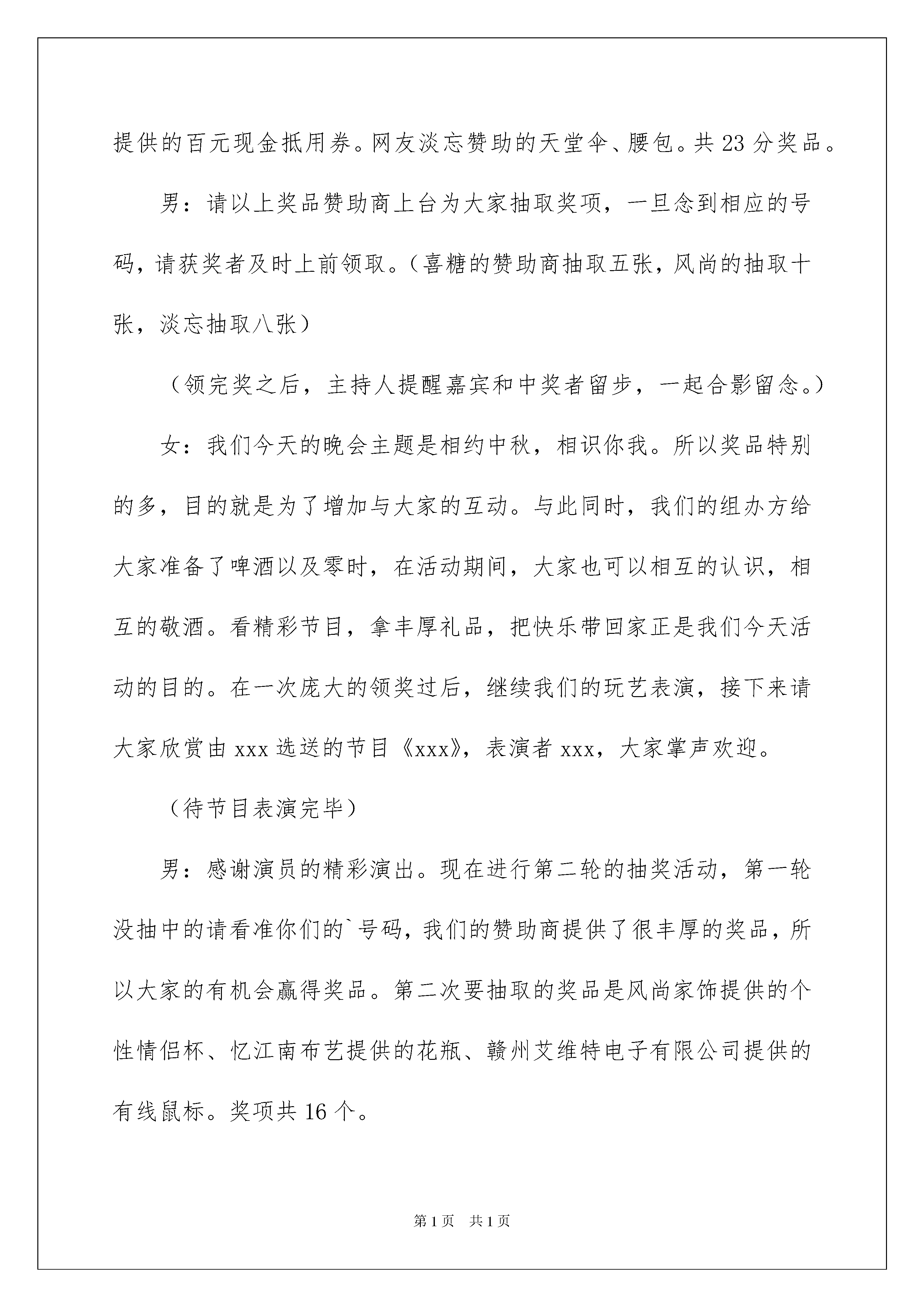 2022精选中秋晚会主持词范文汇编五篇中秋晚会主持词主持词没有固定的格式,他的最大特点就是富有个性。在当今不断发展的世界,司仪等是很多场合都需要的角色,写主持词需要注意哪些问题呢?下面是我为大家收集的中秋晚会主持词5篇,欢迎大家分享。中秋晚会主持词篇1(男)中秋节,在这个人们喻为最有人情味、最具诗情画意的一个节日里;(女)都说每逢佳节倍思亲,中秋节的这一份思念当然会更深切在一轮皎皎明月高挂的时刻。我们热忱的欢迎我们海燕的朋友和我们相聚在海燕!(男)古往今来,人们常用“月圆、月缺”来形容“悲欢离合”。中秋之夜月色皎洁,人们仰望如玉如盘的明月,把圆月视为团圆的象征,相信能够与亲人相聚的朋友们,昨晚定是与家人亲朋一起仰望明月促膝而谈着。(女)十五的月亮十六圆,今天让来自我们海燕的朋友们延续十五的轻松,在我们的海燕共相聚首。在这里我代表我们海燕的海燕和全体管理及所有的朋友真诚而热情的欢迎大家的光临。今天让我们在海燕共同的园子里普写出一曲难忘而欢快的歌!(男)朋友们,我们有的人是在各自的海燕尽展才艺、把歌言欢、轻吟浅诵……而识的,有的人却是在我们的海燕里文赋诗词以笔墨相交而识的……不管你来自江浙水乡还是白山黑水,也不管你是来自中原大地还是雪域高原,更不管你是来自异国他乡还是外太空星际。(女)无论在天涯无论在海角,今夜有明月做证!愿我们相聚在海燕的朋友们节日快乐,人月共圆!愿我们的海燕和我们的海燕明天更灿烂!现在我宣布:海燕中秋共聚海燕十五的月亮十六圆追月联欢晚会现在开始……中秋晚会主持词篇2男:尊敬的来宾,亲爱的朋友们女:女士们,先生们,大家合:中秋快乐!男:海上升明月,天涯共此时。此时此刻,我们将和五湖四海的宁都老乡一起分享这场“相约中秋,相识你我”的中秋晚会。女:是的,每逢佳节倍思亲。为了让在外的网友此时此刻能感受到浓浓乡情,我们正在以图片直播的方式传递我们今晚的欢乐。男:我是你们的老朋友来生品源。女:我是主持人小白男:虽然还有两天才是中国人的传统中秋节,但我发现我们网友的热情似乎早已HIGH了起来,真没想到今晚会有这么多的人如约而至,我以十二分的热情欢迎大家的到来。女:正因为大家的积极参与,让我们的晚会变得更加的给力。首先请允许我隆重介绍一下莅临晚会现场的给力嘉宾,他们是艾炜特电子有限公司刘新伟经理,唐人轩电影城xxx经理,北京蜂蜜糖xxx经理,金豆豆游乐城xxx女士,香香喜糖铺xxx女士,路西法油画工坊xxx先生,佛山佳美施瓷砖店xxx,忆江南布艺xxx,风尚家饰xxx,美的厨卫专卖xxx,感谢以上公司及嘉宾对本次晚会的大力支持,同时也要感谢网友淡忘,金都,擂茶飘香等提供的丰厚奖品。谢谢你们男:本次晚会文艺节目由香花榆枷馆、红舞鞋舞蹈培训班、海伦琴行、天韵琴行、中国电信以及DX空间婚庆等提供,同样谢谢他们的大力支持。“相约中秋相识你我”宁都州人网20xx年中秋晚会合:正式开始女:有请xxxx选送的节目《xxxx》,表演者:xxxx男:掌声欢迎(待节目表演完毕)女:感谢xxx的精彩表演。看完精彩的表演之后,激动人心的时刻到了。接下来我们将逐步抽取今晚的各类奖品。大家都知道,宁都州人网近几年搞活动,每次都会同企业合作,推出精彩纷呈的抽奖活动。今年也不例外,我想我们的网友已经通过网络了解到丰富的奖品内容。男:是的,但是今年的抽奖活动会有点不一样。首先基本上能保证百分之六十以上的网友能拿到奖品,其次就是本次抽奖不设奖项级别,抽取前会先说明接下来将会派发哪些奖品。请大家注意手中入场券的号码,因为你随时都有可能中奖。女:在正式抽奖之前,到场的小朋友非常幸运,他们已经得到了由金豆豆游乐城提供的沙画30张。小朋友们举起你们得奖品给大家看看吧。现在首先要抽取的奖品是香香喜铺提供的精美喜糖、风尚家饰提供的百元现金抵用券。网友淡忘赞助的天堂伞、腰包。共23分奖品。男:请以上奖品赞助商上台为大家抽取奖项,一旦念到相应的号码,请获奖者及时上前领取。(喜糖的赞助商抽取五张,风尚的抽取十张,淡忘抽取八张)(领完奖之后,主持人提醒嘉宾和中奖者留步,一起合影留念。)女:我们今天的晚会主题是相约中秋,相识你我。所以奖品特别的多,目的就是为了增加与大家的互动。与此同时,我们的组办方给大家准备了啤酒以及零时,在活动期间,大家也可以相互的认识,相互的敬酒。看精彩节目,拿丰厚礼品,把快乐带回家正是我们今天活动的目的。在一次庞大的领奖过后,继续我们的玩艺表演,接下来请大家欣赏由xxx选送的节目《xxx》,表演者xxx,大家掌声欢迎。(待节目表演完毕)男:感谢演员的精彩演出。现在进行第二轮的抽奖活动,第一轮没抽中的请看准