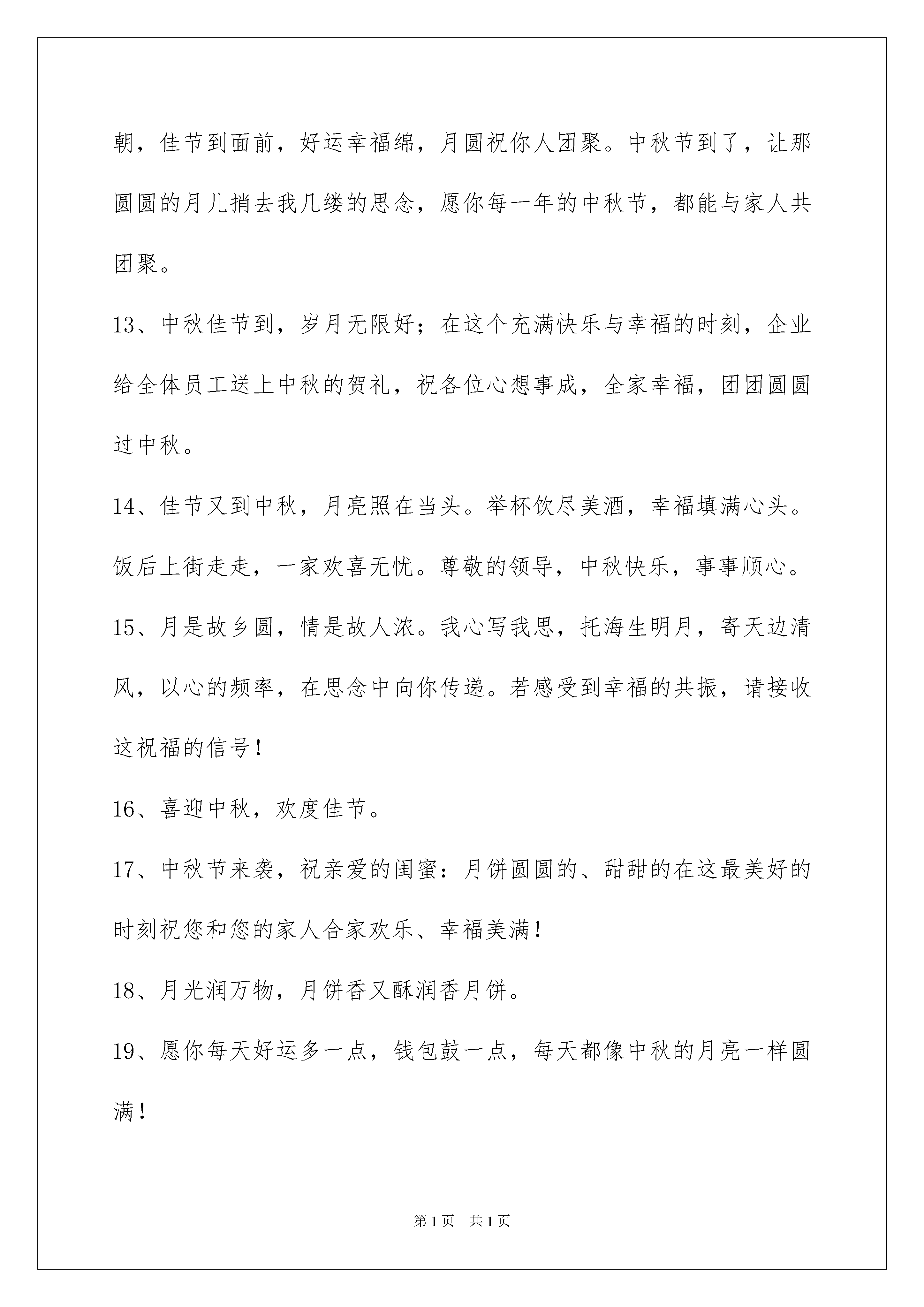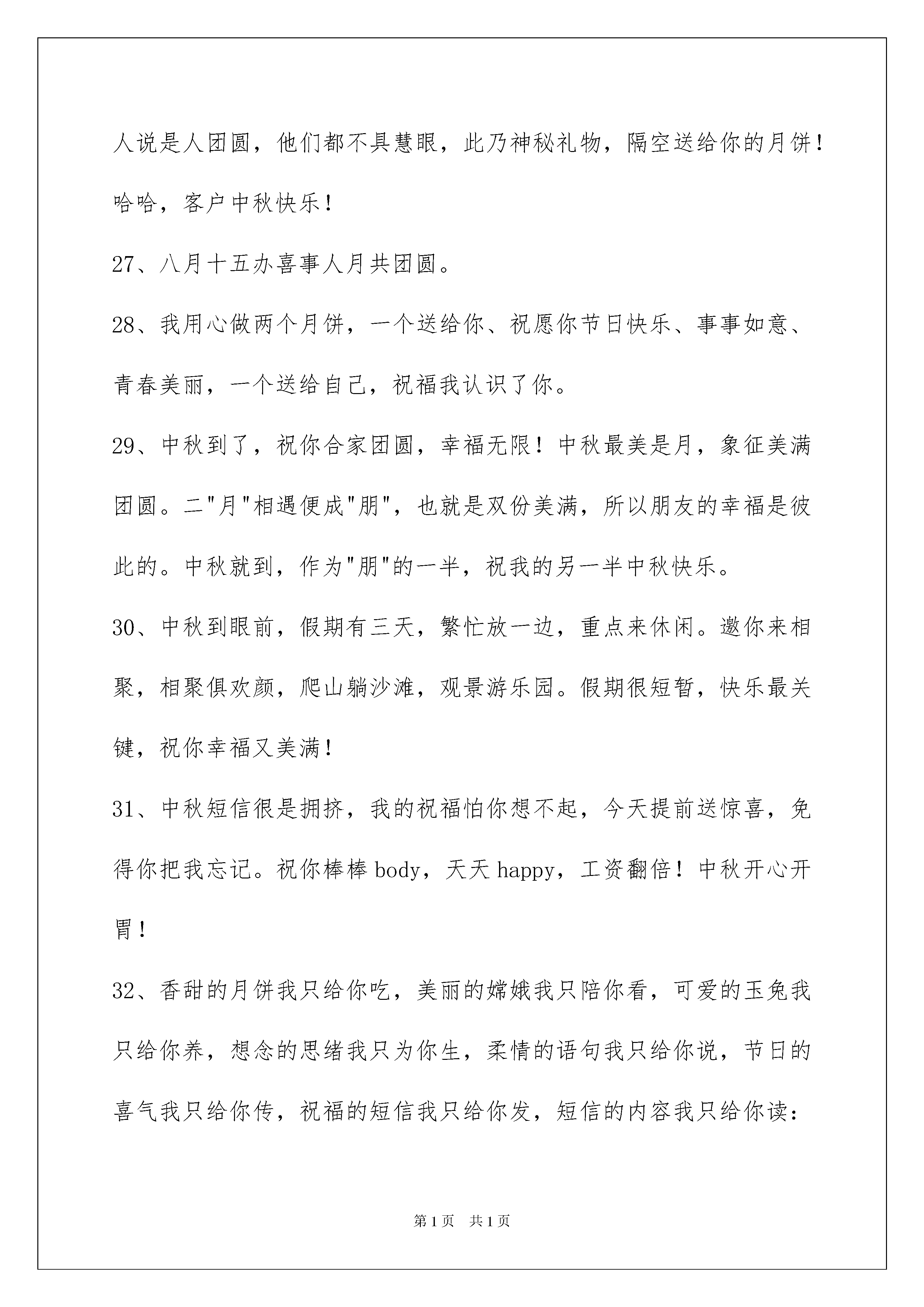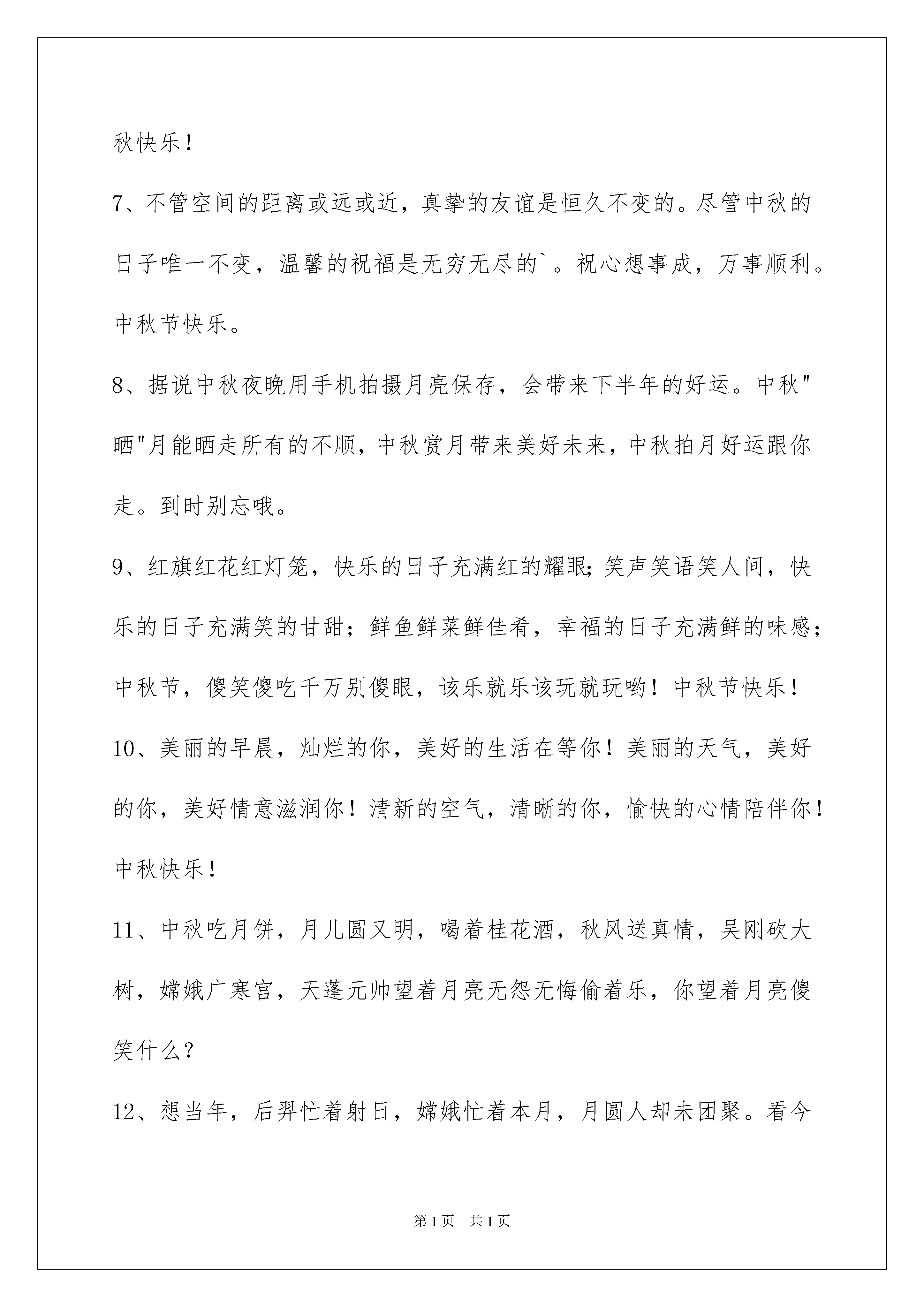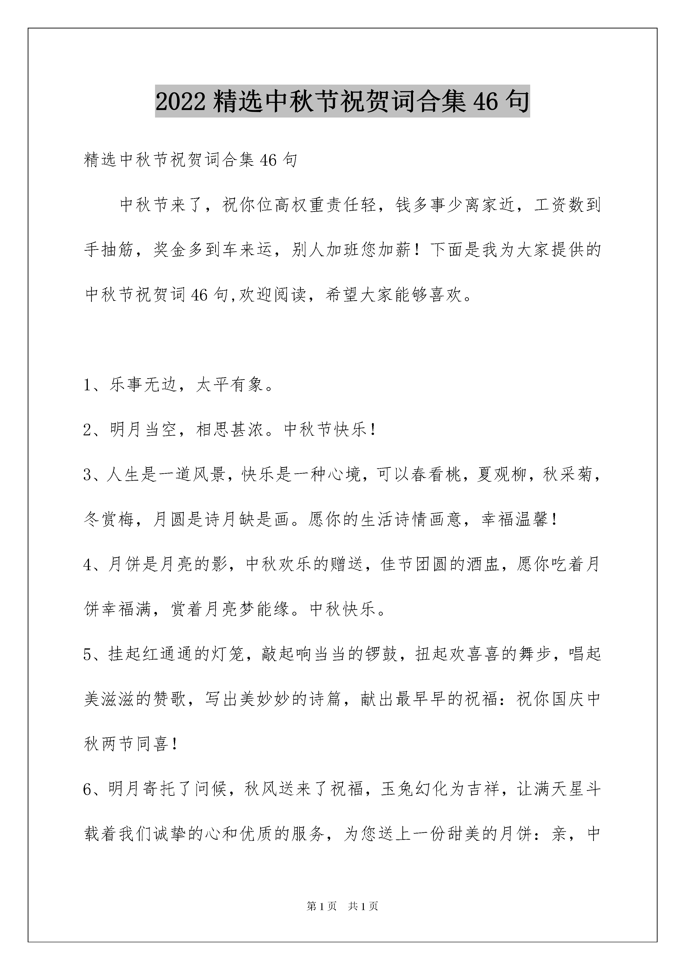 2022精选中秋节祝贺词合集46句精选中秋节祝贺词合集46句中秋节来了,祝你位高权重责任轻,钱多事少离家近,工资数到手抽筋,奖金多到车来运,别人加班您加薪!下面是我为大家提供的中秋节祝贺词46句,欢迎阅读,希望大家能够喜欢。1、乐事无边,太平有象。2、明月当空,相思甚浓。中秋节快乐!3、人生是一道风景,快乐是一种心境,可以春看桃,夏观柳,秋采菊,冬赏梅,月圆是诗月缺是画。愿你的生活诗情画意,幸福温馨!4、月饼是月亮的影,中秋欢乐的赠送,佳节团圆的酒盅,愿你吃着月饼幸福满,赏着月亮梦能缘。中秋快乐。5、挂起红通通的灯笼,敲起响当当的锣鼓,扭起欢喜喜的舞步,唱起美滋滋的赞歌,写出美妙妙的诗篇,献出最早早的祝福:祝你国庆中秋两节同喜!6、明月寄托了问候,秋风送来了祝福,玉兔幻化为吉祥,让满天星斗载着我们诚挚的心和优质的服务,为您送上一份甜美的月饼:亲,中秋快乐!7、不管空间的距离或远或近,真挚的友谊是恒久不变的。尽管中秋的日子唯一不变,温馨的祝福是无穷无尽的`。祝心想事成,万事顺利。中秋节快乐。8、据说中秋夜晚用手机拍摄月亮保存,会带来下半年的好运。中秋"晒"月能晒走所有的不顺,中秋赏月带来美好未来,中秋拍月好运跟你走。到时别忘哦。9、红旗红花红灯笼,快乐的日子充满红的耀眼;笑声笑语笑人间,快乐的日子充满笑的甘甜;鲜鱼鲜菜鲜佳肴,幸福的日子充满鲜的味感;中秋节,傻笑傻吃千万别傻眼,该乐就乐该玩就玩哟!中秋节快乐!10、美丽的早晨,灿烂的你,美好的生活在等你!美丽的天气,美好的你,美好情意滋润你!清新的空气,清晰的你,愉快的心情陪伴你!中秋快乐!11、中秋吃月饼,月儿圆又明,喝着桂花酒,秋风送真情,吴刚砍大树,嫦娥广寒宫,天蓬元帅望着月亮无怨无悔偷着乐,你望着月亮傻笑什么?12、想当年,后羿忙着射日,嫦娥忙着本月,月圆人却未团聚。看今朝,佳节到面前,好运幸福绵,月圆祝你人团聚。中秋节到了,让那圆圆的月儿捎去我几缕的思念,愿你每一年的中秋节,都能与家人共团聚。13、中秋佳节到,岁月无限好;在这个充满快乐与幸福的时刻,企业给全体员工送上中秋的贺礼,祝各位心想事成,全家幸福,团团圆圆过中秋。14、佳节又到中秋,月亮照在当头。举杯饮尽美酒,幸福填满心头。饭后上街走走,一家欢喜无忧。尊敬的领导,中秋快乐,事事顺心。15、月是故乡圆,情是故人浓。我心写我思,托海生明月,寄天边清风,以心的频率,在思念中向你传递。若感受到幸福的共振,请接收这祝福的信号!16、喜迎中秋,欢度佳节。17、中秋节来袭,祝亲爱的闺蜜:月饼圆圆的、甜甜的在这最美好的时刻祝您和您的家人合家欢乐、幸福美满!18、月光润万物,月饼香又酥润香月饼。19、愿你每天好运多一点,钱包鼓一点,每天都像中秋的月亮一样圆满!20、春江潮水连海平,海上明月共潮生,花好月圆人团聚,祝福声声伴你行。中秋快乐!21、送您一个月饼:它是以爱为馅,以团圆为皮,以一颗最美好的心烹制而成。祝愿您在这团圆之节,事事团团圆圆。亲爱的客户,兜一缕秋风,愿你心情能够秋高气爽;送一块月饼,愿你的家庭圆圆满满,发一条短信,祝客户你中秋快乐,财源滚滚,幸福美满!22、我正着手筹备公司生产月饼。用浪漫做皮;用温馨做馅;幸福做蛋王;懂得品味的人不需要多,最好只有你一个!23、今夜明月圆,家家人团圆,幸福好因缘,快乐兄弟姐妹缘,甜蜜感情缘,愿你日日花好月圆,中秋更是幸福团圆!24、嗨,嫦娥让我给你捎个话:你昨晚如此含情脉脉地凝望她,让她心跳加快,一夜未眠,拜托这天你不好再用目光骚扰她啦!25、仰望夜空,举杯成影,醉酒一秋,明年是否再聚首,让圆月记下,桂花香时,记得摘花,自酿桂花酒,好留下个秋。无论来年可聚首,牢记桂花香时,赏月,悲秋。神州大地,黄河流,长江流,不聚首,同喝江河水,共饮挂花酒。26、今日望月我画了个圆,有人说是明月圆,有人说是月饼圆,还有人说是人团圆,他们都不具慧眼,此乃神秘礼物,隔空送给你的月饼!哈哈,客户中秋快乐!27、八月十五办喜事人月共团圆。28、我用心做两个月饼,一个送给你、祝愿你节日快乐、事事如意、青春美丽,一个送给自己,祝福我认识了你。29、中秋到了,祝你合家团圆,幸福无限!中秋最美是月,象征美满团圆。二"月"相遇便成"朋",也就是双份美满,所以朋友的幸福是彼此的。中秋就到,作为"朋"的一半,祝我的另一半中秋快乐。30、中秋到眼前,假期有三天,繁忙放一边,重点来休闲。邀你来相聚,相聚俱欢颜,爬山躺沙滩,观景游乐园。假期很短暂,快乐最关键,祝你幸福又美满!31、中秋短信很是拥挤,我的祝福怕你想不起,今天提前送惊喜,免得你把我忘记。祝你棒棒body,天