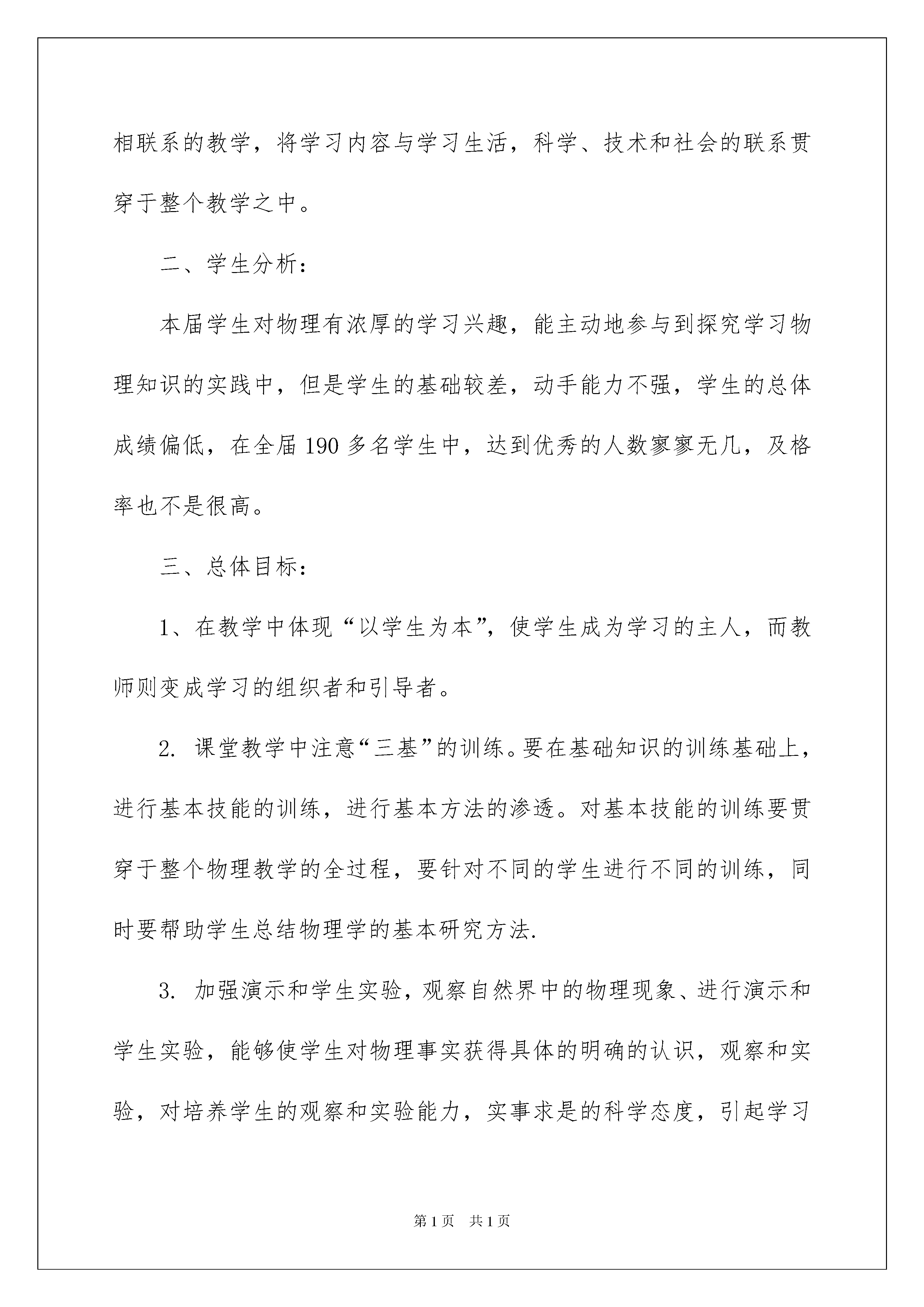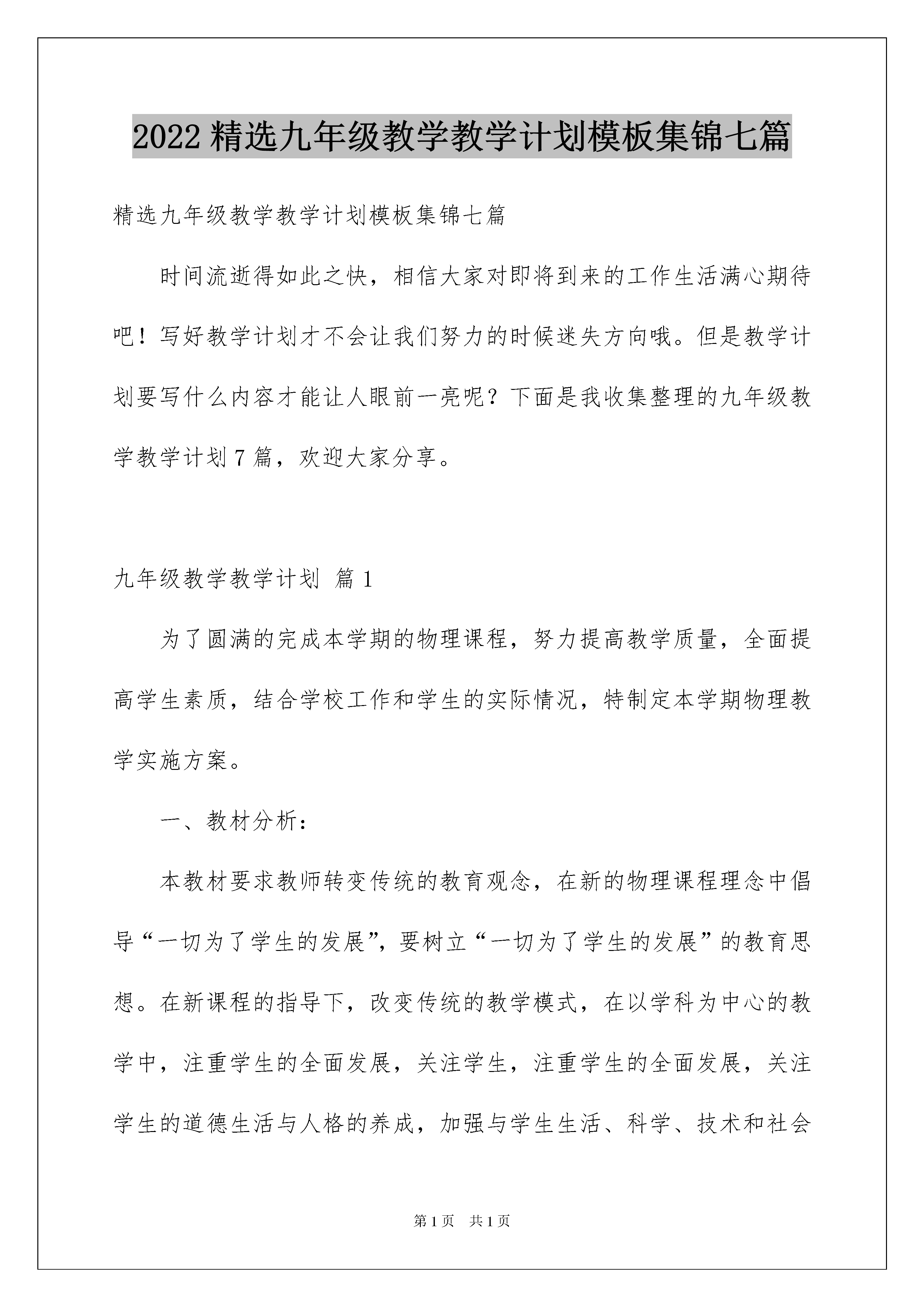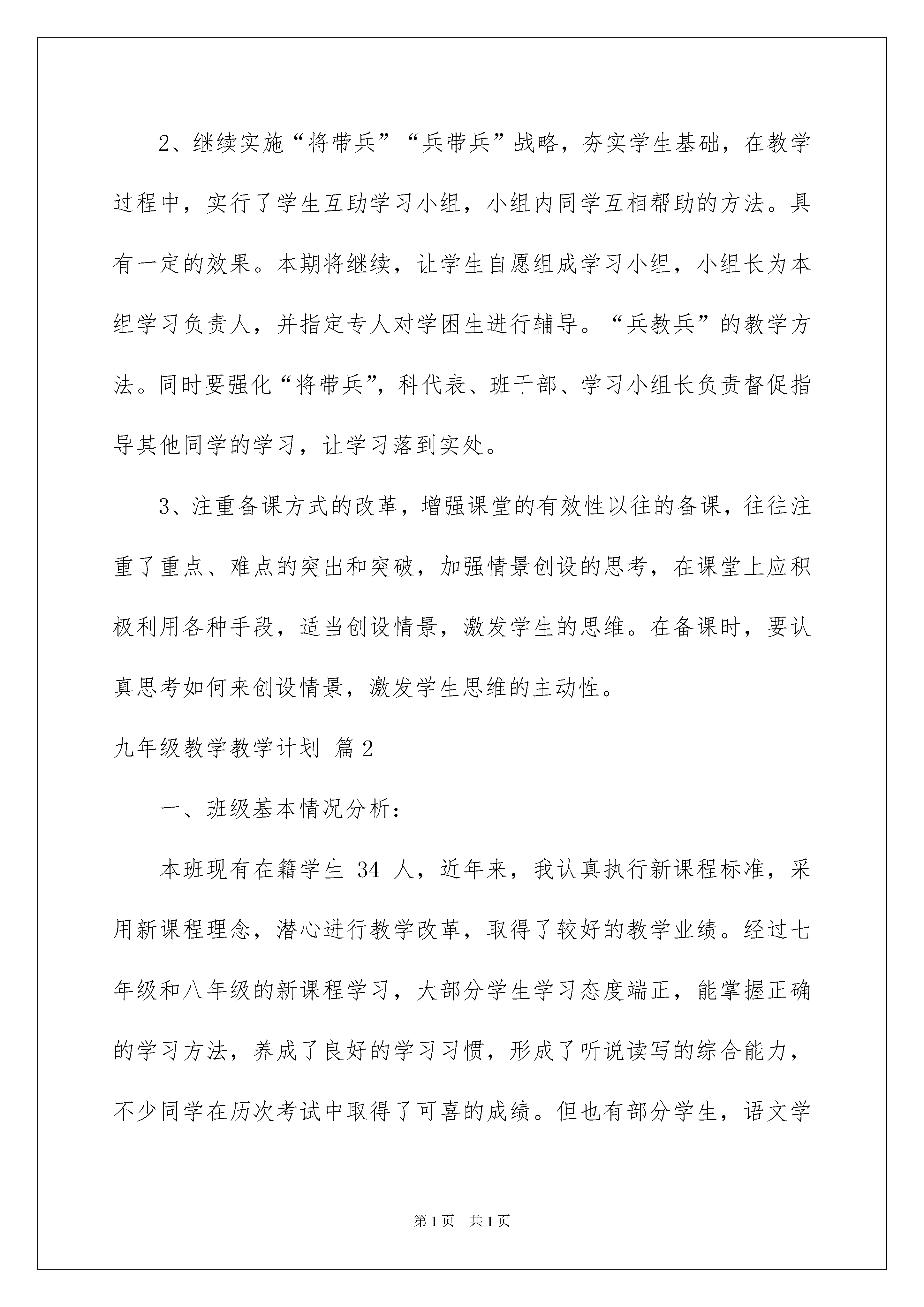 2022精选九年级教学教学计划模板集锦七篇精选九年级教学教学计划模板集锦七篇时间流逝得如此之快,相信大家对即将到来的工作生活满心期待吧!写好教学计划才不会让我们努力的时候迷失方向哦。但是教学计划要写什么内容才能让人眼前一亮呢?下面是我收集整理的九年级教学教学计划7篇,欢迎大家分享。九年级教学教学计划篇1为了圆满的完成本学期的物理课程,努力提高教学质量,全面提高学生素质,结合学校工作和学生的实际情况,特制定本学期物理教学实施方案。一、教材分析:本教材要求教师转变传统的教育观念,在新的物理课程理念中倡导“一切为了学生的发展”,要树立“一切为了学生的发展”的教育思想。在新课程的指导下,改变传统的教学模式,在以学科为中心的教学中,注重学生的全面发展,关注学生,注重学生的全面发展,关注学生的道德生活与人格的养成,加强与学生生活、科学、技术和社会相联系的教学,将学习内容与学习生活,科学、技术和社会的联系贯穿于整个教学之中。二、学生分析:本届学生对物理有浓厚的学习兴趣,能主动地参与到探究学习物理知识的实践中,但是学生的基础较差,动手能力不强,学生的总体成绩偏低,在全届190多名学生中,达到优秀的人数寥寥无几,及格率也不是很高。三、总体目标:1、在教学中体现“以学生为本”,使学生成为学习的主人,而教师则变成学习的组织者和引导者。2.课堂教学中注意“三基”的训练。要在基础知识的训练基础上,进行基本技能的训练,进行基本方法的渗透。对基本技能的训练要贯穿于整个物理教学的全过程,要针对不同的学生进行不同的训练,同时要帮助学生总结物理学的基本研究方法.3.加强演示和学生实验,观察自然界中的物理现象、进行演示和学生实验,能够使学生对物理事实获得具体的明确的认识,观察和实验,对培养学生的观察和实验能力,实事求是的科学态度,引起学习兴趣都有不可替代的重要作用。4.重视物理概念和规律的教学,初中物理中的概念和规律,多数是从物理事实的分析中直接概括出来的,因此在教学中要注意培养学生的分析概括能力。四、教学活动设计:1、认真学习课程标准,领会本科目在教学中的具体要求。新教材虽然不同于过去的要求,因为新教材其灵活性加强了,难度降底了,实践性变得更为明确了。教师必须认真领会其精神实质,对于每一项要求要落到实处,既不能拔高要求,也不能降底难度。2、注重教材体系,加强学生的实际操作能力的培养。新教材不仅在传授文化知识,更注重于培养能力。教师要充分利用教材中已有的各类实验,做到一个一个学生过好训练关,凡是做不好一律重做,直到做到熟练为止。3、讲求教学的多样性与灵活性,努力培养学生的思维能力。让科学进入物理课堂,让新的理念武装学生头脑。使得受教育的学生:学习的观念更新,学习的内容科学,学习的方法优秀。4、严格要求学生,练好学生扎实功底。教育学生养成独立思考问题的能力,使每一个学生真正做到学习成为自已终身的乐趣。5、开展好形式多样的课外活动,培养学生爱科学、用科学的兴趣。教师在狠抓课堂教学的同时,要注重利用业余时间,组织学生参加一些有意义的课外教学活动。6、加强教师自身的业务进修,提高自己的教学水平。多听课,吸取他人教学之长,全期力争听课达20节以上。7、充分利用教材中的德育因素,加强对学生的政治思想教育。因势利导对学生进行思想品德教育,使学生从小就具有高尚的道德情操,爱科学、爱祖国等优秀品质。五、教学措施:1、继续实施合作为主先研后导的教学模式,积极利用实验教学,激发学生兴趣培养学生的实验能力,培养学生分析实验数据得出结论的能力,逐渐培养学生交流合作的能力。培养学生分析论证会的能力。培养学生实验评估的能力,并且结合各科学探究训练学生发现问题、分析假设、设计实验、悼念数据等方面的能力。积极利用信息窗、迷你实验室,发动学生动脑动手,让学生在操作台中学习,将知识用于实践,用实践经验指导理论。2、继续实施“将带兵”“兵带兵”战略,夯实学生基础,在教学过程中,实行了学生互助学习小组,小组内同学互相帮助的方法。具有一定的效果。本期将继续,让学生自愿组成学习小组,小组长为本组学习负责人,并指定专人对学困生进行辅导。“兵教兵”的教学方法。同时要强化“将带兵”,科代表、班干部、学习小组长负责督促指导其他同学的学习,让学习落到实处。3、注重备课方式的改革,增强课堂的有效性以往的备课,往往注重了重点、难点的突出和突破,加强情景创设的思考,在课堂上应积极利用各种手段,适当创设情景,激发学生的思维。在备课时,要认真思考如何来创设情景,激发学生思维的主动性。九年级教学教学计划篇2一、班级基本情况分析:本班现有在籍学生34人,近年来,我认真执行新课程