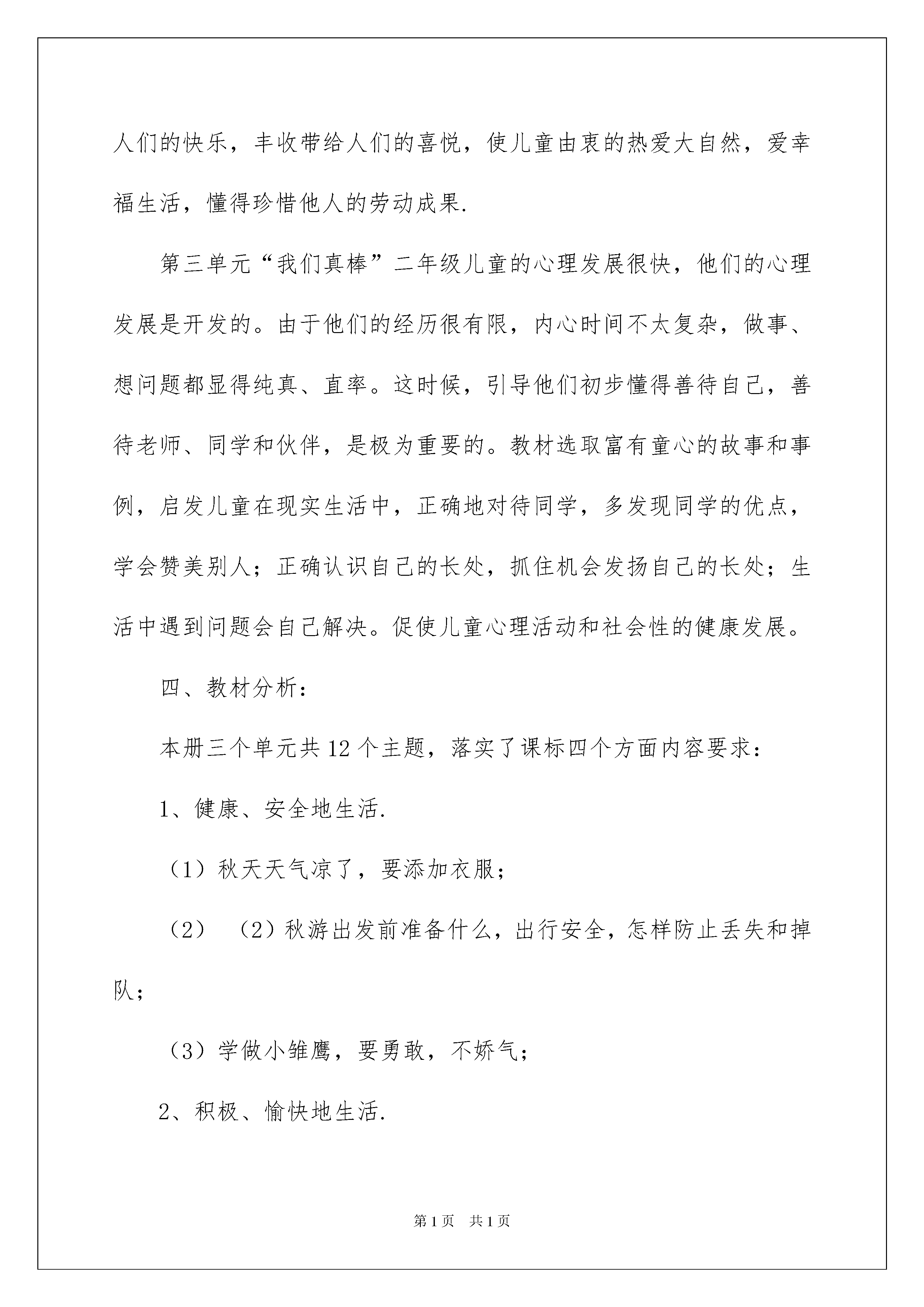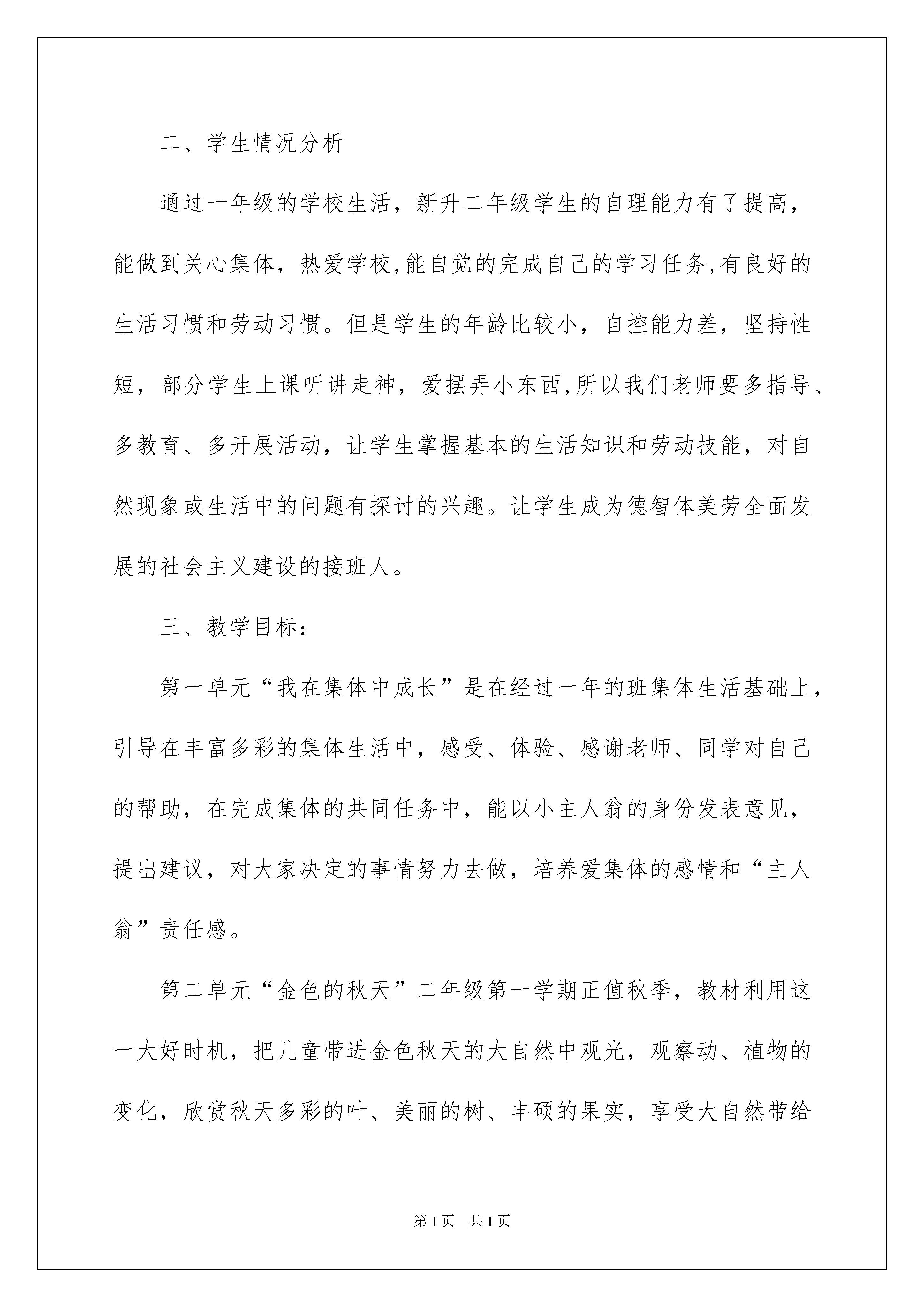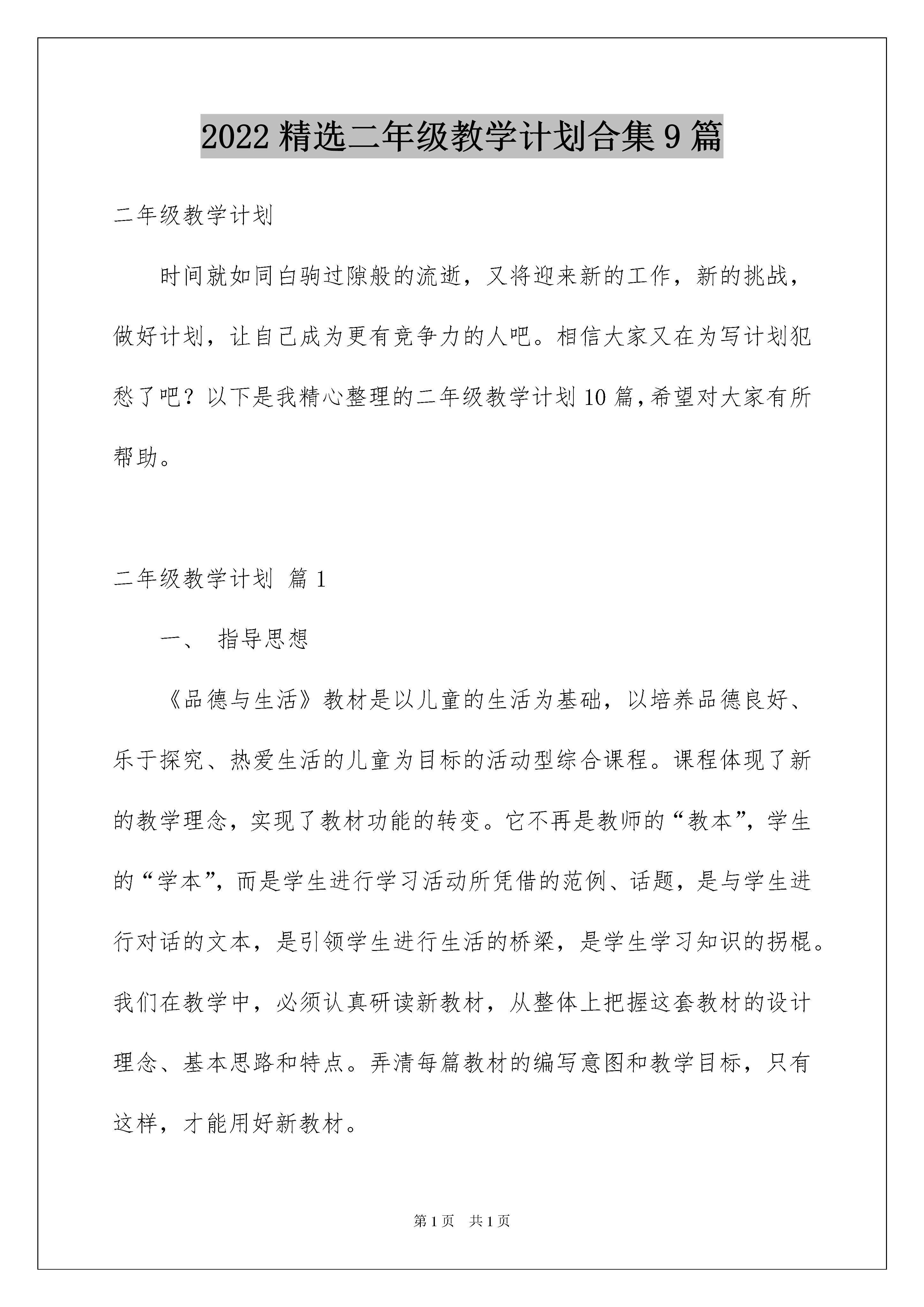 2022精选二年级教学计划合集9篇二年级教学计划时间就如同白驹过隙般的流逝,又将迎来新的工作,新的挑战,做好计划,让自己成为更有竞争力的人吧。相信大家又在为写计划犯愁了吧?以下是我精心整理的二年级教学计划10篇,希望对大家有所帮助。二年级教学计划篇1一、指导思想《品德与生活》教材是以儿童的生活为基础,以培养品德良好、乐于探究、热爱生活的儿童为目标的活动型综合课程。课程体现了新的教学理念,实现了教材功能的转变。它不再是教师的“教本”,学生的“学本”,而是学生进行学习活动所凭借的范例、话题,是与学生进行对话的文本,是引领学生进行生活的桥梁,是学生学习知识的拐棍。我们在教学中,必须认真研读新教材,从整体上把握这套教材的设计理念、基本思路和特点。弄清每篇教材的编写意图和教学目标,只有这样,才能用好新教材。二、学生情况分析通过一年级的学校生活,新升二年级学生的自理能力有了提高,能做到关心集体,热爱学校,能自觉的完成自己的学习任务,有良好的生活习惯和劳动习惯。但是学生的年龄比较小,自控能力差,坚持性短,部分学生上课听讲走神,爱摆弄小东西,所以我们老师要多指导、多教育、多开展活动,让学生掌握基本的生活知识和劳动技能,对自然现象或生活中的问题有探讨的兴趣。让学生成为德智体美劳全面发展的社会主义建设的接班人。三、教学目标:第一单元“我在集体中成长”是在经过一年的班集体生活基础上,引导在丰富多彩的集体生活中,感受、体验、感谢老师、同学对自己的帮助,在完成集体的共同任务中,能以小主人翁的身份发表意见,提出建议,对大家决定的事情努力去做,培养爱集体的感情和“主人翁”责任感。第二单元“金色的秋天”二年级第一学期正值秋季,教材利用这一大好时机,把儿童带进金色秋天的大自然中观光,观察动、植物的变化,欣赏秋天多彩的叶、美丽的树、丰硕的果实,享受大自然带给人们的快乐,丰收带给人们的喜悦,使儿童由衷的热爱大自然,爱幸福生活,懂得珍惜他人的劳动成果.第三单元“我们真棒”二年级儿童的心理发展很快,他们的心理发展是开发的。由于他们的经历很有限,内心时间不太复杂,做事、想问题都显得纯真、直率。这时候,引导他们初步懂得善待自己,善待老师、同学和伙伴,是极为重要的。教材选取富有童心的故事和事例,启发儿童在现实生活中,正确地对待同学,多发现同学的优点,学会赞美别人;正确认识自己的长处,抓住机会发扬自己的长处;生活中遇到问题会自己解决。促使儿童心理活动和社会性的健康发展。四、教材分析:本册三个单元共12个主题,落实了课标四个方面内容要求:1、健康、安全地生活.(1)秋天天气凉了,要添加衣服;(2)(2)秋游出发前准备什么,出行安全,怎样防止丢失和掉队;(3)学做小雏鹰,要勇敢,不娇气;2、积极、愉快地生活.(1)快乐的暑假生活,我的心愿;(2)团团圆圆过中秋;(3)做个“快乐鸟”变烦恼为快乐;3、负责任、有爱心地生活.(1)当好值日生、我是个小小保结员、让我们的教室清洁又美丽;(2)“好书大家看”同学间的亲情;(3)“团团圆圆过中秋”家人间的亲情;4、动脑筋、有创意的生活.(1)“找秋天”、“神秘的月亮”发挥观察力、想象力;(2)“留住秋天”、“秋天的游戏”发挥想象力;(3)制作“感谢卡”、“我的成长包”、“树叶标本”等发挥动手动脑的能力。(一)目标的多维性本课程为综合课程,教材中每一课都含有多重教育目标,要改变过去偏重知识、技能学习、忽略能力、态度、情感、价值观培养的倾向,全面、整体地实现课程目标,在教学中不仅要关注显性目标,还要关注贯穿于整个课程之中的隐性目标。(二)活动的有效性教材的每一项活动都直接指向教学目标,是为学生实现教学目标去经历、体验而设计的,不是为活动而活动,为了体现活动的有效性,在教学中要明确每个活动的目的,要让全体学生真正走进活动,在活动中体验、感知、感悟,提升自我。(三)学生的主体性儿童是学习的主体,要改变过去“我讲你听”,“我问你答”,学生围着老师转的局面。教学中要真正尊重学生、依靠学生,依据学生已有的生活经验,考虑其兴趣,研究其需要,充分调动他们内在的积极性,使他们能全身心地投入到学习中去,以达到学生自主学习,自我建构。(四)教师的指导性只有在教师引导下,儿童才能不断发展和提高,教学中该导的不导,放任自流,不是课改的方向,教学应源于生活,又高于生活,不是生活的翻版,教师应注意对儿童课上生存的问题进行筛选,对学习的反馈进行指导,引导儿童在多元价值中做出正确的合理的选择。(五)评价的发展性“立足过程,促进发展”是新一轮课程改革倡导的评价理念。五、教学重点:重难点:1、教育学生注意坐、立、走姿势正确。