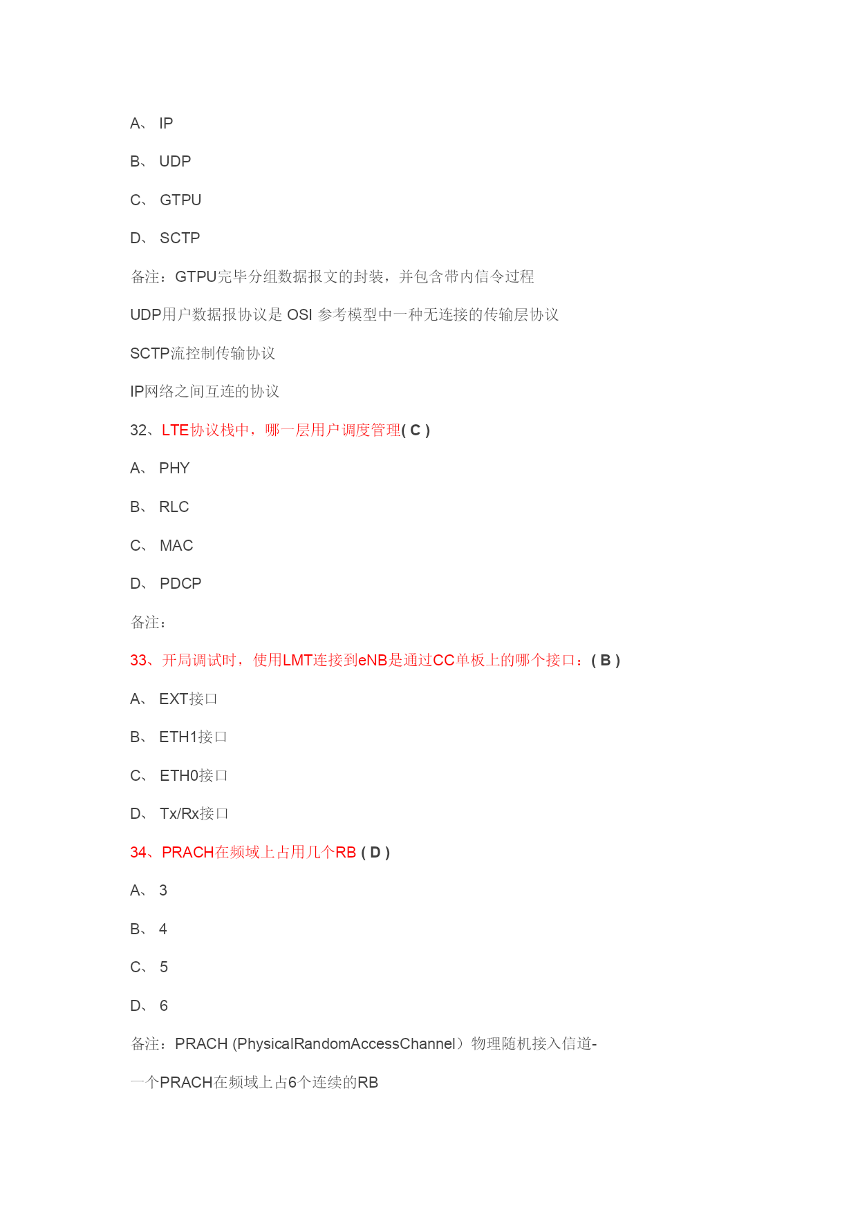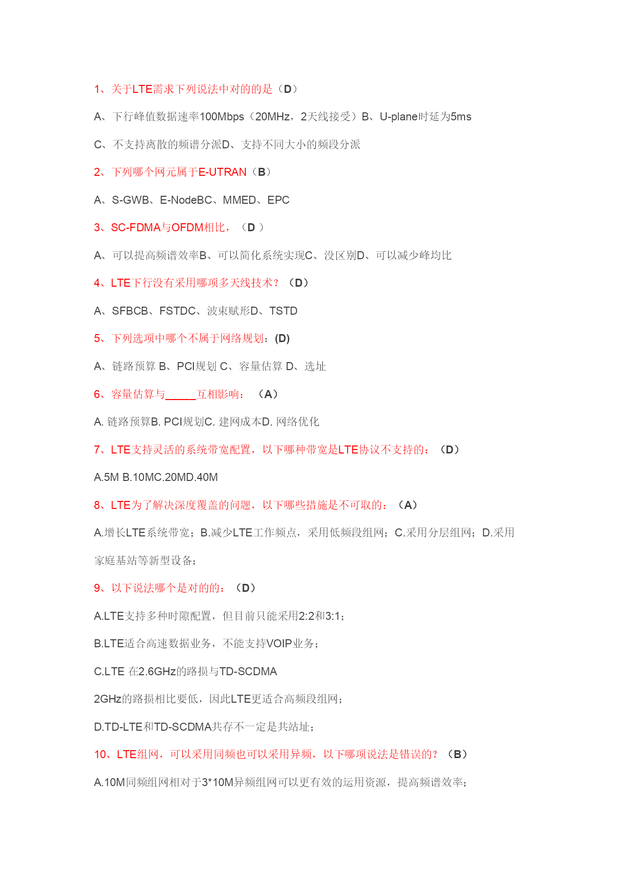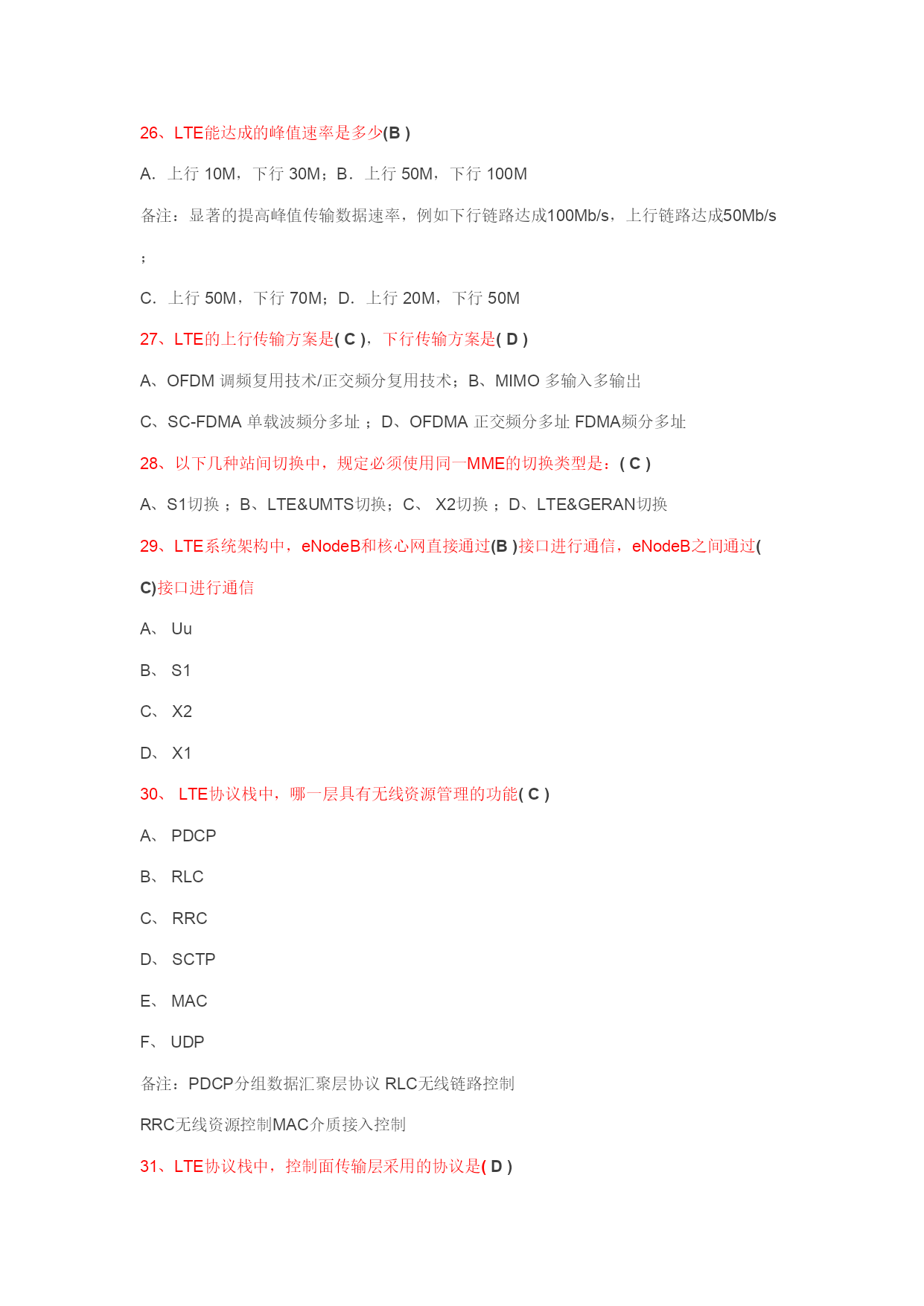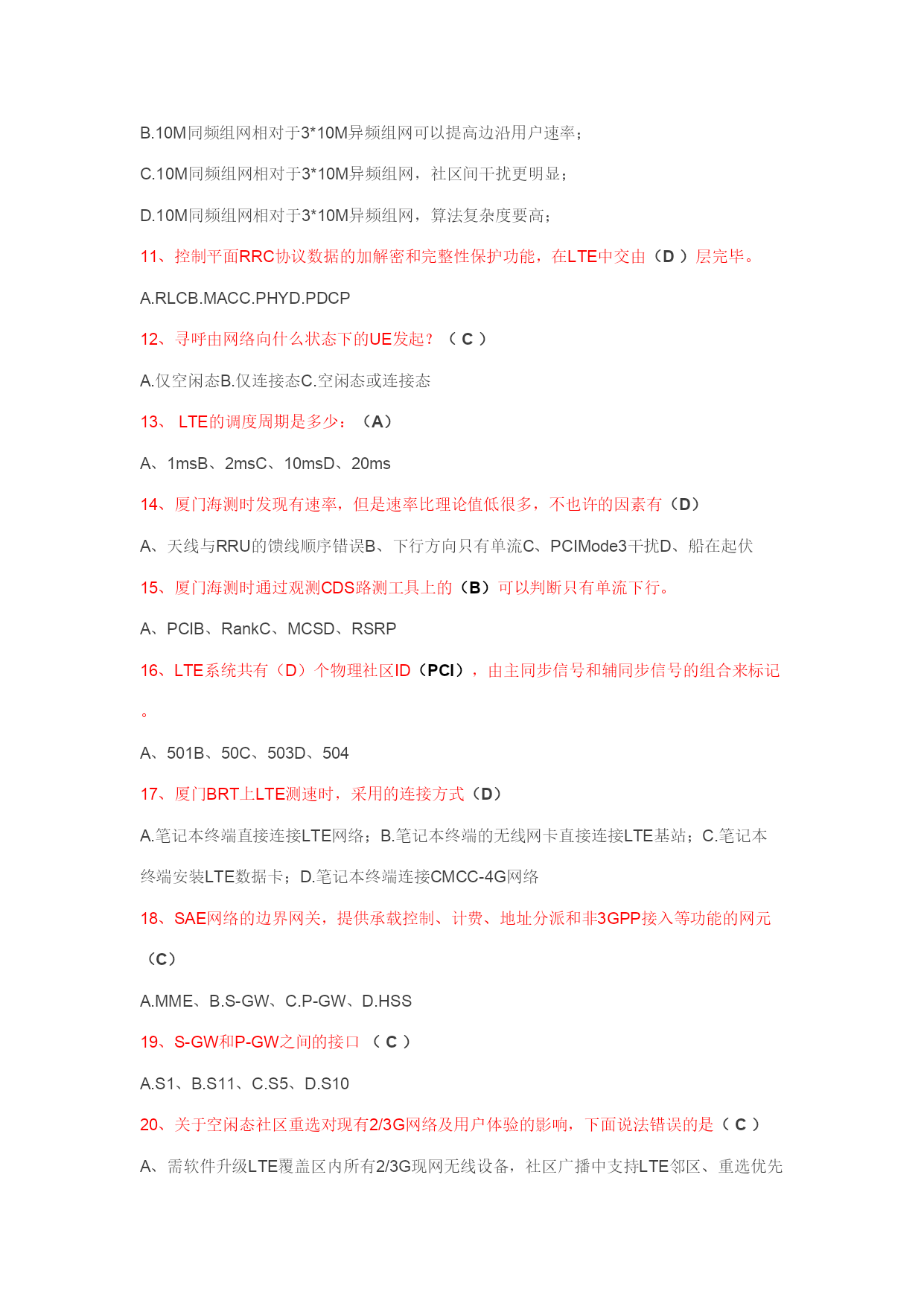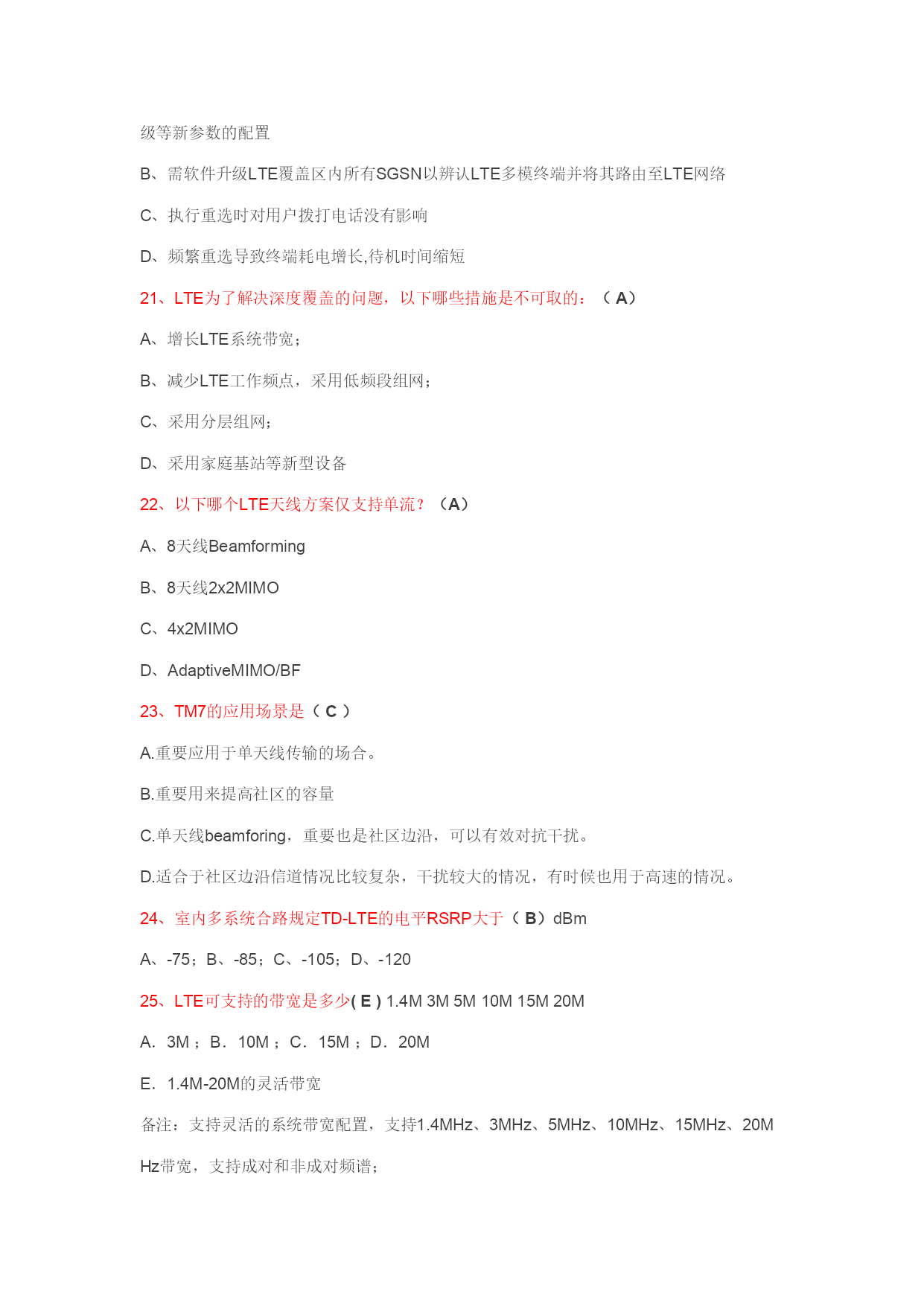 1、关于LTE需求下列说法中对的的是(D)A、下行峰值数据速率100Mbps(20MHz,2天线接受)B、U-plane时延为5msC、不支持离散的频谱分派D、支持不同大小的频段分派2、下列哪个网元属于E-UTRAN(B)A、S-GWB、E-NodeBC、MMED、EPC3、SC-FDMA与OFDM相比,(D) 可以提高频谱效率B、可以简化系统实现C、没区别D、可以减少峰均比4、LTE下行没有采用哪项多天线技术?(D)A、SFBCB、FSTDC、波束赋形D、TSTD5、下列选项中哪个不属于网络规划:(D)A、链路预算B、PCI规划C、容量估算D、选址6、容量估算与_____互相影响:(A)A.链路预算B.PCI规划C.建网成本D.网络优化7、LTE支持灵活的系统带宽配置,以下哪种带宽是LTE协议不支持的:(D)A.5MB.10MC.20MD.40M8、LTE为了解决深度覆盖的问题,以下哪些措施是不可取的:(A)A.增长LTE系统带宽;B.减少LTE工作频点,采用低频段组网;C.采用分层组网;D.采用家庭基站等新型设备;9、以下说法哪个是对的的:(D)A.LTE支持多种时隙配置,但目前只能采用2:2和3:1;B.LTE适合高速数据业务,不能支持VOIP业务;C.LTE在2.6GHz的路损与TD-SCDMA2GHz的路损相比要低,因此LTE更适合高频段组网;D.TD-LTE和TD-SCDMA共存不一定是共站址;10、LTE组网,可以采用同频也可以采用异频,以下哪项说法是错误的?(B)A.10M同频组网相对于3*10M异频组网可以更有效的运用资源,提高频谱效率;B.10M同频组网相对于3*10M异频组网可以提高边沿用户速率;C.10M同频组网相对于3*10M异频组网,社区间干扰更明显;D.10M同频组网相对于3*10M异频组网,算法复杂度要高;11、控制平面RRC协议数据的加解密和完整性保护功能,在LTE中交由(D)层完毕。A.RLCB.MACC.PHYD.PDCP12、寻呼由网络向什么状态下的UE发起?(C)A.仅空闲态B.仅连接态C.空闲态或连接态13、LTE的调度周期是多少:(A)A、1msB、2msC、10msD、20ms14、厦门海测时发现有速率,但是速率比理论值低很多,不也许的因素有(D)A、天线与RRU的馈线顺序错误B、下行方向只有单流C、PCIMode3干扰D、船在起伏15、厦门海测时通过观测CDS路测工具上的(B)可以判断只有单流下行。A、PCIB、RankC、MCSD、RSRP16、LTE系统共有(D)个物理社区ID(PCI),由主同步信号和辅同步信号的组合来标记。A、501B、50C、503D、50417、厦门BRT上LTE测速时,采用的连接方式(D)A.笔记本终端直接连接LTE网络;B.笔记本终端的无线网卡直接连接LTE基站;C.笔记本终端安装LTE数据卡;D.笔记本终端连接CMCC-4G网络18、SAE网络的边界网关,提供承载控制、计费、地址分派和非3GPP接入等功能的网元(C)A.MME、B.S-GW、C.P-GW、D.HSS19、S-GW和P-GW之间的接口(C)A.S1、B.S11、C.S5、D.S1020、关于空闲态社区重选对现有2/3G网络及用户体验的影响,下面说法错误的是(C)A、需软件升级LTE覆盖区内所有2/3G现网无线设备,社区广播中支持LTE邻区、重选优先级等新参数的配置B、需软件升级LTE覆盖区内所有SGSN以辨认LTE多模终端并将其路由至LTE网络C、执行重选时对用户拨打电话没有影响D、频繁重选导致终端耗电增长,待机时间缩短21、LTE为了解决深度覆盖的问题,以下哪些措施是不可取的:(A)A、增长LTE系统带宽;B、减少LTE工作频点,采用低频段组网;C、采用分层组网;D、采用家庭基站等新型设备22、以下哪个LTE天线方案仅支持单流?(A)A、8天线BeamformingB、8天线2x2MIMOC、4x2MIMOD、AdaptiveMIMO/BF23、TM7的应用场景是(C)A.重要应用于单天线传输的场合。B.重要用来提高社区的容量C.单天线beamforing,重要也是社区边沿,可以有效对抗干扰。D.适合于社区边沿信道情况比较复杂,干扰较大的情况,有时候也用于高速的情况。24、室内多系统合路规定TD-LTE的电平RSRP大于(B)dBmA、-75;B、-85;C、-105;D、-12025、LTE可支持的带宽是多少(E)1.4M3M5M10M15M20MA.3M;B.10M;C.15M;D.20ME.1.4M-20M的灵活带宽备注:支持灵活的系统带宽配置,支持1.4MHz、3MHz、5MHz、10MHz、15MHz、20MHz带宽,支持成对和非成对频谱;26、LTE能达成的峰值速率