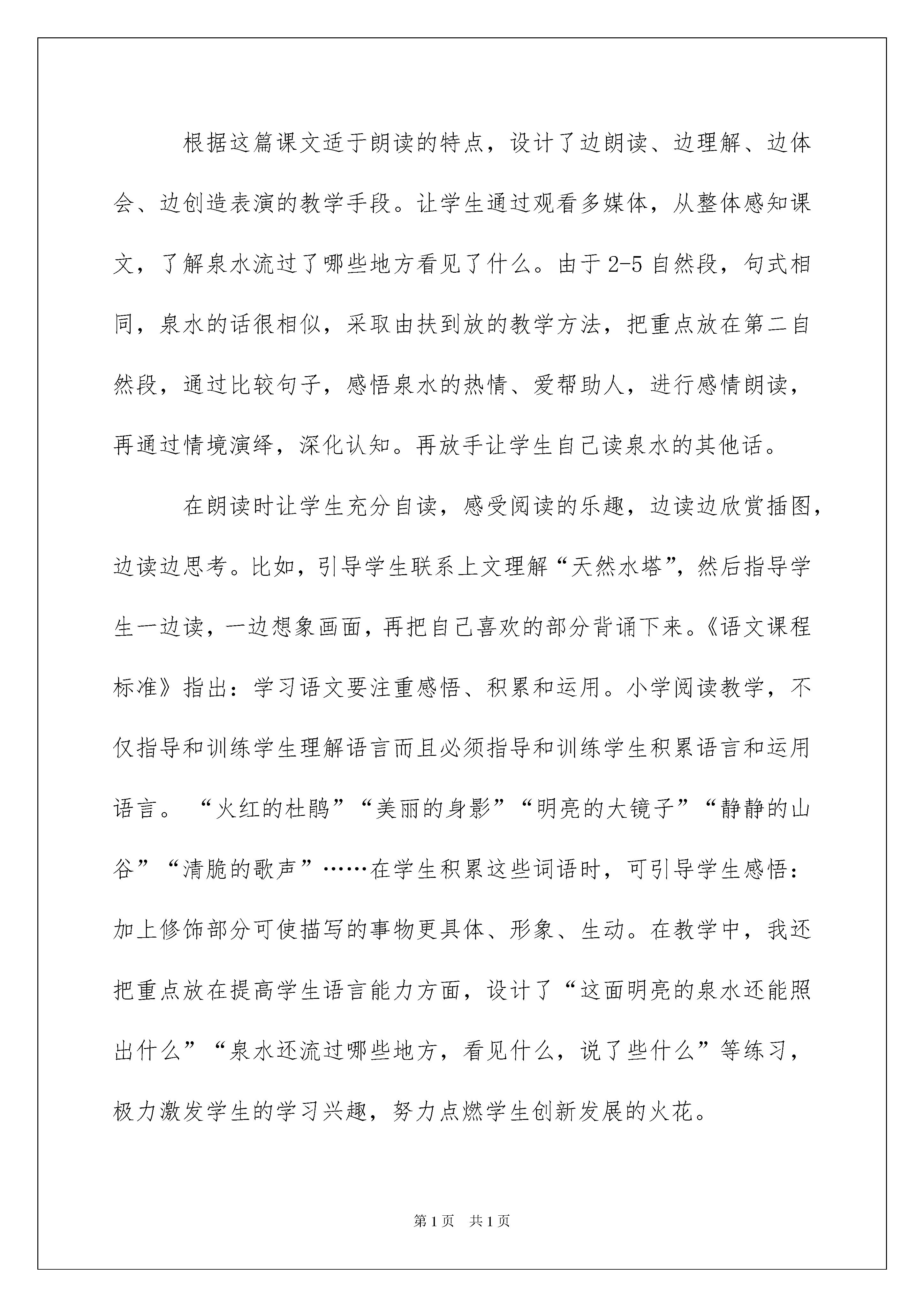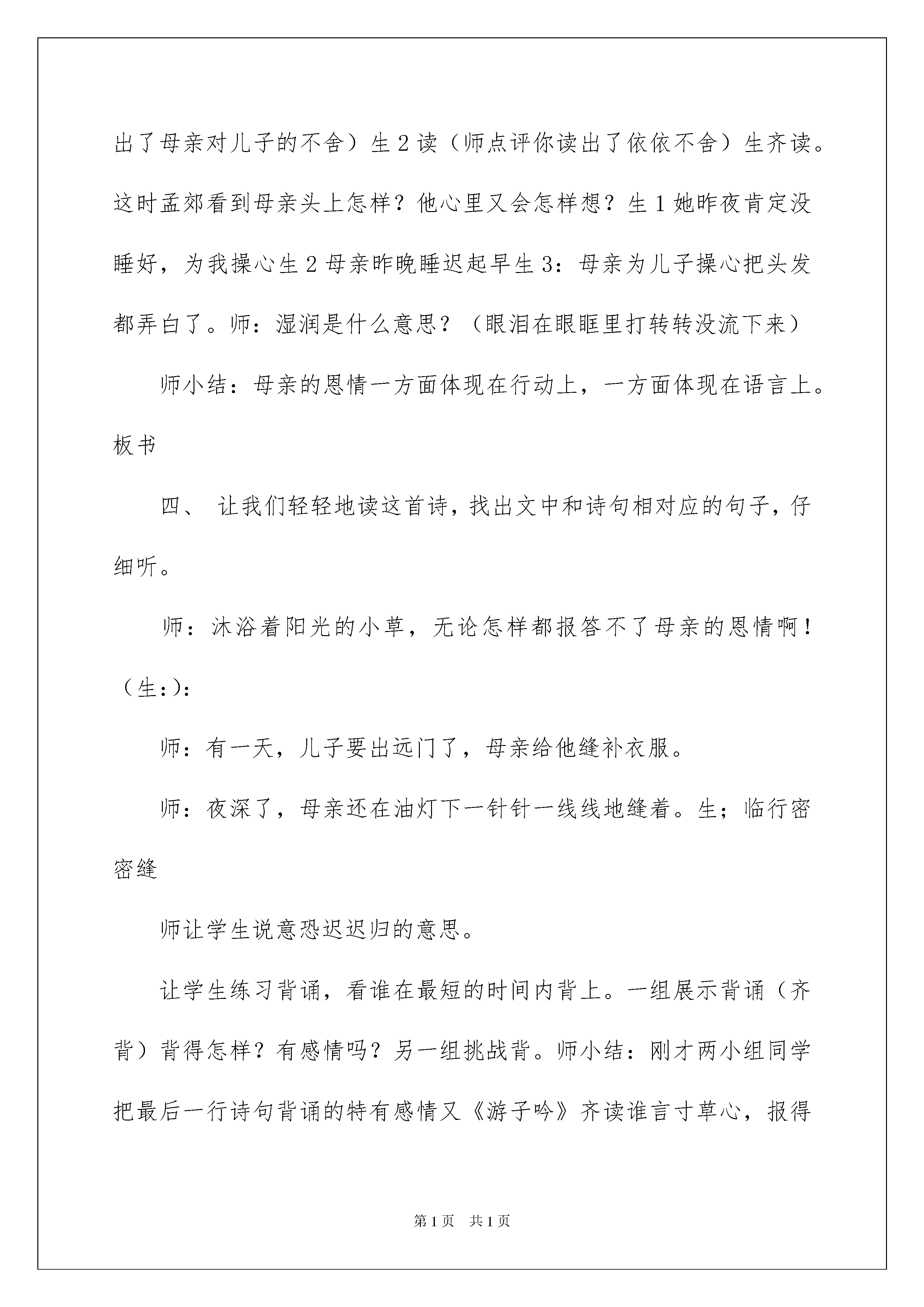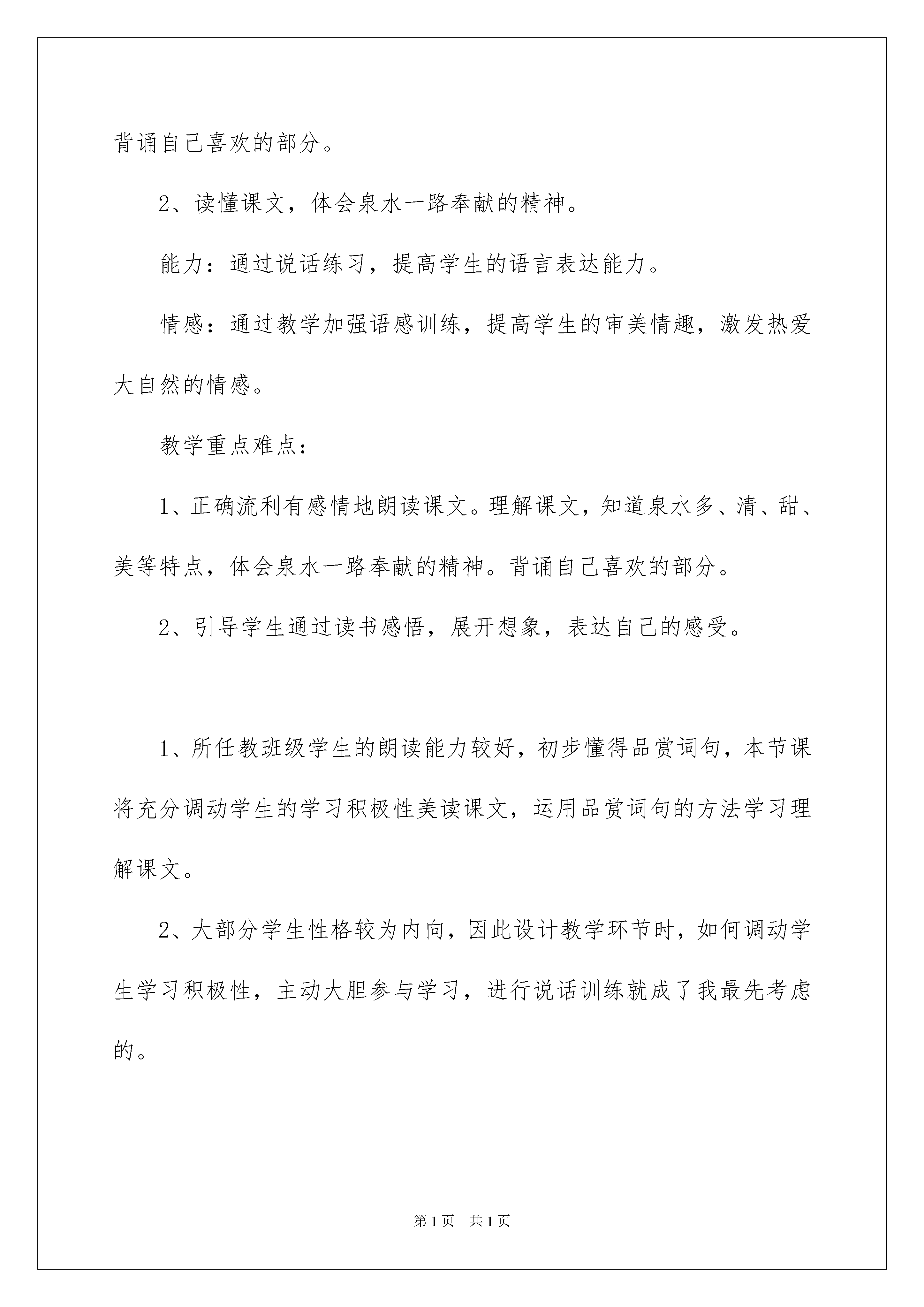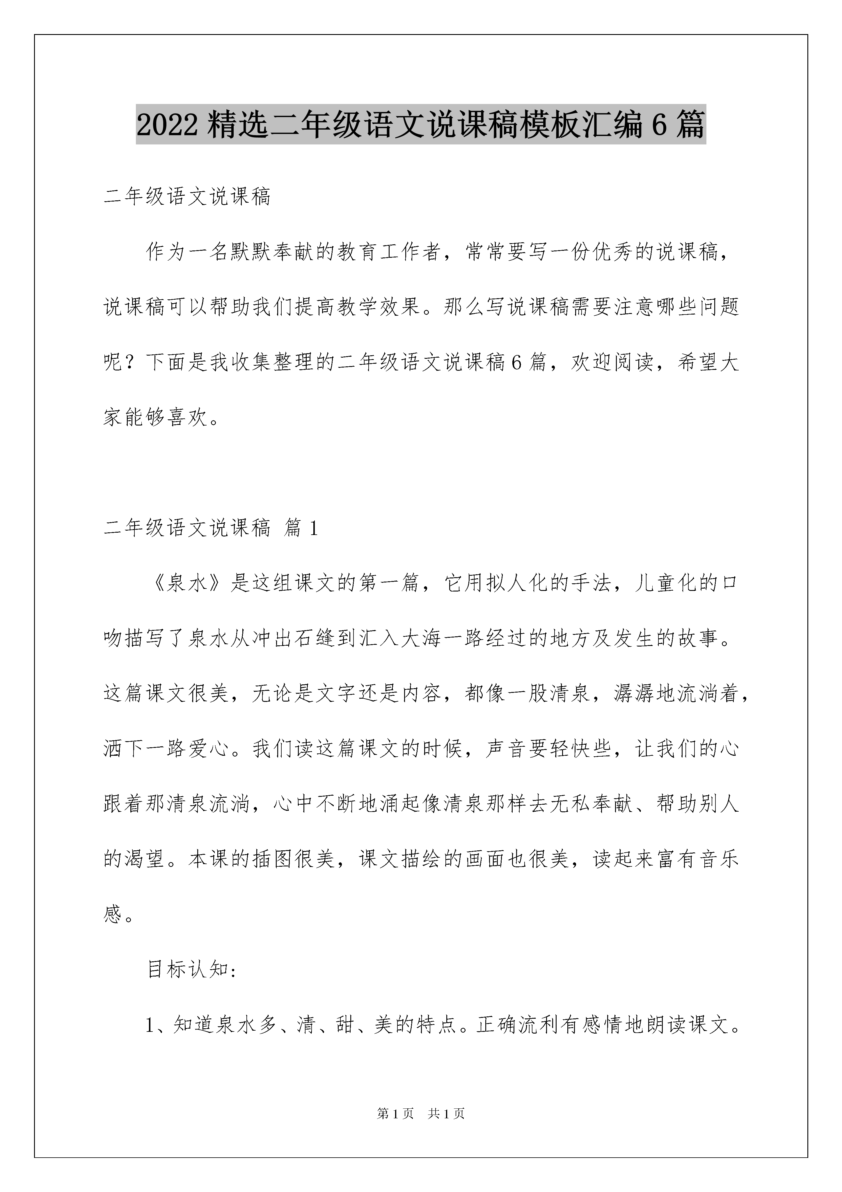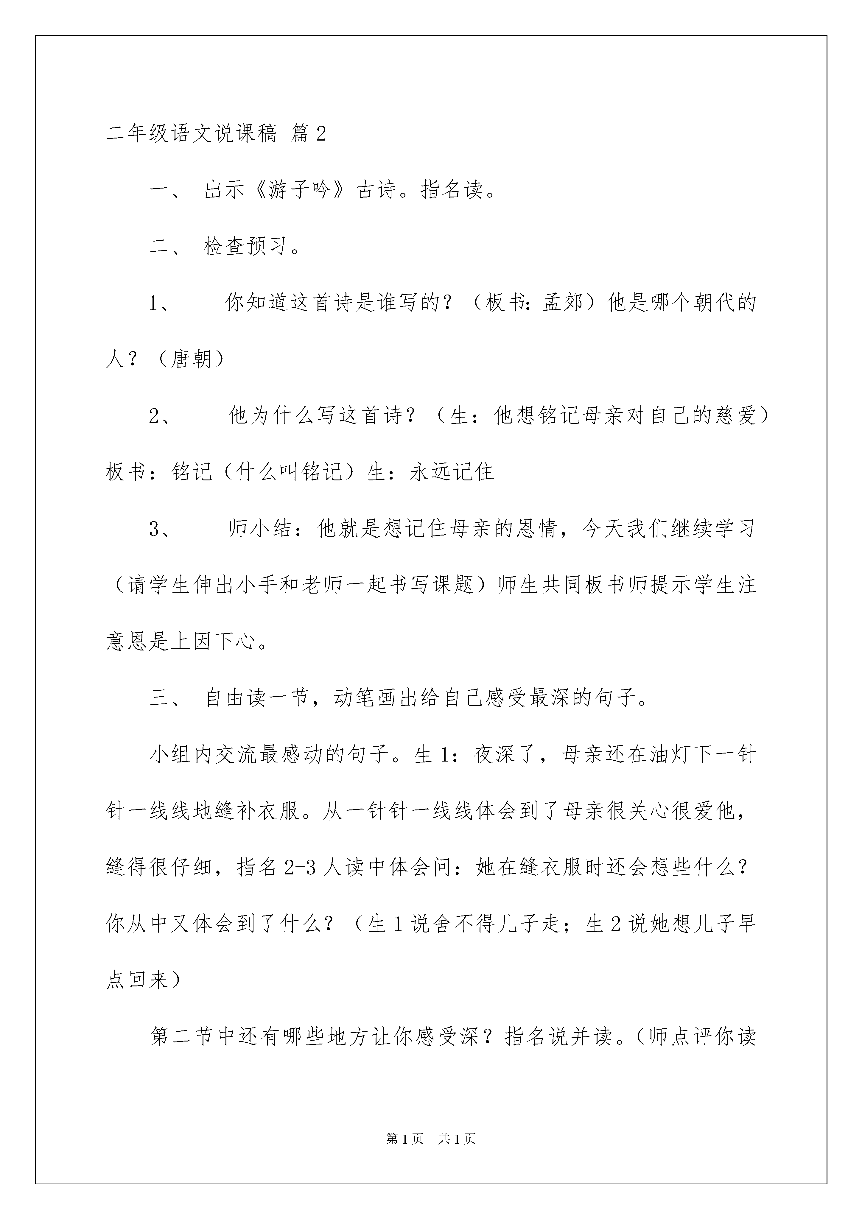 2022精选二年级语文说课稿模板汇编6篇二年级语文说课稿作为一名默默奉献的教育工作者,常常要写一份优秀的说课稿,说课稿可以帮助我们提高教学效果。那么写说课稿需要注意哪些问题呢?下面是我收集整理的二年级语文说课稿6篇,欢迎阅读,希望大家能够喜欢。二年级语文说课稿篇1《泉水》是这组课文的第一篇,它用拟人化的手法,儿童化的口吻描写了泉水从冲出石缝到汇入大海一路经过的地方及发生的故事。这篇课文很美,无论是文字还是内容,都像一股清泉,潺潺地流淌着,洒下一路爱心。我们读这篇课文的时候,声音要轻快些,让我们的心跟着那清泉流淌,心中不断地涌起像清泉那样去无私奉献、帮助别人的渴望。本课的插图很美,课文描绘的画面也很美,读起来富有音乐感。目标认知:1、知道泉水多、清、甜、美的特点。正确流利有感情地朗读课文。背诵自己喜欢的部分。2、读懂课文,体会泉水一路奉献的精神。能力:通过说话练习,提高学生的语言表达能力。情感:通过教学加强语感训练,提高学生的审美情趣,激发热爱大自然的情感。教学重点难点:1、正确流利有感情地朗读课文。理解课文,知道泉水多、清、甜、美等特点,体会泉水一路奉献的精神。背诵自己喜欢的部分。2、引导学生通过读书感悟,展开想象,表达自己的感受。1、所任教班级学生的朗读能力较好,初步懂得品赏词句,本节课将充分调动学生的学习积极性美读课文,运用品赏词句的方法学习理解课文。2、大部分学生性格较为内向,因此设计教学环节时,如何调动学生学习积极性,主动大胆参与学习,进行说话训练就成了我最先考虑的。根据这篇课文适于朗读的特点,设计了边朗读、边理解、边体会、边创造表演的教学手段。让学生通过观看多媒体,从整体感知课文,了解泉水流过了哪些地方看见了什么。由于2-5自然段,句式相同,泉水的话很相似,采取由扶到放的教学方法,把重点放在第二自然段,通过比较句子,感悟泉水的热情、爱帮助人,进行感情朗读,再通过情境演绎,深化认知。再放手让学生自己读泉水的其他话。在朗读时让学生充分自读,感受阅读的乐趣,边读边欣赏插图,边读边思考。比如,引导学生联系上文理解“天然水塔”,然后指导学生一边读,一边想象画面,再把自己喜欢的部分背诵下来。《语文课程标准》指出:学习语文要注重感悟、积累和运用。小学阅读教学,不仅指导和训练学生理解语言而且必须指导和训练学生积累语言和运用语言。“火红的杜鹃”“美丽的身影”“明亮的大镜子”“静静的山谷”“清脆的歌声”……在学生积累这些词语时,可引导学生感悟:加上修饰部分可使描写的事物更具体、形象、生动。在教学中,我还把重点放在提高学生语言能力方面,设计了“这面明亮的泉水还能照出什么”“泉水还流过哪些地方,看见什么,说了些什么”等练习,极力激发学生的学习兴趣,努力点燃学生创新发展的火花。二年级语文说课稿篇2一、出示《游子吟》古诗。指名读。二、检查预习。1、你知道这首诗是谁写的?(板书:孟郊)他是哪个朝代的人?(唐朝)2、他为什么写这首诗?(生:他想铭记母亲对自己的慈爱)板书:铭记(什么叫铭记)生:永远记住3、师小结:他就是想记住母亲的恩情,今天我们继续学习(请学生伸出小手和老师一起书写课题)师生共同板书师提示学生注意恩是上因下心。三、自由读一节,动笔画出给自己感受最深的句子。小组内交流最感动的句子。生1:夜深了,母亲还在油灯下一针针一线线地缝补衣服。从一针针一线线体会到了母亲很关心很爱他,缝得很仔细,指名2-3人读中体会问:她在缝衣服时还会想些什么?你从中又体会到了什么?(生1说舍不得儿子走;生2说她想儿子早点回来)第二节中还有哪些地方让你感受深?指名说并读。(师点评你读出了母亲对儿子的不舍)生2读(师点评你读出了依依不舍)生齐读。这时孟郊看到母亲头上怎样?他心里又会怎样想?生1她昨夜肯定没睡好,为我操心生2母亲昨晚睡迟起早生3:母亲为儿子操心把头发都弄白了。师:湿润是什么意思?(眼泪在眼眶里打转转没流下来)师小结:母亲的恩情一方面体现在行动上,一方面体现在语言上。板书四、让我们轻轻地读这首诗,找出文中和诗句相对应的句子,仔细听。师:沐浴着阳光的小草,无论怎样都报答不了母亲的恩情啊!(生:):师:有一天,儿子要出远门了,母亲给他缝补衣服。师:夜深了,母亲还在油灯下一针针一线线地缝着。生;临行密密缝师让学生说意恐迟迟归的意思。让学生练习背诵,看谁在最短的时间内背上。一组展示背诵(齐背)背得怎样?有感情吗?另一组挑战背。师小结:刚才两小组同学把最后一行诗句背诵的特有感情又《游子吟》齐读谁言寸草心,报得三春晖!这是千古名句,要记住。那么我们能为母亲做些什么呢?小组内讨论,看谁能做一个爱母亲的孩子生1帮母