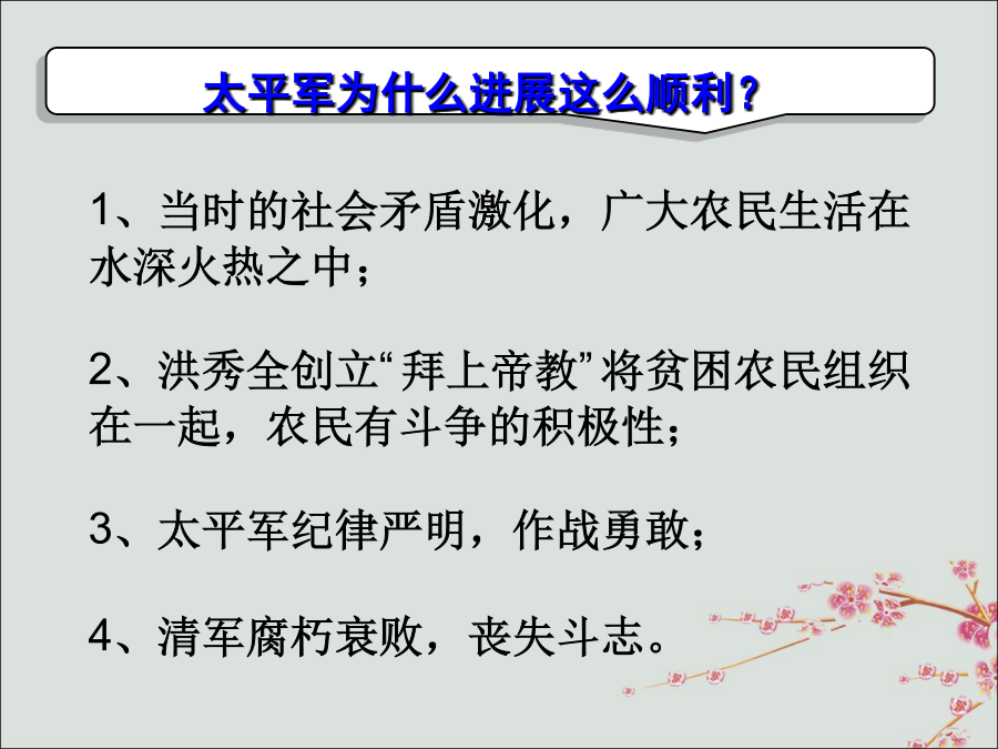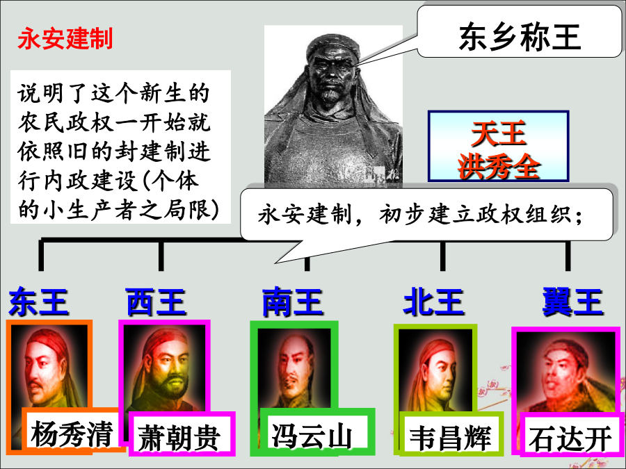 第3课 太平天国运动天王 洪秀全太平军为什么进展这么顺利?①凡分田,照人口,不论男妇,算其家人口多寡,人多则分多,人寡则分寡,杂以九等。如一家六人,分三人好田,分三人丑田,好丑各一半。凡天下田,天下人同耕,此处不足,则迁彼处,彼处不足,则迁此处…………务使天下共享天父上主皇上帝大福,有田同耕,有饭同食,有衣同穿,有钱同使,无处不均匀,无人不饱暖也。 ②人人不受私,物物归上主。……凡收成者,(除留足口粮外)余则归圣库。凡麦豆、苎麻、布帛、鸡犬各物亦然。所有婚娶弥月喜事,俱用圣库。1853年冬天的某日,天京街头出现太平天国的一个告示:《天朝田亩制度》甲:管他呢,这比以前没有田耕好多了。5个人的田地够我耕种了,以后不但吃穿不愁,还可以把剩余的拿到街上去卖,添置一些家业。 乙:你这种想法是不允许的。你没看清告示上的规定:每户除留足口粮外,其余多的东西都要上交天国的圣库,统一管理。 甲:呦,还有这样的规定?这可不好,我辛辛苦苦多收一点粮食,自己不能处理,却要上交,这不是好了他人吗?罢了,罢了,我还不如省省力气,生产的粮食够吃就可以。 丙:是啊,自己花力气种出的粮食,却要给别人,谁有心思多种粮食呀。另外,现在长期打仗,天国哪有时间和精力去分田呢?永安天王府模型阅读与思考: △《贼情汇纂》载:“秀清自恃功高,朝见立而不跪,每诈称天父下凡附体,令秀全跪其前,甚至数其罪而杖责之,造言既毕,其为君臣如初。” △《李秀成自述》载:“(东王)权太重,要逼天王封其万岁。那时权柄皆在东王一人手上,不得不封,逼天王亲到东王府封其万岁。” ——以上材料说明了什么问题?原因:天王 洪秀全探究:阅读下列材料,理解《资政新篇》。英法洋枪队太平天国运动失败的原因失败的原因: ①主观:农民阶级的局限性(根本原因); ②客观:中外反动势力的联合绞杀。(1)反封建:沉重打击了清朝统治,加速了清王朝和整个封建制度的衰落和崩溃。课堂总结
