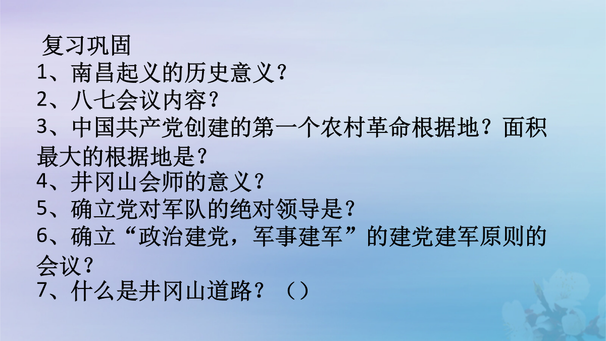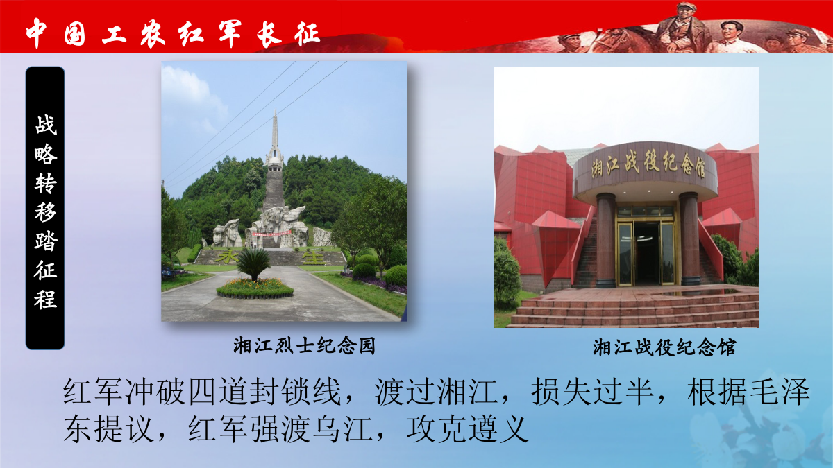 复习巩固 1、南昌起义的历史意义? 2、八七会议内容? 3、中国共产党创建的第一个农村革命根据地?面积最大的根据地是? 4、井冈山会师的意义? 5、确立党对军队的绝对领导是? 6、确立“政治建党,军事建军”的建党建军原则的会议? 7、什么是井冈山道路?()第17课 中国工农红军长征湘江战役纪念馆伟大转折定航向——遵义会议为什么说遵义会议是中国共产党历史上一个生死攸关的转折点?据美国著名记者斯诺统计:红军一共爬过了18条山脉,其中5条终年冰雪覆盖;渡过24条河流;经过11个省份;占领过62座城市;突破10个地方军阀组织的包围,此外还打败或躲过追击的国民党中央军。 长征,几乎一天就有一次遭遇战,总共有15个整天用在打大决战上。路上一共368天用在夜间行军上。剩下来的100天——其中有许多天打遭遇战——有56天在四川西北,因此总长5000英里的路上只休息了44天,平均每走114英里休息一次。平均每天行军71华里,即近24英里,要在一个地球上最险峻的地带保持这样的平均速度,可以说近乎奇迹。红军过草地材料阅读: 红军不怕远征难,万水千山只等闲。五岭逶迤腾细浪,乌蒙磅礴走泥丸。金沙水拍云崖暖,大渡桥横铁索寒。更喜岷山千里雪,三军过后尽开颜。 ——毛泽东 1.诗中反映了长征途中的哪几件大事? 2.诗中的“三军”是指参加长征的哪三大主力红军?他们会师在哪个省的哪个地区? 3、读毛泽东诗词,感悟长征所体现出来的伟大精神是什么?周末默写: 1、遵义会议时间、内容、历史意义? 2、红军长征胜利的历史意义?瑞金出发它不是一般意义上的“行军”,不是战役,也不是胜利,它是一曲人类求生存的凯歌……长征却使毛泽东及其共产党人赢得了中国。本世纪中没有什么比长征更令人神往和更为深远地影响世界前途的事件了。 ——美国作家哈里森·索尔兹伯里 讲到长征,请问有什么意义呢?我们说,长征是历史上的第一次,长征是宣言书,长征是宣传队,长征是播种机。自从盘古开天地,三皇五帝到于今,历史上曾经有过我们这样的长征吗?十二个月光阴中间,天上每日几十架飞机侦察轰炸,地下几十万大军围追堵截,路上遇着了说不尽的艰难险阻,我们却开动了每人的两只脚,长驱二万余里,纵横十一个省。请问历史上曾有过我们这样的长征吗?没有,从来没有的。 ——毛泽东 长征是一次理想信念的伟大远征。崇高的理想,坚定的信念,永远是中国共产党人的政治灵魂。中国共产党从成立之日起,就把共产主义确立为远大理想,始终团结带领中国人民朝着这个伟大理想前行。党和红军几经挫折而不断奋起,历尽苦难而淬火成钢,归根到底在于心中的远大理想和革命信念始终坚定执着,始终闪耀着火热的光芒。 ——习近平