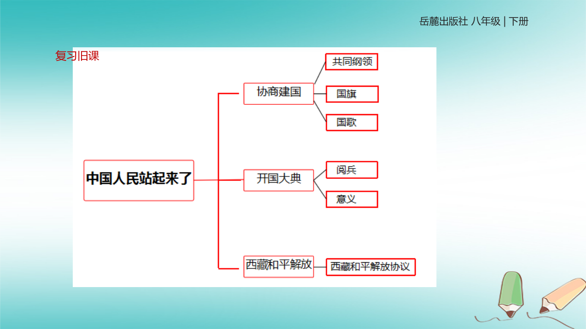 复习旧课岳麓出版社八年级|下册讲授新知识朝鲜问题的由来1945年8月15日,日本投降后,南北双方在美、苏的支持下,分别建立以李承晚为首的大韩民国和以金日成为首的朝鲜民主主义人民共和国。朝鲜战争爆发二.跨过鸭绿江 结论: 中国人民志愿军奔赴朝鲜,不仅是为了援助朝鲜,更重要的是保家卫国。志愿军誓师大会5.典型人物:邱少云黄继光英雄人物毛泽东的儿子长眠于朝鲜的大地上三.抗美援朝战争的胜利巩固应用抗美援朝