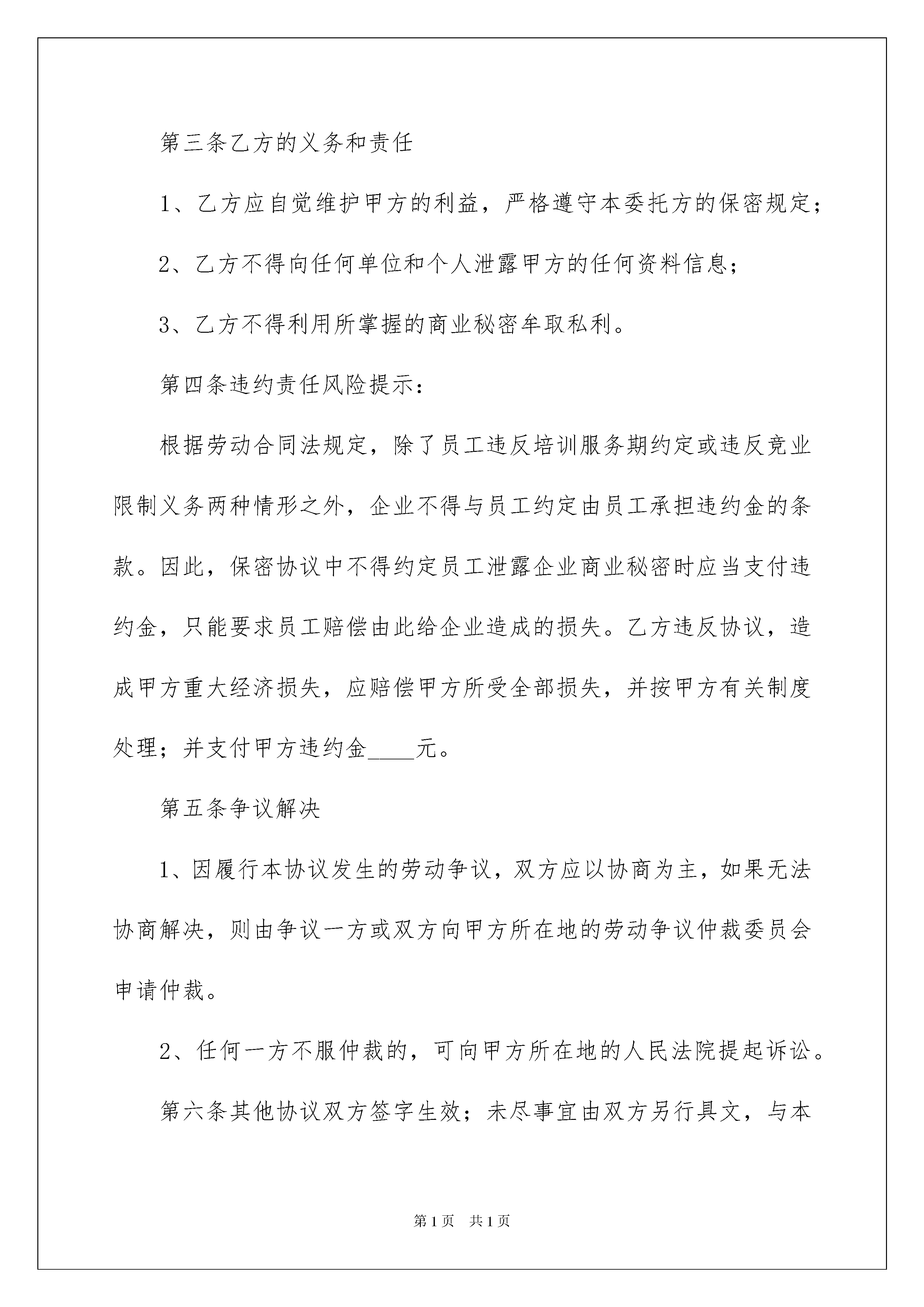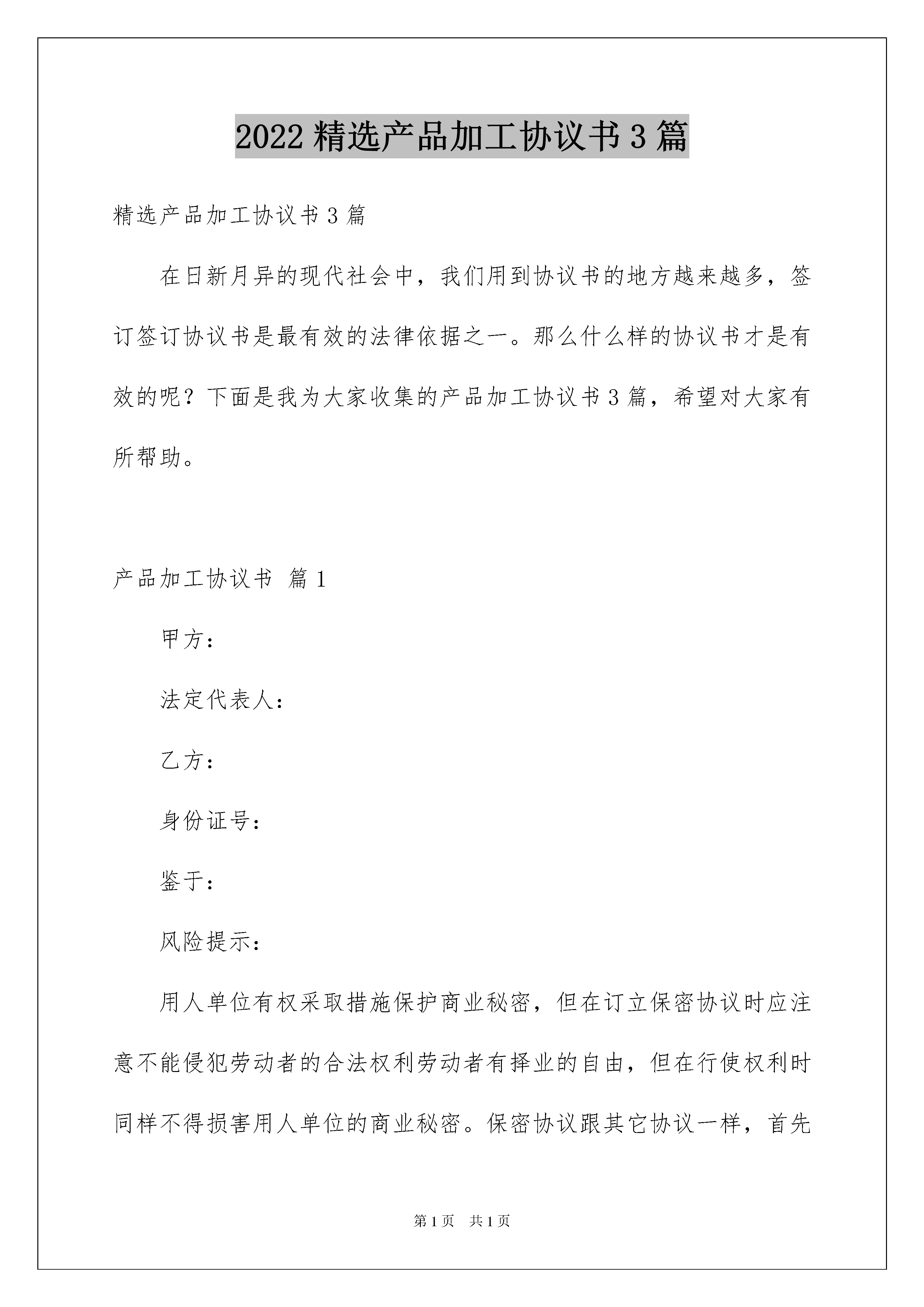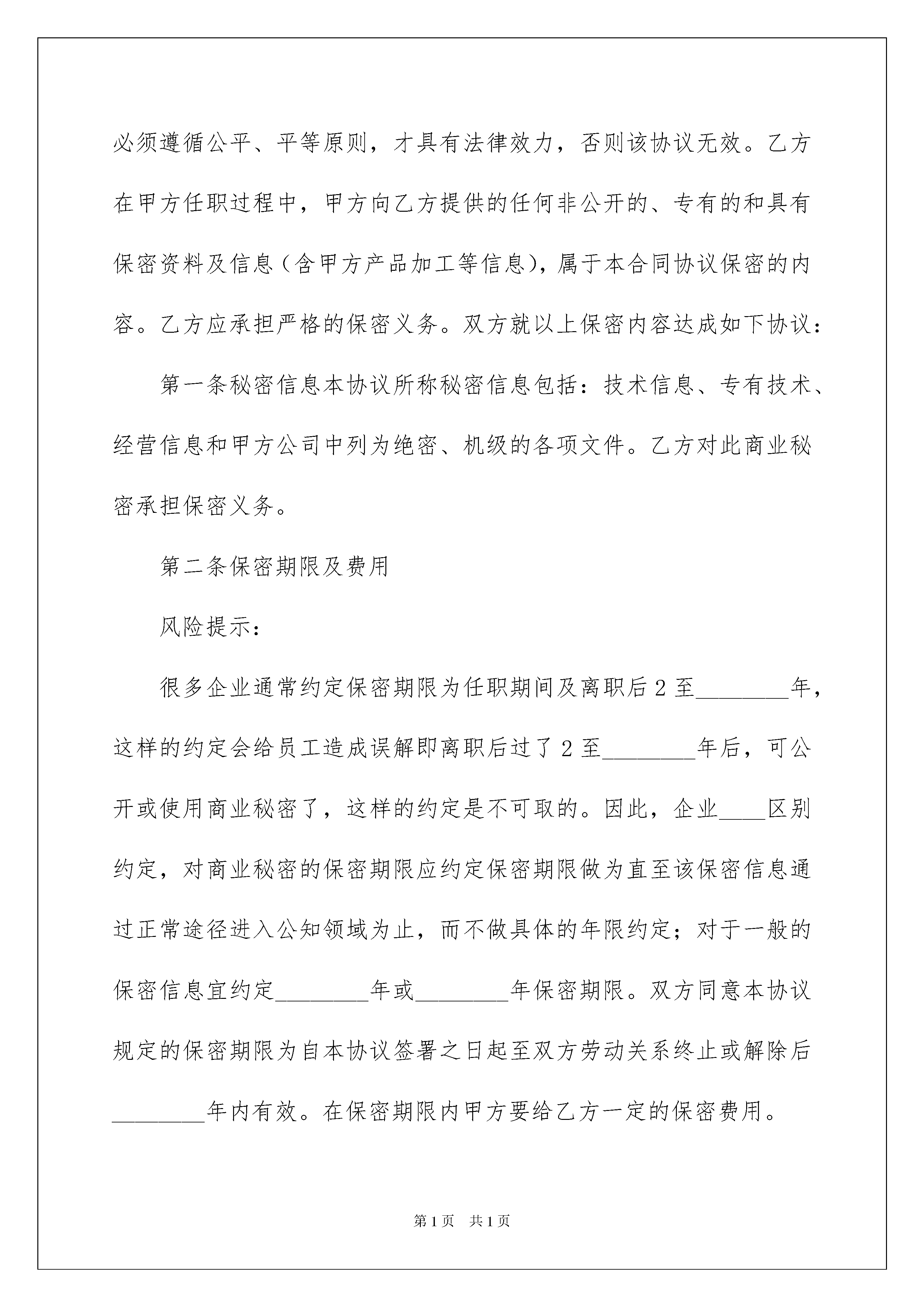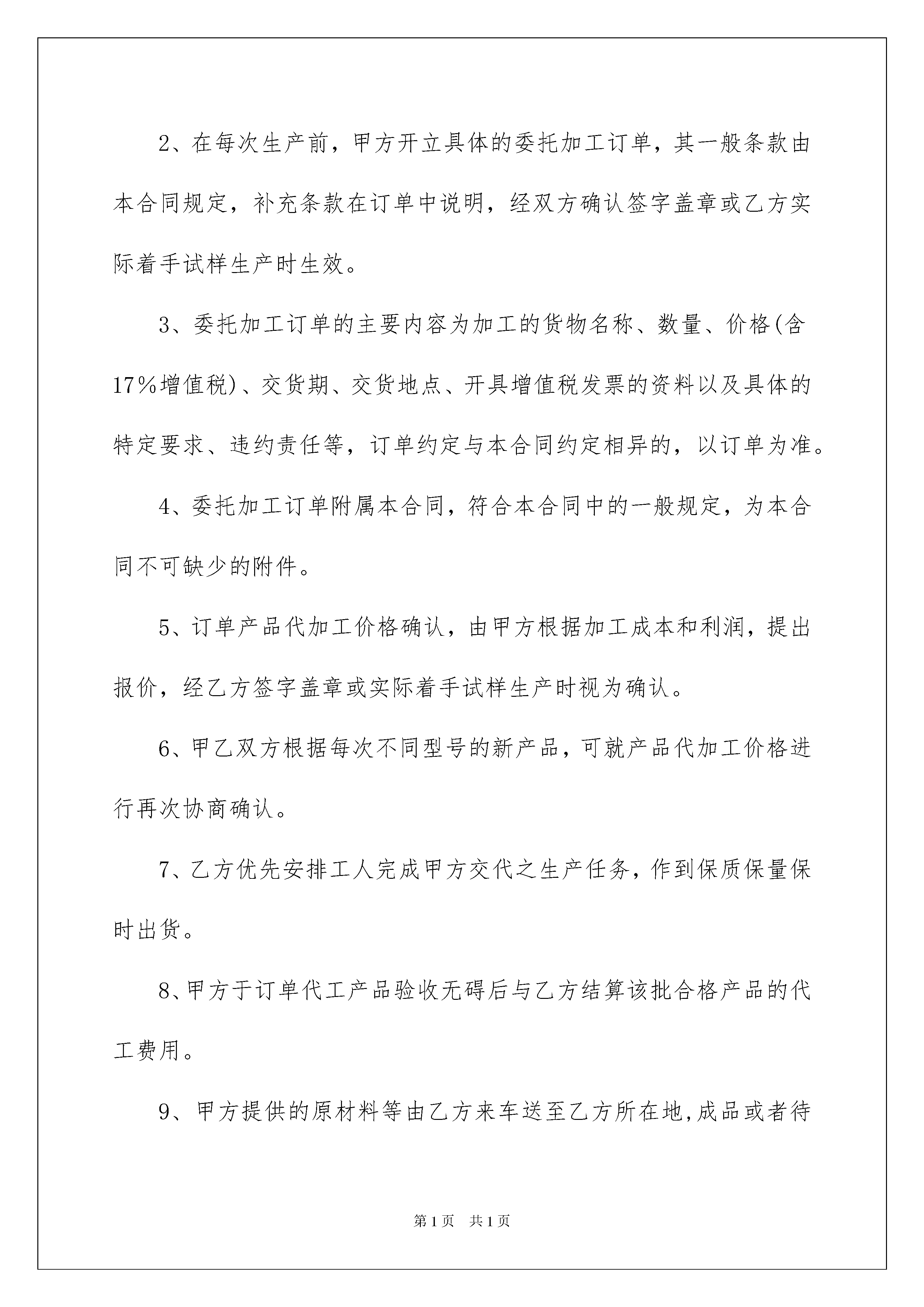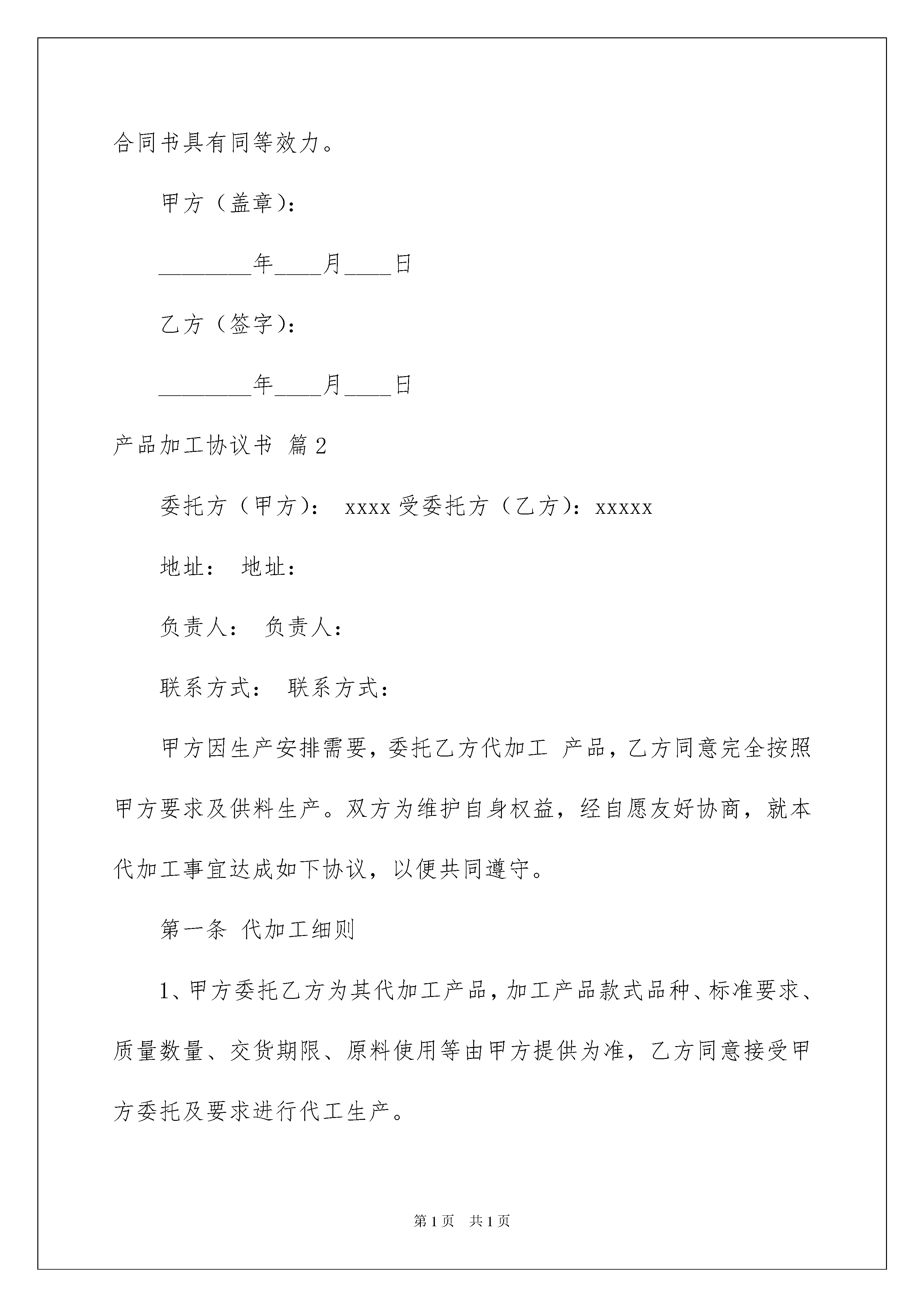 2022精选产品加工协议书3篇精选产品加工协议书3篇在日新月异的现代社会中,我们用到协议书的地方越来越多,签订签订协议书是最有效的法律依据之一。那么什么样的协议书才是有效的呢?下面是我为大家收集的产品加工协议书3篇,希望对大家有所帮助。产品加工协议书篇1甲方:法定代表人:乙方:身份证号:鉴于:风险提示:用人单位有权采取措施保护商业秘密,但在订立保密协议时应注意不能侵犯劳动者的合法权利劳动者有择业的自由,但在行使权利时同样不得损害用人单位的商业秘密。保密协议跟其它协议一样,首先必须遵循公平、平等原则,才具有法律效力,否则该协议无效。乙方在甲方任职过程中,甲方向乙方提供的任何非公开的、专有的和具有保密资料及信息(含甲方产品加工等信息),属于本合同协议保密的内容。乙方应承担严格的保密义务。双方就以上保密内容达成如下协议:第一条秘密信息本协议所称秘密信息包括:技术信息、专有技术、经营信息和甲方公司中列为绝密、机级的各项文件。乙方对此商业秘密承担保密义务。第二条保密期限及费用风险提示:很多企业通常约定保密期限为任职期间及离职后2至________年,这样的约定会给员工造成误解即离职后过了2至________年后,可公开或使用商业秘密了,这样的约定是不可取的。因此,企业____区别约定,对商业秘密的保密期限应约定保密期限做为直至该保密信息通过正常途径进入公知领域为止,而不做具体的年限约定;对于一般的保密信息宜约定________年或________年保密期限。双方同意本协议规定的保密期限为自本协议签署之日起至双方劳动关系终止或解除后________年内有效。在保密期限内甲方要给乙方一定的保密费用。第三条乙方的义务和责任1、乙方应自觉维护甲方的利益,严格遵守本委托方的保密规定;2、乙方不得向任何单位和个人泄露甲方的任何资料信息;3、乙方不得利用所掌握的商业秘密牟取私利。第四条违约责任风险提示:根据劳动合同法规定,除了员工违反培训服务期约定或违反竞业限制义务两种情形之外,企业不得与员工约定由员工承担违约金的条款。因此,保密协议中不得约定员工泄露企业商业秘密时应当支付违约金,只能要求员工赔偿由此给企业造成的损失。乙方违反协议,造成甲方重大经济损失,应赔偿甲方所受全部损失,并按甲方有关制度处理;并支付甲方违约金____元。第五条争议解决1、因履行本协议发生的劳动争议,双方应以协商为主,如果无法协商解决,则由争议一方或双方向甲方所在地的劳动争议仲裁委员会申请仲裁。2、任何一方不服仲裁的,可向甲方所在地的人民法院提起诉讼。第六条其他协议双方签字生效;未尽事宜由双方另行具文,与本合同书具有同等效力。甲方(盖章):________年____月____日乙方(签字):________年____月____日产品加工协议书篇2委托方(甲方):xxxx受委托方(乙方):xxxxx地址:地址:负责人:负责人:联系方式:联系方式:甲方因生产安排需要,委托乙方代加工产品,乙方同意完全按照甲方要求及供料生产。双方为维护自身权益,经自愿友好协商,就本代加工事宜达成如下协议,以便共同遵守。第一条代加工细则1、甲方委托乙方为其代加工产品,加工产品款式品种、标准要求、质量数量、交货期限、原料使用等由甲方提供为准,乙方同意接受甲方委托及要求进行代工生产。2、在每次生产前,甲方开立具体的委托加工订单,其一般条款由本合同规定,补充条款在订单中说明,经双方确认签字盖章或乙方实际着手试样生产时生效。3、委托加工订单的主要内容为加工的货物名称、数量、价格(含17%增值税)、交货期、交货地点、开具增值税发票的资料以及具体的特定要求、违约责任等,订单约定与本合同约定相异的,以订单为准。4、委托加工订单附属本合同,符合本合同中的一般规定,为本合同不可缺少的附件。5、订单产品代加工价格确认,由甲方根据加工成本和利润,提出报价,经乙方签字盖章或实际着手试样生产时视为确认。6、甲乙双方根据每次不同型号的新产品,可就产品代加工价格进行再次协商确认。7、乙方优先安排工人完成甲方交代之生产任务,作到保质保量保时出货。8、甲方于订单代工产品验收无碍后与乙方结算该批合格产品的代工费用。9、甲方提供的原材料等由乙方来车送至乙方所在地,成品或者待检品由已方送到甲方。10、本合同期暂为月日到日。具体以甲方通知确定为准。第二条甲方责任1、按生产计划需要,分别下订单委托乙方为其代加工2、向乙方提供有关代加工产品所需的材料及信息等。包括款式、要求、数量、货期、原材料、模具、图样等。3、对乙方的代加工行为进行指导及检查监督,提出意见及建议。4、按照详告乙方的代工标准进行