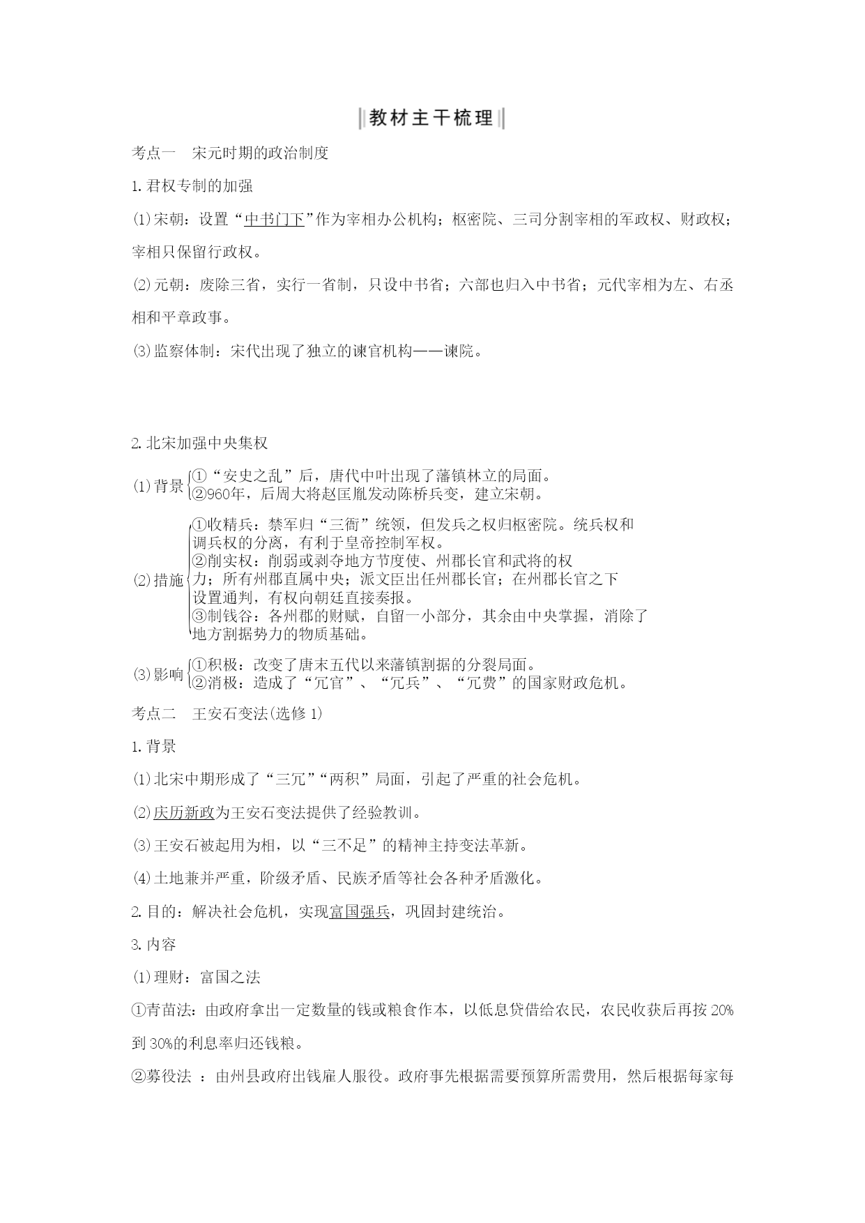 阶段四古代中华文明的成熟与鼎盛——宋元 课时1宋元时期的政治制度 考纲考点宋元的政治制度(1)宋元君主专制的加强。(2)宋元中央集权的加强。(3)王安石变法*。素养解读时空观念从宋至元朝君主专制下的中枢机构不断革新,相权逐步削弱;中央对地方的管理日趋强化,基本奠定了后世的地方行政区划。历史解释宋代尚未完成全国的统一,但中央与地方机构增多,加强了君主专制,解决了唐代以来的藩镇割据问题,也造成了庞大的管理体系;元代国家统一,疆域辽阔,行省制度的实施,巩固了统一多民族国家,对后世影响深远。史料实证运用史料记载论证宋元君主专制中央集权加强的特点及影响。唯物史观从经济基础和上层建筑关系角度理解,宋元时期政治演变趋势的特点及影响,辩证客观地评价政治现象。家国情怀从宋元政治统治的加强,多民族国家发展角度,认识统一多民族国家巩固发展的爱国情怀。 考点一宋元时期的政治制度 1.君权专制的加强 (1)宋朝:设置“中书门下”作为宰相办公机构;枢密院、三司分割宰相的军政权、财政权;宰相只保留行政权。 (2)元朝:废除三省,实行一省制,只设中书省;六部也归入中书省;元代宰相为左、右丞相和平章政事。 (3)监察体制:宋代出现了独立的谏官机构——谏院。 2.北宋加强中央集权 (1)背景eq\b\lc\{(\a\vs4\al\co1(①“安史之乱”后,唐代中叶出现了藩镇林立的局面。,②960年,后周大将赵匡胤发动陈桥兵变,建立宋朝。)) (2)措施eq\b\lc\{(\a\vs4\al\co1(①收精兵:禁军归“三衙”统领,但发兵之权归枢密院。统兵权和,调兵权的分离,有利于皇帝控制军权。,②削实权:削弱或剥夺地方节度使、州郡长官和武将的权,力;所有州郡直属中央;派文臣出任州郡长官;在州郡长官之下,设置通判,有权向朝廷直接奏报。,③制钱谷:各州郡的财赋,自留一小部分,其余由中央掌握,消除了,地方割据势力的物质基础。)) (3)影响eq\b\lc\{(\a\vs4\al\co1(①积极:改变了唐末五代以来藩镇割据的分裂局面。,②消极:造成了“冗官”、“冗兵”、“冗费”的国家财政危机。)) 考点二王安石变法(选修1) 1.背景 (1)北宋中期形成了“三冗”“两积”局面,引起了严重的社会危机。 (2)庆历新政为王安石变法提供了经验教训。 (3)王安石被起用为相,以“三不足”的精神主持变法革新。 (4)土地兼并严重,阶级矛盾、民族矛盾等社会各种矛盾激化。 2.目的:解决社会危机,实现富国强兵,巩固封建统治。 3.内容 (1)理财:富国之法 ①青苗法:由政府拿出一定数量的钱或粮食作本,以低息贷借给农民,农民收获后再按20%到30%的利息率归还钱粮。 ②募役法:由州县政府出钱雇人服役。政府事先根据需要预算所需费用,然后根据每家每户的富裕程度摊派“免役钱”,越是大户人家,出钱越多。 ③其它:农田水利法、均输法、方田均税法、市易法等。 (2)军事:强兵之法 ①省兵:精减军队,裁汰老弱士兵,同时还归并军营、缩减编制,以减少军队数量和军费开支。 ②强兵:保甲法、保马法、将兵法等。 (3)科举:取士之法 ①科举制度:废除诗赋词章取士的旧制,要求考生联系当前实际,参加经义策论的考试。 ②选官制度:批评“恩荫”授官制度,要求贯彻择优录用的原则。 ③教育制度:太学生中的优异者可以不通过科举考试直接任官;设立了律学、医学,健全了武学,还拨出一些官田作为学田,发展地方教育。 4.结局 (1)失败:由于触犯大官僚、大地主的利益,变法最终失败。 (2)变质:宋徽宗时,蔡京借恢复新法之名,行敛财之实。 5.作用 (1)积贫局面改变:促进了社会经济发展,增加了政府财政收入,一定程度上减轻了农民负担。 (2)积弱局面改善:节省了军费开支,提高了军队战斗力。 [史学论点]宋代的重文轻武国策 为了吸取唐末五代藩镇割据,武将权重,乃至操纵政权的教训,宋初统治者开始推行重文轻武的政策。宋太祖刻制誓碑:不得杀士大夫及上书言事之人;通过杯酒释兵权,解除了武将的权力,以文人代替武将出任地方官。重文轻武国策推动了宋代科举考试的发展,为士人地位的提高提供了条件,但也为宋代的“积弱”埋下了隐患。 [史料史论]宋初加强中央集权的影响 宋初专制主义中央集权的加强,由于矫枉过正,后继者又不知变通,也产生了一定的消极后果。如地方权力太弱,在反侵略战争中无力抵抗;对军队防范过甚,削弱了军队的战斗力,在对外战争中居于弱势;官僚机构分化事权和互相牵制不当,造成机构重叠、官员队伍庞大、效率低下等问题。 ——杨宁一《历史学习新视野新知识》 核心论点:(1)宋代中央集权的加强具有一定的消极影响,造成地方行政效率低,军队战斗力不强,在抵抗外族入侵时居于弱势。 (2)官僚机构分化事权和互相牵制,造成“冗官”“冗费”