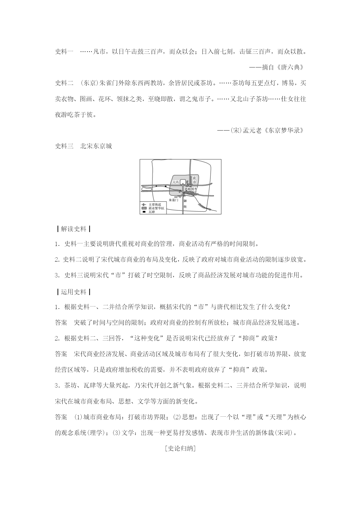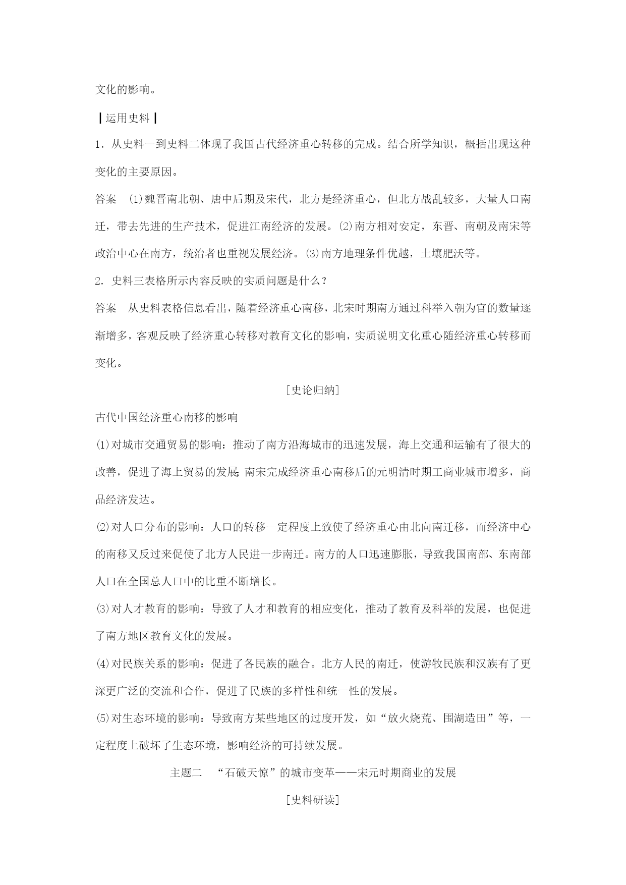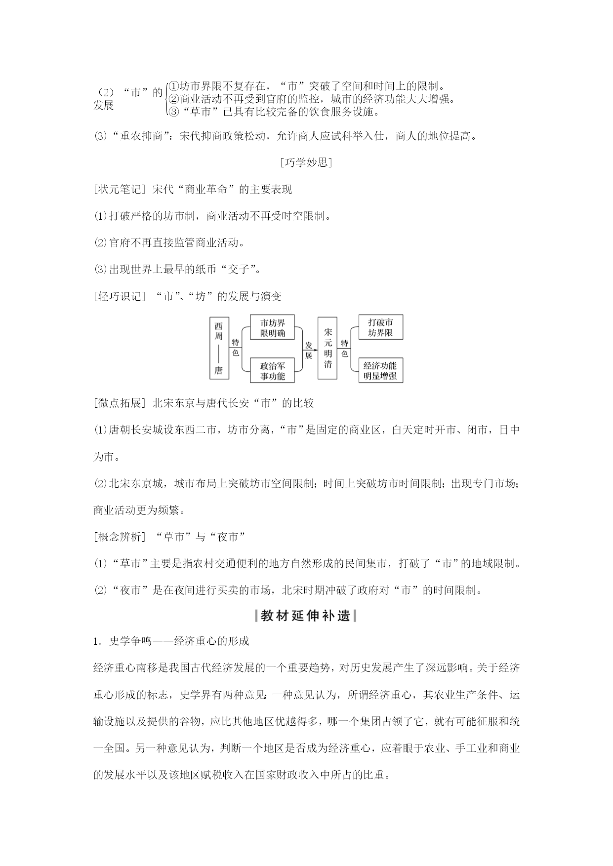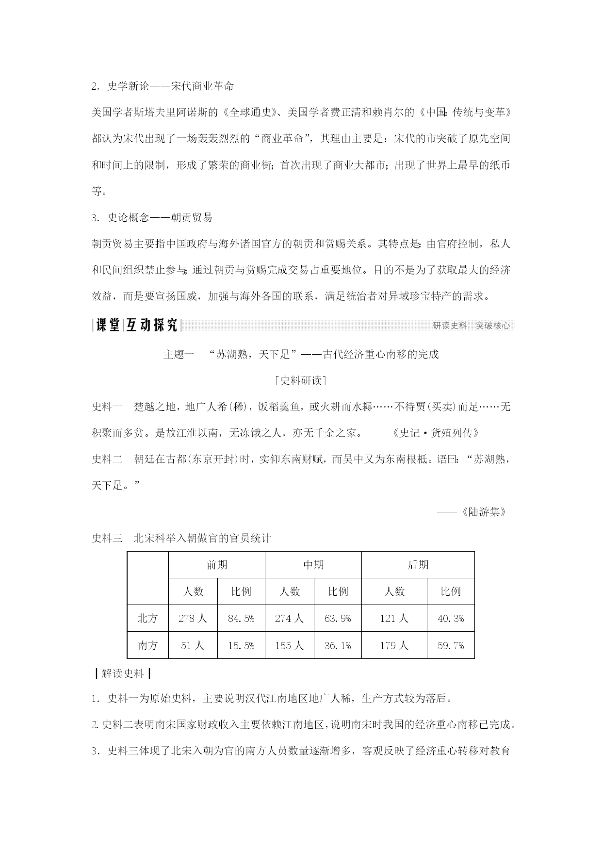 课时2宋元时期的农耕经济 宋元时期的经济:(1)农耕技术的进步与经济的繁荣。(2)手工业的进步。(3)商业发展与城市商品经济的繁荣。(4)“重农抑商”政策。 [主干梳理] 考点宋元时期的农耕经济 1.农业的发展 (1)生产技术:宋代以后,江南地区形成一年两熟制或一年三熟制。占城稻的引种,提高了水稻的产量。 (2)土地制度:宋代不抑制土地兼并,租佃经营成为仅次于自耕农形式的经营方式。 (3)灌溉工具:宋代出现利用水力为动力的水转翻车。 (4)重心南移:南宋时期完成,南方成为全国的经济中心。 2.手工业的进步 (1)纺织业eq\b\lc\{(\a\vs4\al\co1(①宋代:棉花种植普及,棉纺织业成为新的手工业部门。,②元代:黄道婆全面革新内地落后的棉纺织技术,发明了脚踏三,锭纺车,促进了棉纺织业的发展。松江在元代成为全国的棉纺织,业中心。)) (2)冶金业eq\b\lc\{(\a\vs4\al\co1(①北宋时期以煤作为燃料冶铁已相当普遍,钢铁的硬度和质,量大大提高。,②南宋末,开始用焦炭冶铁。)) (3)陶瓷业eq\b\lc\{(\a\vs4\al\co1(①宋代制瓷业兴盛,景德镇成为“瓷都”,全国出现了各具地方,特色的五大名窑。,②宋代,瓷器成为中国经海路外销的重要商品,“海上丝绸之路”,也被称为“瓷路”。,③元代开始生产彩瓷。)) 3.商业的繁荣 eq\a\vs4\al((1)表现)eq\b\lc\{(\a\vs4\al\co1(①集镇、夜市兴盛。,②北宋时出现世界上最早的纸币“交子”,元代更广泛流通纸币。,商业发展步入新的高峰期。,③海外商运发展迅速,出现了许多大港口,海外贸易税成为,国家财政收入的重要来源。)) eq\a\vs4\al((2)“市”的,发展)eq\b\lc\{(\a\vs4\al\co1(①坊市界限不复存在,“市”突破了空间和时间上的限制。,②商业活动不再受到官府的监控,城市的经济功能大大增强。,③“草市”已具有比较完备的饮食服务设施。)) (3)“重农抑商”:宋代抑商政策松动,允许商人应试科举入仕,商人的地位提高。 [巧学妙思] [状元笔记]宋代“商业革命”的主要表现 (1)打破严格的坊市制,商业活动不再受时空限制。 (2)官府不再直接监管商业活动。 (3)出现世界上最早的纸币“交子”。 [轻巧识记]“市”、“坊”的发展与演变 [微点拓展]北宋东京与唐代长安“市”的比较 (1)唐朝长安城设东西二市,坊市分离,“市”是固定的商业区,白天定时开市、闭市,日中为市。 (2)北宋东京城,城市布局上突破坊市空间限制;时间上突破坊市时间限制;出现专门市场;商业活动更为频繁。 [概念辨析]“草市”与“夜市” (1)“草市”主要是指农村交通便利的地方自然形成的民间集市,打破了“市”的地域限制。 (2)“夜市”是在夜间进行买卖的市场,北宋时期冲破了政府对“市”的时间限制。 1.史学争鸣——经济重心的形成 经济重心南移是我国古代经济发展的一个重要趋势,对历史发展产生了深远影响。关于经济重心形成的标志,史学界有两种意见:一种意见认为,所谓经济重心,其农业生产条件、运输设施以及提供的谷物,应比其他地区优越得多,哪一个集团占领了它,就有可能征服和统一全国。另一种意见认为,判断一个地区是否成为经济重心,应着眼于农业、手工业和商业的发展水平以及该地区赋税收入在国家财政收入中所占的比重。 2.史学新论——宋代商业革命 美国学者斯塔夫里阿诺斯的《全球通史》、美国学者费正清和赖肖尔的《中国:传统与变革》都认为宋代出现了一场轰轰烈烈的“商业革命”,其理由主要是:宋代的市突破了原先空间和时间上的限制,形成了繁荣的商业街;首次出现了商业大都市;出现了世界上最早的纸币等。 3.史论概念——朝贡贸易 朝贡贸易主要指中国政府与海外诸国官方的朝贡和赏赐关系。其特点是:由官府控制,私人和民间组织禁止参与;通过朝贡与赏赐完成交易占重要地位。目的不是为了获取最大的经济效益,而是要宣扬国威,加强与海外各国的联系,满足统治者对异域珍宝特产的需求。 主题一“苏湖熟,天下足”——古代经济重心南移的完成 [史料研读] 史料一楚越之地,地广人希(稀),饭稻羹鱼,或火耕而水耨……不待贾(买卖)而足……无积聚而多贫。是故江淮以南,无冻饿之人,亦无千金之家。——《史记·货殖列传》 史料二朝廷在古都(东京开封)时,实仰东南财赋,而吴中又为东南根柢。语曰:“苏湖熟,天下足。” ——《陆游集》 史料三北宋科举入朝做官的官员统计 前期中期后期人数比例人数比例人数比例北方278人84.5%274人63.9%121人40.3%南方51人15.5%155人36.1%179人59.7%eq\a\vs4\al(┃解读史料┃) 1.史