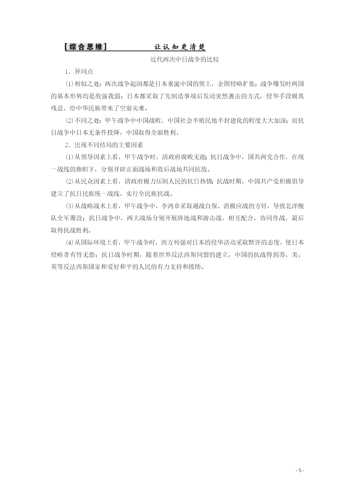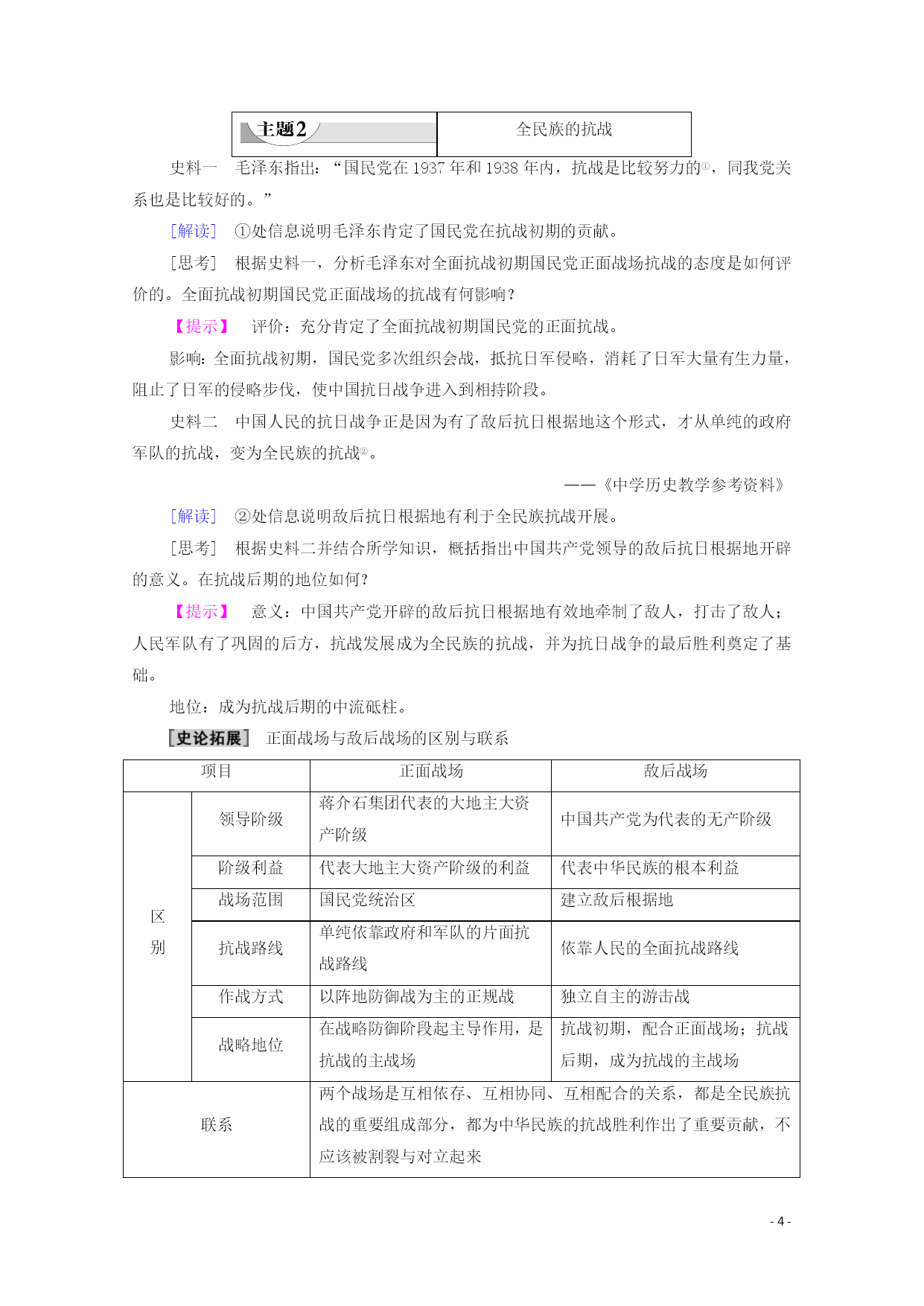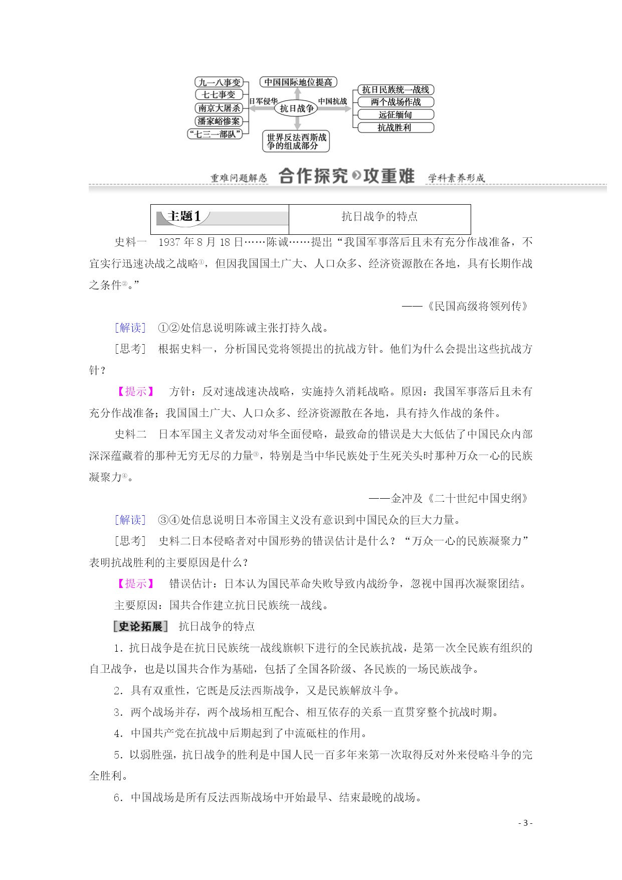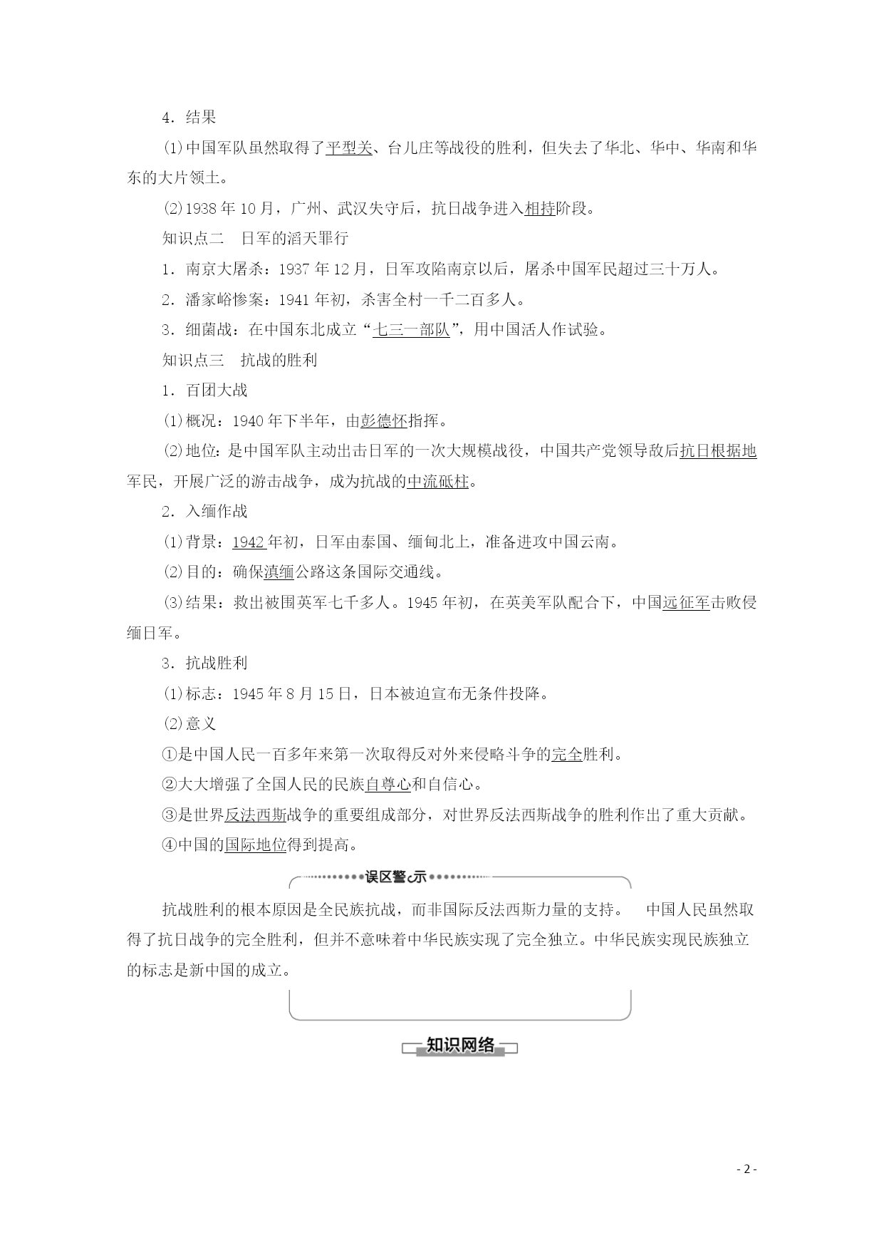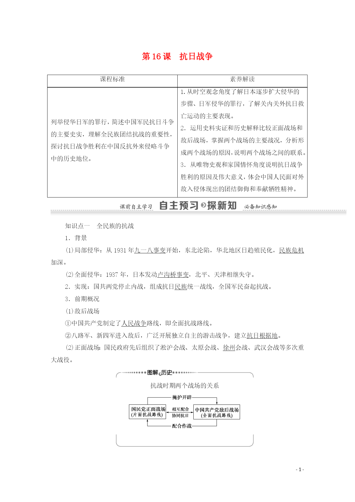 PAGE-8- 第16课抗日战争 课程标准素养解读列举侵华日军的罪行,简述中国军民抗日斗争的主要史实,理解全民族团结抗战的重要性,探讨抗日战争胜利在中国反抗外来侵略斗争中的历史地位。1.从时空观念角度了解日本逐步扩大侵华的步骤、日军侵华的罪行,了解关内关外抗日救亡运动的主要表现。 2.运用史料实证和历史解释比较正面战场和敌后战场,掌握两个战场的主要战况,分析形成两个战场的原因,说明两个战场之间的联系。 3.从唯物史观和家国情怀角度说明抗日战争胜利的原因及伟大意义,体会中国人民面对外敌入侵体现出的团结御侮和奉献牺牲精神。 知识点一全民族的抗战 1.背景 (1)局部侵华:从1931年九一八事变开始,东北沦陷,华北地区日趋殖民化,民族危机加深。 (2)全面侵华:1937年,日本发动卢沟桥事变,北平、天津相继失守。 2.实现:国共两党停止内战,组成抗日民族统一战线,全国军民奋起抗战。 3.前期概况 (1)敌后战场 ①中国共产党制定了人民战争路线,即全面抗战路线。 ②八路军、新四军进入敌后,广泛开展独立自主的游击战争,建立抗日根据地。 (2)正面战场:国民政府先后组织了淞沪会战、太原会战、徐州会战、武汉会战等多次重大战役。 抗战时期两个战场的关系 4.结果 (1)中国军队虽然取得了平型关、台儿庄等战役的胜利,但失去了华北、华中、华南和华东的大片领土。 (2)1938年10月,广州、武汉失守后,抗日战争进入相持阶段。 知识点二日军的滔天罪行 1.南京大屠杀:1937年12月,日军攻陷南京以后,屠杀中国军民超过三十万人。 2.潘家峪惨案:1941年初,杀害全村一千二百多人。 3.细菌战:在中国东北成立“七三一部队”,用中国活人作试验。 知识点三抗战的胜利 1.百团大战 (1)概况:1940年下半年,由彭德怀指挥。 (2)地位:是中国军队主动出击日军的一次大规模战役,中国共产党领导敌后抗日根据地军民,开展广泛的游击战争,成为抗战的中流砥柱。 2.入缅作战 (1)背景:1942年初,日军由泰国、缅甸北上,准备进攻中国云南。 (2)目的:确保滇缅公路这条国际交通线。 (3)结果:救出被围英军七千多人。1945年初,在英美军队配合下,中国远征军击败侵缅日军。 3.抗战胜利 (1)标志:1945年8月15日,日本被迫宣布无条件投降。 (2)意义 ①是中国人民一百多年来第一次取得反对外来侵略斗争的完全胜利。 ②大大增强了全国人民的民族自尊心和自信心。 ③是世界反法西斯战争的重要组成部分,对世界反法西斯战争的胜利作出了重大贡献。 ④中国的国际地位得到提高。 抗战胜利的根本原因是全民族抗战,而非国际反法西斯力量的支持。中国人民虽然取得了抗日战争的完全胜利,但并不意味着中华民族实现了完全独立。中华民族实现民族独立的标志是新中国的成立。 抗日战争的特点史料一1937年8月18日……陈诚……提出“我国军事落后且未有充分作战准备,不宜实行迅速决战之战略①,但因我国国土广大、人口众多、经济资源散在各地,具有长期作战之条件②。” ——《民国高级将领列传》 [解读]①②处信息说明陈诚主张打持久战。 [思考]根据史料一,分析国民党将领提出的抗战方针。他们为什么会提出这些抗战方针? 【提示】方针:反对速战速决战略,实施持久消耗战略。原因:我国军事落后且未有充分作战准备;我国国土广大、人口众多、经济资源散在各地,具有持久作战的条件。 史料二日本军国主义者发动对华全面侵略,最致命的错误是大大低估了中国民众内部深深蕴藏着的那种无穷无尽的力量③,特别是当中华民族处于生死关头时那种万众一心的民族凝聚力④。 ——金冲及《二十世纪中国史纲》 [解读]③④处信息说明日本帝国主义没有意识到中国民众的巨大力量。 [思考]史料二日本侵略者对中国形势的错误估计是什么?“万众一心的民族凝聚力”表明抗战胜利的主要原因是什么? 【提示】错误估计:日本认为国民革命失败导致内战纷争,忽视中国再次凝聚团结。 主要原因:国共合作建立抗日民族统一战线。 抗日战争的特点 1.抗日战争是在抗日民族统一战线旗帜下进行的全民族抗战,是第一次全民族有组织的自卫战争,也是以国共合作为基础,包括了全国各阶级、各民族的一场民族战争。 2.具有双重性,它既是反法西斯战争,又是民族解放斗争。 3.两个战场并存,两个战场相互配合、相互依存的关系一直贯穿整个抗战时期。 4.中国共产党在抗战中后期起到了中流砥柱的作用。 5.以弱胜强,抗日战争的胜利是中国人民一百多年来第一次取得反对外来侵略斗争的完全胜利。 6.中国战场是所有反法西斯战场中开始最早、结束最晚的战场。 全民族的抗战史料一毛泽东指出:“国民党在1937年和1938年内,抗战是比较努力的①,同我党关系也是比较好的。” [解读]①处信息说明毛泽东肯定