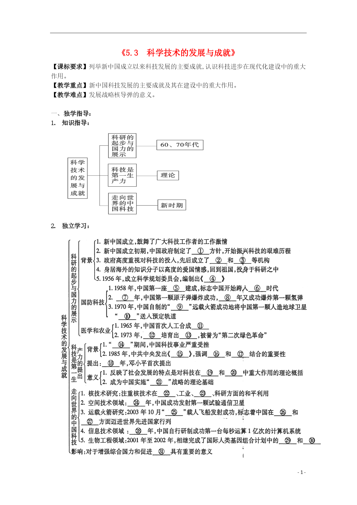 PAGE-2- 《5.3科学技术的发展与成就》 【课标要求】列举新中国成立以来科技发展的主要成就,认识科技进步在现代化建设中的重大作用。 【教学重点】新中国科技发展的主要成就及其在建设中的重大作用。 【教学难点】发展战略核导弹的意义。 一、独学指导: 知识指导: 独立学习: 3.抛砖引玉: 【抛出问题】【引出问题】1).20世纪50~70年代中国国防领域成就重大的原因?2).20世纪80年代以前和以后中国发展高科技侧重点不同。3).科技进步在现代化建设中的重大作用。 PAGE-5- 二、互学引导: 生生互学:师生导学:eq\o\ac(○,1)-eq\o\ac(○,36): 1).20世纪50~70年代中国国防领域成就重大的原因? 2).20世纪80年代以前和以后中国发展高科技侧重点不同。 3).科技进步在现代化建设中的重大作用。 三、活学辅导: 1、举一反三: (1).十七大报告提出“中国将设国家荣誉制度”的消息引发了各方的热烈讨论。新浪网就“谁有资格获得国家荣誉”进行过调查,结果表明:在包括文化、体育、科技、企业和政界人士的10人名单中,支持率名列前茅的是科学家袁隆平,袁隆平之所以获得广大网友的认可,主要原因是() A.他是联合国粮农组织首席顾问,世界影响大 B.推广蔬菜大棚技术,解决了菜篮子问题 C.培育出杂交水稻,大大提高了中国的水稻产量 D.主持“两弹一星”工作,成就巨大 (2).俄国和苏联科学家,现代航天学和火箭理论的奠基人齐奥尔科夫斯基说过:“地球是人类的摇篮,但没有人能够永远留在摇篮里。”新中国科学事业发展历程中符合上述说法的成就起步于() A.第一颗人造地球卫星发射成功B.第一枚导弹发射成功 C.第一颗原子弹试爆成功D.“神舟”五号宇宙飞船在太空遨游 (3).“这表明中国已成为21世纪世界舞台上科技与经济的强大参与者。”下列史实能说明这一观点的是() A.1964年我国成功爆炸第一颗原子弹 B.1970年中国成功发射第一颗人造卫星 C.袁隆平成功培育出“超级杂交水稻”引起“第二次绿色革命” D.2003年10月“神州”5号宇宙飞船发射成功 (4).我国虽然与前两次科技革命擦肩而过,但是十一届三中全会后,积极抓住机遇,参与新的科技革命,除去同步实验通讯卫星发射成功外,我国在空间技术方面取得的成就还有() A.第一颗原子弹爆炸成功 B.“神舟五号”、“神舟六号”发射成功 C.“东方红1号”人造地球卫星发射成功 D.银河Ⅰ型巨型计算机研制成功 (5).中国农民说,吃饭靠“两平”,一靠邓小平,二靠袁隆平。这是因为() A.邓小平制定了改革开放的政策,袁隆平研制了“东方魔稻” B.邓小平制定了拨乱反正的政策,袁隆平研制了新型复合肥 C.邓小平制定了改革开放的政策,袁隆平研制了新型复合肥 D.邓小平制定了拨乱反正的政策,袁隆平研制了“东方魔稻” 2、疑难解惑: 阅读下列材料,回答问题: 材料一 材料二西班牙《世界报》有一则对中国航天技术的评论:“中国龙已经飞起来了,而且飞得很高,它使整个中国充满了自豪。” 请回答: 根据材料一、二说明中国取得了什么航天成就。 (2)20世纪50~60年代,苏联人和美国人先后进入太空,而中国人却在这方面相对滞后,结合中国的史实说明原因。 (3)试分析中国取得一系列航天成就的原因和意义。 答案 1.独立学习:①自力更生②中国科学院③国家科学技术委员会④十二年科技发展远景规划⑤实验性原子反应堆⑥原子能⑦1964⑧1967⑨长征一号⑩东方红一号eq\o\ac(○,11)结晶牛胰岛素eq\o\ac(○,12)袁隆平eq\o\ac(○,13)籼型杂交水稻eq\o\ac(○,14)文革eq\o\ac(○,15)关于科学技术体制改革的决定eq\o\ac(○,16)经济建设eq\o\ac(○,17)科学技术eq\o\ac(○,18)1980eq\o\ac(○,19)当代生产力eq\o\ac(○,20)社会经济发展eq\o\ac(○,21)科教兴国eq\o\ac(○,22)农业eq\o\ac(○,23)医疗卫生eq\o\ac(○,24)1984eq\o\ac(○,25)神舟五号eq\o\ac(○,26)航天技术eq\o\ac(○,27)运载火箭eq\o\ac(○,28)1983eq\o\ac(○,29)基因测序eq\o\ac(○,30)水稻基因组工作框架程序图eq\o\ac(○,31)社会主义现代化建设 2.抛出问题: 1).20世纪50~70年代中国国防领域成就重大的原因 (1)新中国取得了