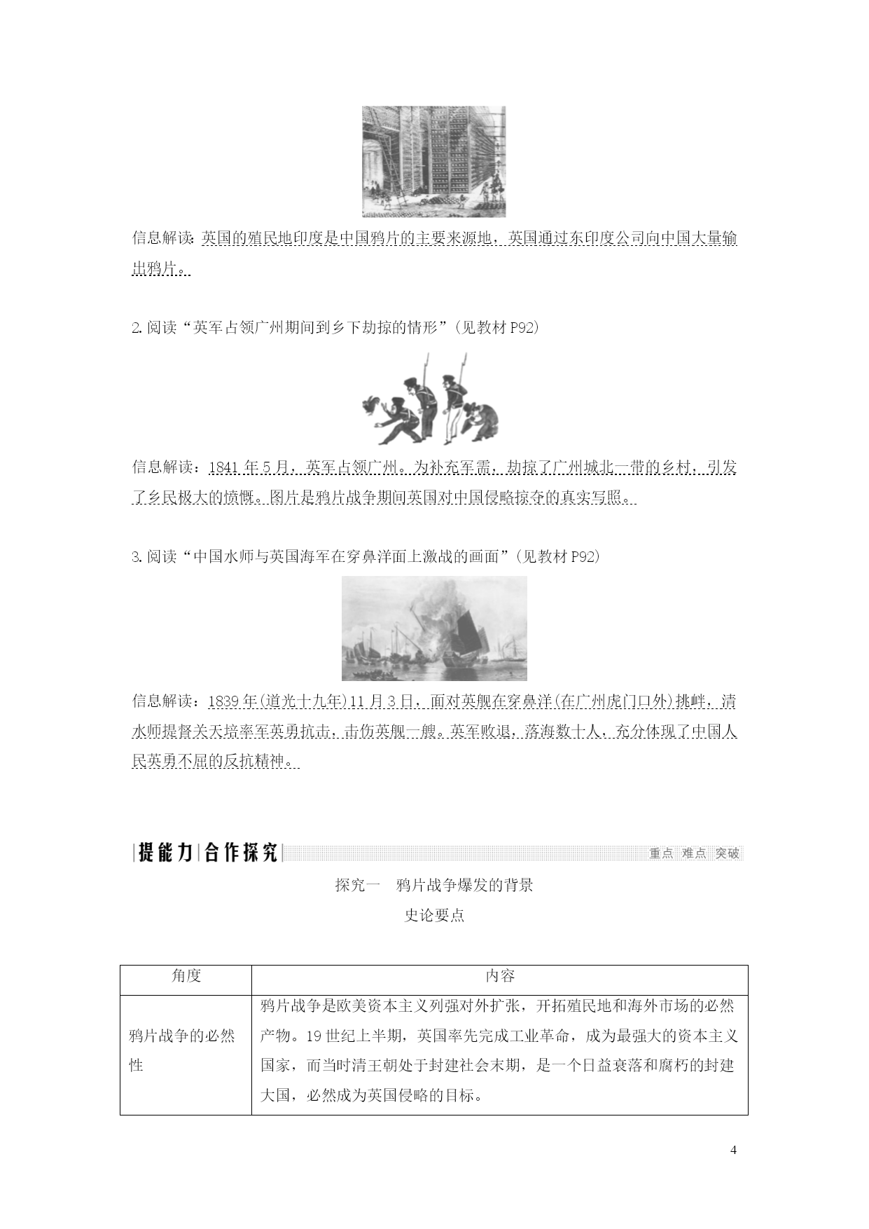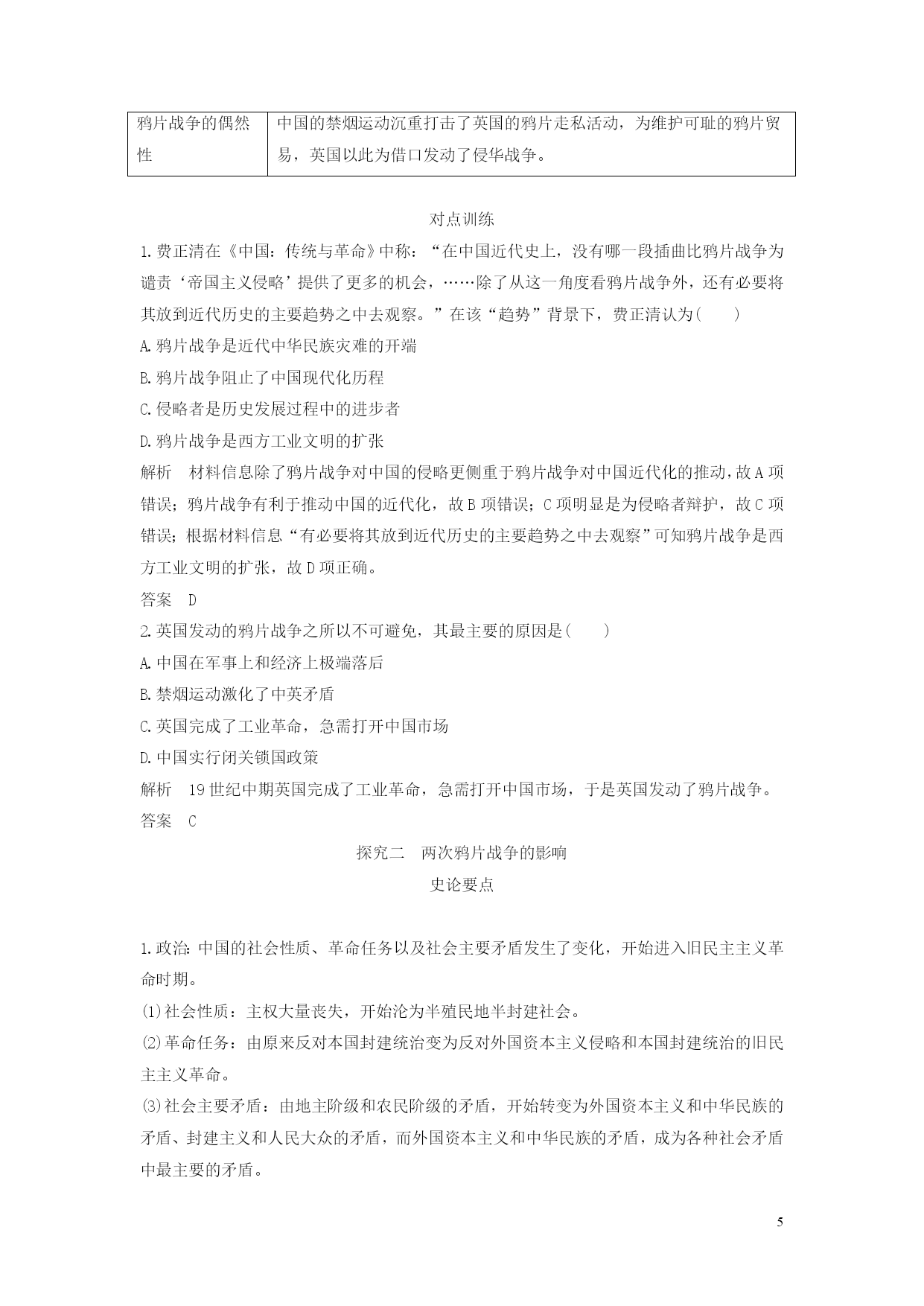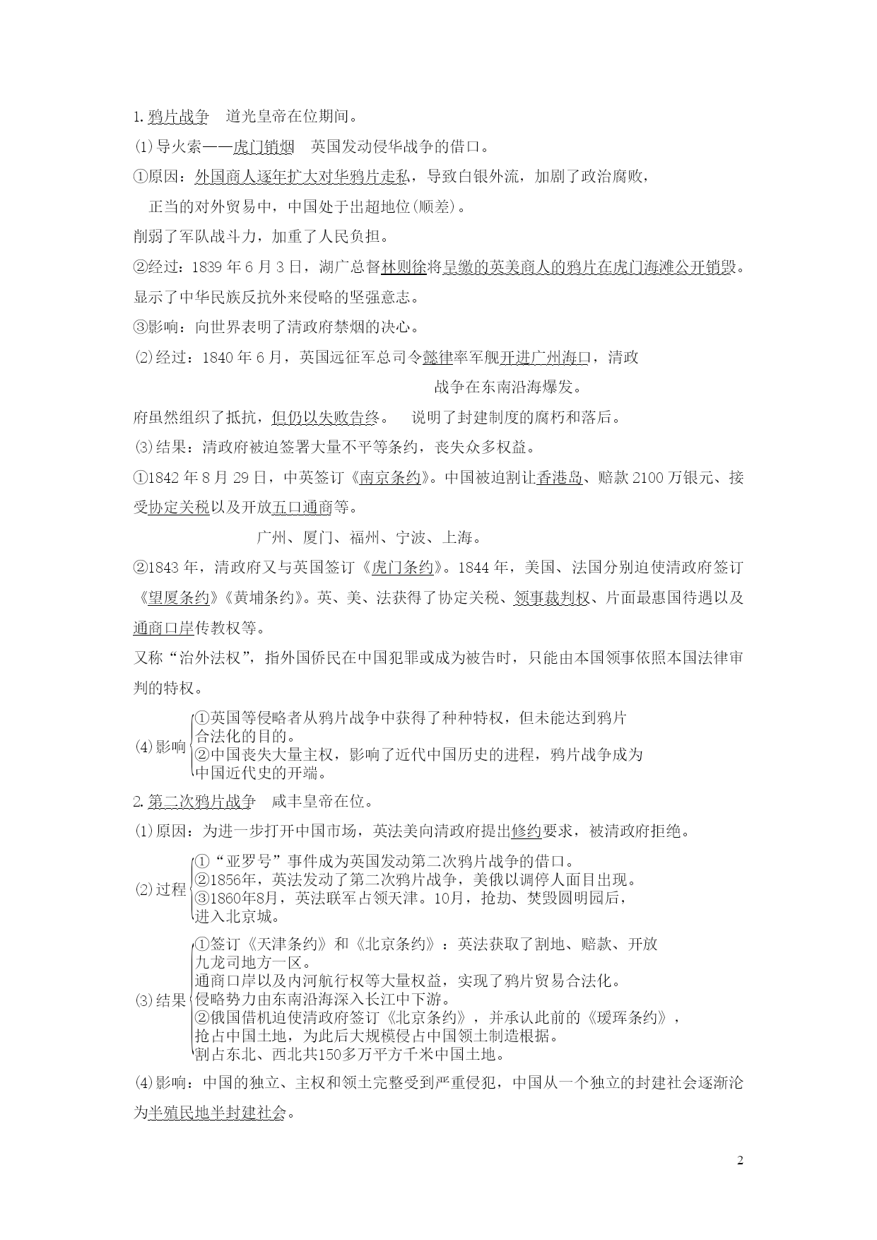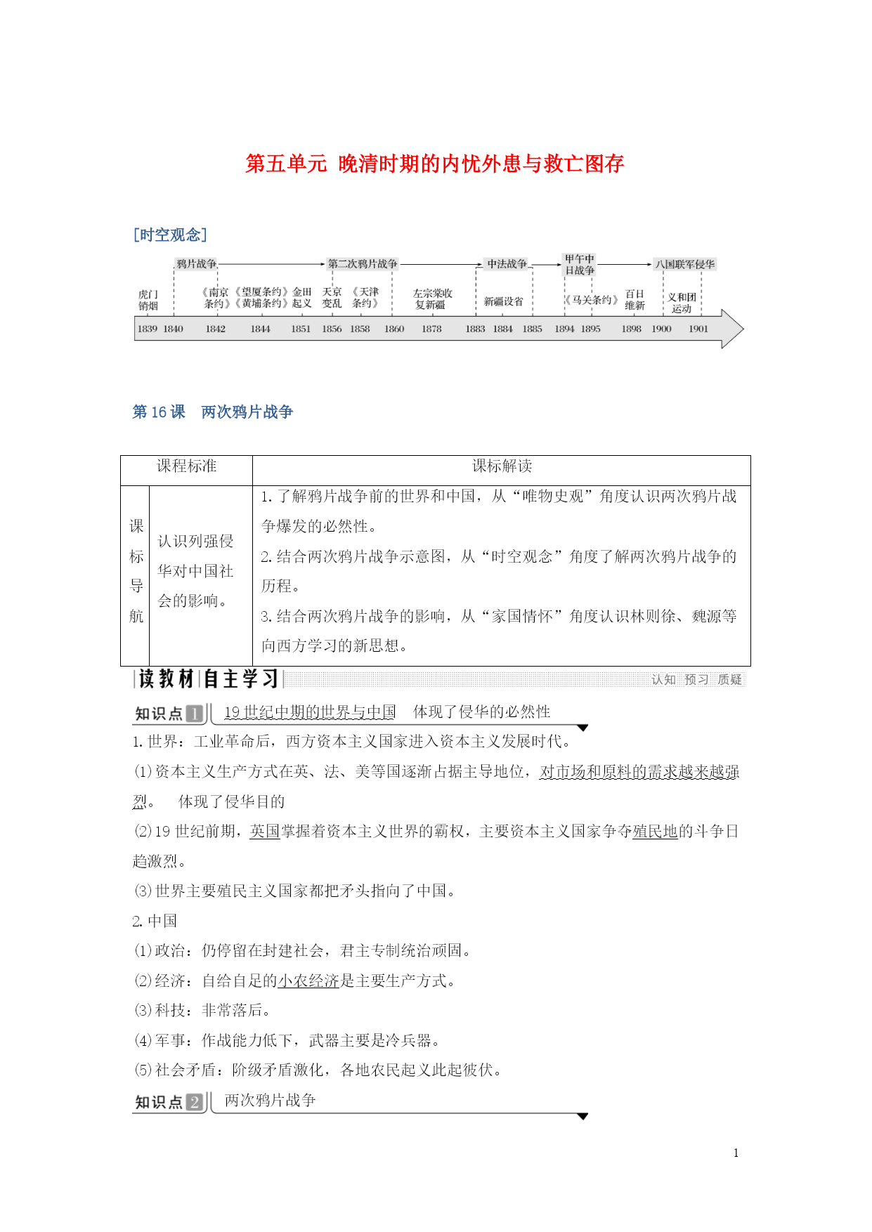 第五单元晚清时期的内忧外患与救亡图存 [时空观念] 第16课两次鸦片战争 课程标准课标解读课标导航认识列强侵华对中国社会的影响。1.了解鸦片战争前的世界和中国,从“唯物史观”角度认识两次鸦片战争爆发的必然性。 2.结合两次鸦片战争示意图,从“时空观念”角度了解两次鸦片战争的历程。 3.结合两次鸦片战争的影响,从“家国情怀”角度认识林则徐、魏源等向西方学习的新思想。 19世纪中期的世界与中国体现了侵华的必然性 1.世界:工业革命后,西方资本主义国家进入资本主义发展时代。 (1)资本主义生产方式在英、法、美等国逐渐占据主导地位,对市场和原料的需求越来越强烈。体现了侵华目的 (2)19世纪前期,英国掌握着资本主义世界的霸权,主要资本主义国家争夺殖民地的斗争日趋激烈。 (3)世界主要殖民主义国家都把矛头指向了中国。 2.中国 (1)政治:仍停留在封建社会,君主专制统治顽固。 (2)经济:自给自足的小农经济是主要生产方式。 (3)科技:非常落后。 (4)军事:作战能力低下,武器主要是冷兵器。 (5)社会矛盾:阶级矛盾激化,各地农民起义此起彼伏。 两次鸦片战争 1.鸦片战争道光皇帝在位期间。 (1)导火索——虎门销烟英国发动侵华战争的借口。 ①原因:外国商人逐年扩大对华鸦片走私,导致白银外流,加剧了政治腐败, 正当的对外贸易中,中国处于出超地位(顺差)。 削弱了军队战斗力,加重了人民负担。 ②经过:1839年6月3日,湖广总督林则徐将呈缴的英美商人的鸦片在虎门海滩公开销毁。显示了中华民族反抗外来侵略的坚强意志。 ③影响:向世界表明了清政府禁烟的决心。 (2)经过:1840年6月,英国远征军总司令懿律率军舰开进广州海口,清政 战争在东南沿海爆发。 府虽然组织了抵抗,但仍以失败告终。说明了封建制度的腐朽和落后。 (3)结果:清政府被迫签署大量不平等条约,丧失众多权益。 ①1842年8月29日,中英签订《南京条约》。中国被迫割让香港岛、赔款2100万银元、接受协定关税以及开放五口通商等。 广州、厦门、福州、宁波、上海。 ②1843年,清政府又与英国签订《虎门条约》。1844年,美国、法国分别迫使清政府签订《望厦条约》《黄埔条约》。英、美、法获得了协定关税、领事裁判权、片面最惠国待遇以及通商口岸传教权等。 又称“治外法权”,指外国侨民在中国犯罪或成为被告时,只能由本国领事依照本国法律审判的特权。 (4)影响eq\b\lc\{(\a\vs4\al\co1(①英国等侵略者从鸦片战争中获得了种种特权,但未能达到鸦片,合法化的目的。,②中国丧失大量主权,影响了近代中国历史的进程,鸦片战争成为,中国近代史的开端。)) 2.第二次鸦片战争咸丰皇帝在位。 (1)原因:为进一步打开中国市场,英法美向清政府提出修约要求,被清政府拒绝。 (2)过程eq\b\lc\{(\a\vs4\al\co1(①“亚罗号”事件成为英国发动第二次鸦片战争的借口。,②1856年,英法发动了第二次鸦片战争,美俄以调停人面目出现。,③1860年8月,英法联军占领天津。10月,抢劫、焚毁圆明园后,,进入北京城。)) (3)结果eq\b\lc\{(\a\vs4\al\co1(①签订《天津条约》和《北京条约》:英法获取了割地、赔款、开放,九龙司地方一区。,通商口岸以及内河航行权等大量权益,实现了鸦片贸易合法化。,侵略势力由东南沿海深入长江中下游。,②俄国借机迫使清政府签订《北京条约》,并承认此前的《瑷珲条约》,,抢占中国土地,为此后大规模侵占中国领土制造根据。,割占东北、西北共150多万平方千米中国土地。)) (4)影响:中国的独立、主权和领土完整受到严重侵犯,中国从一个独立的封建社会逐渐沦为半殖民地半封建社会。 丧失了部分国家主权,既保留封建因素又产生了资本主义因素。 开眼看世界 1.背景:《南京条约》签订后,道光皇帝仍不知道英国位于何方,反映了清朝统治阶级高层的封闭、愚昧与腐朽。 2.表现近代睁眼看世界的第一人 (1)林则徐:在广州开办译馆,收集有关西洋各国的消息情报和国际知识,汇译成《四洲志》等书稿,供对外交涉时参考。 (2)魏源:注意收集外国史地知识,在《四洲志》基础上编成《海国图志》,提出“师夷长技以制夷”思想。 (3)徐继畬:撰成《瀛寰志略》,系统介绍了当时世界上近80个国家和地区的地理位置、历史变迁、经济文化等,尤重对欧美各国的考察和介绍,是中国近代第一部世界地理著作。 3.影响:初步提出了向西方学习以求自强的主张。 林、魏的目的是维护清政府的封建统治,并不是要改变社会制度。 阅读教材·想一想 1.阅读教材P91“思考点”:分析鸦片战争前中国的社会状况,思考中国在当时国际格局中的处境。 提示:19世纪中期英、法、美等资本主义国家相继完成了工业革命,