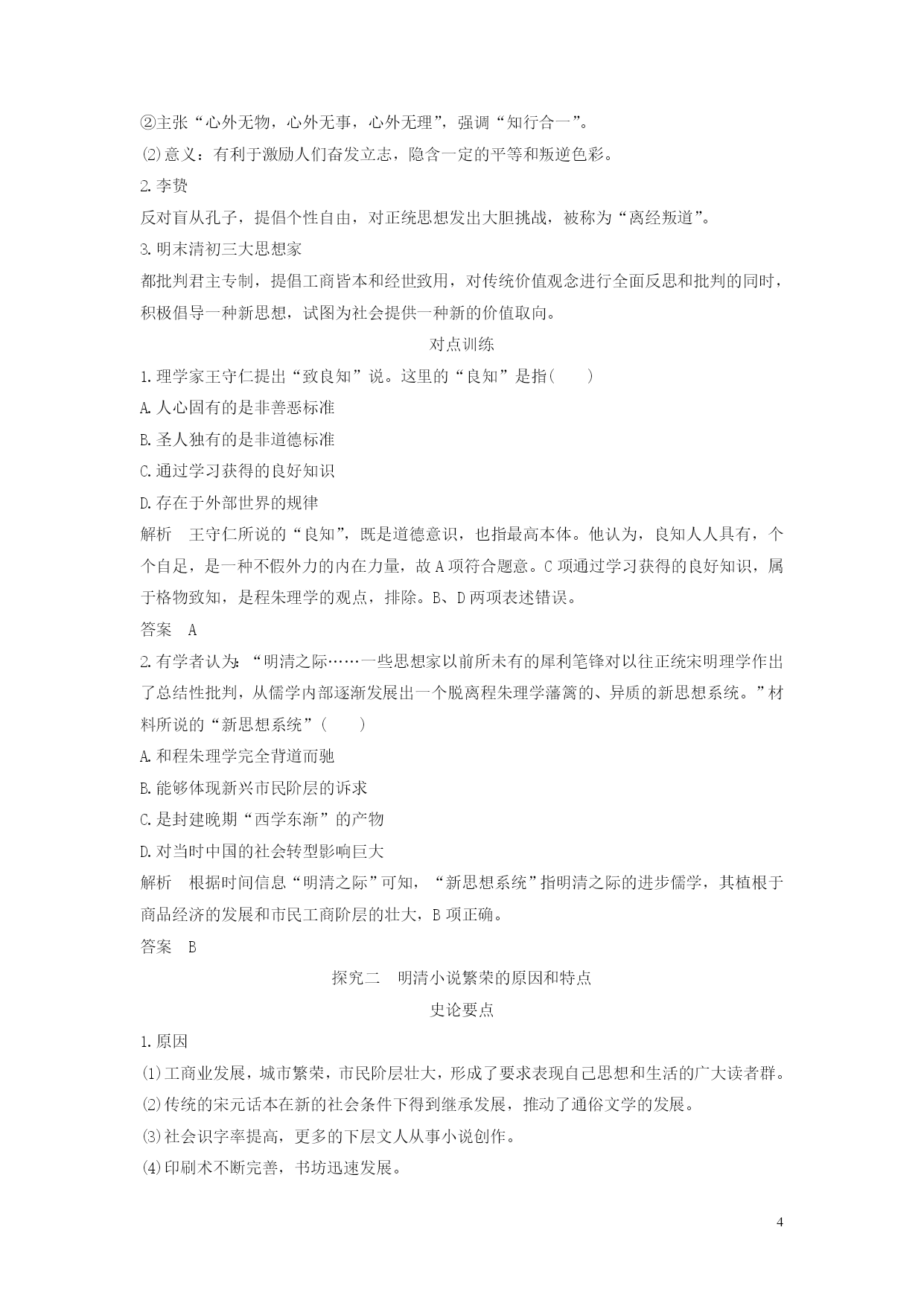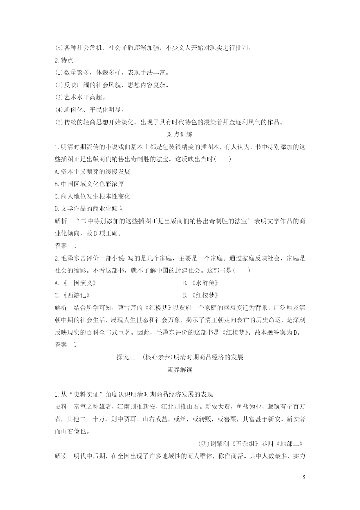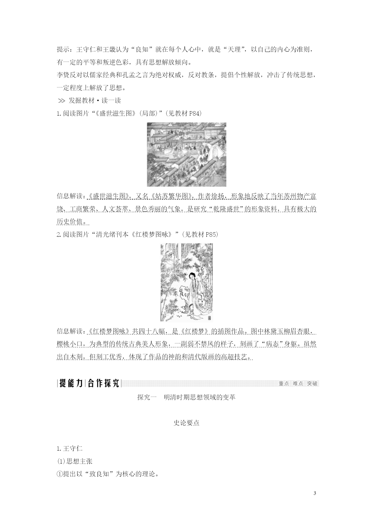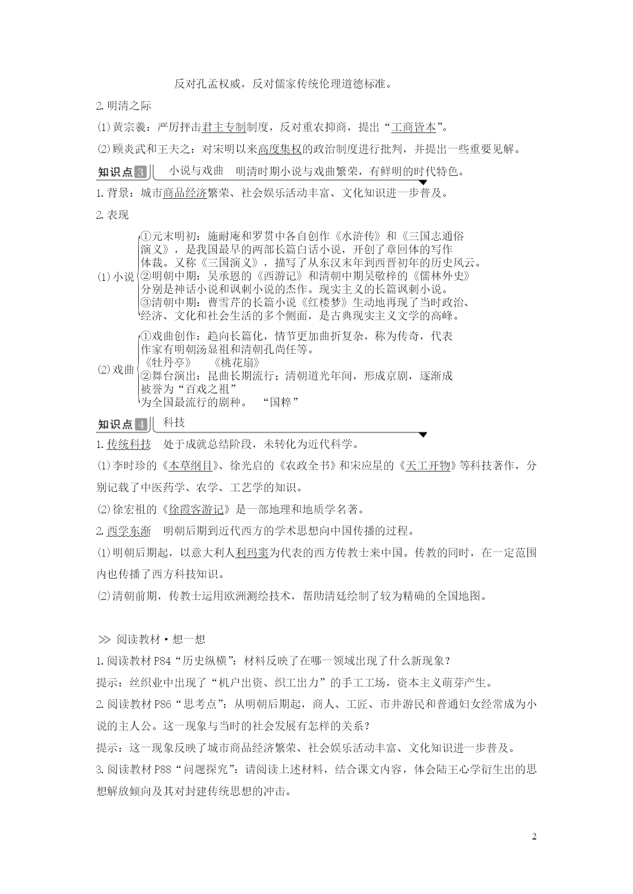 第15课明至清中叶的经济与文化 课程标准课标解读课标导航了解明清时期社会经济、思想文化的重要变化。1.结合明清时期农业、手工业、商业的发展及当时的世界形势,从“唯物史观”角度认识明清经济的发展与局限。 2.结合陆王心学和明末清初的进步思想,从“历史解释”角度认识明清思想领域的新变化。 3.结合明清时期的科技、小说与戏曲成就,从“家国情怀”角度认识中国传统文化的辉煌,增加文化自信。 社会经济的发展与局限 1.社会经济发展 (1)农业eq\b\lc\{(\a\vs4\al\co1(①新的农作物品种输入中国,大幅提高了粮食总产量。,玉米、甘薯等,②江南等地区农业的多种经营日益兴盛,经济作物品种繁多,,种植广泛。出现区域化生产)) (2)手工业:明朝后期,在南方一些地区出现新的经营手段,即开设工场,使用自由雇佣劳动进行生产。这是资本主义生产关系的早期形态,又称资本主义萌芽。 (3)商业:进入新的繁荣期。 ①美洲等地的白银大量流入中国,促进了长途和大额贸易发展。 ②形成实力雄厚的商人群体,如徽商和晋商。商帮的代表 ③以经济功能为主的工商业市镇兴起,逐渐成为地区贸易网络的核心。 早期城市的主要功能是政治和军事。 2.社会局限 (1)经济:男耕女织、自给自足的传统小农经济占据压倒优势。 (2)政治:日益僵化的专制统治压制和阻碍社会的进步和转型。 eq\a\vs4\al(思想领域的变化)明中期出现提倡自由和反对专制的倾向。 1.明朝中后期 (1)程朱理学:获得官方尊崇后,逐渐失去活力。 (2)陆王心学eq\b\lc\{(\a\vs4\al\co1(①代表人物:王守仁。,②主张:以“致良知”为核心理论;“良知”就是“天理”,,往往私欲遮蔽,需要重新发现、扩充、实行,以达到圣贤境界。,③评价:强调主观能动性,激励人们奋发立志;以自己的,内心为准则,隐含一定的平等和叛逆色彩。)) (3)李贽:提倡个性自由,蔑视权威和教条,否定传统伦理道德标准。 反对孔孟权威,反对儒家传统伦理道德标准。 2.明清之际 (1)黄宗羲:严厉抨击君主专制制度,反对重农抑商,提出“工商皆本”。 (2)顾炎武和王夫之:对宋明以来高度集权的政治制度进行批判,并提出一些重要见解。 eq\a\vs4\al(小说与戏曲)明清时期小说与戏曲繁荣,有鲜明的时代特色。 1.背景:城市商品经济繁荣、社会娱乐活动丰富、文化知识进一步普及。 2.表现 (1)小说eq\b\lc\{(\a\vs4\al\co1(①元末明初:施耐庵和罗贯中各自创作《水浒传》和《三国志通俗,演义》,是我国最早的两部长篇白话小说,开创了章回体的写作,体裁。又称《三国演义》,描写了从东汉末年到西晋初年的历史风云。,②明朝中期:吴承恩的《西游记》和清朝中期吴敬梓的《儒林外史》,分别是神话小说和讽刺小说的杰作。现实主义的长篇讽刺小说。,③清朝中期:曹雪芹的长篇小说《红楼梦》生动地再现了当时政治、,经济、文化和社会生活的多个侧面,是古典现实主义文学的高峰。)) (2)戏曲eq\b\lc\{(\a\vs4\al\co1(①戏曲创作:趋向长篇化,情节更加曲折复杂,称为传奇,代表,作家有明朝汤显祖和清朝孔尚任等。,《牡丹亭》《桃花扇》,②舞台演出:昆曲长期流行;清朝道光年间,形成京剧,逐渐成,被誉为“百戏之祖”,为全国最流行的剧种。“国粹”)) 科技 1.传统科技处于成就总结阶段,未转化为近代科学。 (1)李时珍的《本草纲目》、徐光启的《农政全书》和宋应星的《天工开物》等科技著作,分别记载了中医药学、农学、工艺学的知识。 (2)徐宏祖的《徐霞客游记》是一部地理和地质学名著。 2.西学东渐明朝后期到近代西方的学术思想向中国传播的过程。 (1)明朝后期起,以意大利人利玛窦为代表的西方传教士来中国。传教的同时,在一定范围内也传播了西方科技知识。 (2)清朝前期,传教士运用欧洲测绘技术,帮助清廷绘制了较为精确的全国地图。 阅读教材·想一想 1.阅读教材P84“历史纵横”:材料反映了在哪一领域出现了什么新现象? 提示:丝织业中出现了“机户出资、织工出力”的手工工场,资本主义萌芽产生。 2.阅读教材P86“思考点”:从明朝后期起,商人、工匠、市井游民和普通妇女经常成为小说的主人公。这一现象与当时的社会发展有怎样的关系? 提示:这一现象反映了城市商品经济繁荣、社会娱乐活动丰富、文化知识进一步普及。 3.阅读教材P88“问题探究”:请阅读上述材料,结合课文内容,体会陆王心学衍生出的思想解放倾向及其对封建传统思想的冲击。 提示:王守仁和王畿认为“良知”就在每个人心中,就是“天理”,以自己的内心为准则,有一定的平等和叛逆色彩,具有思想解放倾向。 李贽反对以儒家经典和孔孟之言为绝对权威,反对教条,提倡个性