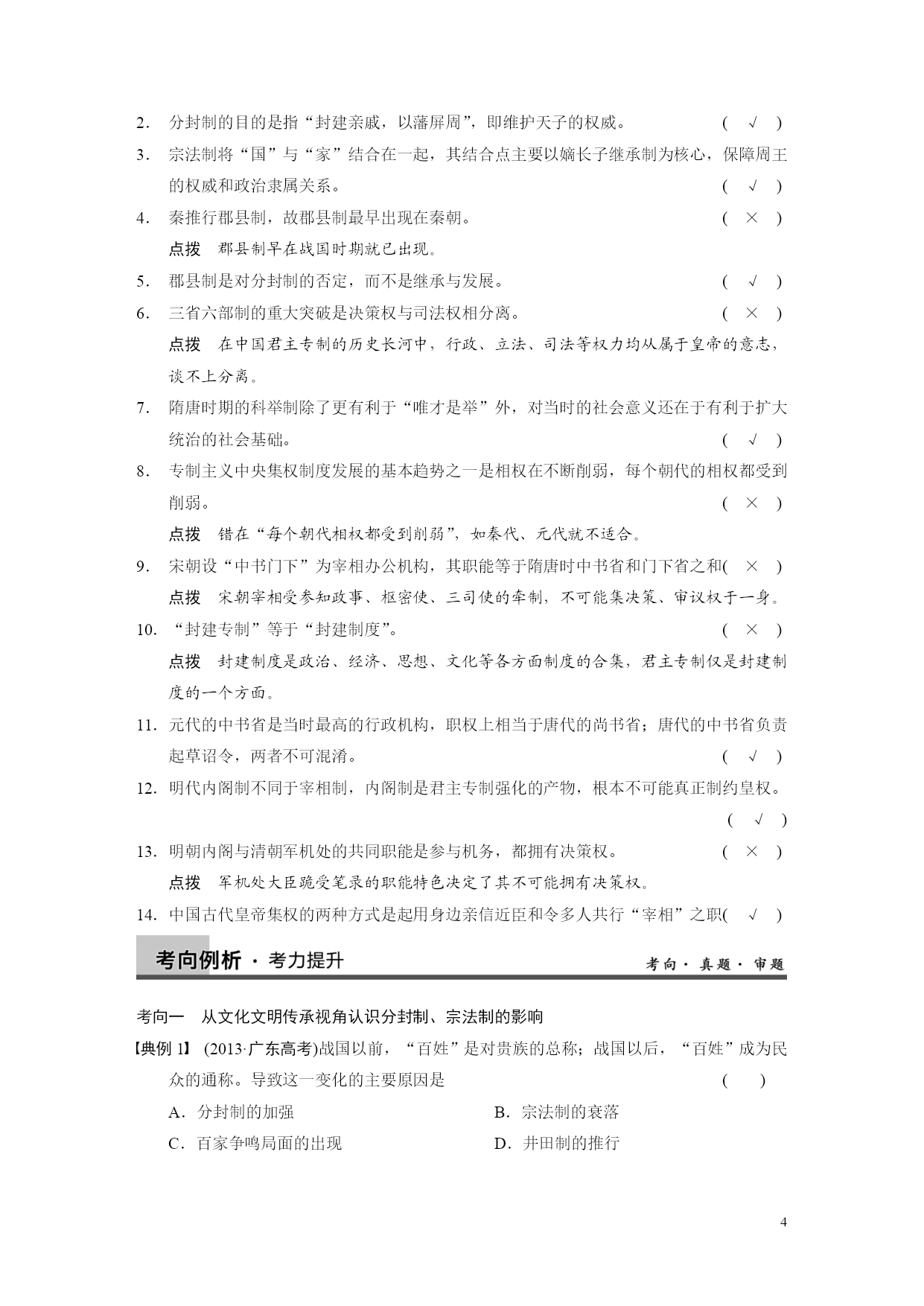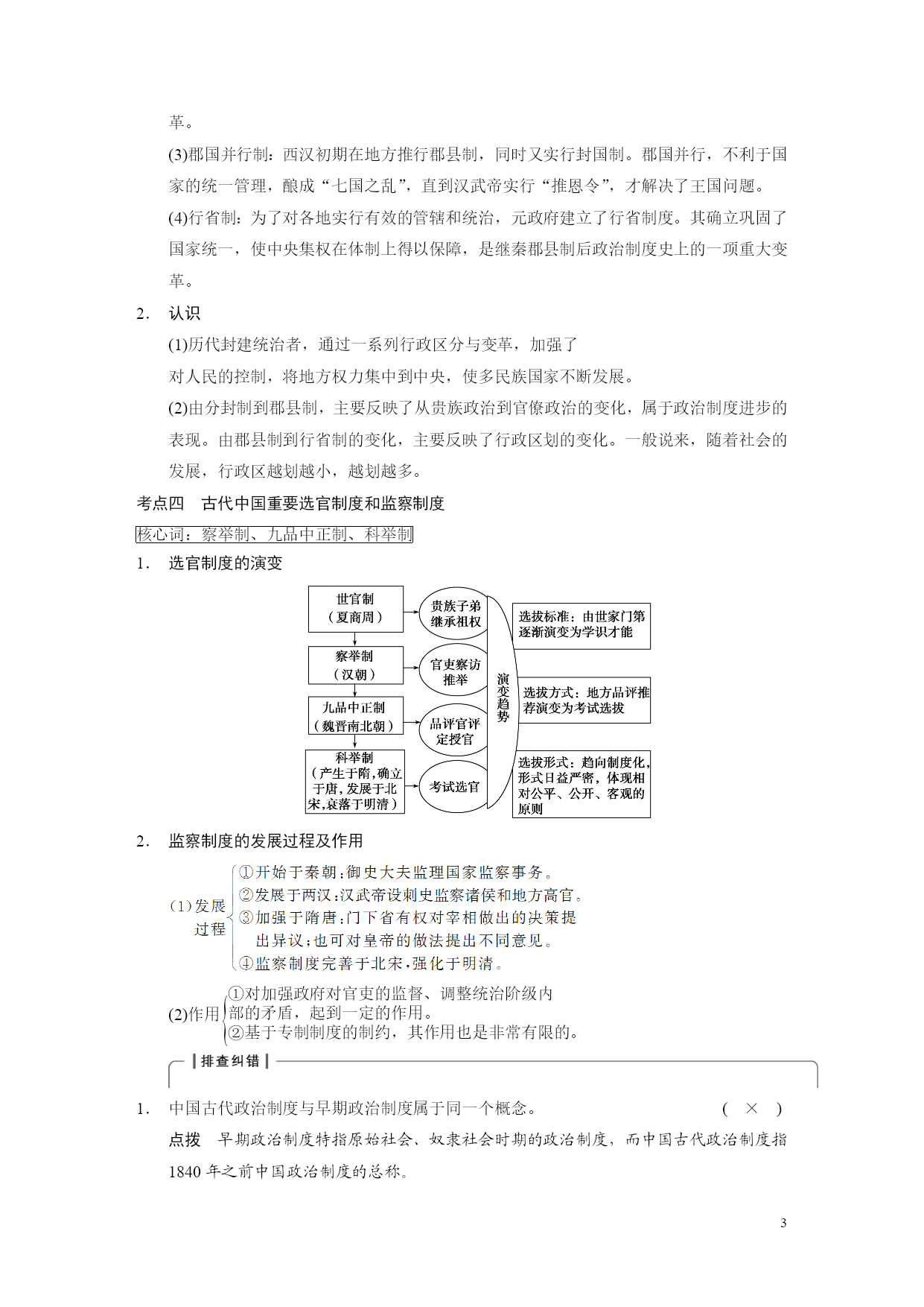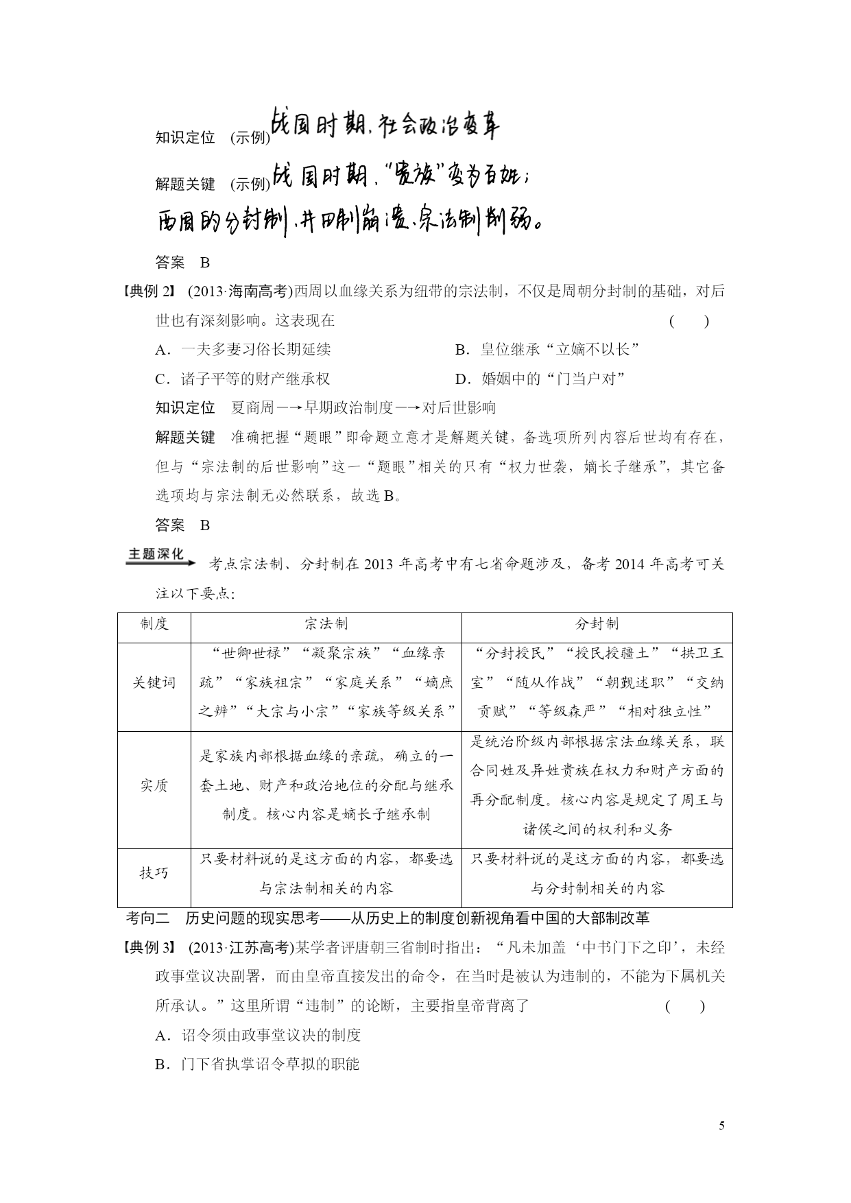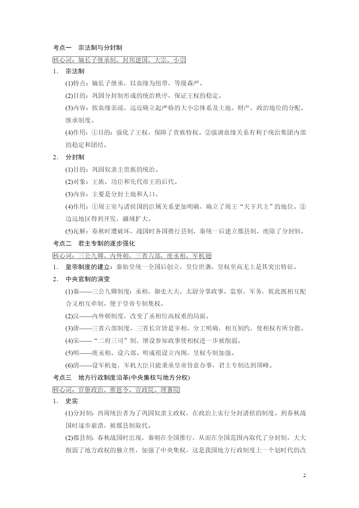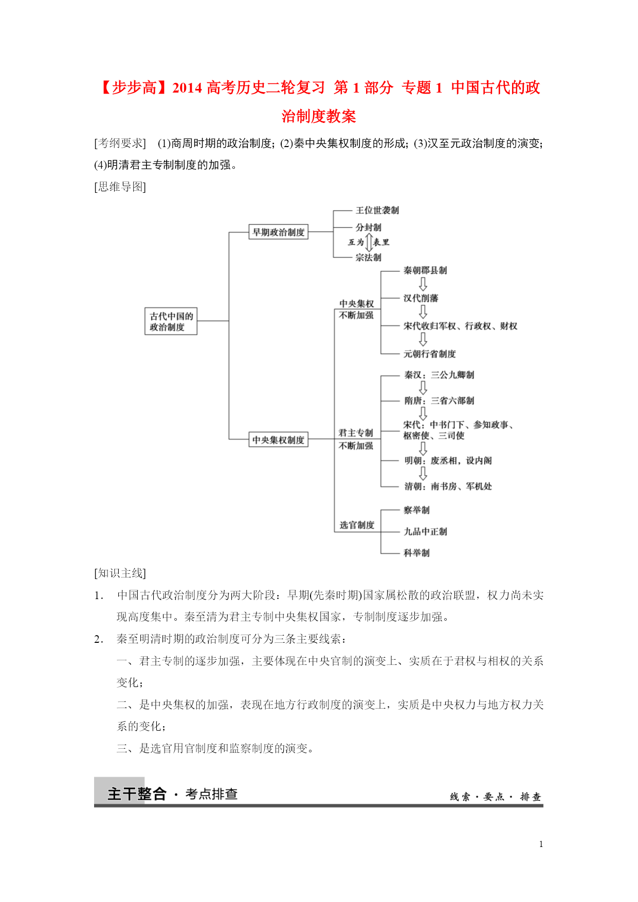 【步步高】2014高考历史二轮复习第1部分专题1中国古代的政治制度教案 [考纲要求](1)商周时期的政治制度;(2)秦中央集权制度的形成;(3)汉至元政治制度的演变;(4)明清君主专制制度的加强。 [思维导图] [知识主线] 1.中国古代政治制度分为两大阶段:早期(先秦时期)国家属松散的政治联盟,权力尚未实现高度集中。秦至清为君主专制中央集权国家,专制制度逐步加强。 2.秦至明清时期的政治制度可分为三条主要线索: 一、君主专制的逐步加强,主要体现在中央官制的演变上、实质在于君权与相权的关系变化; 二、是中央集权的加强,表现在地方行政制度的演变上,实质是中央权力与地方权力关系的变化; 三、是选官用官制度和监察制度的演变。 考点一宗法制与分封制 eq\x(核心词:嫡长子继承制、封邦建国、大宗、小宗) 1.宗法制 (1)特点:嫡长子继承,以血缘为纽带,等级森严。 (2)目的:巩固分封制形成的统治秩序,保证王权的稳定。 (3)内容:按血缘亲疏、远近确立起严格的大小宗体系及土地、财产、政治地位的分配、继承制度。 (4)作用:①目的:强化了王权,保障了贵族特权。②强调血缘关系有利于统治集团内部的稳定和团结。 2.分封制 (1)目的:巩固奴隶主贵族的统治。 (2)对象:王族、功臣和先代帝王的后代。 (3)内容:主要是分封土地和人口。 (4)作用:①周王室与诸侯国的臣属关系更加明确,确立了周王“天下共主”的地位。②边远地区得到开发,疆域扩大。 (5)瓦解:春秋时遭破坏,战国时各国推行县制,秦统一后建立郡县制,废除了分封制。 考点二君主专制的逐步强化 eq\x(核心词:三公九卿、内外朝、三省六部、废丞相、军机处) 1.皇帝制度的建立:秦始皇统一全国后创立,皇位世袭、皇权至高无上是其突出特征。 2.中央官制的演变 (1)秦——三公九卿制度:丞相、御史大夫、太尉分掌政事、监察、军务,彼此既相互配合又相互牵制,便于皇帝专制集权。 (2)汉——内外朝制度,改变了丞相位高权重的局面。 (3)唐——三省六部制度,三省长官皆是宰相,分工明确,相互制约,使相权有所分散。 (4)宋——“二府三司”制,增设参知政事使相权进一步被削弱。 (5)明——废丞相、设六部。明成祖设立内阁,皇权专制加强。 (6)清——设军机处,军机大臣只能秉承皇帝旨意办事,君主专制达到顶峰。 考点三地方行政制度沿革(中央集权与地方分权) eq\x(核心词:官僚政治、推恩令、宣政院、理蕃院) 1.史实 (1)分封制:西周统治者为了巩固奴隶主政权,在政治上实行分封诸侯的制度。到春秋战国时逐步崩溃,被郡县制取代。 (2)郡县制:春秋战国时出现,秦朝在全国推行,从而在全国范围内取代了分封制,大大削弱了地方政权的独立性,加强了中央集权,这是我国地方行政制度上一个划时代的改革。 (3)郡国并行制:西汉初期在地方推行郡县制,同时又实行封国制。郡国并行,不利于国家的统一管理,酿成“七国之乱”,直到汉武帝实行“推恩令”,才解决了王国问题。 (4)行省制:为了对各地实行有效的管辖和统治,元政府建立了行省制度。其确立巩固了国家统一,使中央集权在体制上得以保障,是继秦郡县制后政治制度史上的一项重大变革。 2.认识 (1)历代封建统治者,通过一系列行政区分与变革,加强了 对人民的控制,将地方权力集中到中央,使多民族国家不断发展。 (2)由分封制到郡县制,主要反映了从贵族政治到官僚政治的变化,属于政治制度进步的表现。由郡县制到行省制的变化,主要反映了行政区划的变化。一般说来,随着社会的发展,行政区越划越小,越划越多。 考点四古代中国重要选官制度和监察制度 eq\x(核心词:察举制、九品中正制、科举制) 1.选官制度的演变 2.监察制度的发展过程及作用 (2)作用eq\b\lc\{\rc\(\a\vs4\al\co1(①对加强政府对官吏的监督、调整统治阶级内,部的矛盾,起到一定的作用。,②基于专制制度的制约,其作用也是非常有限的。)) 1.中国古代政治制度与早期政治制度属于同一个概念。 (×) 点拨早期政治制度特指原始社会、奴隶社会时期的政治制度,而中国古代政治制度指1840年之前中国政治制度的总称。 2.分封制的目的是指“封建亲戚,以藩屏周”,即维护天子的权威。 (√) 3.宗法制将“国”与“家”结合在一起,其结合点主要以嫡长子继承制为核心,保障周王的权威和政治隶属关系。 (√) 4.秦推行郡县制,故郡县制最早出现在秦朝。 (×) 点拨郡县制早在战国时期就已出现。 5.郡县制是对分封制的否定,而不是继承与发展。 (√) 6.三省六部制的重大突破是决策权与司法权相分离。 (×) 点拨在中国君主专