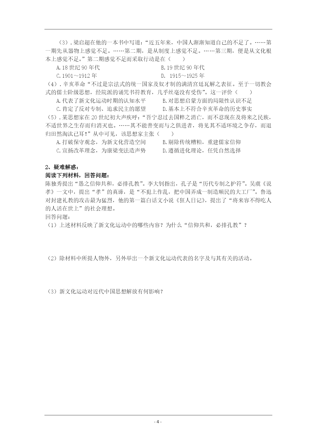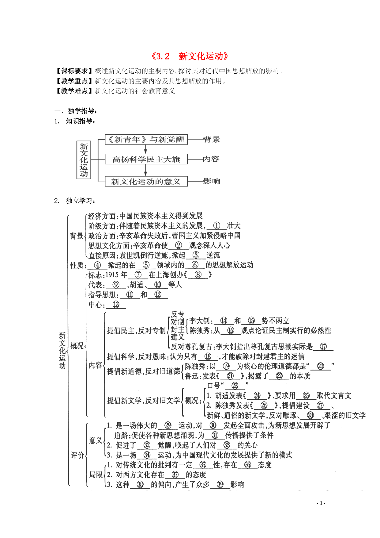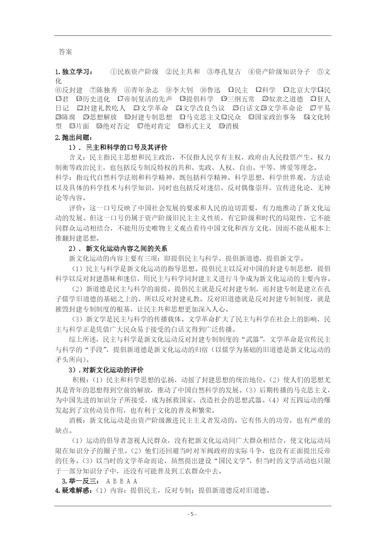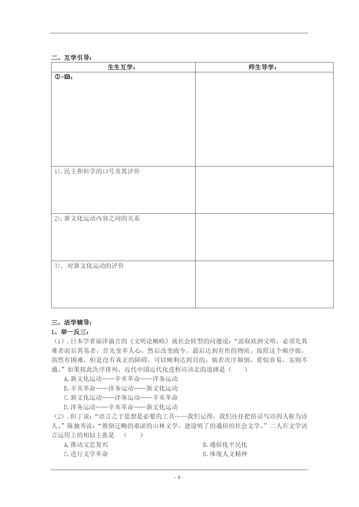 《3.2新文化运动》 【课标要求】概述新文化运动的主要内容,探讨其对近代中国思想解放的影响。 【教学重点】新文化运动的主要内容及其思想解放的作用。 【教学难点】新文化运动的社会教育意义。 一、独学指导: 知识指导: 独立学习: 3.抛砖引玉: 【抛出问题】【引出问题】1).民主和科学的口号及其评价2).新文化运动内容之间的关系3).对新文化运动的评价 PAGE-6- 二、互学引导: 生生互学:师生导学:eq\o\ac(○,1)-eq\o\ac(○,36): 1).民主和科学的口号及其评价 2).新文化运动内容之间的关系 3).对新文化运动的评价 三、活学辅导: 1、举一反三: (1).日本学者福泽谕吉的《文明论概略》就社会转型的问题说:“汲取欧洲文明,必须先其难者而后其易者,首先变革人心,然后改变政令,最后达到有形的物质。按照这个顺序做,虽然有困难,但是没有真正的障碍,可以顺利达到目的。倘若次序颠倒,看似容易,实则不通。”如果按此次序排列,近代中国近代化进程应该走的道路是() A.新文化运动——辛亥革命——洋务运动 B.辛亥革命——洋务运动——新文化运动 C.新文化运动——洋务运动——辛亥革命 D.洋务运动——辛亥革命——新文化运动 (2).但丁说:“语言之于思想是必要的工具……我们记得,我们往往把俗话写诗的人称为诗人。”陈独秀说:“推倒迂晦的艰涩的山林文学,建设明了的通俗的社会文学。”二人在文学语言运用上的相似主张是() A.推动文艺复兴B.通俗化平民化 C.进行文学革命D.体现人文精神 (3).梁启超在他的一本书中写道:“近五年来,中国人渐渐知道自己的不足了。……第一期先从器物上感觉不足。……第二期,是从制度上感觉不足。……第三期,便是从文化根本上感觉不足。”第二期感觉不足而采取行动是在() A.18世纪90年代B.19世纪90年代 C.1901~1912年D.1915~1925年 (4).辛亥革命“不过是宗法式的统一国家及奴才制的满清宫廷瓦解之表征。至于一切教会式的儒士阶级思想,经院派的诵咒书符教育,几乎丝毫没有受伤”。这一评价() A.代表了新文化运动时期的认知水平B.对思想启蒙方面的局限性认识不足 C.肯定了反对专制、追求民主的愿望D.基本上不符合辛亥革命的历史事实 (5).某思想家在20世纪初大声疾呼:“吾宁忍过去国粹之消亡,而不忍现在及将来之民族,不适世界之生存而归消灭也。……其不能善变而与之俱进者,将见其不适环境之争存,而退归田然淘汰已耳!”从中可见,该思想家主张() A.打破保守观念,为新文化营造空间B.剔除传统糟粕,重建儒家信仰 C.宣扬改革理念,为康梁变法造声势D.遵循进化理论,任凭自然选择 2、疑难解惑: 阅读下列材料,回答问题: 陈独秀提出“愚之信仰共和,必排孔教”。李大钊指出,孔子是“历代专制之护符”。吴虞《说孝》一文中,提出“孝”的真谛,是“不犯上作乱,把中国弄成一制造顺民的大工厂”。鲁迅对封建礼教的攻击最为猛烈,他的第一篇白话文小说《狂人日记》,提出了“将来容不得吃人的人活在世上”的社会理想。 回答问题: (1)上述材料反映了新文化运动中的哪些内容?为什么“信仰共和,必排孔教”? (2)除材料中所提人物外,另外举出一个新文化运动代表的名字及与其有关的活动。 (3)新文化运动对近代中国思想解放有何影响? 答案 1.独立学习:①民族资产阶级②民主共和③尊孔复古④资产阶级知识分子⑤文化 ⑥反封建⑦陈独秀⑧青年杂志⑨李大钊⑩鲁迅eq\o\ac(○,11)民主eq\o\ac(○,12)科学eq\o\ac(○,13)北京大学eq\o\ac(○,14)民eq\o\ac(○,15)君eq\o\ac(○,16)历史进化eq\o\ac(○,17)帝制复活的先声eq\o\ac(○,18)提倡科学eq\o\ac(○,19)三纲五常eq\o\ac(○,20)奴隶之道德eq\o\ac(○,21)狂人日记eq\o\ac(○,22)封建礼教吃人eq\o\ac(○,23)文学革命eq\o\ac(○,24)文学改良刍议eq\o\ac(○,25)白话文eq\o\ac(○,26)文学革命论eq\o\ac(○,27)平易eq\o\ac(○,28)陈腐eq\o\ac(○,29)思想解放eq\o\ac(○,30)封建专制思想eq\o\ac(○,31)马克思主义eq\o\ac(○,32)民众eq\o\ac(○,33)国家政治事务eq\o\ac(○,34)文化转型eq\o\ac(○,35)片面