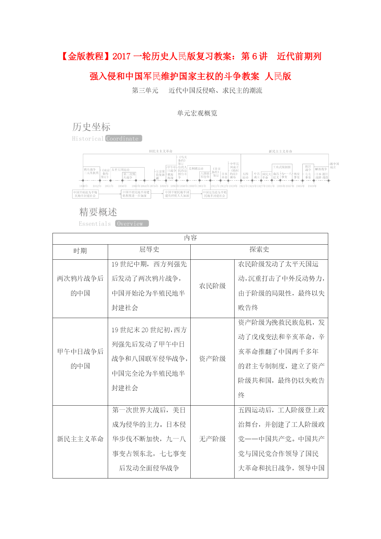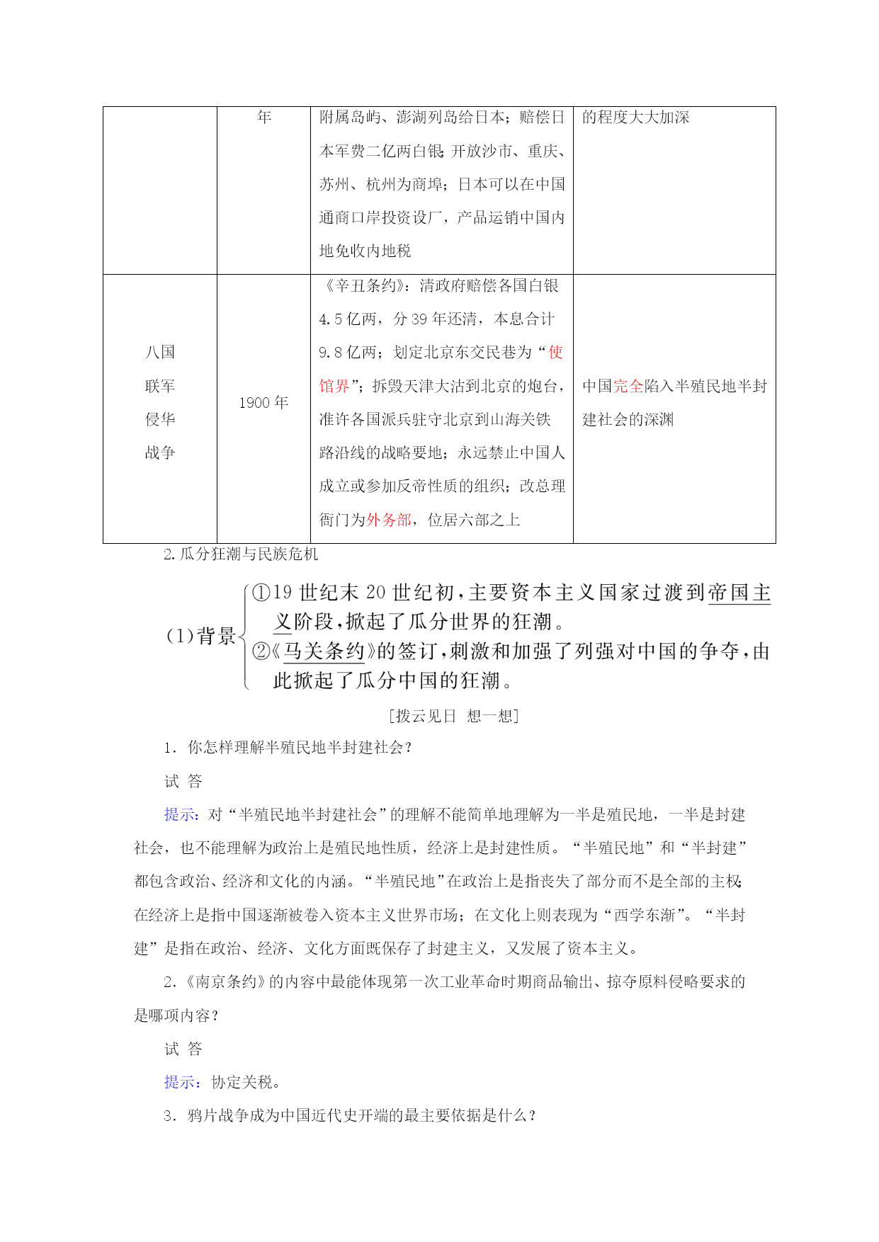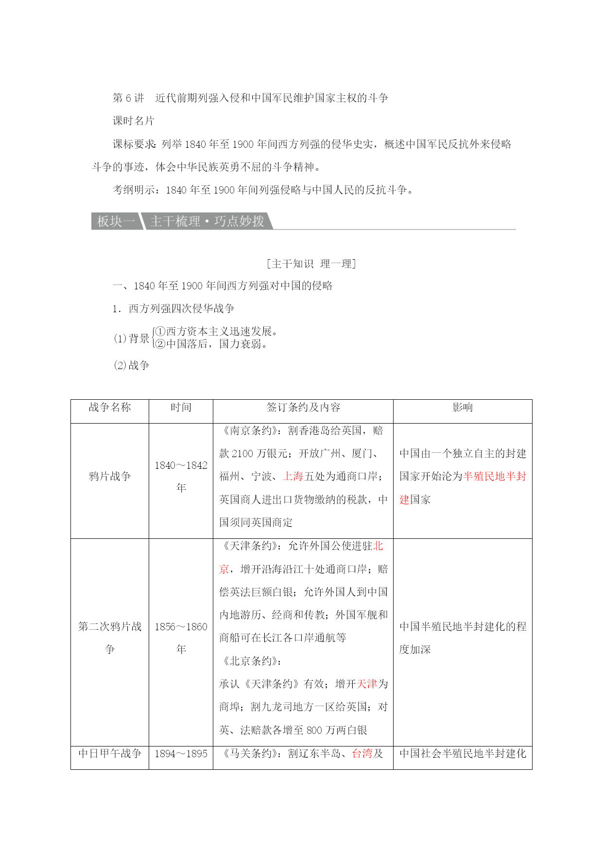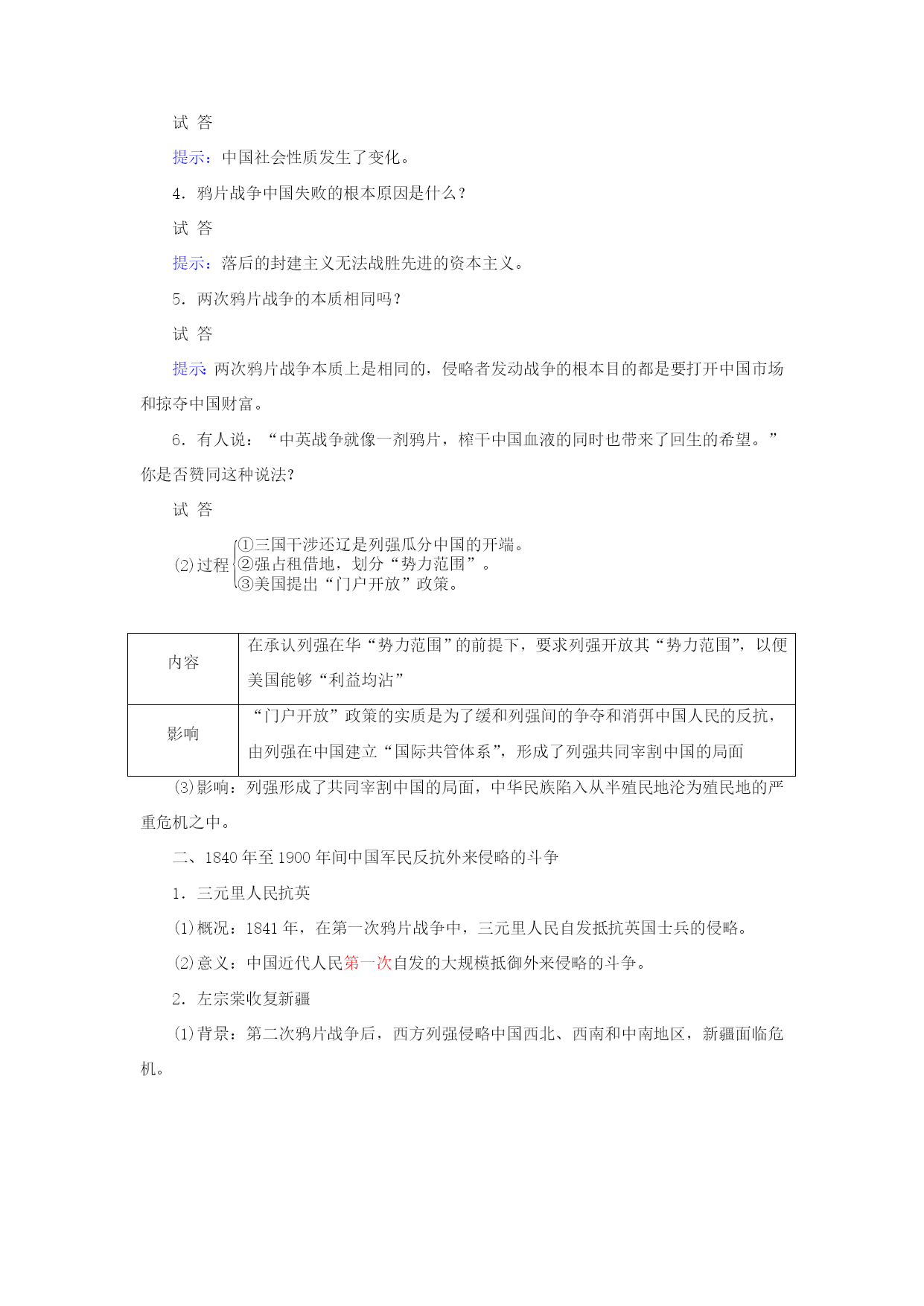 【金版教程】2017一轮历史人民版复习教案:第6讲近代前期列强入侵和中国军民维护国家主权的斗争教案人民版 第三单元近代中国反侵略、求民主的潮流 单元宏观概览 内容时期屈辱史探索史两次鸦片战争后的中国19世纪中期,西方列强先后发动了两次鸦片战争,中国开始沦为半殖民地半封建社会农民阶级农民阶级发动了太平天国运动,沉重打击了中外反动势力,由于阶级的局限性,最终以失败告终甲午中日战争后的中国19世纪末20世纪初,西方列强先后发动了甲午中日战争和八国联军侵华战争,中国完全沦为半殖民地半封建社会资产阶级资产阶级为挽救民族危机,发动了戊戌变法和辛亥革命,辛亥革命推翻了中国两千多年的君主专制制度,建立了资产阶级共和国,最终仍以失败告终新民主主义革命第一次世界大战后,美日成为侵华的主力。日本侵华步伐不断加快,九一八事变占领东北,七七事变后发动全面侵华战争无产阶级五四运动后,工人阶级登上政治舞台,并创建了工人阶级政党——中国共产党。中国共产党与国民党合作领导了国民大革命和抗日战争,领导中国人民推翻了南京国民政府的反动统治,终于完成了民主革命任务 主旨中国近代史既是西方列强不断侵华,变中国为半殖民地半封建社会的历史,也是中国人民为争取民族独立和民主富强而不断探索的历史 第6讲近代前期列强入侵和中国军民维护国家主权的斗争 课时名片 课标要求:列举1840年至1900年间西方列强的侵华史实,概述中国军民反抗外来侵略斗争的事迹,体会中华民族英勇不屈的斗争精神。 考纲明示:1840年至1900年间列强侵略与中国人民的反抗斗争。 eq\a\vs4\al([主干知识理一理]) 一、1840年至1900年间西方列强对中国的侵略 1.西方列强四次侵华战争 (1)背景eq\b\lc\{\rc\(\a\vs4\al\co1(①西方资本主义迅速发展。,②中国落后,国力衰弱。)) (2)战争 战争名称时间签订条约及内容影响鸦片战争1840~1842年《南京条约》:割香港岛给英国,赔款2100万银元;开放广州、厦门、福州、宁波、上海五处为通商口岸;英国商人进出口货物缴纳的税款,中国须同英国商定中国由一个独立自主的封建国家开始沦为半殖民地半封建国家第二次鸦片战争1856~1860年《天津条约》:允许外国公使进驻北京,增开沿海沿江十处通商口岸;赔偿英法巨额白银;允许外国人到中国内地游历、经商和传教;外国军舰和商船可在长江各口岸通航等 《北京条约》: 承认《天津条约》有效;增开天津为商埠;割九龙司地方一区给英国;对英、法赔款各增至800万两白银中国半殖民地半封建化的程度加深中日甲午战争1894~1895年《马关条约》:割辽东半岛、台湾及附属岛屿、澎湖列岛给日本;赔偿日本军费二亿两白银;开放沙市、重庆、苏州、杭州为商埠;日本可以在中国通商口岸投资设厂,产品运销中国内地免收内地税中国社会半殖民地半封建化的程度大大加深八国 联军 侵华 战争1900年《辛丑条约》:清政府赔偿各国白银4.5亿两,分39年还清,本息合计9.8亿两;划定北京东交民巷为“使馆界”;拆毁天津大沽到北京的炮台,准许各国派兵驻守北京到山海关铁路沿线的战略要地;永远禁止中国人成立或参加反帝性质的组织;改总理衙门为外务部,位居六部之上中国完全陷入半殖民地半封建社会的深渊2.瓜分狂潮与民族危机 eq\a\vs4\al([拨云见日想一想]) 1.你怎样理解半殖民地半封建社会? 试答 提示:对“半殖民地半封建社会”的理解不能简单地理解为一半是殖民地,一半是封建社会,也不能理解为政治上是殖民地性质,经济上是封建性质。“半殖民地”和“半封建”都包含政治、经济和文化的内涵。“半殖民地”在政治上是指丧失了部分而不是全部的主权;在经济上是指中国逐渐被卷入资本主义世界市场;在文化上则表现为“西学东渐”。“半封建”是指在政治、经济、文化方面既保存了封建主义,又发展了资本主义。 2.《南京条约》的内容中最能体现第一次工业革命时期商品输出、掠夺原料侵略要求的是哪项内容? 试答 提示:协定关税。 3.鸦片战争成为中国近代史开端的最主要依据是什么? 试答 提示:中国社会性质发生了变化。 4.鸦片战争中国失败的根本原因是什么? 试答 提示:落后的封建主义无法战胜先进的资本主义。 5.两次鸦片战争的本质相同吗? 试答 提示:两次鸦片战争本质上是相同的,侵略者发动战争的根本目的都是要打开中国市场和掠夺中国财富。 6.有人说:“中英战争就像一剂鸦片,榨干中国血液的同时也带来了回生的希望。”你是否赞同这种说法? 试答 (2)过程eq\b\lc\{\rc\(\a\vs4\al\co1(①三国干涉还辽是列强瓜分中国的开端。,②强占租借地,划分“势力范围”。,③美国提出“门户开放”政策。)) 内容在承认列强在华“势力范围
