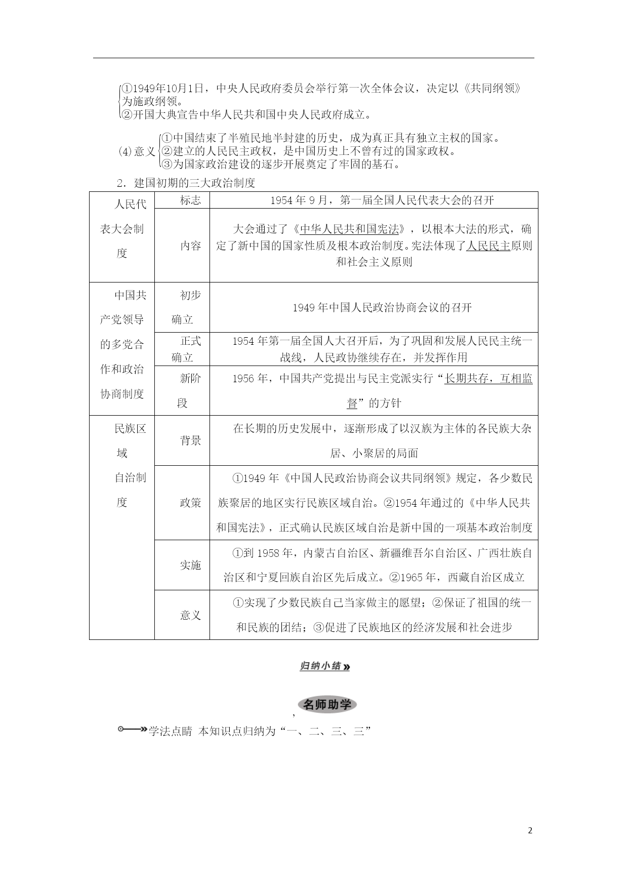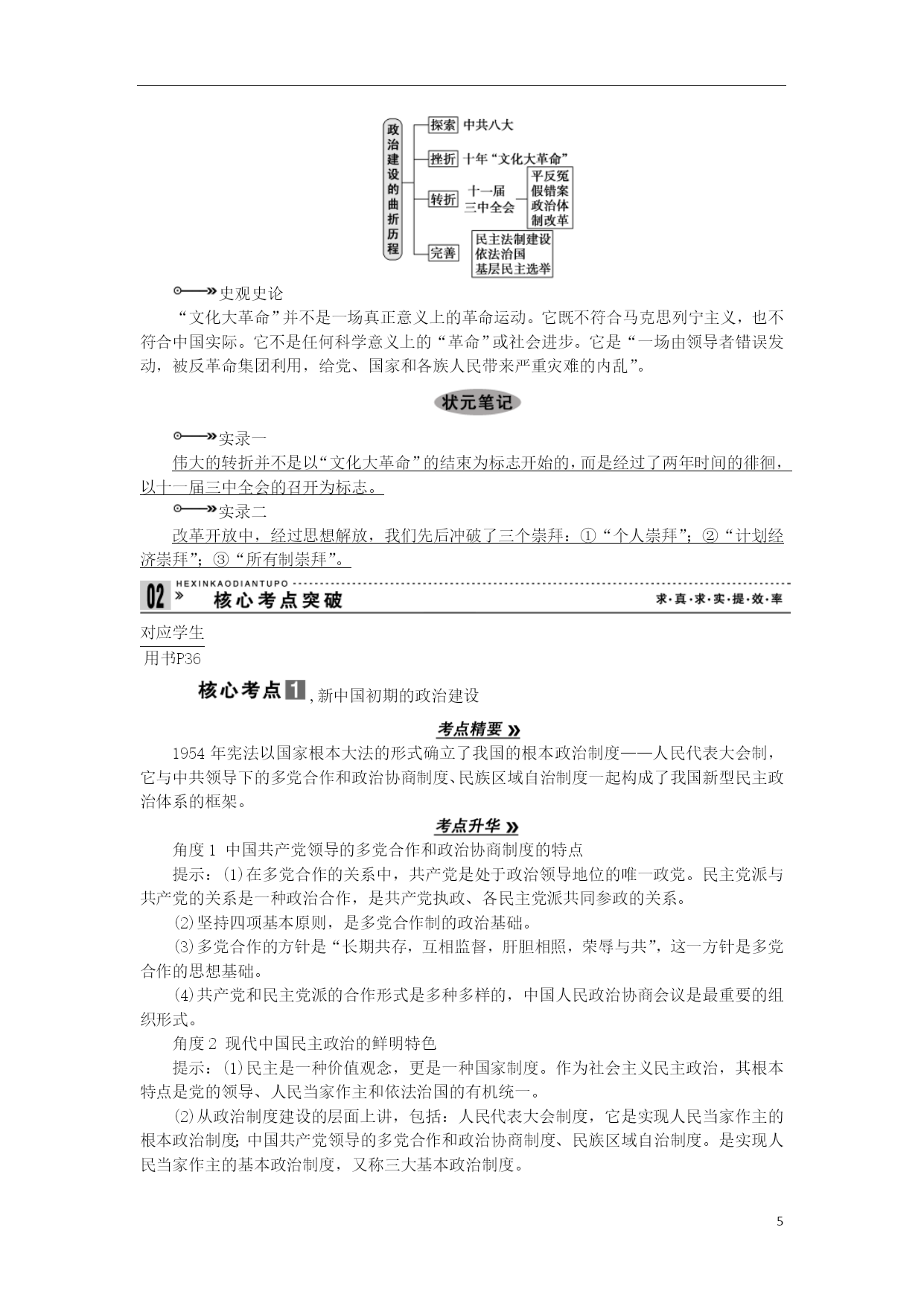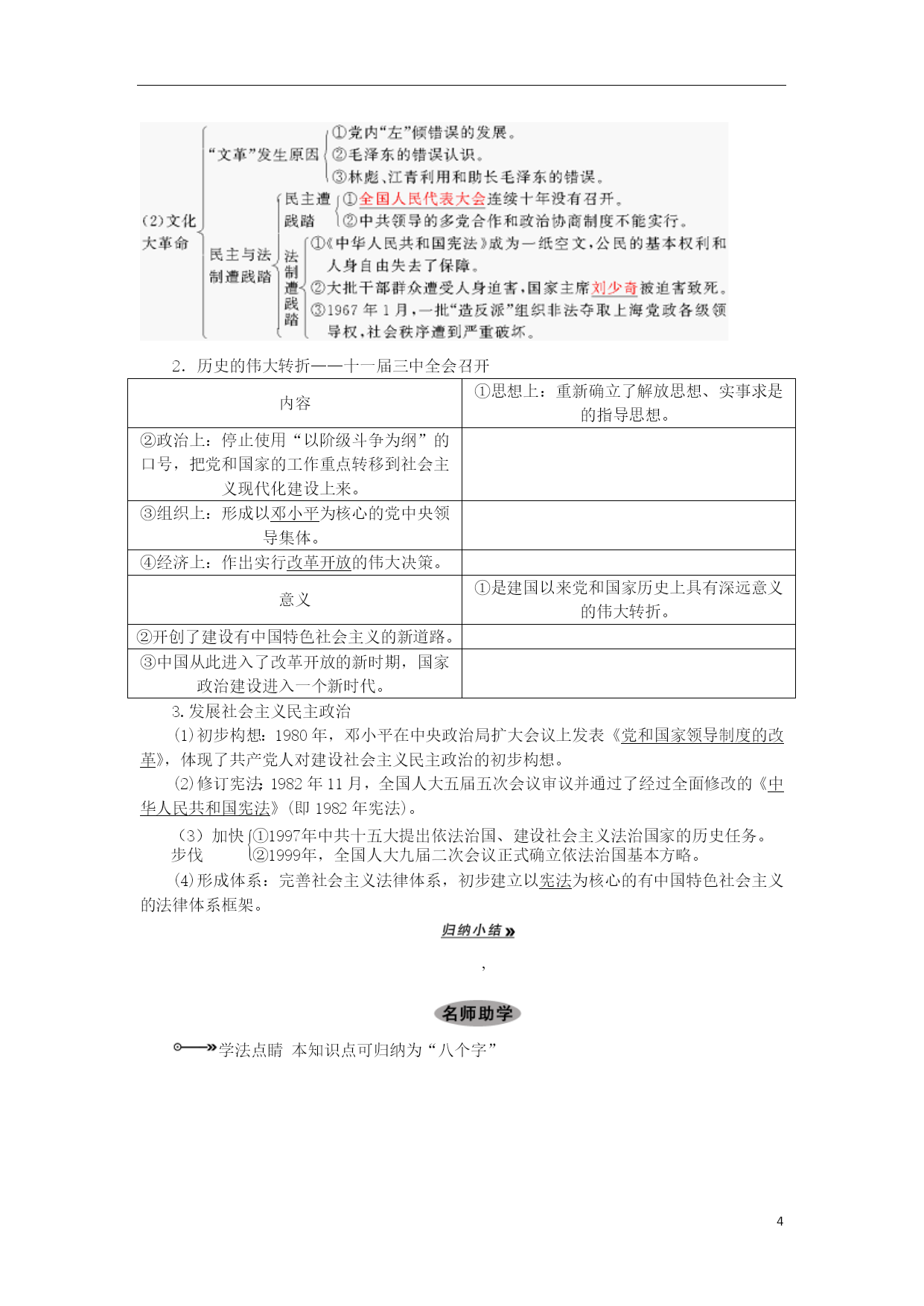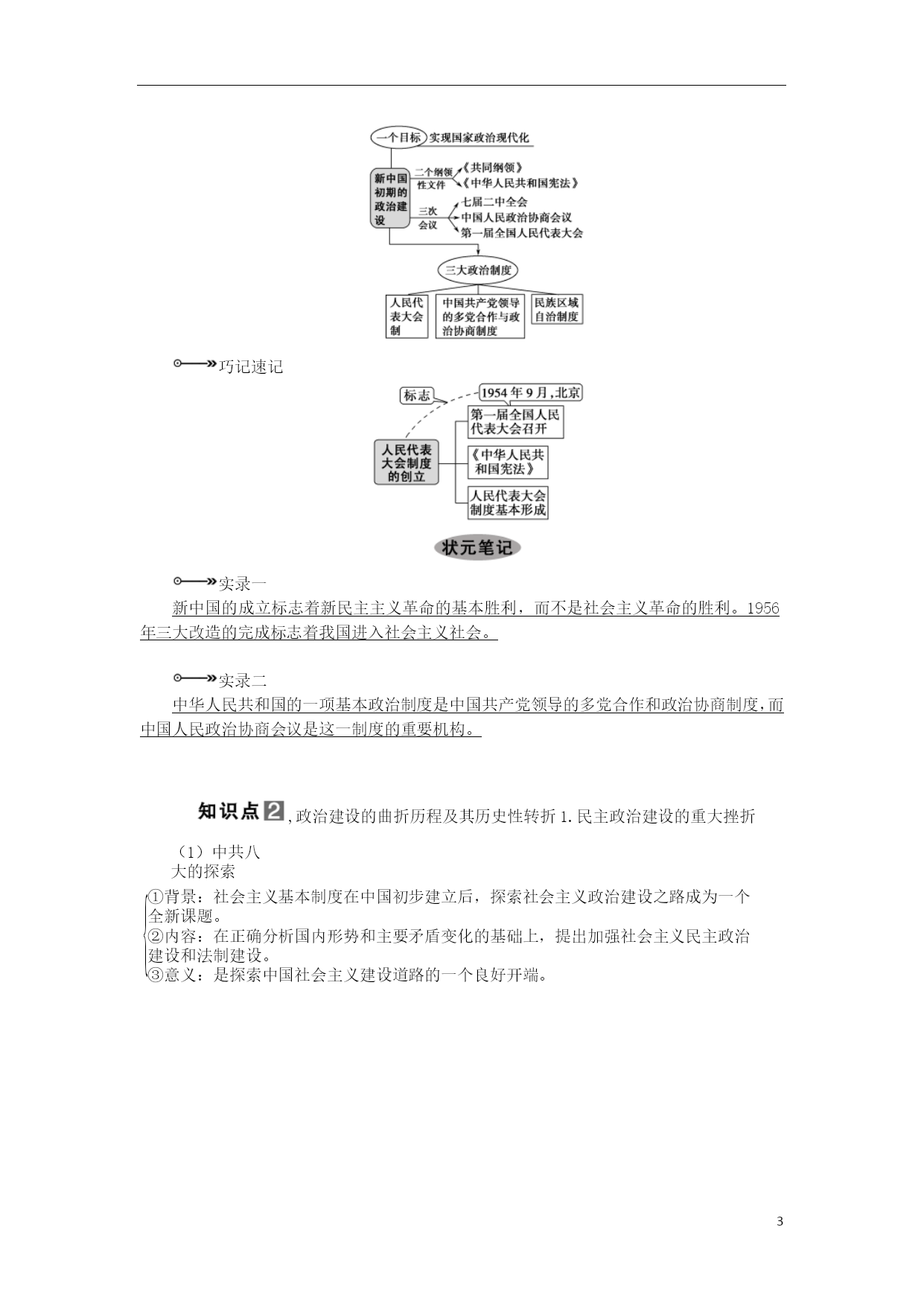 第7课时新中国政治建设的曲折发展历程 1.概述中华人民共和国成立的史实,阐述人民代表大会制度、共产党领导的多党合作和政治协商制度、民族区域自治制度的建立和完善,认识我国民主政治的特色。 2.了解“文化大革命”对民主法制的践踏,说明民主法制建设的必要性和艰巨性。 3.列举中国共产党十一届三中全会以来我国民主与法制建设的主要成就,认识实行依法治国方略的重要意义。 1.新中国的民主政治建设:①新中国的成立;②1954年《中华人民共和国宪法》的内容及意义;③中共领导的多党合作与政治协商制度的确立及原则;④民族区域自治制度的确立及意义;⑤建国初期我国民主政治的特色。 2.政治建设的曲折发展:①“文化大革命”的错误发动;②人大制度和政协制度的破坏;③民主法制建设的必要性与艰巨性。 3.新时期民主法制的健全与发展:①中共十一届三中全会的召开及影响;②1980年邓小平的讲话;③1982年宪法的主要内容及历史作用;④依法治国方略的提出及重要意义。 eq\f(对应学生,用书P34) ,新中国初期的政治建设1.中华人民共和国的成立 eq\a\vs4\al((1)奠基:七届二中全会)eq\b\lc\{(\a\vs4\al\co1(①指出党的工作必须由乡村转移到城市,以恢复和发展生产为中心。,②确定了全国胜利后中国共产党在政治、经济、外交方面的基本政策。,③确定了中国从农业国转变为工业国、从新民主主义社会转变到社会主义社会的总任务。)) eq\a\vs4\al((2)筹备:中国人民政治协商会议)eq\b\lc\{(\a\vs4\al\co1(①决定采用“中华人民共和国”的国名。,②通过《中国人民政治协商会议共同纲领》等文件,规定了新中国的国家性质。,③选举产生了中央人民政府委员会。)) (3)成立 eq\b\lc\{(\a\vs4\al\co1(①1949年10月1日,中央人民政府委员会举行第一次全体会议,决定以《共同纲领》,为施政纲领。,②开国大典宣告中华人民共和国中央人民政府成立。)) (4)意义eq\b\lc\{(\a\vs4\al\co1(①中国结束了半殖民地半封建的历史,成为真正具有独立主权的国家。,②建立的人民民主政权,是中国历史上不曾有过的国家政权。,③为国家政治建设的逐步开展奠定了牢固的基石。)) 2.建国初期的三大政治制度 人民代表大会制度 标志1954年9月,第一届全国人民代表大会的召开内容大会通过了《中华人民共和国宪法》,以根本大法的形式,确定了新中国的国家性质及根本政治制度。宪法体现了人民民主原则和社会主义原则中国共产党领导的多党合作和政治协商制度初步确立1949年中国人民政治协商会议的召开正式确立1954年第一届全国人大召开后,为了巩固和发展人民民主统一战线,人民政协继续存在,并发挥作用新阶段1956年,中国共产党提出与民主党派实行“长期共存,互相监督”的方针民族区域 自治制度背景在长期的历史发展中,逐渐形成了以汉族为主体的各民族大杂居、小聚居的局面政策①1949年《中国人民政治协商会议共同纲领》规定,各少数民族聚居的地区实行民族区域自治。②1954年通过的《中华人民共和国宪法》,正式确认民族区域自治是新中国的一项基本政治制度实施①到1958年,内蒙古自治区、新疆维吾尔自治区、广西壮族自治区和宁夏回族自治区先后成立。②1965年,西藏自治区成立意义①实现了少数民族自己当家做主的愿望;②保证了祖国的统一和民族的团结;③促进了民族地区的经济发展和社会进步 eq\a\vs4\al() , 学法点睛本知识点归纳为“一、二、三、三” 巧记速记 实录一 新中国的成立标志着新民主主义革命的基本胜利,而不是社会主义革命的胜利。1956年三大改造的完成标志着我国进入社会主义社会。 实录二 中华人民共和国的一项基本政治制度是中国共产党领导的多党合作和政治协商制度,而中国人民政治协商会议是这一制度的重要机构。 ,政治建设的曲折历程及其历史性转折1.民主政治建设的重大挫折 eq\a\vs4\al((1)中共八,大的探索)eq\b\lc\{(\a\vs4\al\co1(①背景:社会主义基本制度在中国初步建立后,探索社会主义政治建设之路成为一个,全新课题。,②内容:在正确分析国内形势和主要矛盾变化的基础上,提出加强社会主义民主政治,建设和法制建设。,③意义:是探索中国社会主义建设道路的一个良好开端。)) 2.历史的伟大转折——十一届三中全会召开 内容①思想上:重新确立了解放思想、实事求是的指导思想。②政治上:停止使用“以阶级斗争为纲”的口号,把党和国家的工作重点转移到社会主义现代化建设上来。③组织上:形成以邓小平为核心的党中央领导集体。④经济上:作出实