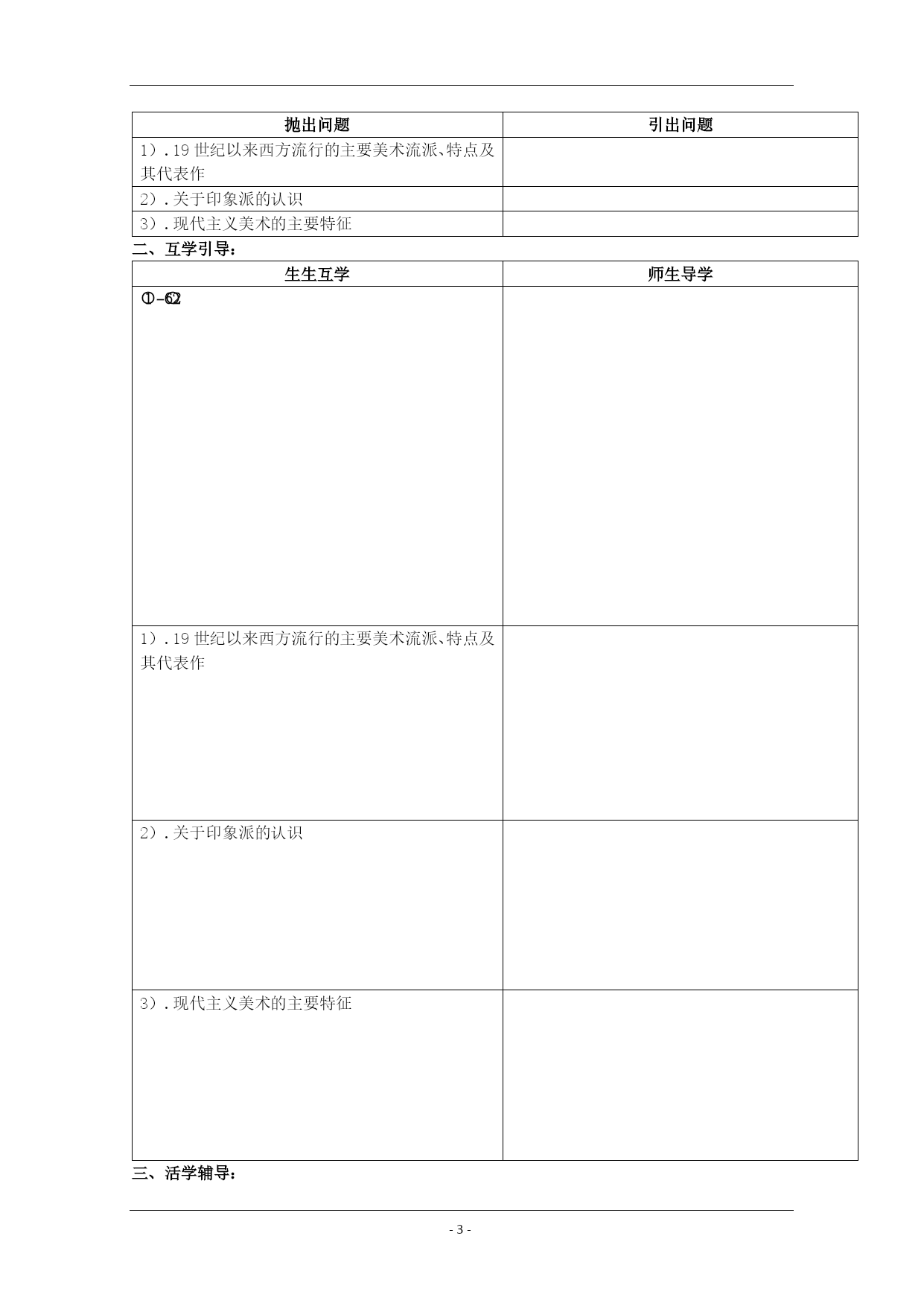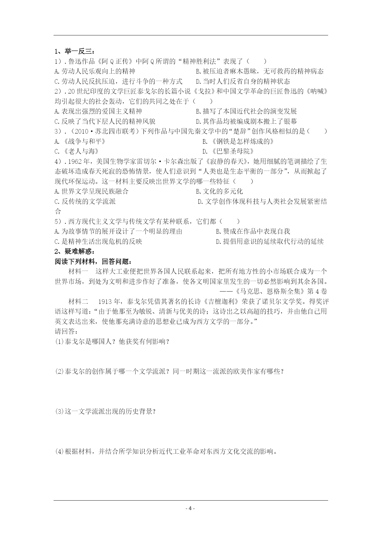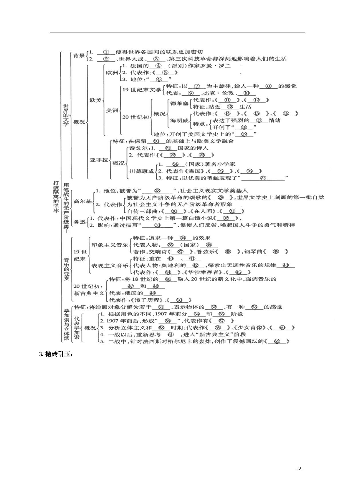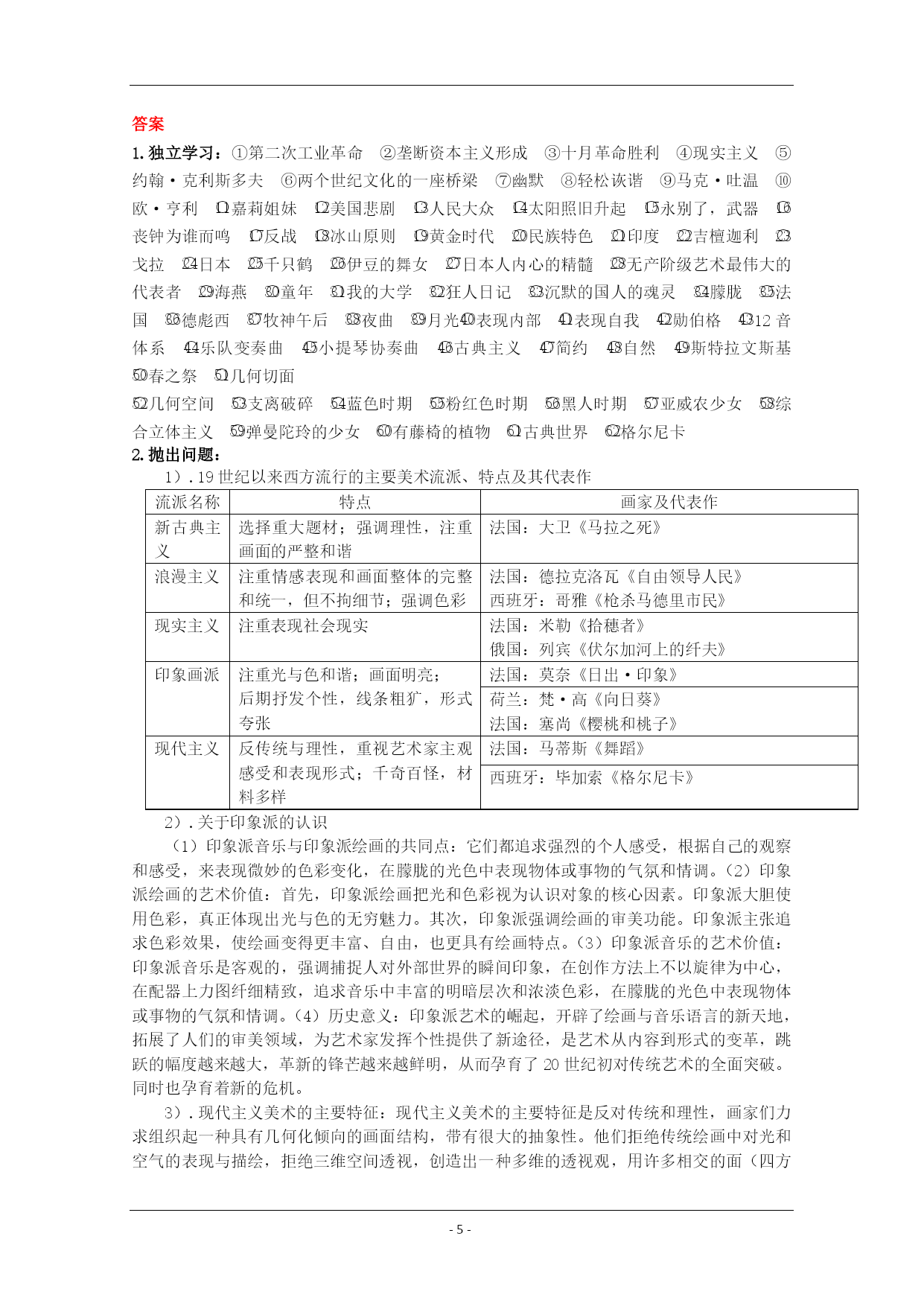 PAGE-2- 《8.3打破隔离的坚冰》 【课标要求】了解19世纪末20世纪初现实主义文学的主要成就,认识其产生的时代背景及影响。欣赏19世纪末20世纪初现实主义音乐和美术作品,了解其产生的时代背景及其艺术价值。 【教学重点】现实主义文学和艺术产生的历史背景、代表人物和代表性作品。 【教学难点】19世纪末20世纪初现实主义文学和艺术作品所反映的社会现实。 一、独学指导: 1.知识指导: 2.独立学习: 3.抛砖引玉: PAGE-6- 抛出问题引出问题1).19世纪以来西方流行的主要美术流派、特点及其代表作2).关于印象派的认识3).现代主义美术的主要特征二、互学引导: 生生互学师生导学eq\o\ac(○,1)-eq\o\ac(○,62) 1).19世纪以来西方流行的主要美术流派、特点及其代表作 2).关于印象派的认识 3).现代主义美术的主要特征 三、活学辅导: 1、举一反三: 1).鲁迅作品《阿Q正传》中阿Q所谓的“精神胜利法”表现了() A.劳动人民乐观向上的精神B.被压迫者麻木愚昧,无可救药的精神病态 C.劳动人民反抗压迫,进行斗争的一种方式D.当时人们反省自身的精神状态 2).20世纪印度的文学巨匠泰戈尔的长篇小说《戈拉》和中国文学革命的巨匠鲁迅的《呐喊》均引起很大的社会轰动,它们的共同之处在于() A.表现出强烈的爱国主义精神B.描写了本国近代社会的演变发展 C.反映了当代下层人民的精神风貌D.其作品均被编成剧本搬上了银幕 3).(2010·苏北四市联考)下列作品与中国先秦文学中的“楚辞”创作风格相似的是() A.《战争与和平》B.《钢铁是怎样炼成的》 C.《老人与海》D.《巴黎圣母院》 4).1962年,美国生物学家雷切尔·卡尔森出版了《寂静的春天》,她用细腻的笔调描绘了生态破坏造成春天死寂的恐怖情景,使人们意识到“人类也是生态平衡的一部分”,从而掀起了现代环保运动。这一材料主要反映出世界文学的哪一些特征() A.世界文学呈现民族融合B.文化的多元化 C.反传统的文学流派D.文学创作体现科技与人类社会发展紧密结合 5).西方现代主义文学与传统文学有某种联系,它们都() A.为故事情节的展开设计了一个明显的理由B.赞成在作品中表现自我 C.是精神生活出现危机的反映D.提倡用意识的延续取代行动的延续 2、疑难解惑: 阅读下列材料,回答问题: 材料一这样大工业便把世界各国人民联系起来,把所有地方性的小市场联合成为一个世界市场,到处为文明和进步作好了准备,使各文明国家里发生的一切必然影响到其余各国。 ——《马克思、恩格斯全集》第4卷 材料二1913年,泰戈尔凭借其著名的长诗《吉檀迦利》荣获了诺贝尔文学奖。得奖评语这样写道:“由于他那至为敏锐、清新与优美的诗;这诗出之以高超的技巧,并由他自己用英文表达出来,使他那充满诗意的思想业已成为西方文学的一部分。” 请回答: (1)泰戈尔是哪国人?他获奖有何影响? (2)泰戈尔的创作属于哪一个文学流派?同一时期这一流派的欧美作家有哪些? (3)这一文学流派出现的历史背景? (4)根据材料,并结合所学知识分析近代工业革命对东西方文化交流的影响。 答案 1.独立学习:①第二次工业革命②垄断资本主义形成③十月革命胜利④现实主义⑤约翰·克利斯多夫⑥两个世纪文化的一座桥梁⑦幽默⑧轻松诙谐⑨马克·吐温⑩欧·亨利eq\o\ac(○,11)嘉莉姐妹eq\o\ac(○,12)美国悲剧eq\o\ac(○,13)人民大众eq\o\ac(○,14)太阳照旧升起eq\o\ac(○,15)永别了,武器eq\o\ac(○,16)丧钟为谁而鸣eq\o\ac(○,17)反战eq\o\ac(○,18)冰山原则eq\o\ac(○,19)黄金时代eq\o\ac(○,20)民族特色eq\o\ac(○,21)印度eq\o\ac(○,22)吉檀迦利eq\o\ac(○,23)戈拉eq\o\ac(○,24)日本eq\o\ac(○,25)千只鹤eq\o\ac(○,26)伊豆的舞女eq\o\ac(○,27)日本人内心的精髓eq\o\ac(○,28)无产阶级艺术最伟大的代表者eq\o\ac(○,29)海燕eq\o\ac(○,30)童年eq\o\ac(○,31)我的大学eq\o\ac(○,32)狂人日记eq\o\ac(○,33)沉默的国人的魂灵eq\o\ac(○,34)朦胧eq\o\ac(○,35)法国eq\o\ac(○,36)德彪西eq\o\ac(○,37