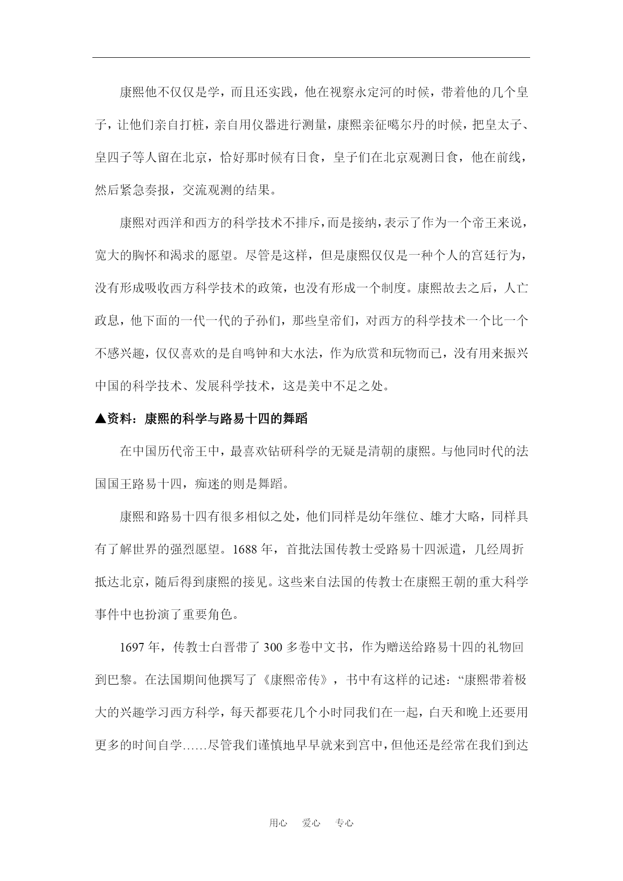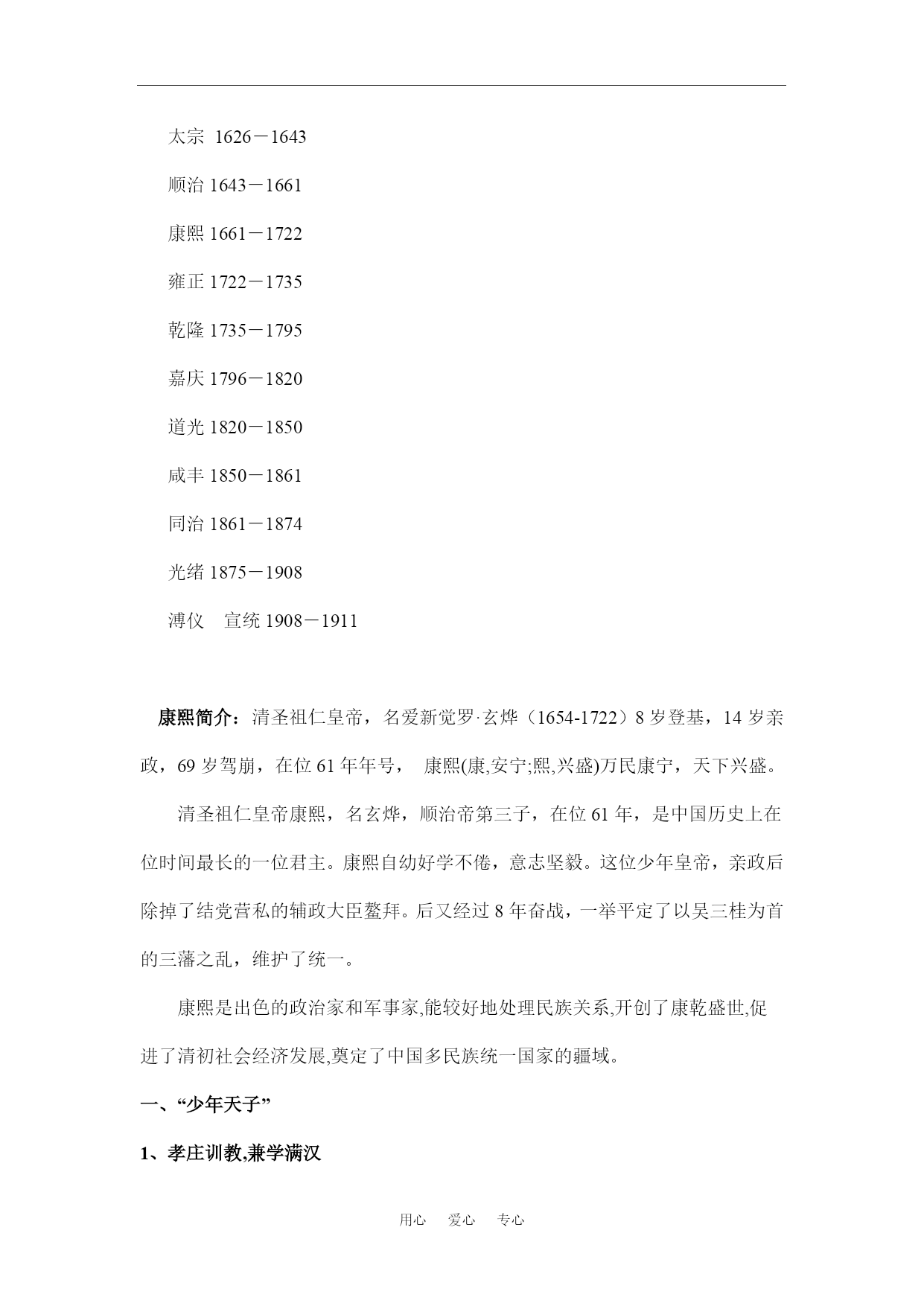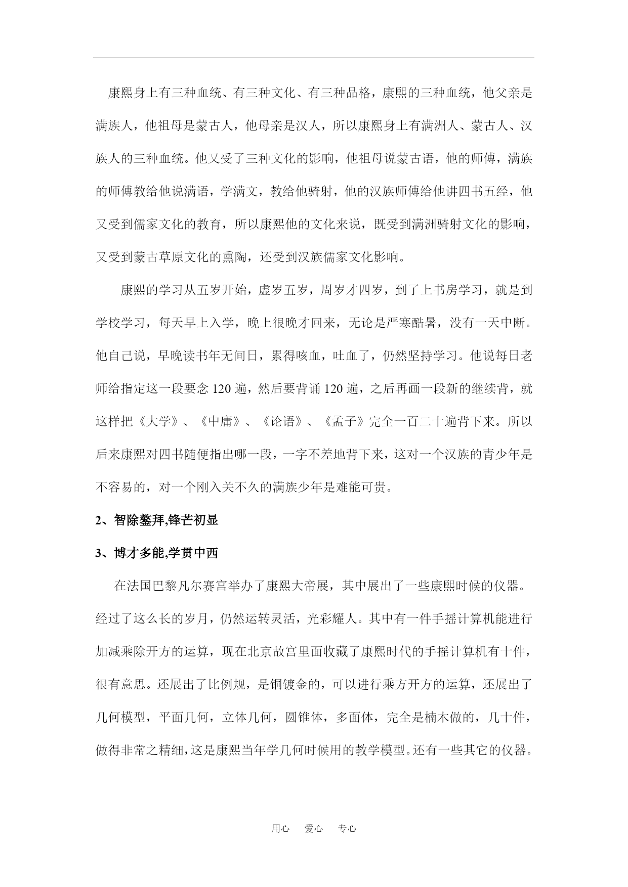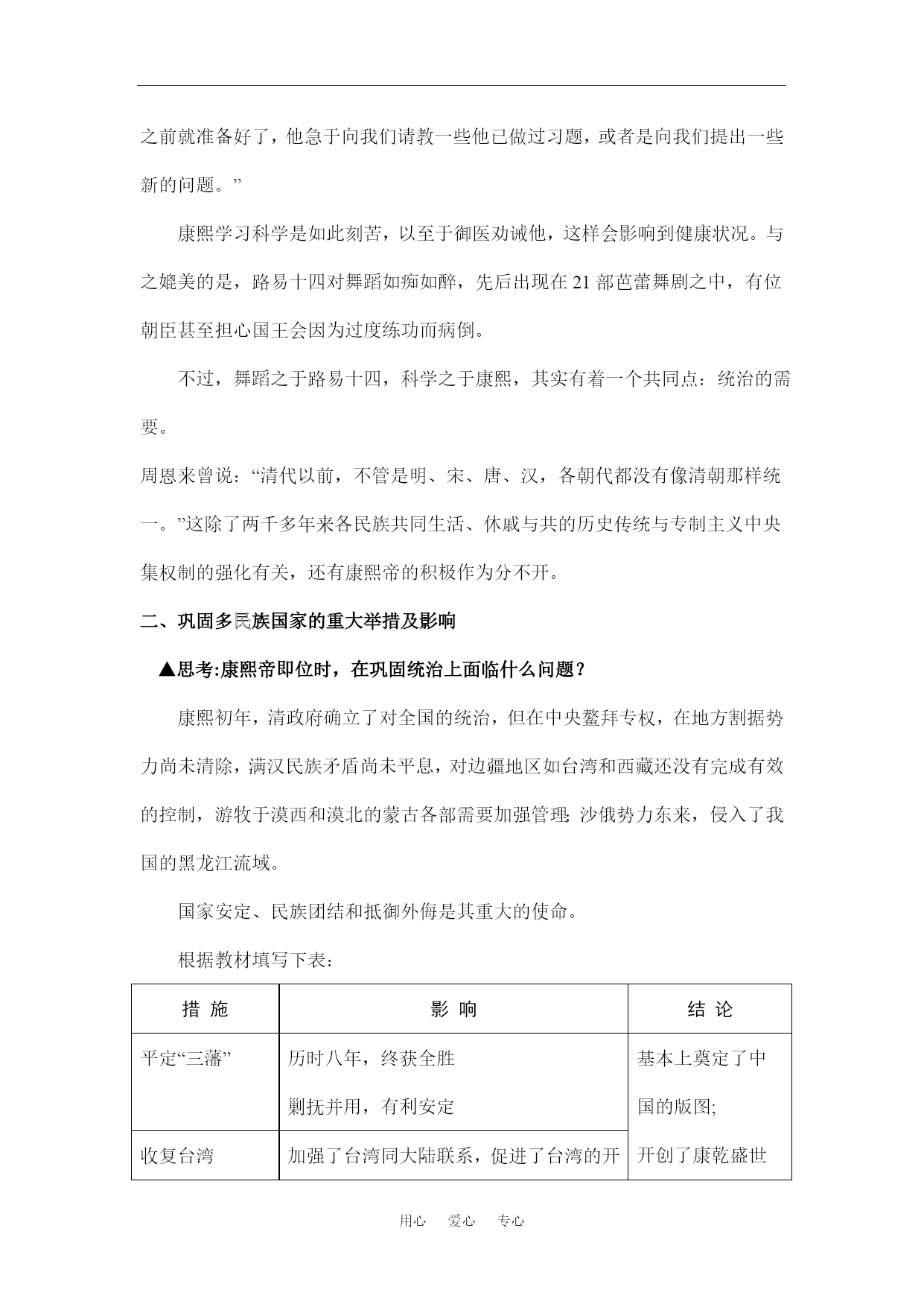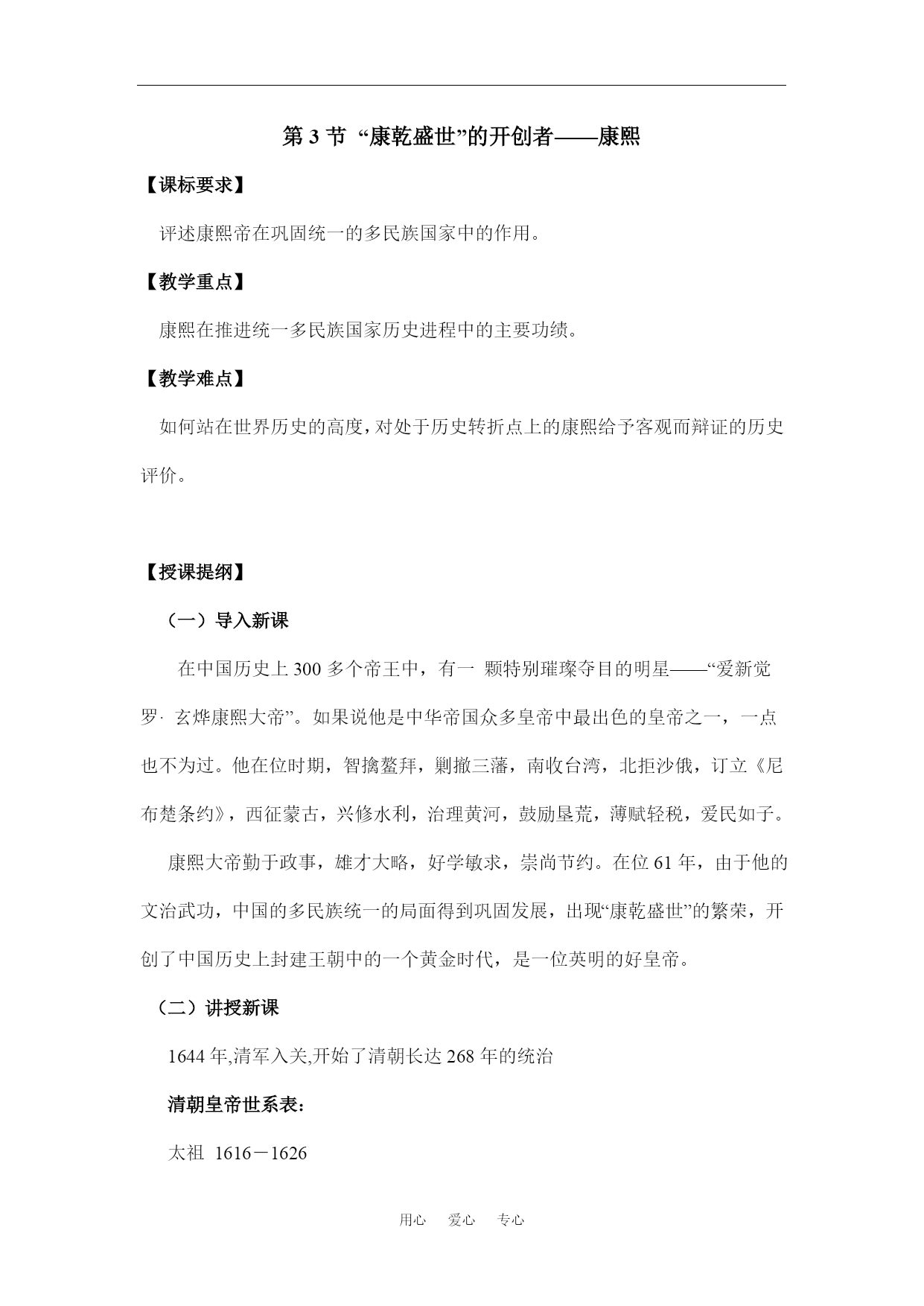 用心爱心专心 第3节“康乾盛世”的开创者——康熙 【课标要求】 评述康熙帝在巩固统一的多民族国家中的作用。 【教学重点】 康熙在推进统一多民族国家历史进程中的主要功绩。 【教学难点】 如何站在世界历史的高度,对处于历史转折点上的康熙给予客观而辩证的历史评价。 【授课提纲】 (一)导入新课 在中国历史上300多个帝王中,有一颗特别璀璨夺目的明星——“爱新觉罗·玄烨康熙大帝”。如果说他是中华帝国众多皇帝中最出色的皇帝之一,一点也不为过。他在位时期,智擒鳌拜,剿撤三藩,南收台湾,北拒沙俄,订立《尼布楚条约》,西征蒙古,兴修水利,治理黄河,鼓励垦荒,薄赋轻税,爱民如子。康熙大帝勤于政事,雄才大略,好学敏求,崇尚节约。在位61年,由于他的文治武功,中国的多民族统一的局面得到巩固发展,出现“康乾盛世”的繁荣,开创了中国历史上封建王朝中的一个黄金时代,是一位英明的好皇帝。 (二)讲授新课 1644年,清军入关,开始了清朝长达268年的统治 清朝皇帝世系表: 太祖1616-1626 太宗1626-1643 顺治1643-1661 康熙1661-1722 雍正1722-1735 乾隆1735-1795 嘉庆1796-1820 道光1820-1850 咸丰1850-1861 同治1861-1874 光绪1875-1908 溥仪宣统1908-1911 康熙简介:清圣祖仁皇帝,名爱新觉罗·玄烨(1654-1722)8岁登基,14岁亲政,69岁驾崩,在位61年年号,康熙(康,安宁;熙,兴盛)万民康宁,天下兴盛。 清圣祖仁皇帝康熙,名玄烨,顺治帝第三子,在位61年,是中国历史上在位时间最长的一位君主。康熙自幼好学不倦,意志坚毅。这位少年皇帝,亲政后除掉了结党营私的辅政大臣鳌拜。后又经过8年奋战,一举平定了以吴三桂为首的三藩之乱,维护了统一。 康熙是出色的政治家和军事家,能较好地处理民族关系,开创了康乾盛世,促进了清初社会经济发展,奠定了中国多民族统一国家的疆域。 一、“少年天子” 1、孝庄训教,兼学满汉 康熙身上有三种血统、有三种文化、有三种品格,康熙的三种血统,他父亲是满族人,他祖母是蒙古人,他母亲是汉人,所以康熙身上有满洲人、蒙古人、汉族人的三种血统。他又受了三种文化的影响,他祖母说蒙古语,他的师傅,满族的师傅教给他说满语,学满文,教给他骑射,他的汉族师傅给他讲四书五经,他又受到儒家文化的教育,所以康熙他的文化来说,既受到满洲骑射文化的影响,又受到蒙古草原文化的熏陶,还受到汉族儒家文化影响。 康熙的学习从五岁开始,虚岁五岁,周岁才四岁,到了上书房学习,就是到学校学习,每天早上入学,晚上很晚才回来,无论是严寒酷暑,没有一天中断。他自己说,早晚读书年无间日,累得咳血,吐血了,仍然坚持学习。他说每日老师给指定这一段要念120遍,然后要背诵120遍,之后再画一段新的继续背,就这样把《大学》、《中庸》、《论语》、《孟子》完全一百二十遍背下来。所以后来康熙对四书随便指出哪一段,一字不差地背下来,这对一个汉族的青少年是不容易的,对一个刚入关不久的满族少年是难能可贵。 2、智除鏊拜,锋芒初显 3、博才多能,学贯中西 在法国巴黎凡尔赛宫举办了康熙大帝展,其中展出了一些康熙时候的仪器。经过了这么长的岁月,仍然运转灵活,光彩耀人。其中有一件手摇计算机能进行加减乘除开方的运算,现在北京故宫里面收藏了康熙时代的手摇计算机有十件,很有意思。还展出了比例规,是铜镀金的,可以进行乘方开方的运算,还展出了几何模型,平面几何,立体几何,圆锥体,多面体,完全是楠木做的,几十件,做得非常之精细,这是康熙当年学几何时候用的教学模型。还有一些其它的仪器。 康熙他不仅仅是学,而且还实践,他在视察永定河的时候,带着他的几个皇子,让他们亲自打桩,亲自用仪器进行测量,康熙亲征噶尔丹的时候,把皇太子、皇四子等人留在北京,恰好那时候有日食,皇子们在北京观测日食,他在前线,然后紧急奏报,交流观测的结果。 康熙对西洋和西方的科学技术不排斥,而是接纳,表示了作为一个帝王来说,宽大的胸怀和渴求的愿望。尽管是这样,但是康熙仅仅是一种个人的宫廷行为,没有形成吸收西方科学技术的政策,也没有形成一个制度。康熙故去之后,人亡政息,他下面的一代一代的子孙们,那些皇帝们,对西方的科学技术一个比一个不感兴趣,仅仅喜欢的是自鸣钟和大水法,作为欣赏和玩物而已,没有用来振兴中国的科学技术、发展科学技术,这是美中不足之处。 ▲资料:康熙的科学与路易十四的舞蹈 在中国历代帝王中,最喜欢钻研科学的无疑是清朝的康熙。与他同时代的法国国王路易十四,痴迷的则是舞蹈。 康熙和路易十四有很多相似之处,他们同样是幼年继位、雄才大略,同样具有了解世界的强烈愿望。1688年,首批法国传教士受路易十四派遣,几经周折抵达北京,随后得到康熙的接见。