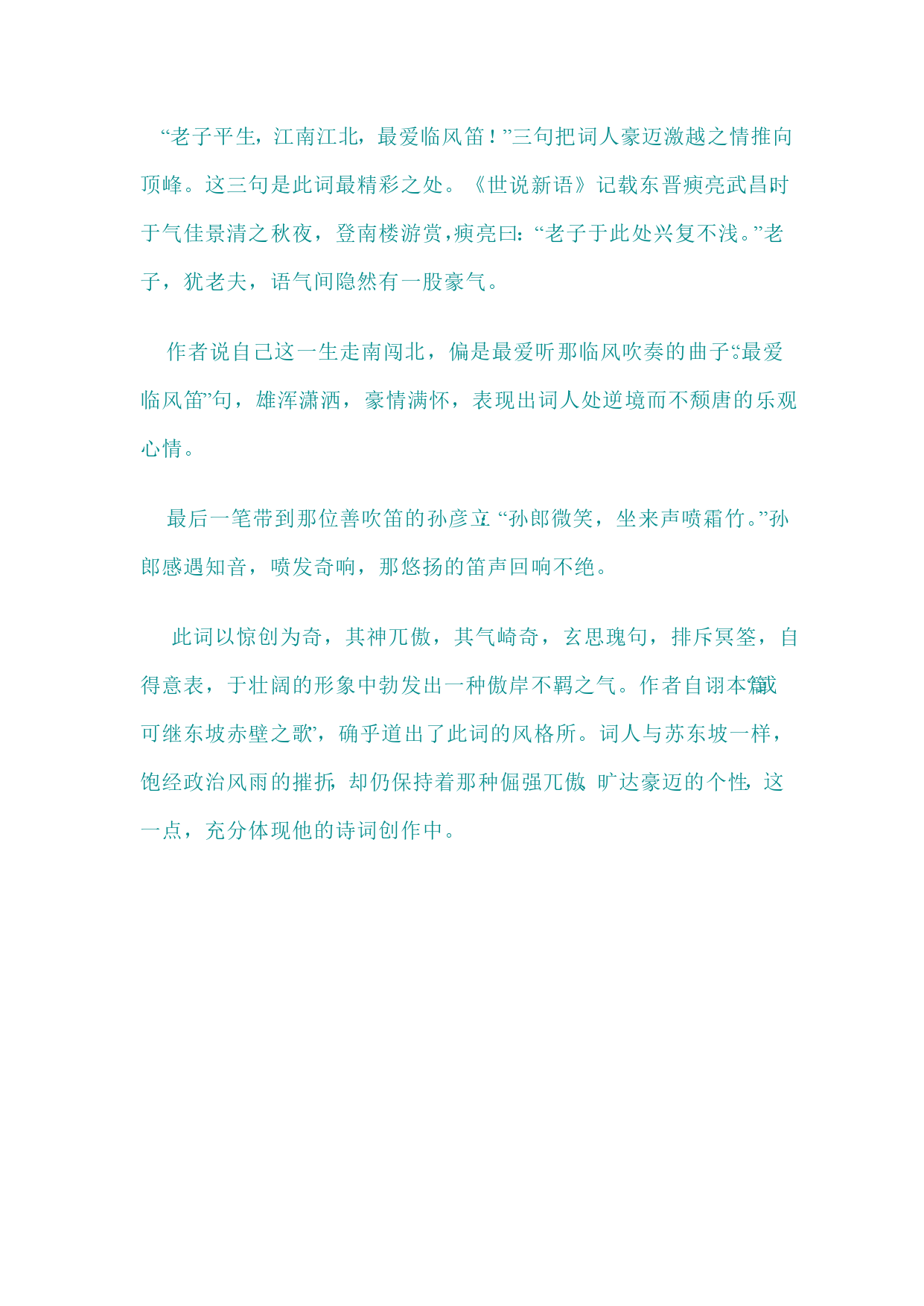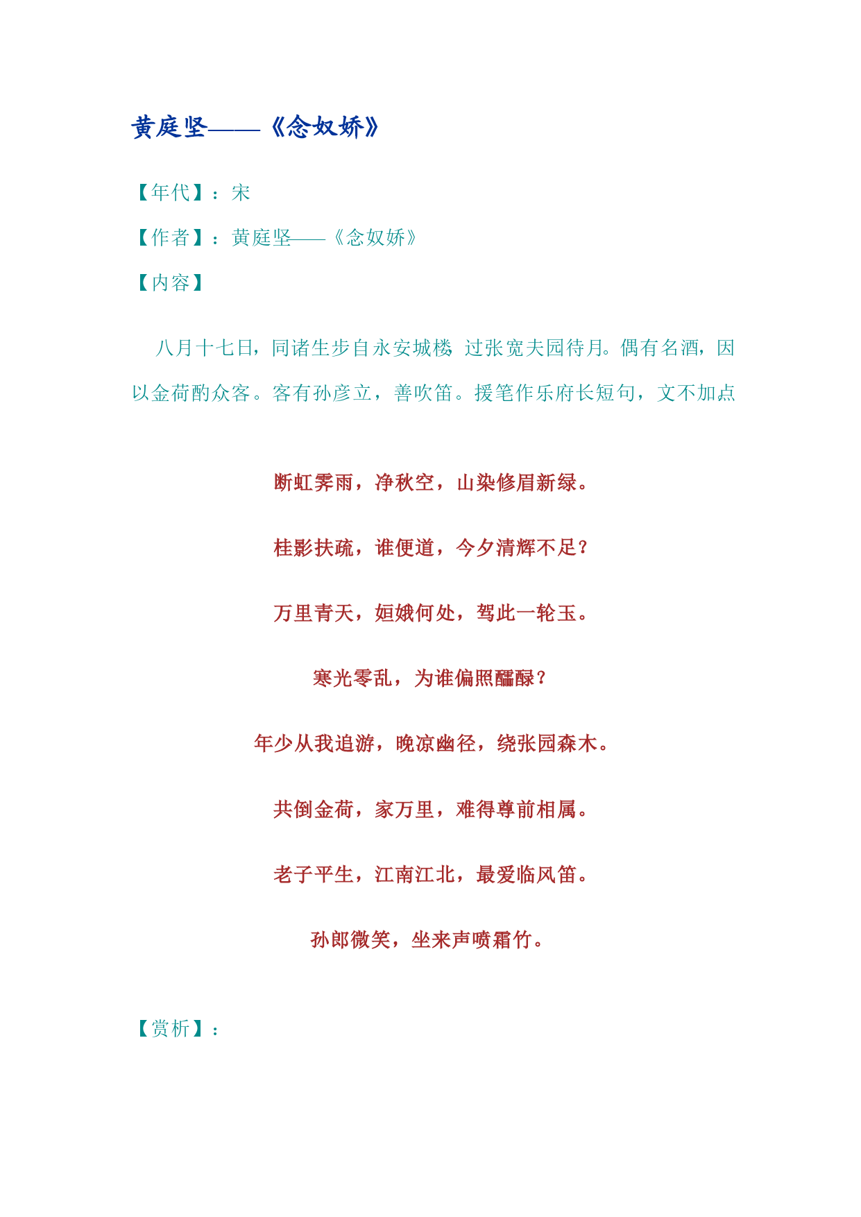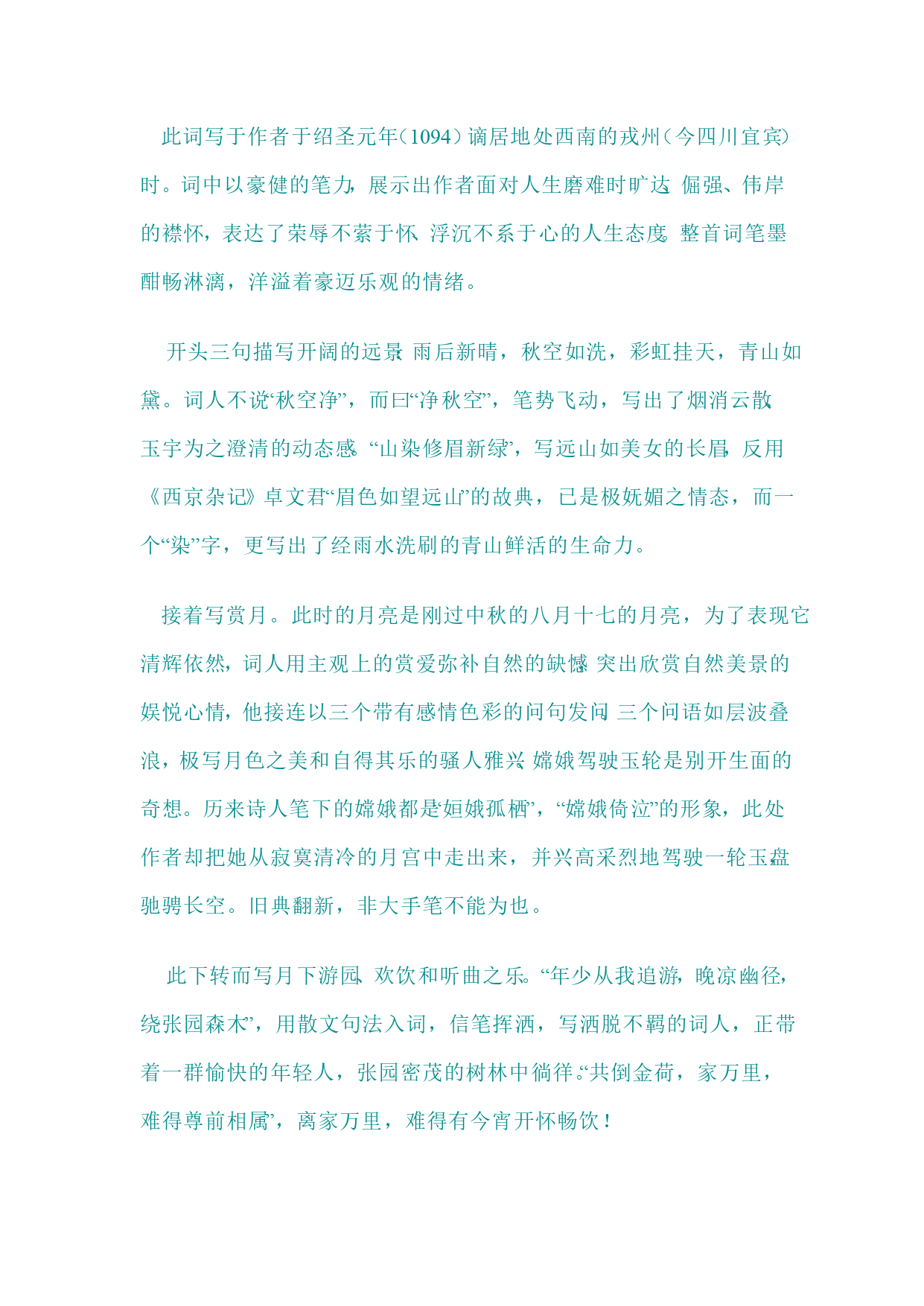 黄庭坚——《念奴娇》 【年代】:宋【作者】:黄庭坚——《念奴娇》【内容】 八月十七日,同诸生步自永安城楼,过张宽夫园待月。偶有名酒,因以金荷酌众客。客有孙彦立,善吹笛。援笔作乐府长短句,文不加点。 断虹霁雨,净秋空,山染修眉新绿。 桂影扶疏,谁便道,今夕清辉不足? 万里青天,姮娥何处,驾此一轮玉。 寒光零乱,为谁偏照醽醁? 年少从我追游,晚凉幽径,绕张园森木。 共倒金荷,家万里,难得尊前相属。 老子平生,江南江北,最爱临风笛。 孙郎微笑,坐来声喷霜竹。 【赏析】: 此词写于作者于绍圣元年(1094)谪居地处西南的戎州(今四川宜宾)时。词中以豪健的笔力,展示出作者面对人生磨难时旷达、倔强、伟岸的襟怀,表达了荣辱不萦于怀、浮沉不系于心的人生态度。整首词笔墨酣畅淋漓,洋溢着豪迈乐观的情绪。 开头三句描写开阔的远景:雨后新晴,秋空如洗,彩虹挂天,青山如黛。词人不说“秋空净”,而曰“净秋空”,笔势飞动,写出了烟消云散、玉宇为之澄清的动态感。“山染修眉新绿”,写远山如美女的长眉,反用《西京杂记》卓文君“眉色如望远山”的故典,已是极妩媚之情态,而一个“染”字,更写出了经雨水洗刷的青山鲜活的生命力。 接着写赏月。此时的月亮是刚过中秋的八月十七的月亮,为了表现它清辉依然,词人用主观上的赏爱弥补自然的缺憾,突出欣赏自然美景的娱悦心情,他接连以三个带有感情色彩的问句发问。三个问语如层波叠浪,极写月色之美和自得其乐的骚人雅兴。嫦娥驾驶玉轮是别开生面的奇想。历来诗人笔下的嫦娥都是“姮娥孤栖”,“嫦娥倚泣”的形象,此处作者却把她从寂寞清冷的月宫中走出来,并兴高采烈地驾驶一轮玉盘,驰骋长空。旧典翻新,非大手笔不能为也。 此下转而写月下游园、欢饮和听曲之乐。“年少从我追游,晚凉幽径,绕张园森木”,用散文句法入词,信笔挥洒,写洒脱不羁的词人,正带着一群愉快的年轻人,张园密茂的树林中徜徉。“共倒金荷,家万里,难得尊前相属”,离家万里,难得有今宵开怀畅饮! “老子平生,江南江北,最爱临风笛!”三句把词人豪迈激越之情推向顶峰。这三句是此词最精彩之处。《世说新语》记载东晋瘐亮武昌时,于气佳景清之秋夜,登南楼游赏,瘐亮曰:“老子于此处兴复不浅。”老子,犹老夫,语气间隐然有一股豪气。 作者说自己这一生走南闯北,偏是最爱听那临风吹奏的曲子。“最爱临风笛”句,雄浑潇洒,豪情满怀,表现出词人处逆境而不颓唐的乐观心情。 最后一笔带到那位善吹笛的孙彦立:“孙郎微笑,坐来声喷霜竹。”孙郎感遇知音,喷发奇响,那悠扬的笛声回响不绝。 此词以惊创为奇,其神兀傲,其气崎奇,玄思瑰句,排斥冥筌,自得意表,于壮阔的形象中勃发出一种傲岸不羁之气。作者自诩本篇“或可继东坡赤壁之歌”,确乎道出了此词的风格所。词人与苏东坡一样,饱经政治风雨的摧折,却仍保持着那种倔强兀傲、旷达豪迈的个性,这一点,充分体现他的诗词创作中。
