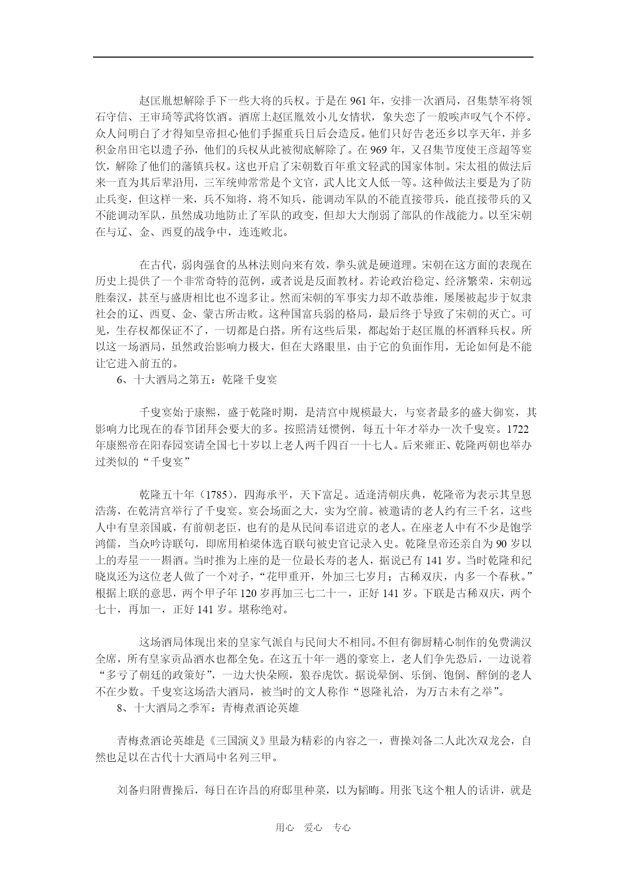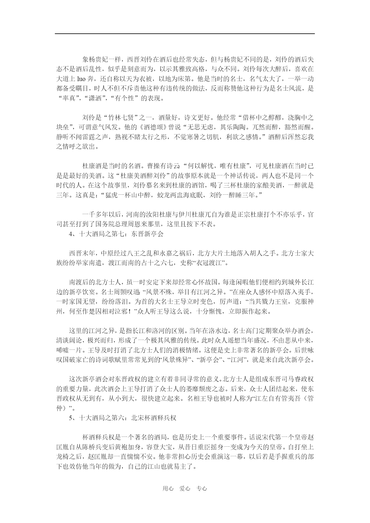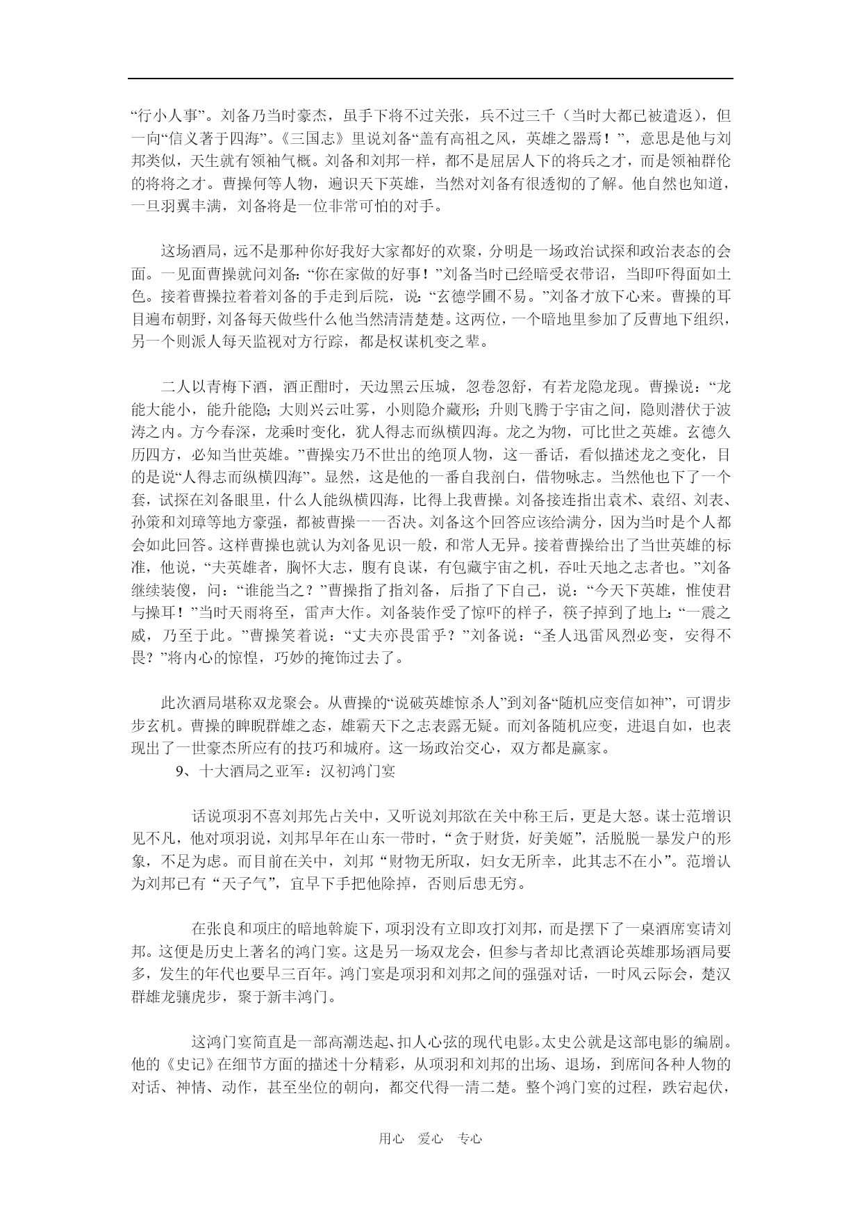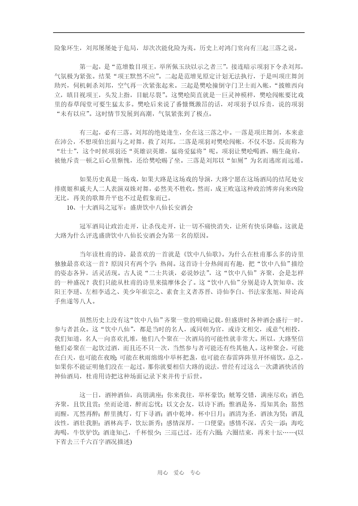 用心爱心专心 扭转乾坤的历史10大饭局 1、十大酒局之第十:醉打金枝 醉打金枝是“酒壮怂人胆”的典型例子。与醉打金枝相关的酒局实际上是一次家宴。醉打金枝的故事讲的是唐朝名将郭子仪的儿子郭暧在家宴后,借酒壮胆而痛打老婆升平公主的故事。 且说升平公主嫁到郭家后,不改往日金枝玉叶的做派,动不动对丈夫和公婆发脾气。一般说来,中国传统社会里媳妇见了公婆是要行大礼的,但公主是皇帝女儿,是君,公婆虽是长辈也是臣,所以那时郭子仪夫妇反过来要向公主下跪。 郭暧对此十分不满,公婆尚且向公主行礼,自己岂非矮了两辈下去?平日在颐指气使的公主面前他倒也不敢有所造次。这天,郭暧心里不爽,在家宴上多喝了几杯。当即要求升平公主应该遵守妇道,给郭子仪夫妇行下跪礼,结果被升平公主严词拒绝并遭到当面训斥。此时,这酒是壮胆药,这酒是忘情水,喝高了的郭暧借着酒劲,也不顾昔日情分,把公主拖回卧室饱以一顿老拳,打的公主满脸开桃花。这可不得了,公主立即回到娘家皇宫大院里找自己的爹爹代宗皇帝去哭诉。郭子仪连忙把儿子捆起来送到皇宫请罪。最后,在皇帝和郭子仪的调停下,小夫妻才和好如初。 这个郭暧为天下所有惧内男人出了口恶气。俗话说,小夫妻打架不记仇。尽管这场家庭纠纷闹腾的动静儿挺大,结果却皆大欢喜,郭暧和升平公主的感情从此反而加深不少,天天共效于飞。这升平公主从此变得贤淑无比,有不少世人称赞的事迹流传下来。仔细思量,要不是那场家庭酒局,要不是那顿老拳,怎会有这样欢天喜地的大结局?我们要坚决反对家庭暴力,但有时也不得不承认拳头的教育作用啊。所以建议衮衮诸公,家中若有河东狮吼,不妨领贵夫人去老舍茶馆看场京戏《打金枝》,当然,不要忘了掂瓶二锅头壮行。 2、十大酒局之第九:贵妃醉酒 贵妃醉酒历来被公推为中国传统四大美人图之一。在此次酒局中,杨贵妃美中见醉,醉中见美,与太监宫女们演了一出好戏。这是十大酒局中唯一的美人酒局,而且是唯一以女子为主角的酒局,所以不可不选。 却说这天傍晚,皇宫院内凉风习习,皓月当空。唐玄宗与杨贵妃本来相约在百花亭品酒赏花,届时玄宗却没有赴约,而是移驾到西宫与梅妃共度良宵。良辰美景奈何天,虽然景色撩人欲醉,杨贵妃也只好在花前月下闷闷独饮,喝了一会不觉沉醉,边饮边舞,嘴里念叨着“李二郎你枉为人君,说话不算数……”万般春情,此时竟难自排遣,加以酒入愁肠,立时便醉。一时春情萌动不能自持,竟至忘乎所以,面对高力士等一干太监宫女,杨贵妃频频作出种种求欢猥亵状,倦极才怏怏回宫。 《贵妃醉酒》是出著名的京戏。据说《贵妃醉酒》最早的版本是昆曲。原曲目中杨贵妃大醉后自赏怀春,轻解罗衣,春光乍泻。当然高力士们不解这种风情,倒也无伤大雅。后来梅兰芳同志亲自出手,以霹雳手段对这部作品做了“去污化处理”,所有少儿不宜内容统统被切掉了。于是,《贵妃醉酒》也就从当初的三级片变成了今日8岁以上孩童也可观赏的正剧。 3、十大酒局之第八:杜康美酒醉刘伶 象杨贵妃一样,西晋刘伶在酒后也经常失态,但与杨贵妃不同的是,刘伶的酒后失态不是酒后乱性,似乎是刻意而为,以示其雅致高格,与众不同。刘伶每次大醉后,喜欢在大道上luo奔,还自称以天为衣被,以地为床第。他是当时的名士,名气太大了,一举一动都备受瞩目,时人不但不斥责他这种有违传统的做法,反而称赞他这种行为是名士风流,是“率真”,“潇洒”,“有个性”的表现。 刘伶是“竹林七贤”之一,酒量好,诗文更好。他经常“借杯中之醇醪,浇胸中之块垒”,可谓意气风发。他的《酒德颂》曾说“无思无虑,其乐陶陶。兀然而醉,豁然而醒。静听不闻雷霆之声,熟视不睹太行之形,不觉寒暑之切肌,利欲之感情。”酒醉后浑然忘我之情呼之欲出。 杜康酒是当时的名酒。曹操有诗云:“何以解忧,唯有杜康”,可见杜康酒在当时已是是最好的美酒。这“杜康美酒醉刘伶”的故事原本就是一个神话传说,两人也不是同一个时代的人。在这个故事里,刘伶慕名来到杜康的酒馆,喝了三杯杜康的家酿美酒,一醉就是三年。这真是:“猛虎一杯山中醉,蛟龙两盅海底眠,刘伶一醉睡三年。” 一千多年以后,河南的汝阳杜康与伊川杜康兀自为谁是正宗杜康打个不亦乐乎,官司甚至打到了国务院总理周恩来那里,这里且按下不表。 4、十大酒局之第七:东晋新亭会西晋末年,中原经过八王之乱和永嘉之祸后,北方大片土地落入胡人之手。北方士家大族纷纷举家南遣,渡江而南的占十之六七,史称“衣冠渡江”。南渡后的北方士人,虽一时安定下来却经常心怀故国。每逢闲暇他们便相约到城外长江边的新亭饮宴。名士周顗叹道:“风景不殊,举目有江河之异。”在座众人感怀中原落入夷手,一时家国无望,纷纷落泪。为首的大名士王导立时变色,厉声道:“当共戮力王室,克服神州,何至作楚囚相对泣邪!”众人听王导这么说,十分惭愧,立即振作起来。这里的江河之异,是指长江和洛河的区别。当年在洛
