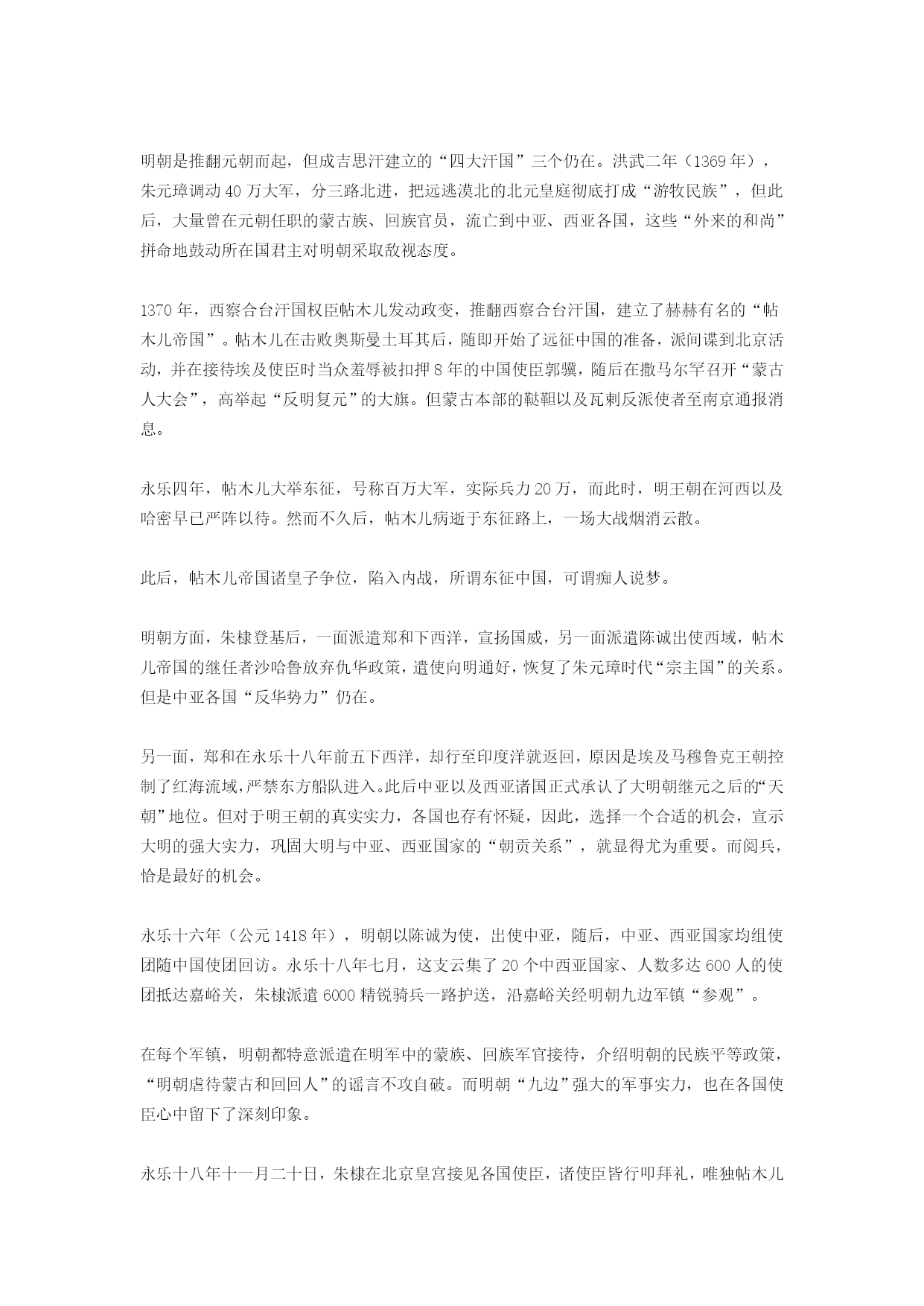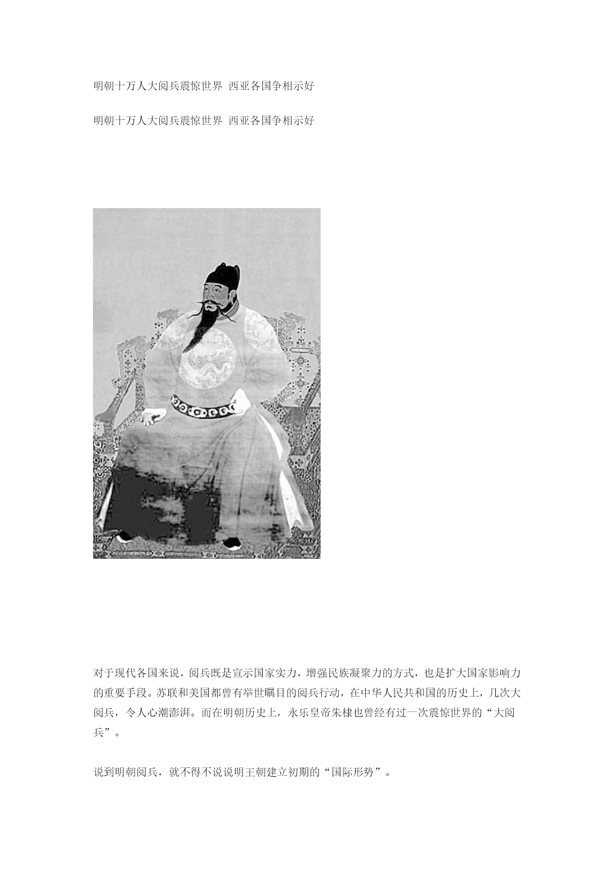 明朝十万人大阅兵震惊世界西亚各国争相示好 明朝十万人大阅兵震惊世界西亚各国争相示好 HYPERLINK"http://forum.book.sina.com.cn/attachment.php?aid=7270¬humb=yes"\t"_blank"1009朱棣.jpg(27.67KB) 2009-10-915:24 对于现代各国来说,阅兵既是宣示国家实力,增强民族凝聚力的方式,也是扩大国家影响力的重要手段。苏联和美国都曾有举世瞩目的阅兵行动,在中华人民共和国的历史上,几次大阅兵,令人心潮澎湃。而在明朝历史上,永乐皇帝朱棣也曾经有过一次震惊世界的“大阅兵”。说到明朝阅兵,就不得不说说明王朝建立初期的“国际形势”。明朝是推翻元朝而起,但成吉思汗建立的“四大汗国”三个仍在。洪武二年(1369年),朱元璋调动40万大军,分三路北进,把远逃漠北的北元皇庭彻底打成“游牧民族”,但此后,大量曾在元朝任职的蒙古族、回族官员,流亡到中亚、西亚各国,这些“外来的和尚”拼命地鼓动所在国君主对明朝采取敌视态度。1370年,西察合台汗国权臣帖木儿发动政变,推翻西察合台汗国,建立了赫赫有名的“帖木儿帝国”。帖木儿在击败奥斯曼土耳其后,随即开始了远征中国的准备,派间谍到北京活动,并在接待埃及使臣时当众羞辱被扣押8年的中国使臣郭骥,随后在撒马尔罕召开“蒙古人大会”,高举起“反明复元”的大旗。但蒙古本部的鞑靼以及瓦剌反派使者至南京通报消息。永乐四年,帖木儿大举东征,号称百万大军,实际兵力20万,而此时,明王朝在河西以及哈密早已严阵以待。然而不久后,帖木儿病逝于东征路上,一场大战烟消云散。此后,帖木儿帝国诸皇子争位,陷入内战,所谓东征中国,可谓痴人说梦。明朝方面,朱棣登基后,一面派遣郑和下西洋,宣扬国威,另一面派遣陈诚出使西域,帖木儿帝国的继任者沙哈鲁放弃仇华政策,遣使向明通好,恢复了朱元璋时代“宗主国”的关系。但是中亚各国“反华势力”仍在。另一面,郑和在永乐十八年前五下西洋,却行至印度洋就返回,原因是埃及马穆鲁克王朝控制了红海流域,严禁东方船队进入。此后中亚以及西亚诸国正式承认了大明朝继元之后的“天朝”地位。但对于明王朝的真实实力,各国也存有怀疑,因此,选择一个合适的机会,宣示大明的强大实力,巩固大明与中亚、西亚国家的“朝贡关系”,就显得尤为重要。而阅兵,恰是最好的机会。永乐十六年(公元1418年),明朝以陈诚为使,出使中亚,随后,中亚、西亚国家均组使团随中国使团回访。永乐十八年七月,这支云集了20个中西亚国家、人数多达600人的使团抵达嘉峪关,朱棣派遣6000精锐骑兵一路护送,沿嘉峪关经明朝九边军镇“参观”。在每个军镇,明朝都特意派遣在明军中的蒙族、回族军官接待,介绍明朝的民族平等政策,“明朝虐待蒙古和回回人”的谣言不攻自破。而明朝“九边”强大的军事实力,也在各国使臣心中留下了深刻印象。永乐十八年十一月二十日,朱棣在北京皇宫接见各国使臣,诸使臣皆行叩拜礼,唯独帖木儿国使臣以“我国无此风俗”为由,坚持行鞠躬礼,朱棣却并不在意。这次帖木儿使团的首领是帖木儿帝国宰相阿尔都沙,副使是曾跟随帖木的名将盖苏耶丁,在本国也是免跪拜礼的。外交礼仪后,朱棣安排使团先是在山东、河南、江苏“旅游观光”,游览包括山东孔庙在内的诸多名胜古迹,亲眼见识中国内地城市的富庶繁华,两个月后,各国使团接到通知,朱棣将在北京周边开始大规模的“狩猎”,邀请各国使团前往观览。永乐十九年三月,“狩猎”在北京北边的怀来正式开始,共调军队10万人,朱棣精心挑选的明朝“五军营”、“三千营”、“神机营”精锐相继表演了明军骑兵包抄、步兵突击、步骑合击等项目,从广西、云南、四川调来的“土狼兵”、白杆兵演练了步兵劲弩齐射、长枪步兵刺杀训练等“军事科目”。史载“军容齐整”、“步调如一”、“兵甲鲜艳”,“列国使节俱惊”,尤其是明朝“神机营”的火器操练,展示的“虎威炮”、“火龙枪”(骑兵专用火枪)、安南铳(抬枪)、“一窝蜂”(火箭炮)、“火龙车”(火焰喷射器)等诸多“高科技”武器,令各国使节大开眼界。大规模的“狩猎”行动持续了整整一个月。阅兵结束后,朱棣在土木堡的行营接见了各国使节。这一次,帖木儿国使臣带头下跪磕头,“叩首触地”,全然不顾“我国无此风俗”。帖木儿使臣更奉承说,这次帖木儿进献的名马,正是当年帖木儿国王的父亲帖木儿生前南征北战专用的“御用坐骑”,赠送给朱棣,正是为了表达“最崇高敬意”。朱棣则手书信札托使臣转交帖木儿国王,在信中表示“愿两国臣民永享太平安乐之福”。这次声势浩大的阅兵无疑取得了良好效果,这次“观礼”的各国使节,总数达27个国家。明朝军威之盛与睦邻友好的国策在各国引起了巨大反响。其后中亚、西亚国家与中国的友好关系一直绵延到明末,单是帖木儿帝国,终明一世向中国派遣使节的次数就有60多次。