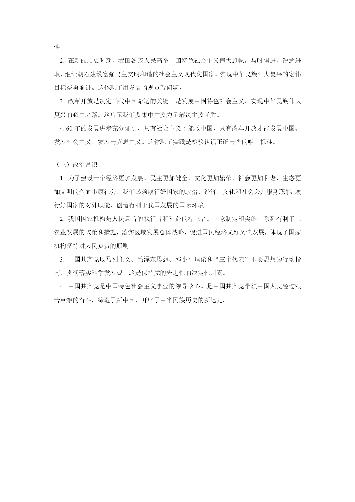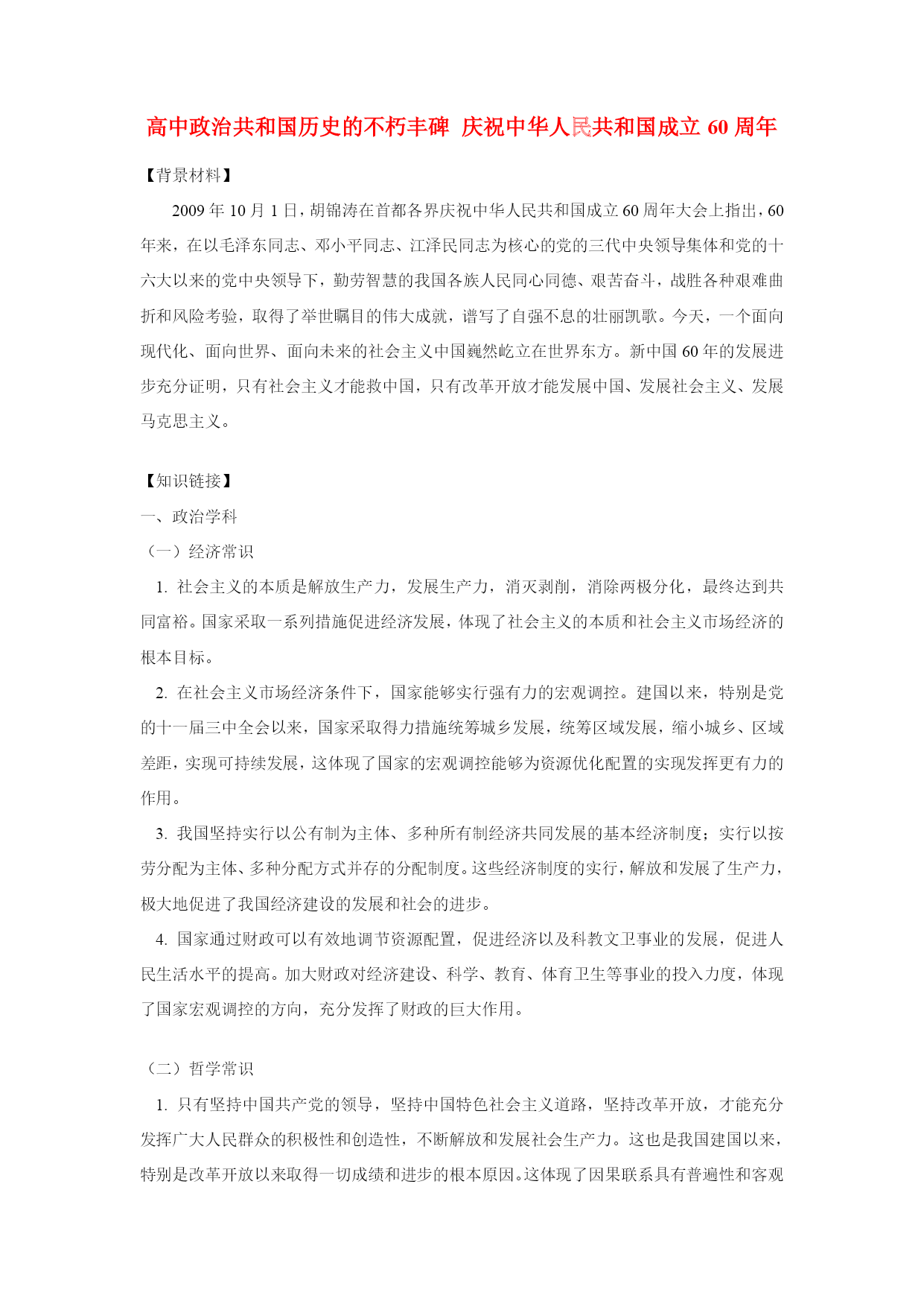 高中政治共和国历史的不朽丰碑庆祝中华人民共和国成立60周年 【背景材料】 2009年10月1日,胡锦涛在首都各界庆祝中华人民共和国成立60周年大会上指出,60年来,在以毛泽东同志、邓小平同志、江泽民同志为核心的党的三代中央领导集体和党的十六大以来的党中央领导下,勤劳智慧的我国各族人民同心同德、艰苦奋斗,战胜各种艰难曲折和风险考验,取得了举世瞩目的伟大成就,谱写了自强不息的壮丽凯歌。今天,一个面向现代化、面向世界、面向未来的社会主义中国巍然屹立在世界东方。新中国60年的发展进步充分证明,只有社会主义才能救中国,只有改革开放才能发展中国、发展社会主义、发展马克思主义。 【知识链接】 一、政治学科 (一)经济常识 1.社会主义的本质是解放生产力,发展生产力,消灭剥削,消除两极分化,最终达到共同富裕。国家采取一系列措施促进经济发展,体现了社会主义的本质和社会主义市场经济的根本目标。 2.在社会主义市场经济条件下,国家能够实行强有力的宏观调控。建国以来,特别是党的十一届三中全会以来,国家采取得力措施统筹城乡发展,统筹区域发展,缩小城乡、区域差距,实现可持续发展,这体现了国家的宏观调控能够为资源优化配置的实现发挥更有力的作用。 3.我国坚持实行以公有制为主体、多种所有制经济共同发展的基本经济制度;实行以按劳分配为主体、多种分配方式并存的分配制度。这些经济制度的实行,解放和发展了生产力,极大地促进了我国经济建设的发展和社会的进步。 4.国家通过财政可以有效地调节资源配置,促进经济以及科教文卫事业的发展,促进人民生活水平的提高。加大财政对经济建设、科学、教育、体育卫生等事业的投入力度,体现了国家宏观调控的方向,充分发挥了财政的巨大作用。 (二)哲学常识 1.只有坚持中国共产党的领导,坚持中国特色社会主义道路,坚持改革开放,才能充分发挥广大人民群众的积极性和创造性,不断解放和发展社会生产力。这也是我国建国以来,特别是改革开放以来取得一切成绩和进步的根本原因。这体现了因果联系具有普遍性和客观性。 2.在新的历史时期,我国各族人民高举中国特色社会主义伟大旗帜,与时俱进,锐意进取,继续朝着建设富强民主文明和谐的社会主义现代化国家、实现中华民族伟大复兴的宏伟目标奋勇前进。这体现了用发展的观点看问题。 3.改革开放是决定当代中国命运的关键,是发展中国特色社会主义、实现中华民族伟大复兴的必由之路。这启示我们要集中主要力量解决主要矛盾。 4.60年的发展进步充分证明,只有社会主义才能救中国,只有改革开放才能发展中国、发展社会主义、发展马克思主义。这体现了实践是检验认识正确与否的唯一标准。 (三)政治常识 1.为了建设一个经济更加发展、民主更加健全、文化更加繁荣、社会更加和谐、生态更加文明的全面小康社会,我们必须履行好国家的政治、经济、文化和社会公共服务职能;履行好国家的对外职能,创造有利于我国发展的国际环境。 2.我国国家机构是人民意旨的执行者和利益的捍卫者。国家制定和实施一系列有利于工农业发展的政策和措施,落实区域发展总体战略,促进国民经济又好又快发展,体现了国家机构坚持对人民负责的原则。 3.中国共产党以马列主义、毛泽东思想、邓小平理论和“三个代表”重要思想为行动指南,贯彻落实科学发展观,这是保持党的先进性的决定性因素。 4.中国共产党是中国特色社会主义事业的领导核心。是中国共产党带领中国人民经过艰苦卓绝的奋斗,缔造了新中国,开辟了中华民族历史的新纪元。