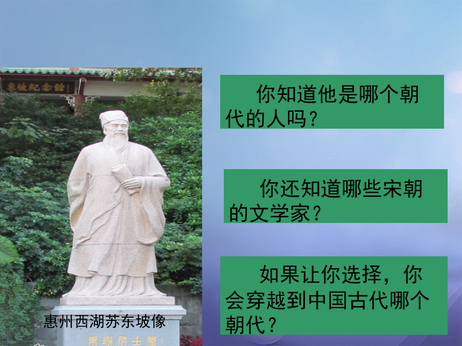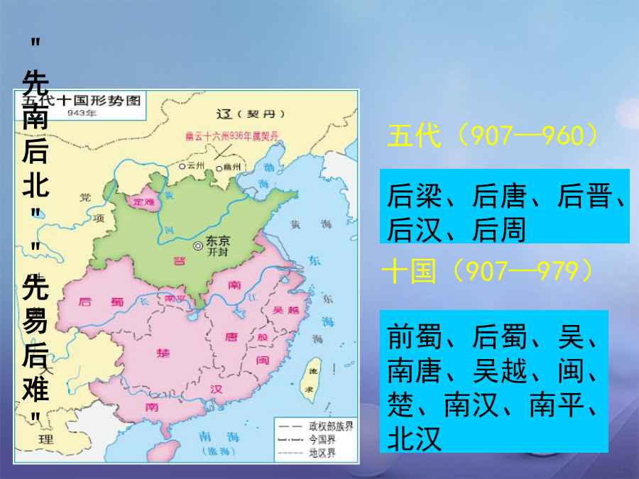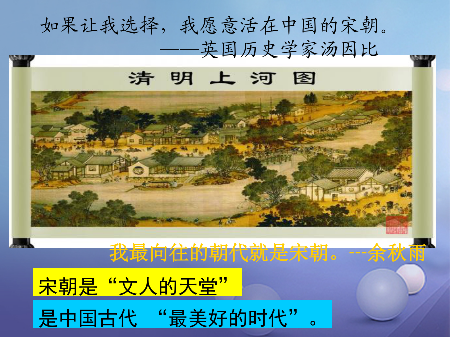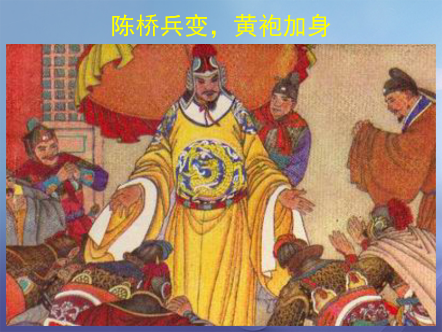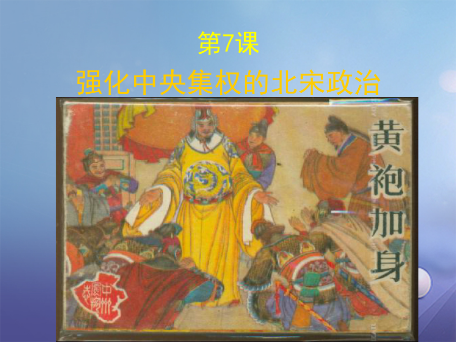 第7课 强化中央集权的北宋政治惠州西湖苏东坡像如果让我选择,我愿意活在中国的宋朝。 ——英国历史学家汤因比五代(907—960)陈桥兵变,黄袍加身一、披上一件黄袍——得天下先南后北 、 先易后难"1.北宋建立材料:太祖问赵普:“从唐末以来的数十年里,帝王已经换了十个姓氏了,战争频繁不休,人民生活在水深火热之中,这是什么原因呢?朕想结束天下的战争,使国家长治久安,如何才能做到?” ——(宋)李焘撰: 《续资治通鉴长编卷二·太祖建隆二年》归纳北宋加强中央集权的主要措施。学名:长翅帽材料:太祖、太宗平一海内,惩累朝藩镇跋扈,尽收天下劲兵……是以天下晏然(安宁),逾百年而无犬吠之惊(内乱),此制兵得其道也。 ——(元)马端临:《文献通考》材料:本朝鉴五代藩镇之弊,遂尽夺藩镇之权。兵也收了,财也收了,赏罚刑政,一切收了,州郡遂日就困弱,靖康之役(北宋灭亡的标志),虏骑(少数民族骑兵)所过,莫不溃散。 ——(南宋)朱熹:《朱子语类》①设转运使管理地方财权我最向往的朝代就是宋朝。 ——余秋雨【自主学习】(宋太祖)因谓(赵)普曰:“五代方镇残虐,民受其祸,朕今选儒臣干事者百余,分治大藩,纵皆贪浊(贪污受贿),亦未及武臣一人(的祸害)也。” ——(宋)李焘撰: 《续资治通鉴长编》卷十三宋代科举图时代宋朝的建立 加强中央集权 的举措 重文轻武的 国策