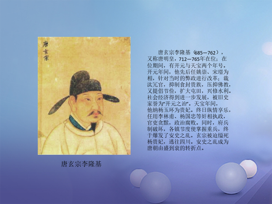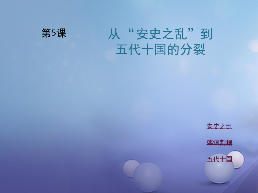 第5课安史之乱唐玄宗李隆基杨玉环华清池九龙湖(陕西西安临潼区)安禄山马嵬驿(今陕西兴平境内)郭子仪(安)禄山叛逆,遽陷两京。肃宗即位灵武,而诸镇之兵共起诛贼。其后,禄山子庆绪及史思明父子继起,肃宗命李光弼等讨之,号九节度之师。大盗既灭,以功起行阵,列为侯王者,大者连州十余,小者犹兼三四。故兵骄则逐帅,帅强则叛上。或父死,子握其兵而不肯代;或取舍由于士卒,往往自择将吏,号为留后,以邀于朝。天子顾力不能制,因而抚之,谓之姑息之政。由是号令自出,以相侵击,虏其将帅,并其土地,……自国门以外,皆分裂于方镇,而唐遂亡。 ——陈傅良《历代兵制》(藩镇)部下各数万劲兵,文武将吏,擅自署置;贡赋不入于朝廷,虽称籓臣,实非王臣也。 ——《旧唐书·李怀仙传》黄巢黄巢起义纪念地黄巢入长安图黄巢陵墓朱温五代十国《旧五代史》封面五代简表政权前蜀王建墓文官像吴越王钱镠今世天子,兵强马壮则为之耳! ——《资治通鉴》卷282周世宗柴荣(周)世宗志在四方,常恐运祚速而功业不就,以王朴精究术数,一旦从容问之曰:“朕当得几年?”对曰:“陛下用心,以苍生为念,天高听卑,自当蒙福。臣固陋,辄以所学推之,三十年后非所知也。”世宗喜曰:“若如卿言,寡人当以十年开拓天下,十年养百姓,十年致太平足矣。” ——《旧五代史·后周·世宗纪》周世宗柴荣结束