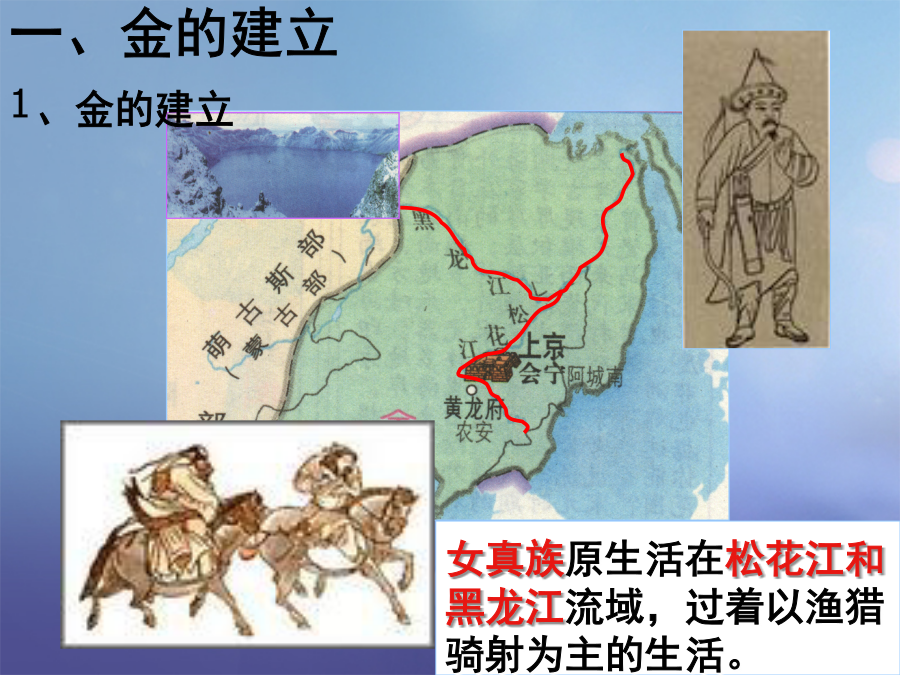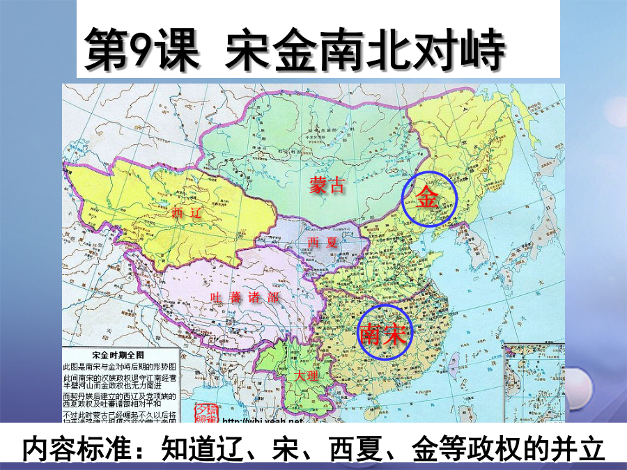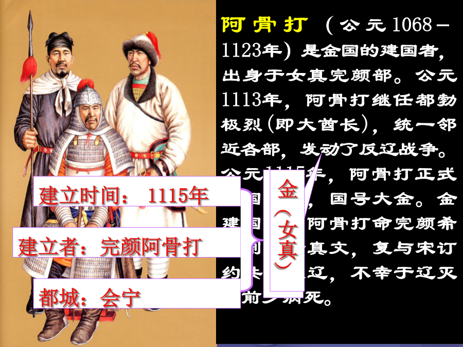 辽、西夏与北宋并立一、金的建立 1、金的建立阿骨打(公元1068-1123年)是金国的建国者,出身于女真完颜部。公元1113年,阿骨打继任都勃极烈(即大酋长),统一邻近各部,发动了反辽战争。公元1115年,阿骨打正式建国称帝,国号大金。金建国后,阿骨打命完颜希尹制作女真文,复与宋订约共同攻辽,不幸于辽灭亡前夕病死。 金与辽的关系如何?1125年,金灭辽金灭辽后发动对北宋的掠夺战争靖康之变:北宋能取得东京保卫战的 胜利,为什么还会灭亡呢?二、南宋建立与南宋的抗金斗争北方军民抗金斗争南方军民抗金斗争军法规定:凡是践踏民间禾稼、压价强买商品者,定斩不赦.1140年郾城大捷正当岳飞节节胜利、捷报频传之际,秦桧串通张浚、杨沂中等主和派大臣,唆使谏官罗振向高宗上奏说:「兵微将少,民困国乏,岳某若深入,岂不危也!愿陛下降诏,且令班师!」高宗本意就是稍胜而退,以制金人重归于和,所以他马上诏命岳飞班师。岳飞力争说:「天时人事,有利于我,功及垂成,时不再来!」为逼岳飞退兵,高宗一连发出十二道金牌,措词严厉,不容违抗。岳飞无奈,只能仰天长叹:「十年之功,废于一旦!」。宋高宗和秦桧为什么要杀害岳飞,破坏抗金的大好形势?秦桧妻 王氏意义:女真族三、金朝变革女真习俗金革习俗金革习俗政权名称归纳整合1、岳飞率领宋军打败金朝主力骑兵,取得大捷的地方是:2、岳飞在《满江红》中有“壮志饥餐胡虏肉,笑谈渴饮匈奴血”一句,这里的“匈奴”是指:3、决定宋金对峙局面形成的事件是:4、下列说法中,不正确的是:5.宋金对峙局面形成的标志是 A.郾城大捷B.南宋收复建康 C.南宋开始D.南宋与金达成和议6.下列哪一项不是岳飞抗金取胜的主要原因: A.抗金是正义斗争,得到人民支持. B.南宋统治者对岳飞信任重用 C.岳家军纪律严明,战斗力强 D.其他抗战派将领的有力配合.总结提高完成以下表格,比较宋辽和议、宋夏和议以及宋金和议的相同点以及不同点,并思考该如何评价这些和议呢?突厥李纲正当岳飞抗金取得重大胜利时,朝廷却下令班师,岳飞痛心疾首,泪流满面,说:“十年之功,废于一旦。”赵构,宋钦宗的弟弟,1127年“靖康之变”后即帝位,庙号高宗,史称宋高宗。题临安邸 山外青山楼外楼, 西湖歌舞几时休。 暖风熏得游人醉, 直把杭州作汴州。 ——林升2.东京保卫战(1126年)诗词中靖康耻指的是什么历史事件?胡虏指的是哪个民族?
