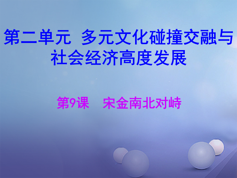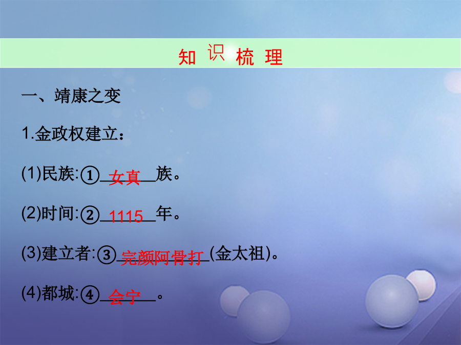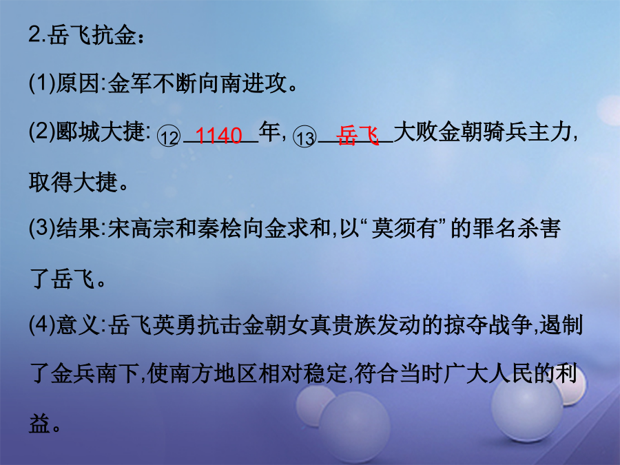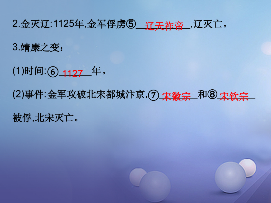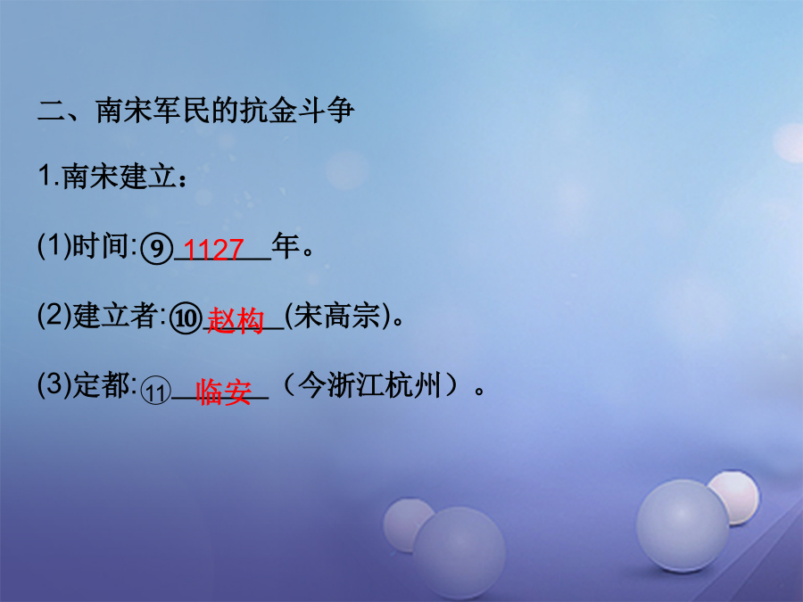 第二单元多元文化碰撞交融与社会经济高度发展2.金灭辽:1125年,金军俘虏⑤__________,辽灭亡。 3.靖康之变: (1)时间:⑥______年。 (2)事件:金军攻破北宋都城汴京,⑦_______和⑧_______被俘,北宋灭亡。二、南宋军民的抗金斗争 1.南宋建立: (1)时间:⑨______年。 (2)建立者:⑩_____(宋高宗)。 (3)定都:______(今浙江杭州)。2.岳飞抗金: (1)原因:金军不断向南进攻。 (2)郾城大捷:______年,______大败金朝骑兵主力,取得大捷。 (3)结果:宋高宗和秦桧向金求和,以“莫须有”的罪名杀害了岳飞。 (4)意义:岳飞英勇抗击金朝女真贵族发动的掠夺战争,遏制了金兵南下,使南方地区相对稳定,符合当时广大人民的利益。3.宋金和议: (1)时间:______年。 (2)内容:______对金称臣,向金送交岁贡,两国以 ______和_______为界。 (3)影响:形成______南北对峙局面。三、金朝变革女真旧俗 1.原因:为了适应对高度发展的__________统辖管理。 2.主要内容: (1)参照__________改革官制,建立起一整套中央集权行政机构。 (2)恢复发展______生产,推动手工业、商业的发展。 (3)鼓励______和______通婚,学习汉人的生活习俗。 3.作用: (1)民族融合加强。 (2)女真族日益汉化。2.中华民族的历史是由各族人民共同缔造的,各民族之间有分有合,在交流与碰撞中不断地融合。两宋时期,曾出现了宋与辽、西夏、金几个政权并立的局面。下列能正确反映南宋与少数民族政权并立的示意图是()3.我国的传统节日“腊八节”,据说是为了纪念一位著名的南宋抗金名将。当年他率领的抗金军队衣食不济、挨饿受冻,众百姓相继送粥,将士饱餐了一顿“千家粥”,结果大胜而归。这天正是农历十二月初八,所以称为“腊八节”。这位将领是() A.蒙恬 B.张骞 C.寇准 D.岳飞6.下列哪一项不是宋、辽之间,宋、夏之间,宋、金之间“议和”的共同点?() A.结束了双方大规模的战争状态 B.客观上有利于双方和平相处 C.宋王朝都要交纳岁币 D.导致南北对峙局面形成15.1141年后,我国北方经济逐渐恢复,南方经济得到发展。这主要是因为() A.南宋与金订立了和约 B.宋辽议和 C.北宋陆续消灭了各地的割据政权 D.经济重心的南移18.岳飞在《满江红》一词中写道:“靖康耻,犹未雪;臣子恨,何时灭!”“靖康耻”这一典故指的是金灭掉北宋,掳走宋徽宗和宋钦宗。此事件发生在() A.960年 B.1127年 C.1276年 D.1142年19.12世纪强大起来的金政权,先后灭掉了哪两个政权?() A.北魏、西夏 B.辽、北宋 C.辽、西夏 D.西夏、北宋