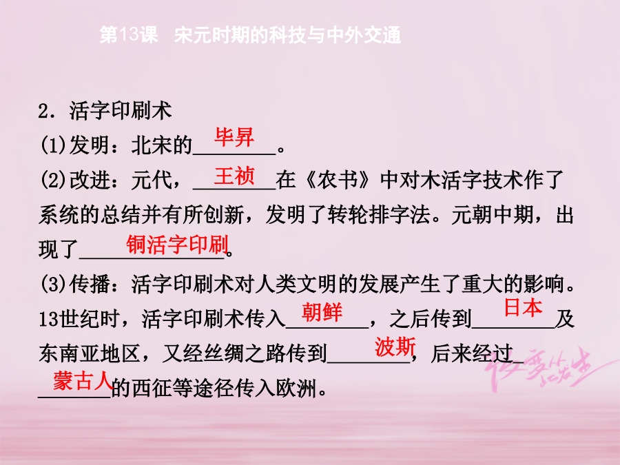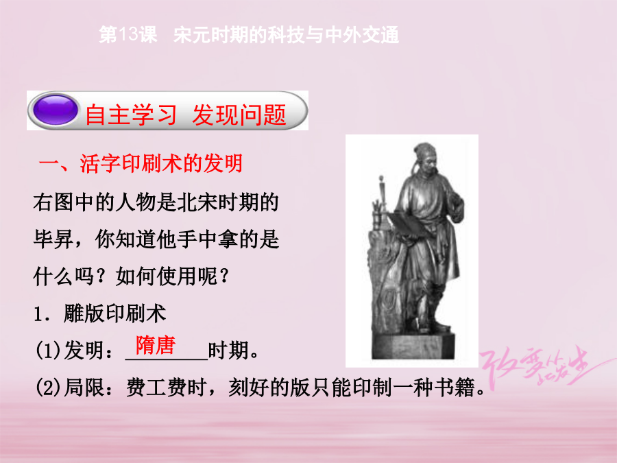 自主学习发现问题第13课宋元时期的科技与中外交通一、活字印刷术的发明 右图中的人物是北宋时期的 毕昇,你知道他手中拿的是 什么吗?如何使用呢? 1.雕版印刷术 (1)发明:________时期。 (2)局限:费工费时,刻好的版只能印制一种书籍。2.活字印刷术 (1)发明:北宋的________。 (2)改进:元代,________在《农书》中对木活字技术作了系统的总结并有所创新,发明了转轮排字法。元朝中期,出现了______________。 (3)传播:活字印刷术对人类文明的发展产生了重大的影响。13世纪时,活字印刷术传入________,之后传到________及东南亚地区,又经丝绸之路传到________,后来经过________的西征等途径传入欧洲。二、指南针、火药的应用 观察右图,你知道这是什么 仪器吗?主要用途是什么? 1.指南针 (1)司南:________时人们利用天然磁铁做成指南工具,称为“司南”。 (2)罗盘:________开始用人造磁铁制成指南的工具。人们把有磁性的钢针安置在刻有度数的盘中,制成了罗盘。 (3)运用:________末年,中国的海船上开始使用指南针。 (4)传播及影响:阿拉伯商人将指南针传到阿拉伯国家,后来又传到欧洲,大大促进了世界远洋航海技术的发展。2.火药 (1)发明:________时,中国人发明了火药。 (2)运用:到唐朝末年,火药开始运用到________领域。元朝发明了________。 (3)传播及影响:13世纪传入阿拉伯地区,14世纪初又经________人传到了欧洲。对欧洲的火器制造和作战方式产生巨大影响,推动了欧洲社会的变革。第13课宋元时期的科技与中外交通3.海路 (1)宋元时期造船和航海技术有了较大的发展。 (2)宋代海路可通往________、高丽、东南亚、________、阿拉伯等国家和地区,远至波斯湾及____________。 (3)元朝时,海上丝绸之路进入________时期。 4.作用:使中外经济、文化和科技的交流进一步发展起来。预习反馈 快来检测学习效果,判断下列观点的正误吧! (1)元代毕昇发明了活字印刷术。() (2)南宋末年,指南针在中国海船上开始使用。() (3)唐太宗在和突厥的战争中,可能使用了火药武器。() (4)中国古代四大发明经由罗马人传入西方。() (5)元朝建立后,陆路和海路交通的范围进一步扩大,开创了中外交通的新局面。() (6)元朝时海外交通发达,海上丝绸之路进入鼎盛时期。()第13课宋元时期的科技与中外交通·歌谣巧记· 四大发明意义大,汉朝造纸唐印刷。北宋毕昇活字夸,还有发明新罗盘。北宋航海用指南,唐代火药元火铳。阿拉伯人传欧洲,推动变革意义深。宋元海陆交通便,中外交流大发展。,洋人造枪把我打。宋元海陆交通便,中外交流大发展。第13课宋元时期的科技与中外交通根据素材并结合所学内容,分析宋元时期我国古代科技文化高速发展的原因。第13课宋元时期的科技与中外交通·名师点睛· 中国古代四大发明在人类文明史上的意义 ①造纸术的发明,为人类提供了经济、便利的书写材料,掀起了一场人类文字载体的革命。 ②印刷术的出现,加快了文化的传播,改变了欧洲只有上等人才能读书的状况。 ③指南针应用于航海,大大促进了世界远洋航海技术的发展,为欧洲航海家进行环球航行和发现美洲提供了重要条件,促进了世界贸易的发展。 ④火药武器的使用,结束了冷兵器战争的历史,对欧洲的火器制造和作战方式产生巨大影响,推动了欧洲社会的变革。第13课宋元时期的科技与中外交通