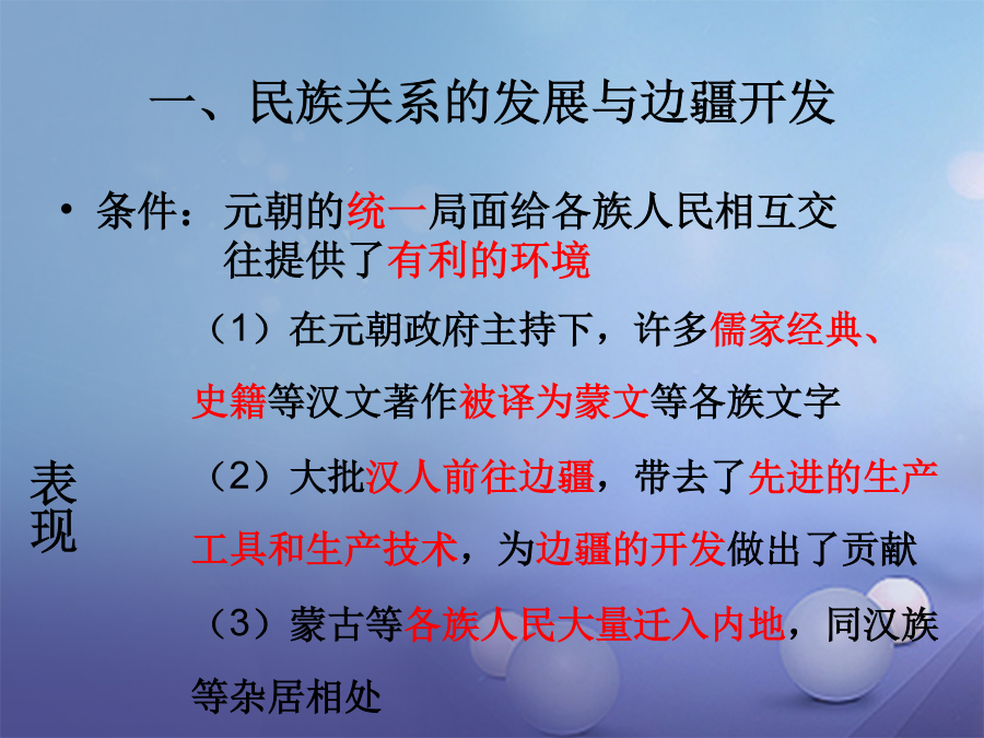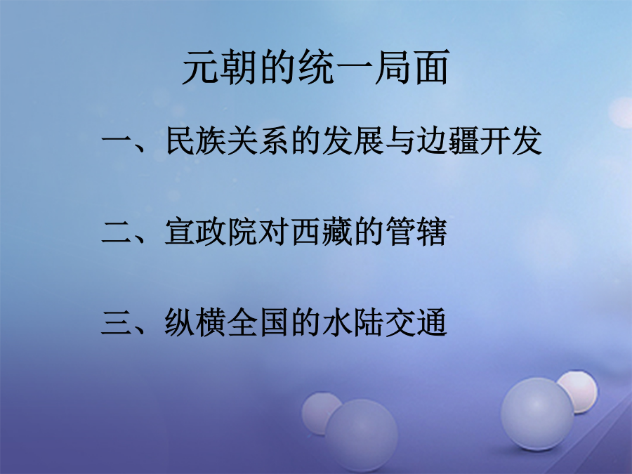 第35课元朝的统一局面元朝的统一局面一、民族关系的发展与边疆开发一、民族关系的发展与边疆开发民族融合回回民族的形成伊斯兰教二、宣政院对西藏的管辖二、宣政院对西藏的管辖三、纵横全国的水陆交通1.修浚京杭大运河隋朝和元朝运河对比元朝凿通京杭大运河,主要是为南粮北运,因此运河又被人们称作“运粮河”,不过,运河开通后,极大地方便了南北商旅的往来2.中外交通与交流中外文化交流对外贸易元朝第一港口——泉州马可.波罗课后习题