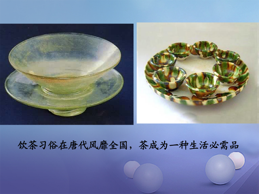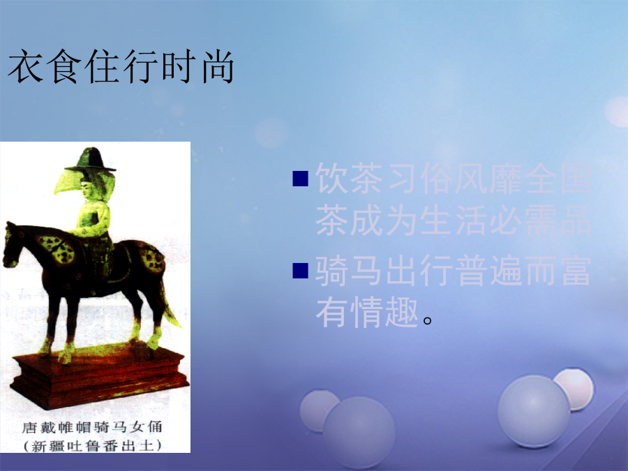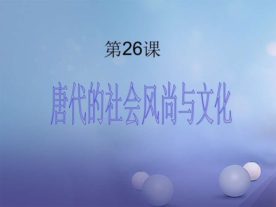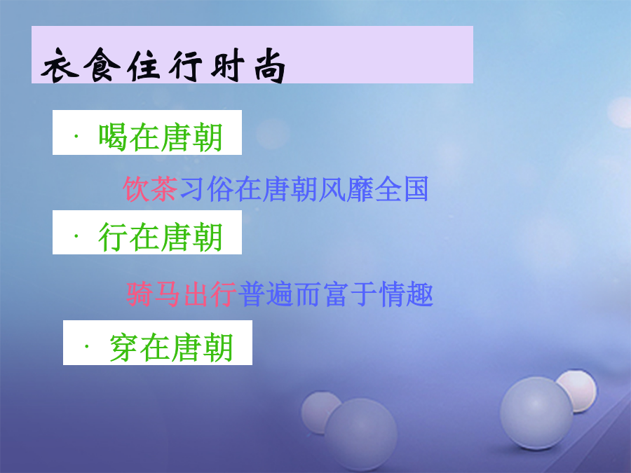 唐代的社会风尚与文化衣食住行时尚衣食住行时尚食饮茶习俗在唐代风靡全国,茶成为一种生活必需品行繁荣开放的社会生活唐朝长安人流行穿耶!唐代圆领袍衫及幞头唐朝仕女博大宏放的精神风貌博大宏放的精神风貌2、特点美国的唐人街拉美的唐人街唐朝是诗歌的黄金时代望庐山瀑布 日照香炉生紫烟, 遥看瀑布挂前川。 飞流直下三千尺, 疑是银河落九天。李白,字太白,少年好学,喜欢文学。他“一生好入名山游”,青年时即离开家乡漫游祖国的大江南北。后被唐玄宗召为文学侍从。但当时政治日渐腐败,不到两年,李白便因得罪权贵,离开了朝廷,继续漫游各地写下许多不朽的诗篇。安史之乱后,李白遭遇不幸,最后在贫困和漂泊中病逝。他的一生给后人留下了许多传奇的色彩,例如豪饮、剑术和球技,他可谓德才兼备,文武双全。杜甫(712-770),字子美,自称少陵野老,唐代伟大诗人。作品充满对祖国、对人民、对美好事物的热爱,各种诗体都写得很好,是公认的中国古代诗歌创作的典范;他本人则被尊为“诗圣”。杜甫和李白是好朋友,他们二人在中国文学史上就象两座并立的高峰。: 李白生活在盛唐时期,而且家庭也比较富有。杜甫生活在安史之乱前后唐朝由盛转衰的时代。他不仅经历了科举的挫折,而且饱受了战乱之苦,在失意和贫困中,杜甫看到了朝政的黑暗,体会到了人民生活的痛苦,饱尝了国破家亡的惨景。 “观者如山”的乐舞《霓裳羽衣曲》即《霓裳羽衣舞》,是唐代大曲中的法曲精品,唐歌舞的集大成之作。直到现在,它仍无愧于音乐舞蹈史上的一个璀璨的明珠。唐玄宗作曲。公孙大娘,盛唐时人,以舞《剑器》而闻名于世。她在民间献艺,观者如云,应邀到宫廷演出,无人能比,诗人杜甫儿时看过她的表演,几十年后都难以忘怀。敦煌莫高窟敦煌莫高窟位于甘肃省,又称为千佛洞,是我国 著名佛教石窟艺术宝库之一。现存的492个洞窟中, 大部分是隋唐时期开凿的。洞内的塑像千姿百态,神 采各异。窟内的壁画色彩鲜艳,栩栩如生。文化的繁荣归根到底是建立在国家经济繁荣,政治稳定的基础上的。作业: