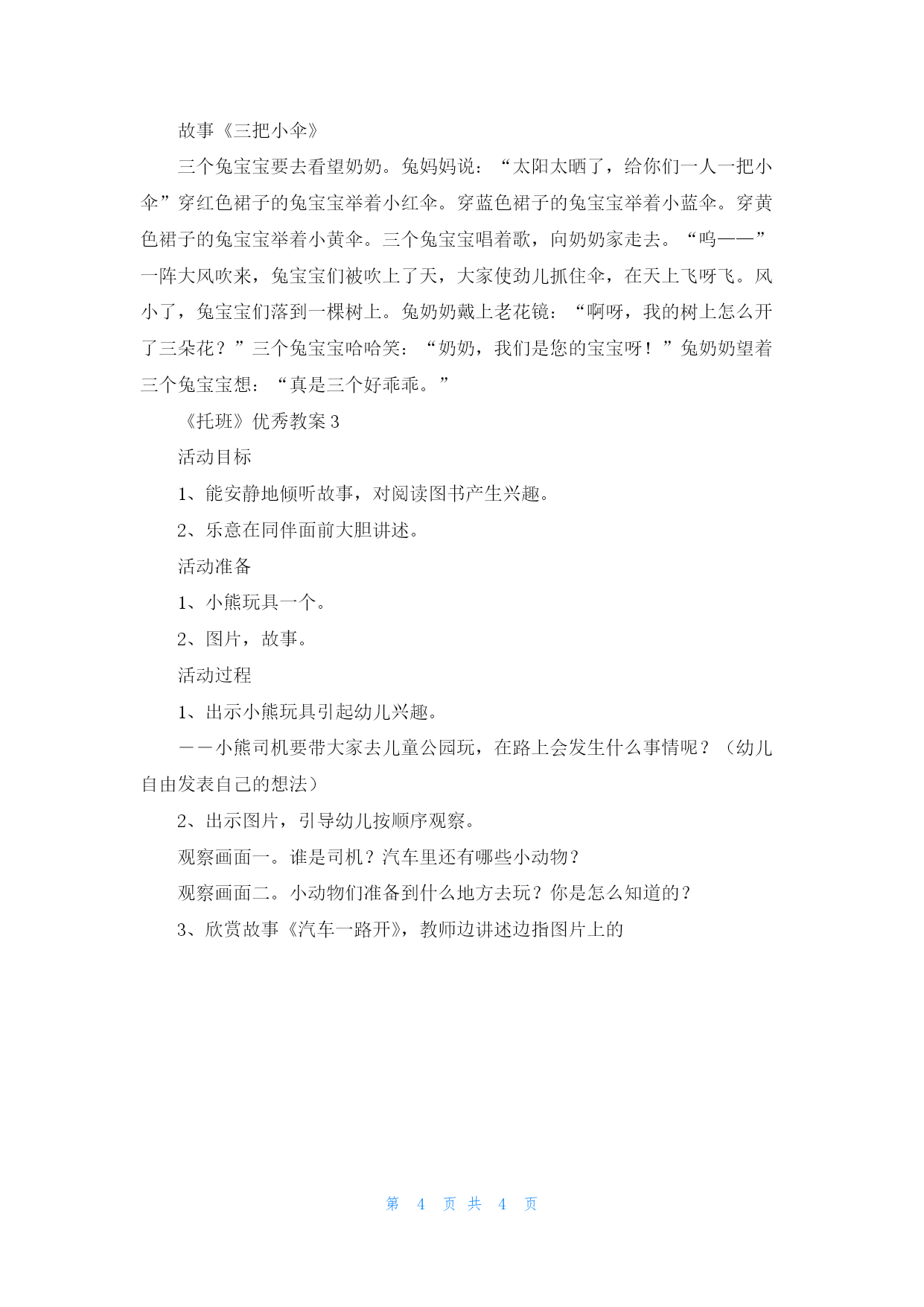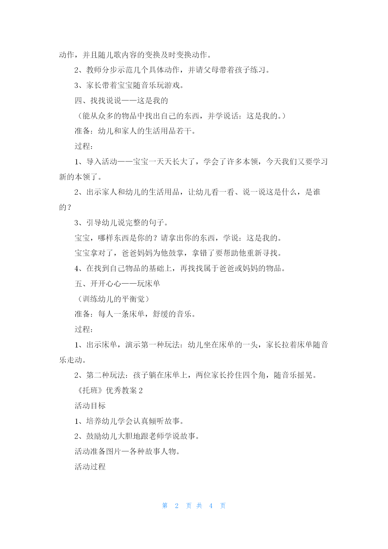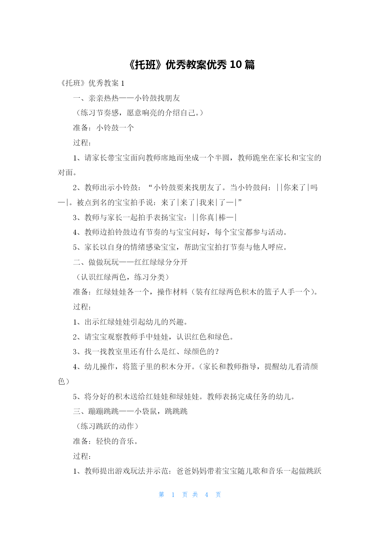 第页共NUMPAGES4页 《托班》优秀教案优秀10篇 《托班》优秀教案1一、亲亲热热——小铃鼓找朋友(练习节奏感,愿意响亮的介绍自己。)准备:小铃鼓一个过程:1、请家长带宝宝面向教师席地而坐成一个半圆,教师跪坐在家长和宝宝的对面。2、教师出示小铃鼓:“小铃鼓要来找朋友了。当小铃鼓问:||你来了|吗—|。被点到名的宝宝拍手说:来了|来了|我来|了—|”3、教师与家长一起拍手表扬宝宝:||你真|棒—|4、教师边拍铃鼓边有节奏的与宝宝问好,每个宝宝都参与活动。5、家长以自身的情绪感染宝宝,帮助宝宝拍打节奏与他人呼应。二、做做玩玩——红红绿绿分分开(认识红绿两色,练习分类)准备:红绿娃娃各一个,操作材料(装有红绿两色积木的篮子人手一个)。过程:1、出示红绿娃娃引起幼儿的兴趣。2、请宝宝观察教师手中娃娃,认识红色和绿色。3、找一找教室里还有什么是红、绿颜色的?4、幼儿操作,将篮子里的积木分开。(家长和教师指导,提醒幼儿看清颜色)5、将分好的积木送给红娃娃和绿娃娃。教师表扬完成任务的幼儿。三、蹦蹦跳跳——小袋鼠,跳跳跳(练习跳跃的动作)准备:轻快的音乐。过程:1、教师提出游戏玩法并示范:爸爸妈妈带着宝宝随儿歌和音乐一起做跳跃动作,并且随儿歌内容的变换及时变换动作。2、教师分步示范几个具体动作,并请父母带着孩子练习。3、家长带着宝宝随音乐玩游戏。四、找找说说——这是我的(能从众多的物品中找出自己的东西,并学说话:这是我的。)准备:幼儿和家人的生活用品若干。过程:1、导入活动——宝宝一天天长大了,学会了许多本领,今天我们又要学习新的本领了。2、出示家人和幼儿的生活用品,让幼儿看一看、说一说这是什么,是谁的?3、引导幼儿说完整的句子。宝宝,哪样东西是你的?请拿出你的东西,学说:这是我的。宝宝拿对了,爸爸妈妈为他鼓掌,拿错了要帮助他重新寻找。4、在找到自己物品的基础上,再找找属于爸爸或妈妈的物品。五、开开心心——玩床单(训练幼儿的平衡觉)准备:每人一条床单,舒缓的音乐。过程:1、出示床单,演示第一种玩法:幼儿坐在床单的一头,家长拉着床单随音乐走动。2、第二种玩法:孩子躺在床单上,两位家长拎住四个角,随音乐摇晃。《托班》优秀教案2活动目标1、培养幼儿学会认真倾听故事。2、鼓励幼儿大胆地跟老师学说故事。活动准备图片—各种故事人物。活动过程一、音乐歌曲导入。1、出示小白兔头饰。教师:小朋友们,上次我们给小白兔做了好吃的胡萝卜,瞧,今天它又来了,我们一起唱歌给它听,好吗?(小白兔来来来,大家一起来,跳、跳、跳跳跳。)2、幼儿跟老师一起来唱。二、讲述故事。1、教师:你们看,今天小白兔还给我们带来了一个新朋友,它是谁呢?(出示:松鼠妈妈)2、我们也来给它唱首歌好吗?(小松鼠来来来,大家一起来,跳、跳、跳跳跳。)3、今天,松鼠妈妈还带来了三个松鼠宝宝呢!她们今天要去看他们的奶奶,松鼠妈妈怕太阳晒着她们,给了她们每人一把伞。穿红裙子的小松鼠,举着小红伞。穿蓝裙子的小松鼠,举着小蓝伞。穿黄裙子的'小松鼠,举着小黄伞。三只小松鼠唱着歌,向奶奶家走去。可是她们怎么也没想到,她们会被风吹上天,可她们更没有想到她们会刚巧落在了松鼠奶奶住的那棵树上。松鼠奶奶怎么也没想到,她住的树上会“开出”三朵美丽的“小花”会是她的三个宝贝孙女!4、(出示)图书教师:刚才老师讲的故事就在这本书里,现在我们一起来看着书,听听这个故事,好吗?5、教师讲故事。三、给幼儿讲故事。1、老师这还给你们准备了好多好看的书,想看吗?2、教幼儿正确的看书姿势。3、幼儿取书,老师幼儿看书。4、配班老师给大家讲故事。四、教师小结故事《三把小伞》三个兔宝宝要去看望奶奶。兔妈妈说:“太阳太晒了,给你们一人一把小伞”穿红色裙子的兔宝宝举着小红伞。穿蓝色裙子的兔宝宝举着小蓝伞。穿黄色裙子的兔宝宝举着小黄伞。三个兔宝宝唱着歌,向奶奶家走去。“呜——”一阵大风吹来,兔宝宝们被吹上了天,大家使劲儿抓住伞,在天上飞呀飞。风小了,兔宝宝们落到一棵树上。兔奶奶戴上老花镜:“啊呀,我的树上怎么开了三朵花?”三个兔宝宝哈哈笑:“奶奶,我们是您的宝宝呀!”兔奶奶望着三个兔宝宝想:“真是三个好乖乖。”《托班》优秀教案3活动目标1、能安静地倾听故事,对阅读图书产生兴趣。2、乐意在同伴面前大胆讲述。活动准备1、小熊玩具一个。2、图片,故事。活动过程1、出示小熊玩具引起幼儿兴趣。――小熊司机要带大家去儿童公园玩,在路上会发生什么事情呢?(幼儿自由发表自己的想法)2、出示图片,引导幼儿按顺序观察。观察画面一。谁是司机?汽车里还有哪些小动物?观察画面二。小动物们准备到什么地方去玩?你是怎么知道的?3、欣赏故事《汽车一路开》,教师边讲述边指图片上的