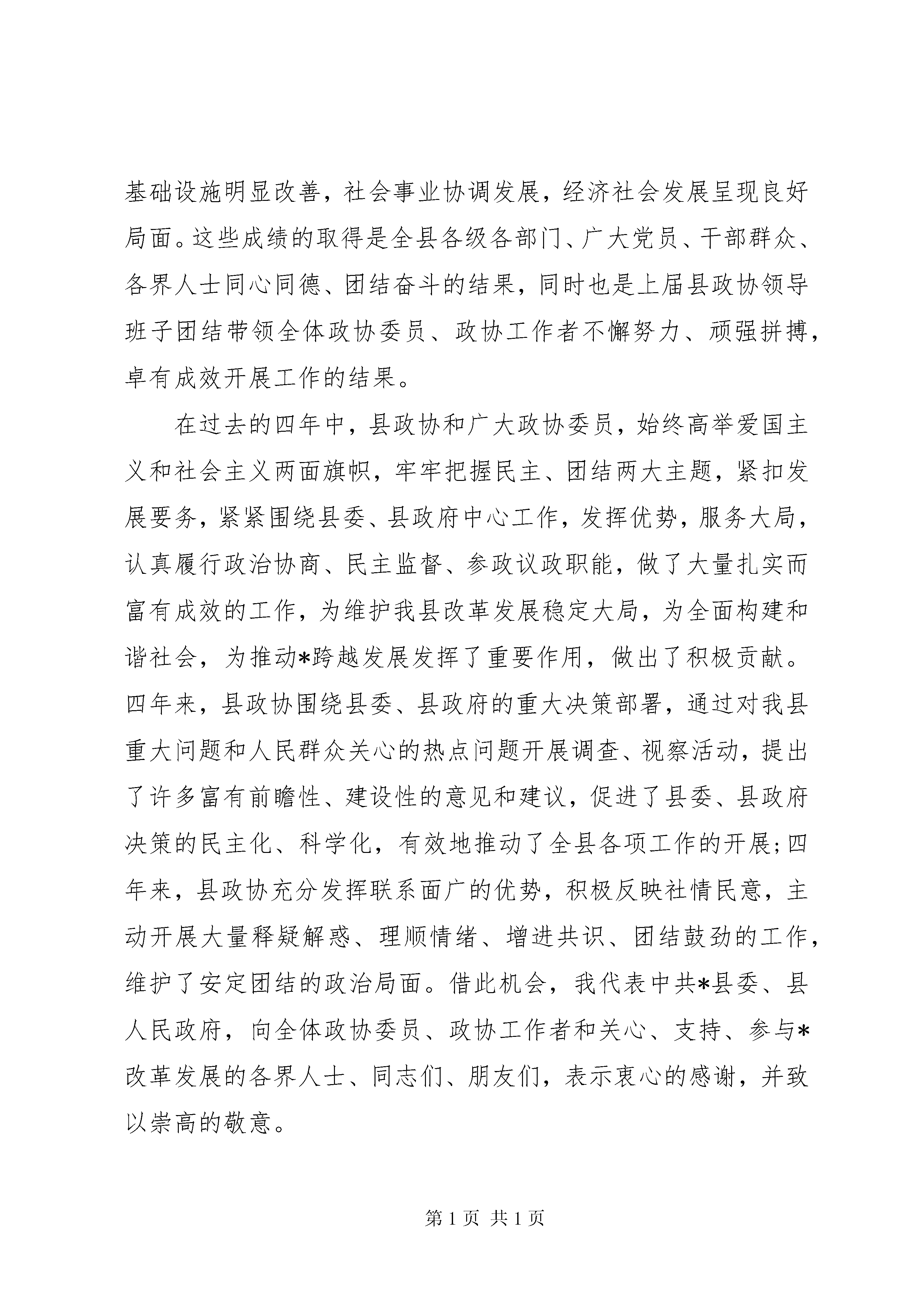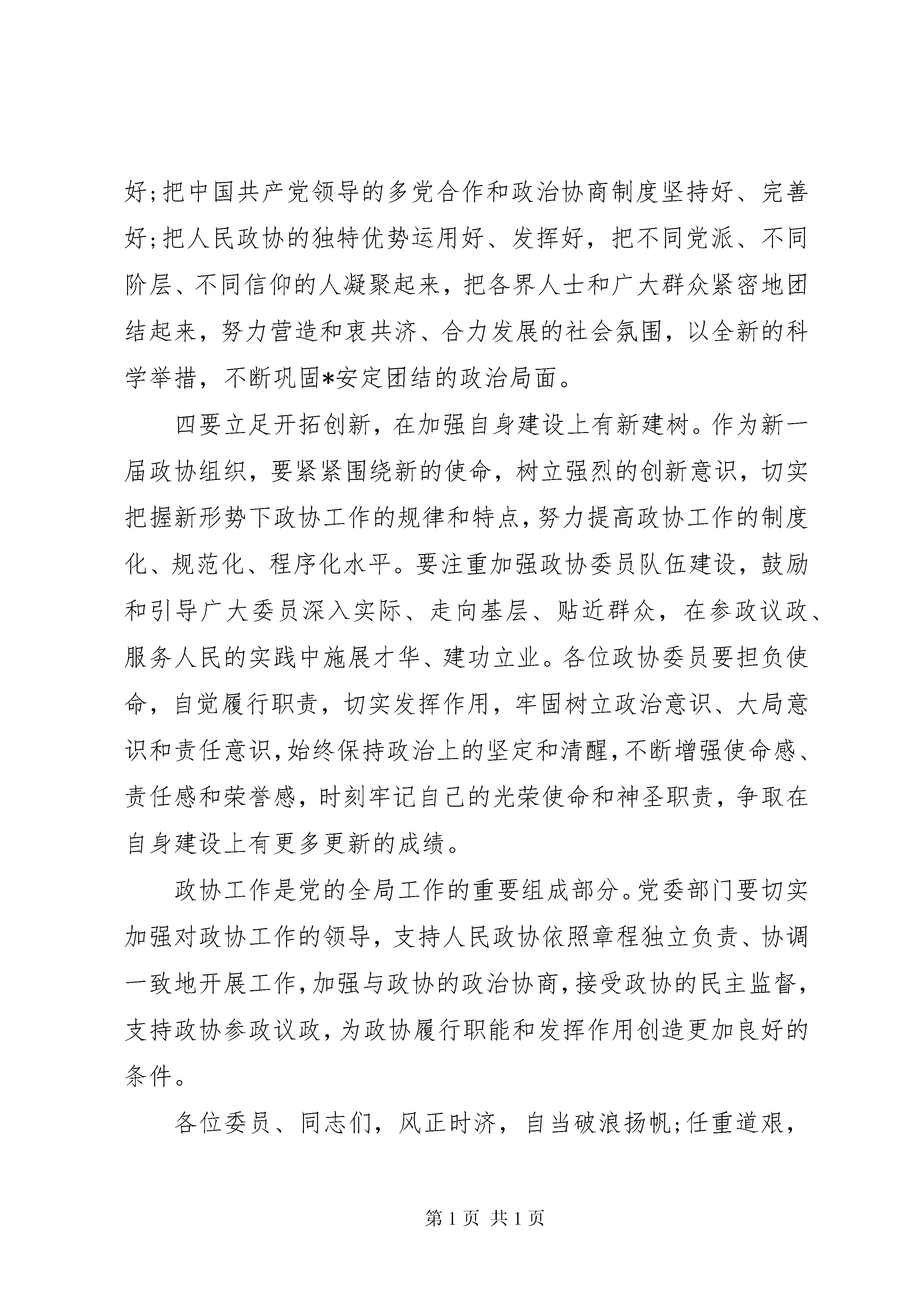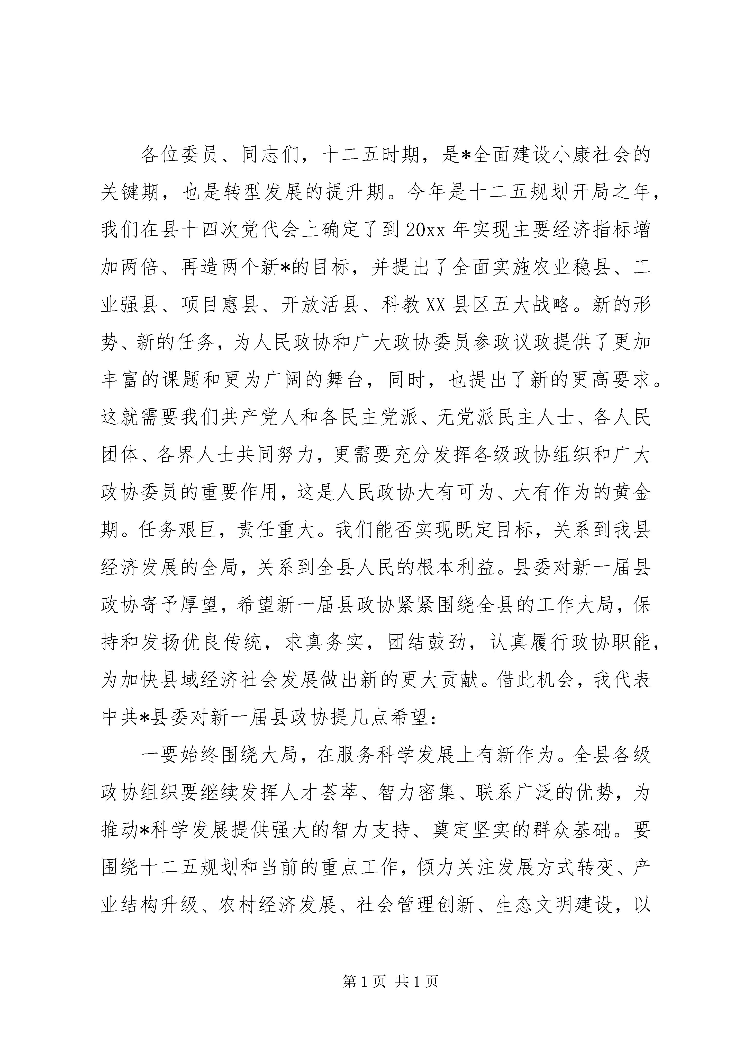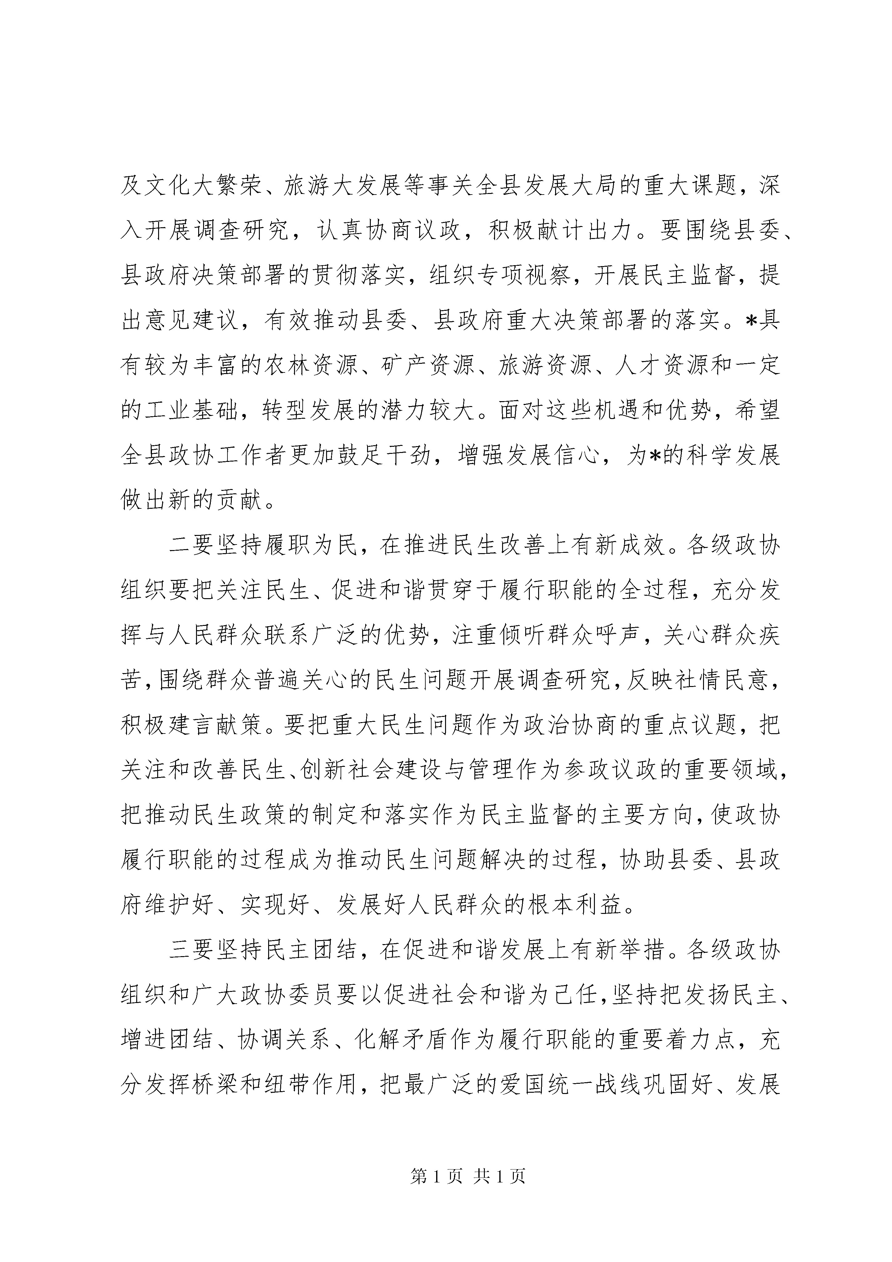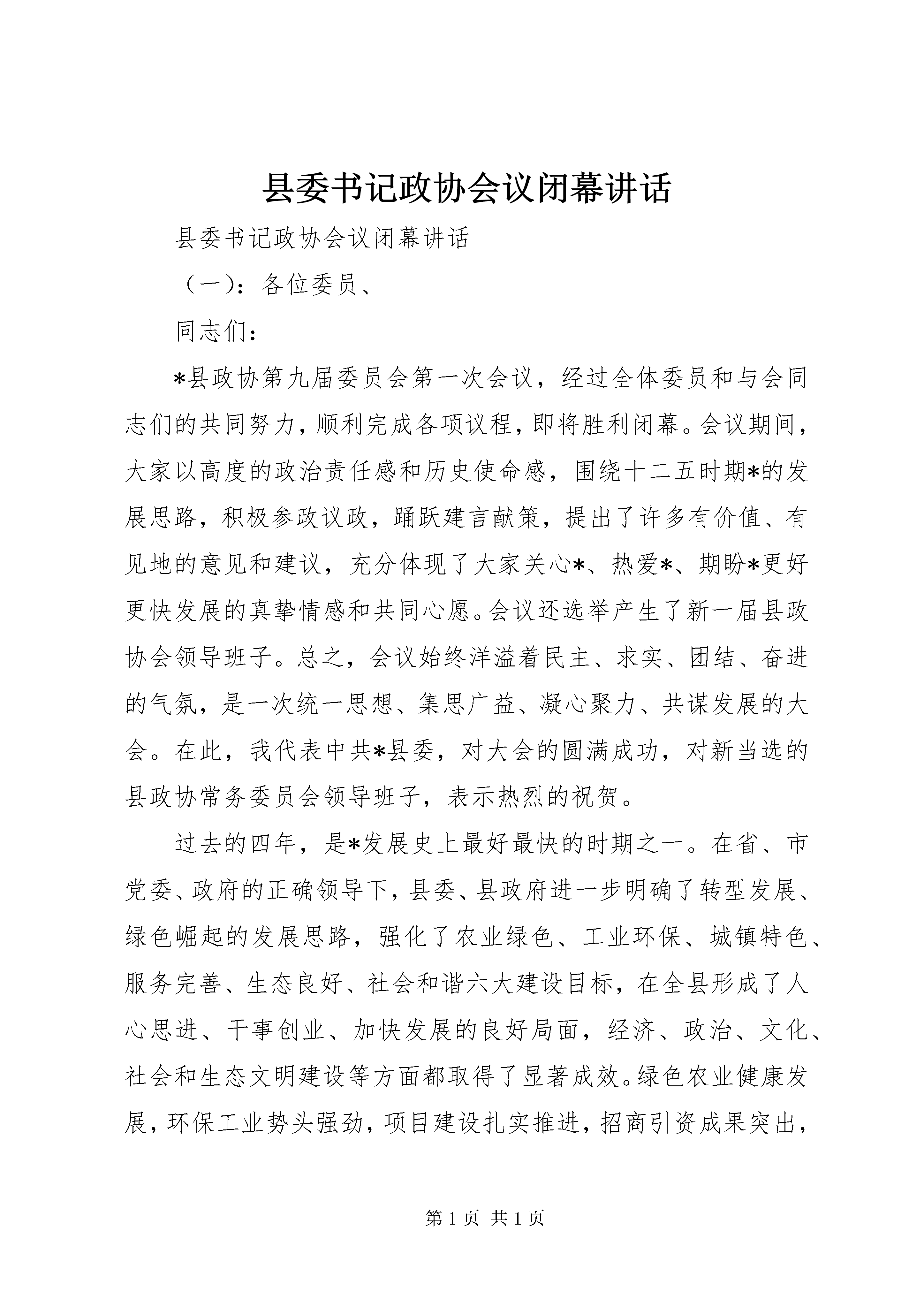 县委书记政协会议闭幕讲话县委书记政协会议闭幕讲话(一):各位委员、同志们:*县政协第九届委员会第一次会议,经过全体委员和与会同志们的共同努力,顺利完成各项议程,即将胜利闭幕。会议期间,大家以高度的政治责任感和历史使命感,围绕十二五时期*的发展思路,积极参政议政,踊跃建言献策,提出了许多有价值、有见地的意见和建议,充分体现了大家关心*、热爱*、期盼*更好更快发展的真挚情感和共同心愿。会议还选举产生了新一届县政协会领导班子。总之,会议始终洋溢着民主、求实、团结、奋进的气氛,是一次统一思想、集思广益、凝心聚力、共谋发展的大会。在此,我代表中共*县委,对大会的圆满成功,对新当选的县政协常务委员会领导班子,表示热烈的祝贺。过去的四年,是*发展史上最好最快的时期之一。在省、市党委、政府的正确领导下,县委、县政府进一步明确了转型发展、绿色崛起的发展思路,强化了农业绿色、工业环保、城镇特色、服务完善、生态良好、社会和谐六大建设目标,在全县形成了人心思进、干事创业、加快发展的良好局面,经济、政治、文化、社会和生态文明建设等方面都取得了显著成效。绿色农业健康发展,环保工业势头强劲,项目建设扎实推进,招商引资成果突出,基础设施明显改善,社会事业协调发展,经济社会发展呈现良好局面。这些成绩的取得是全县各级各部门、广大党员、干部群众、各界人士同心同德、团结奋斗的结果,同时也是上届县政协领导班子团结带领全体政协委员、政协工作者不懈努力、顽强拼搏,卓有成效开展工作的结果。在过去的四年中,县政协和广大政协委员,始终高举爱国主义和社会主义两面旗帜,牢牢把握民主、团结两大主题,紧扣发展要务,紧紧围绕县委、县政府中心工作,发挥优势,服务大局,认真履行政治协商、民主监督、参政议政职能,做了大量扎实而富有成效的工作,为维护我县改革发展稳定大局,为全面构建和谐社会,为推动*跨越发展发挥了重要作用,做出了积极贡献。四年来,县政协围绕县委、县政府的重大决策部署,通过对我县重大问题和人民群众关心的热点问题开展调查、视察活动,提出了许多富有前瞻性、建设性的意见和建议,促进了县委、县政府决策的民主化、科学化,有效地推动了全县各项工作的开展;四年来,县政协充分发挥联系面广的优势,积极反映社情民意,主动开展大量释疑解惑、理顺情绪、增进共识、团结鼓劲的工作,维护了安定团结的政治局面。借此机会,我代表中共*县委、县人民政府,向全体政协委员、政协工作者和关心、支持、参与*改革发展的各界人士、同志们、朋友们,表示衷心的感谢,并致以崇高的敬意。各位委员、同志们,十二五时期,是*全面建设小康社会的关键期,也是转型发展的提升期。今年是十二五规划开局之年,我们在县十四次党代会上确定了到20xx年实现主要经济指标增加两倍、再造两个新*的目标,并提出了全面实施农业稳县、工业强县、项目惠县、开放活县、科教XX县区五大战略。新的形势、新的任务,为人民政协和广大政协委员参政议政提供了更加丰富的课题和更为广阔的舞台,同时,也提出了新的更高要求。这就需要我们共产党人和各民主党派、无党派民主人士、各人民团体、各界人士共同努力,更需要充分发挥各级政协组织和广大政协委员的重要作用,这是人民政协大有可为、大有作为的黄金期。任务艰巨,责任重大。我们能否实现既定目标,关系到我县经济发展的全局,关系到全县人民的根本利益。县委对新一届县政协寄予厚望,希望新一届县政协紧紧围绕全县的工作大局,保持和发扬优良传统,求真务实,团结鼓劲,认真履行政协职能,为加快县域经济社会发展做出新的更大贡献。借此机会,我代表中共*县委对新一届县政协提几点希望:一要始终围绕大局,在服务科学发展上有新作为。全县各级政协组织要继续发挥人才荟萃、智力密集、联系广泛的优势,为推动*科学发展提供强大的智力支持、奠定坚实的群众基础。要围绕十二五规划和当前的重点工作,倾力关注发展方式转变、产业结构升级、农村经济发展、社会管理创新、生态文明建设,以及文化大繁荣、旅游大发展等事关全县发展大局的重大课题,深入开展调查研究,认真协商议政,积极献计出力。要围绕县委、县政府决策部署的贯彻落实,组织专项视察,开展民主监督,提出意见建议,有效推动县委、县政府重大决策部署的落实。*具有较为丰富的农林资源、矿产资源、旅游资源、人才资源和一定的工业基础,转型发展的潜力较大。面对这些机遇和优势,希望全县政协工作者更加鼓足干劲,增强发展信心,为*的科学发展做出新的贡献。二要坚持履职为民,在推进民生改善上有新成效。各级政协组织要把关注民生、促进和谐贯穿于履行职能的全过程,充分发挥与人民群众联系广泛的优势,注重倾听群众呼声,关心群众疾苦,围绕群众普遍关心的民生问题开展调查研究,反映社情民意,积极建言献策。要把重大民生问题作为政治协商的重点议题,把关注和改善民生、创新社会建